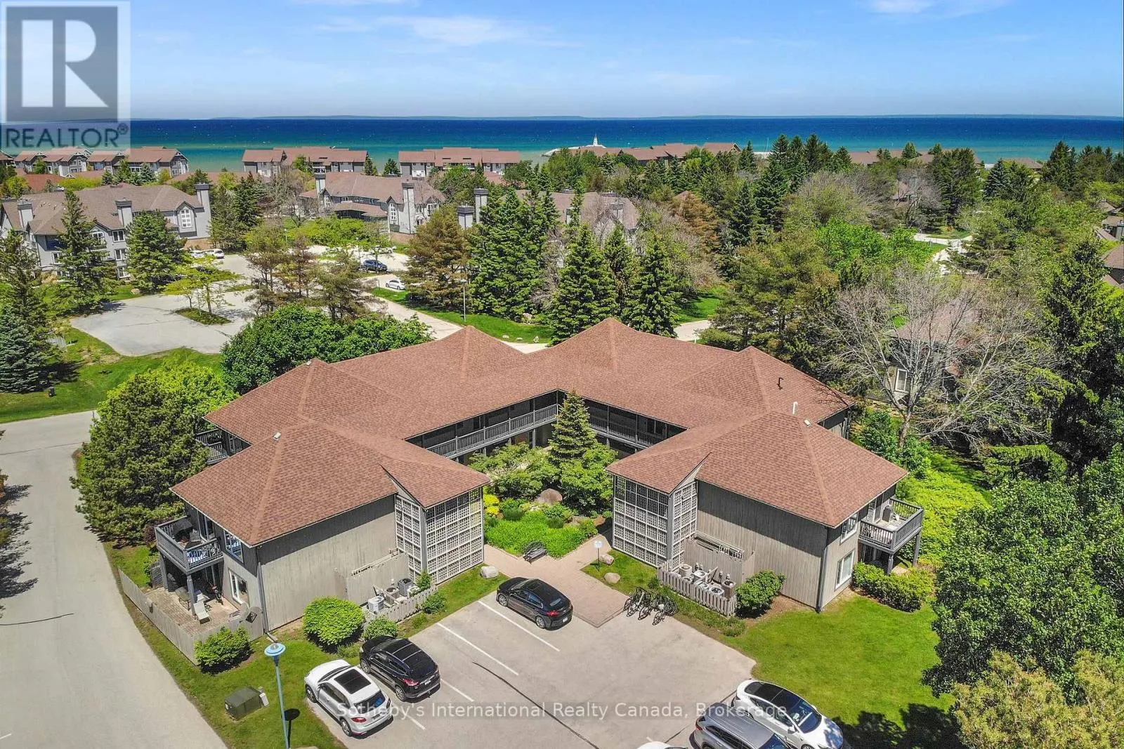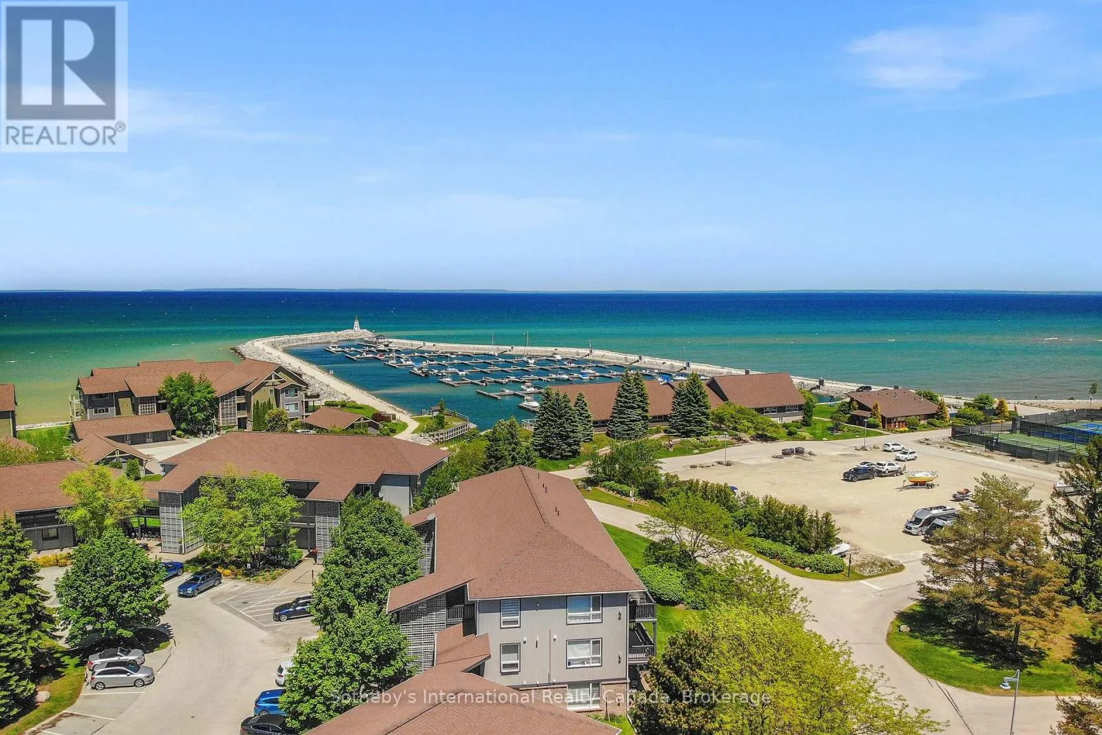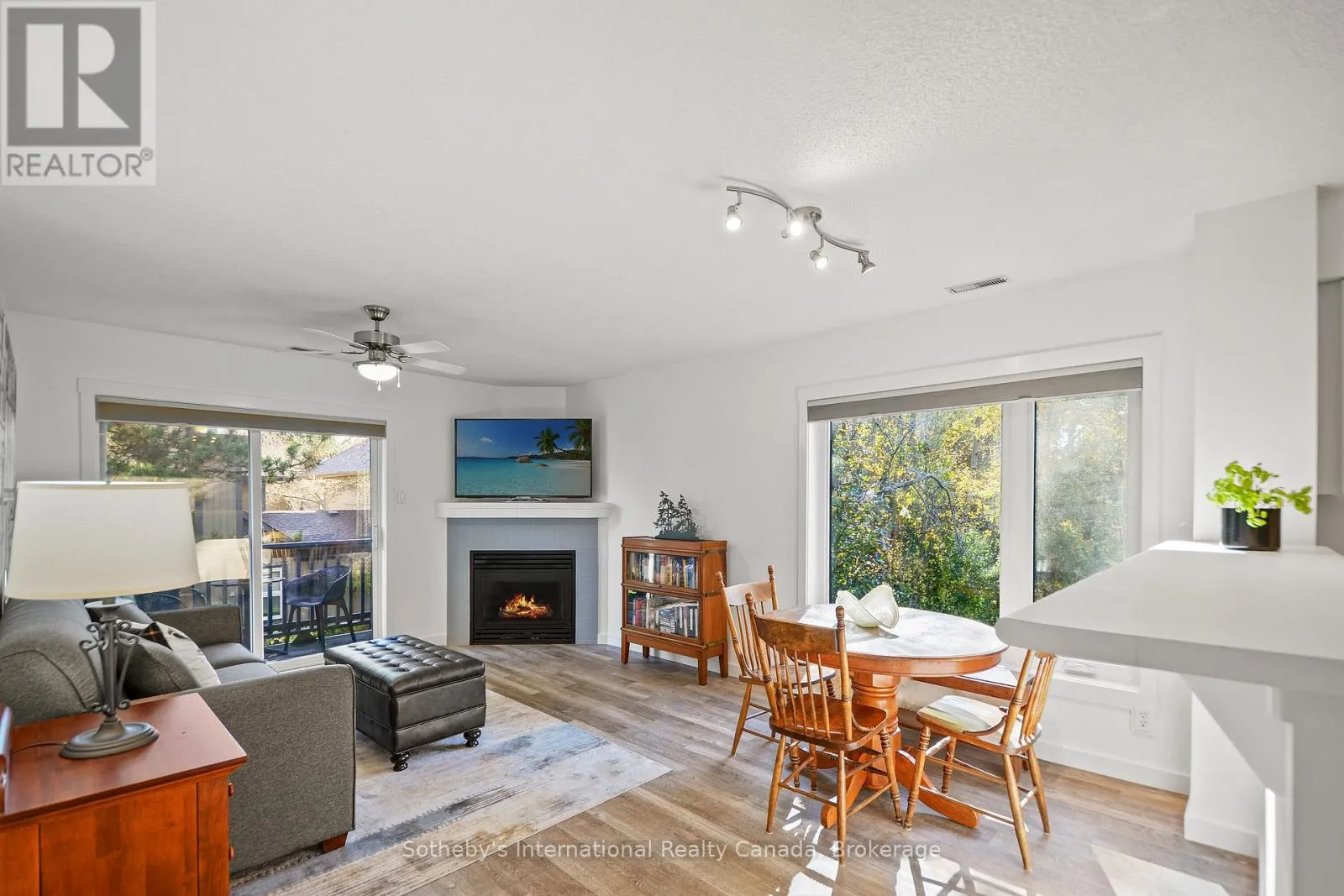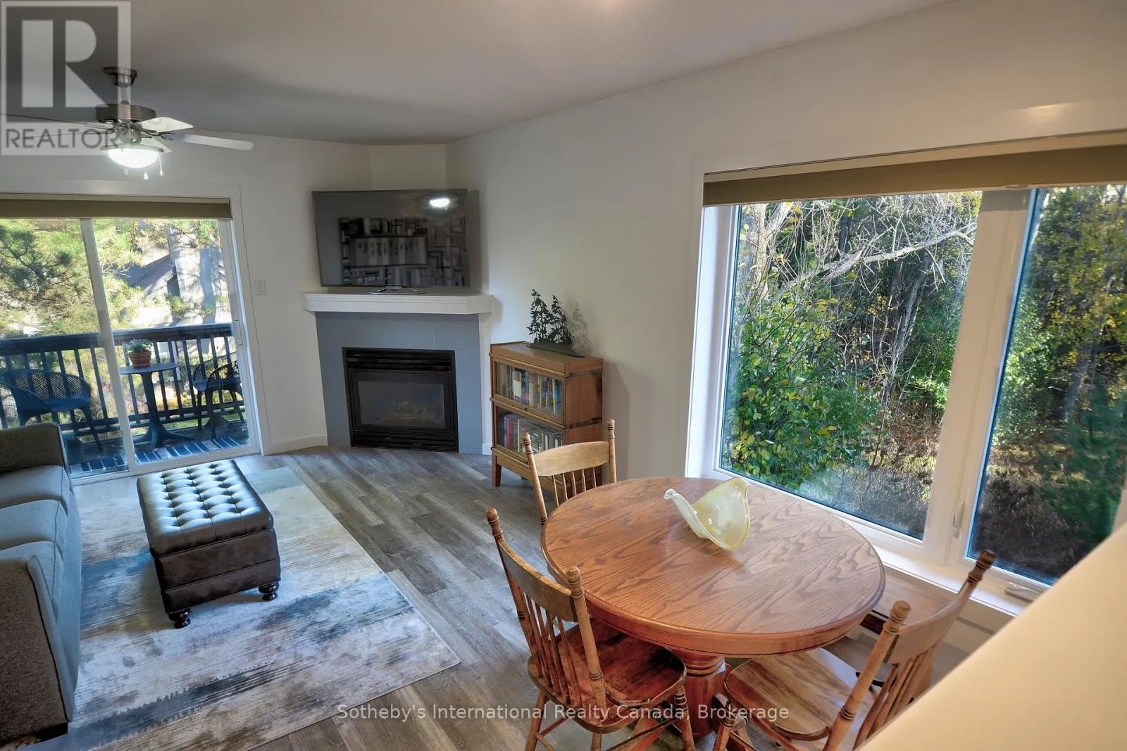 Highway 26 west from Collingwood, Right at the lights into Lighthouse Point. Right on Mariners Way to 1st condos on the rightside. This 2 bedroom, 2 bathroom, 2nd floor unit has gorgeous forest\\landscape views out of the primary suite and living area. An open and bright livingroom with gas f/p, dining area and kitchen that features stainless steel appliances. The Primary suite has double closets and ensuite bath with shower. One large guest bedroom plus a second full bath. Enjoy over 1 mile of walking paths in the community, with over 10 acres of environmentally protected lands including a private marina and boat house, 7 tennis courts, 4 pickleball courts, 2 outdoor pools, a sandy beach, two additional beaches and a deep swimming area off the yacht pier, a volleyball court, kayak racks\\access and putting green. The recreation centre is huge and has an indoor pool, spas, sauna, gym, games room, library, double kitchen, outdoor patio seating, social room with piano and more! Just minutes to shopping or entertainment at the Gayety Theatre, the ski hills at Blue Mountain, and on route to the quaint town of Thornbury, not to mention having Georgian Bay and Wasaga Beach at your finger tips!. Updates include; flooring and trim (2024), water heater (2023), windows (2021), gas line to BBQ (2019). The deck has a view of beautiful trees\\forest which provides a very private and enjoyable outdoor experience. You would own two outdoor storage lockers and have access to two more common storage areas. There is one parking space with additional guest parking in the immediate parking area. (id:27476)