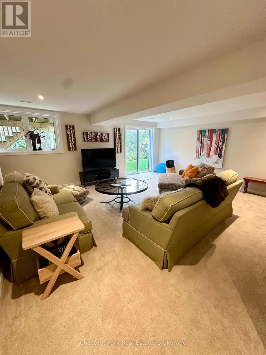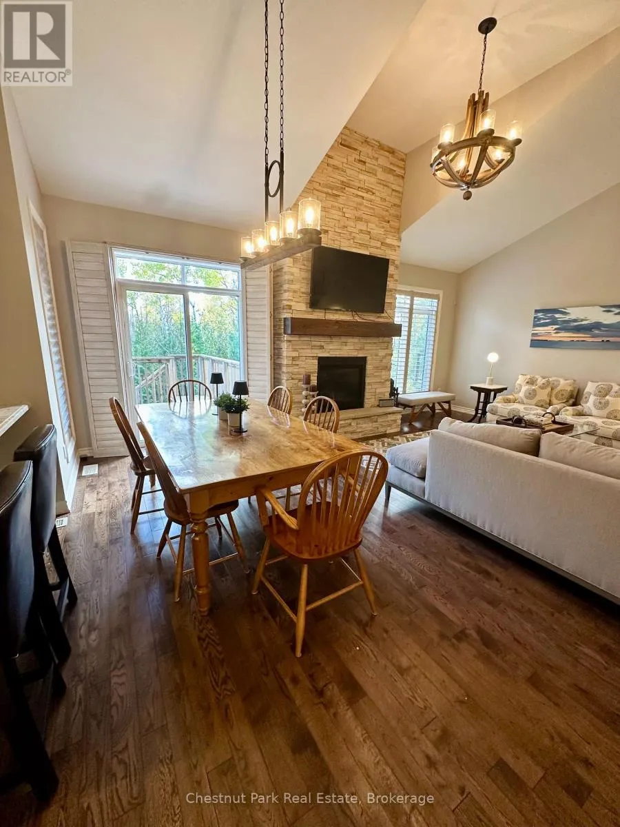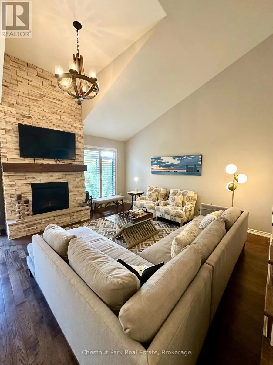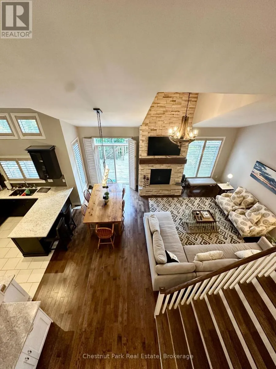 Cross Streets: Cranberry Trail E/Robbie Way. ** Directions: Highway 26 west to Cranberry Trail East. Go south to Robbie Way, then turn left to property. Set against protected green space and the Cranberry Golf Course, this fully furnished townhome offers peaceful escarpment views, forested surroundings, and exceptional privacy. Designed as an executive rental, the home features tasteful décor and quality finishes throughout. The residence offers four bedrooms, including a main-floor primary suite with a king bed, two closets, and a spa-inspired ensuite featuring a walk-in shower and soaking tub. Two queen bedrooms and a full family bathroom are located on the upper level. The lower-level walkout features a fourth queen guest suite with a marble ensuite, a spacious entertainment and TV lounge, a bar-style kitchen with fridge, and additional storage--ideal for guests or extended stays. The open-concept living and dining area is highlighted by cathedral ceilings, expansive windows, California shutters, and a stone-surround gas fireplace that fills the space with warmth and natural light. Step outside to the large walkout deck with glass railings, complete with a gas BBQ and tranquil forest views--perfect for outdoor entertaining. Additional features include three full bathrooms plus a main-floor powder room, a full-size Samsung washer and dryer, and parking for two vehicles with an attached single-car garage and one outdoor space. Lawn care and snow removal are included for added convenience. Offered as a short-term seasonal lease with a minimum term of two months; longer-term leases will be considered. Utilities and damage/cleaning deposits are additional to rent. No pets, smoking, or vaping. Come for a visit and treat yourself to a season in Collingwood--just minutes from ski clubs, Georgian Bay, and the many amenities the area has to offer. This home offers the perfect blend of comfort, convenience, and natural beauty. (id:27476)