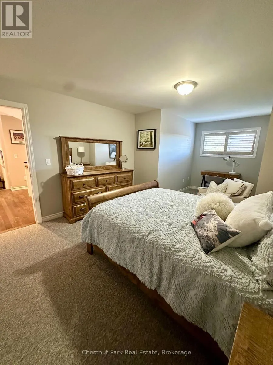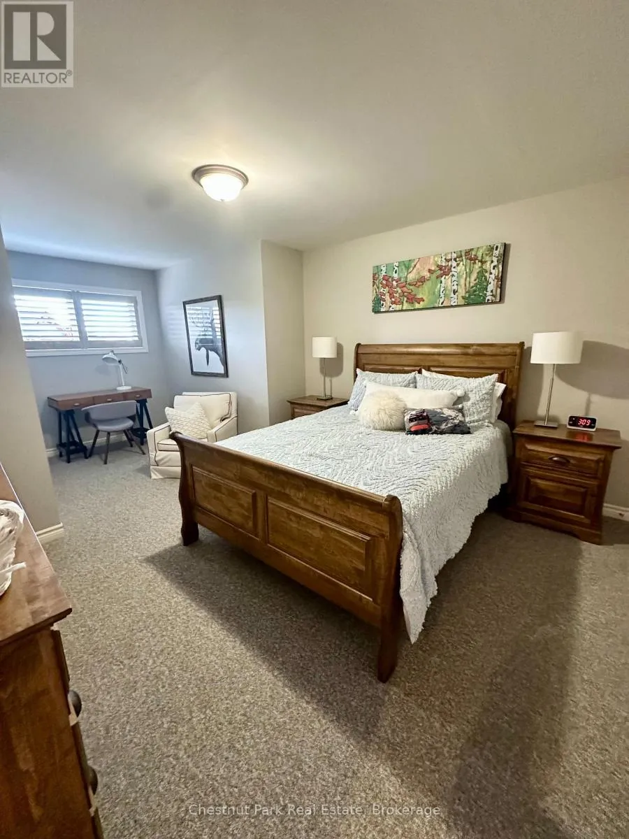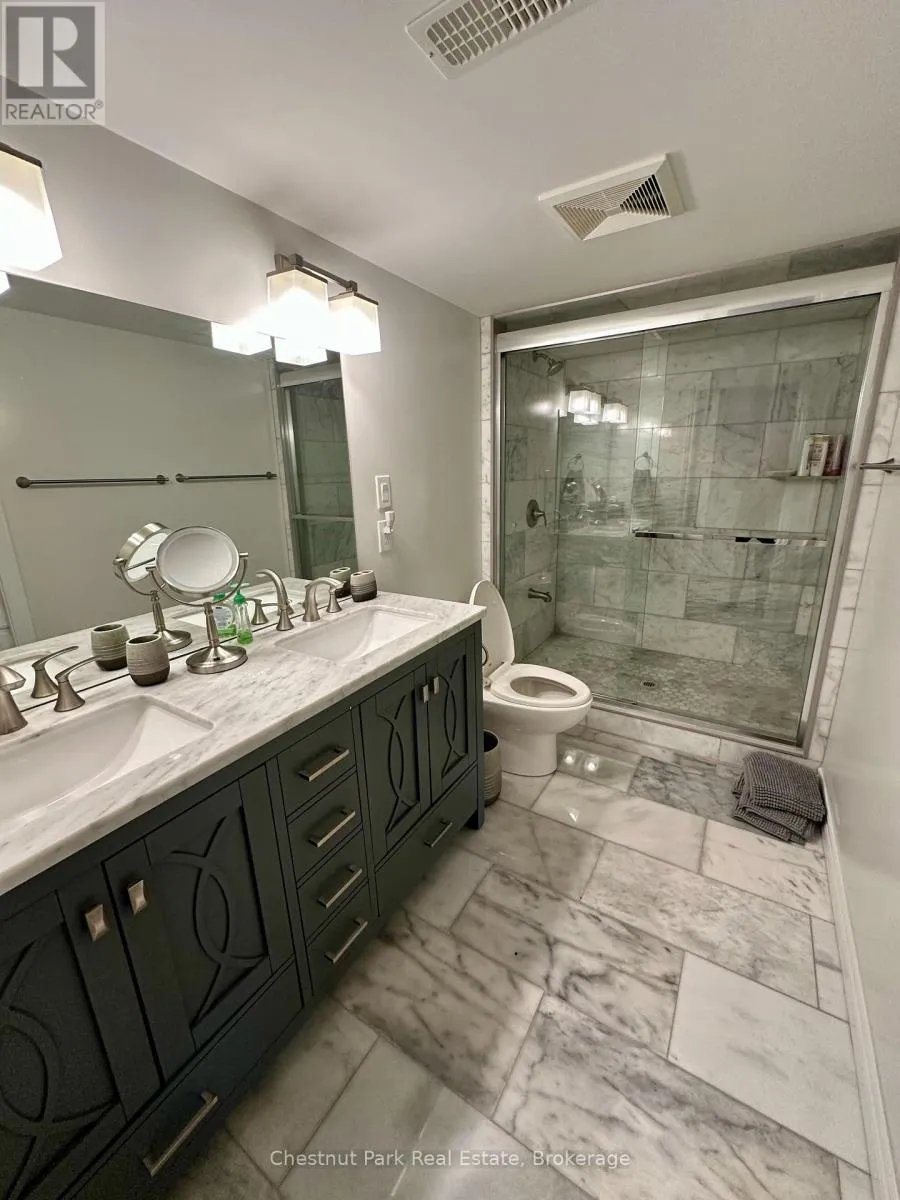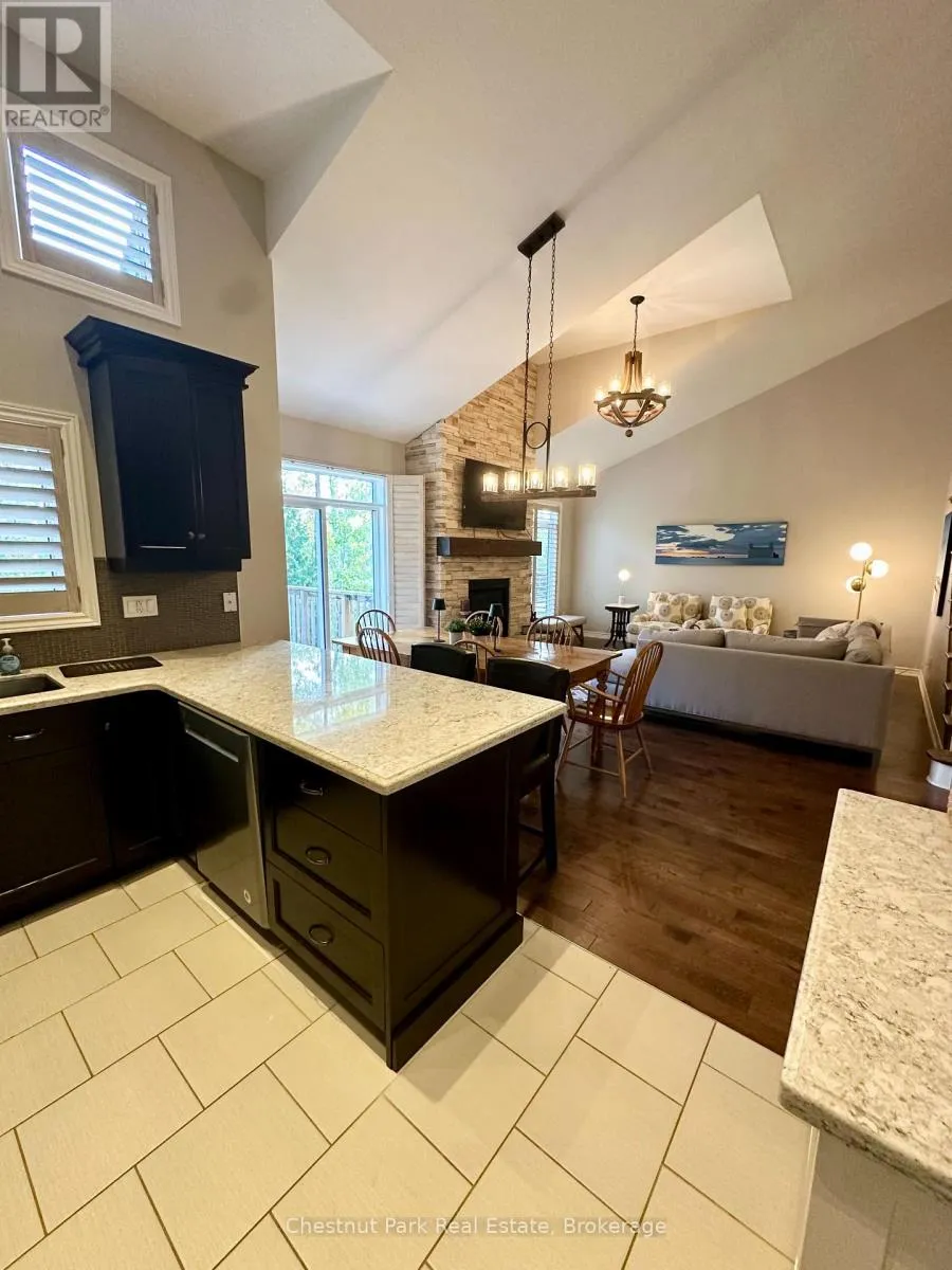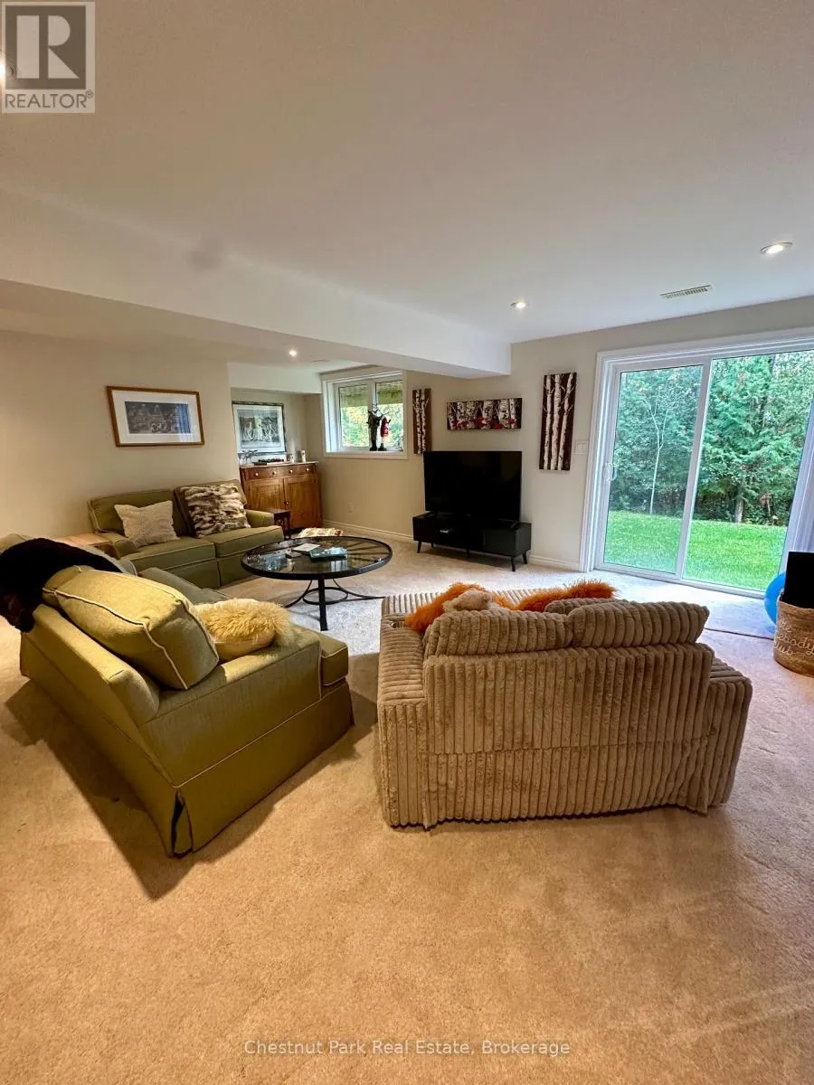 Cross Streets: Cranberry Trail E/Robbie Way. ** Directions: Highway 26 west to Cranberry Trail East. Go south to Robbie Way, then turn left to property. Set against protected green space and the Cranberry Golf Course, this fully furnished townhome offers peaceful escarpment views, forested surroundings, and exceptional privacy. Designed as an executive rental, the home features tasteful décor and quality finishes throughout. The residence offers four bedrooms, including a main-floor primary suite with a king bed, two closets, and a spa-inspired ensuite featuring a walk-in shower and soaking tub. Two queen bedrooms and a full family bathroom are located on the upper level. The lower-level walkout features a fourth queen guest suite with a marble ensuite, a spacious entertainment and TV lounge, a bar-style kitchen with fridge, and additional storage--ideal for guests or extended stays. The open-concept living and dining area is highlighted by cathedral ceilings, expansive windows, California shutters, and a stone-surround gas fireplace that fills the space with warmth and natural light. Step outside to the large walkout deck with glass railings, complete with a gas BBQ and tranquil forest views--perfect for outdoor entertaining. Additional features include three full bathrooms plus a main-floor powder room, a full-size Samsung washer and dryer, and parking for two vehicles with an attached single-car garage and one outdoor space. Lawn care and snow removal are included for added convenience. Offered as a short-term seasonal lease with a minimum term of two months; longer-term leases will be considered. Utilities and damage/cleaning deposits are additional to rent. No pets, smoking, or vaping. Come for a visit and treat yourself to a season in Collingwood--just minutes from ski clubs, Georgian Bay, and the many amenities the area has to offer. This home offers the perfect blend of comfort, convenience, and natural beauty. (id:27476)