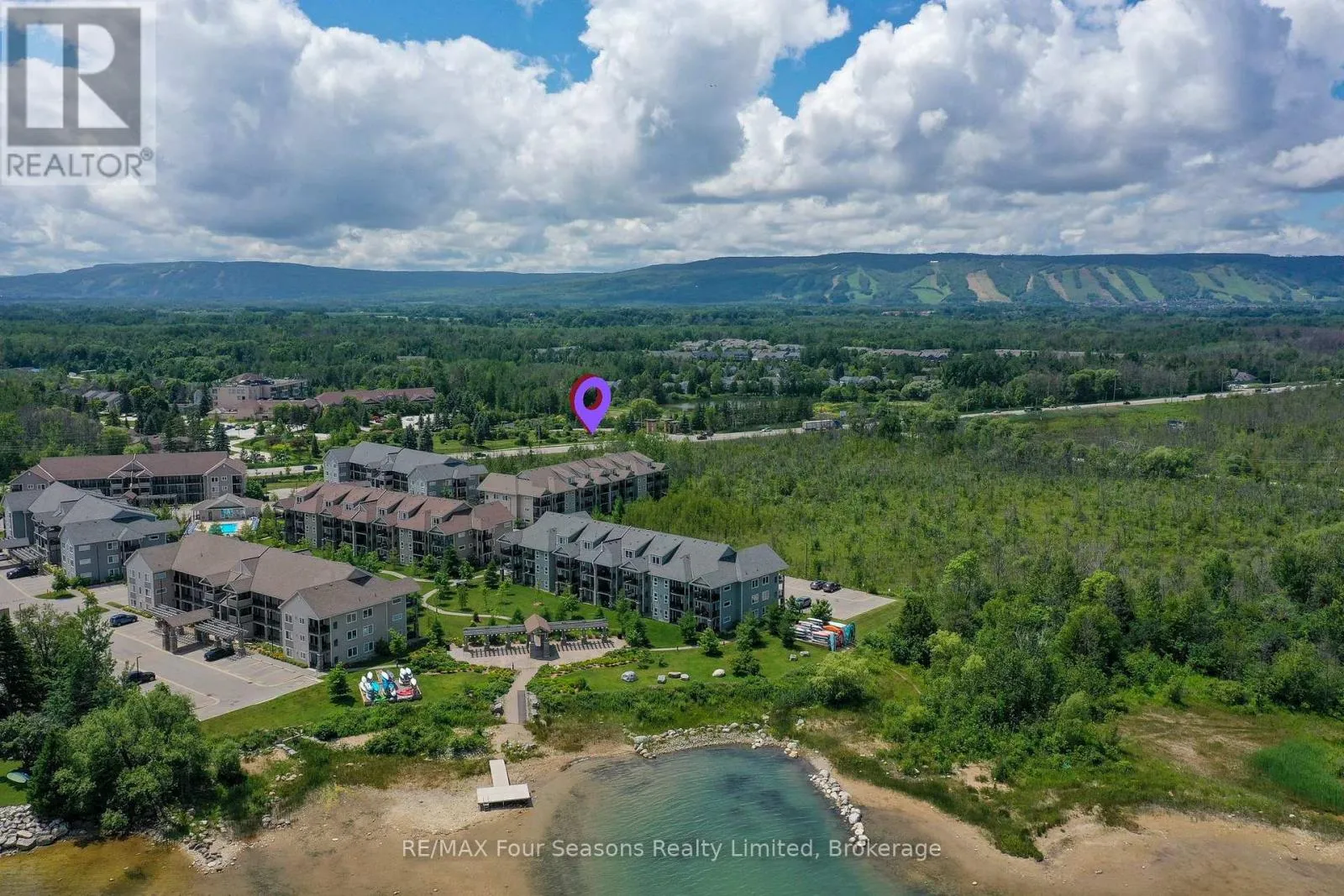 Cross Streets: Highway 26 & Cove Court. ** Directions: Highway 26 to Cove Court, Left on Anchorage Crescent to Building 6. EXECUTIVE ANNUAL LEASE A Truly Unique Wyldewood Cove Osler Unit! This exceptional, one-of-a-kind residence was fully redesigned and retrofitted by renowned Toronto designer and gallery owner, Alison Milne. With panoramic views of the Niagara Escarpment from the front of this second floor unit and stunning seasonal Georgian Bay vistas from the back balcony, this home features over $250,000 in upgrades, custom improvements, and meticulous attention to detail. The space is ready for spring occupancy and offers a seamless living experience. Inside, you'll find pot lights throughout, each controlled by Lutron Maestro dimmers, and complemented by elegant Elte fixtures in every room. The chef's kitchen is a dream, complete with a new wine fridge (2025), GE Elite gas stove, new microwave/rangehood (2025), deep pocket pot drawers, and a fully integrated fridge and dishwasher. The luxurious master suite is a serene retreat, featuring a custom barn board headboard, a king-sized bed, under-bed storage, and a built-in wall closet. The ensuite bath boasts heated floors for ultimate comfort. After a day of outdoor adventure, unwind for après ski in the spacious open concept great room featuring living room and dining area/kitchen, complete with custom concrete gas fireplace. Step outside to the private balcony and soak in the breathtaking seasonal Georgian Bay views and enjoy grilling on the natural gas BBQ. This impeccably maintained condo offers the perfect balance of luxury and convenience, with active lifestyle amenities, including a gym, change rooms, and a YEAR ROUND HEATED OUTDOOR POOL for winter enjoyment. Wyldewood Cove is the exclusive waterfront community situated both minutes drive from golf, skiing, Blue Mountain Resort and to Collingwood! Utilities are not included. Seasonal Lease considered at $2500/month plus utilities. (id:27476)