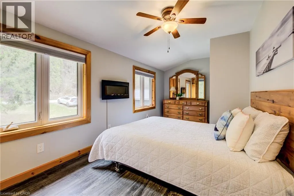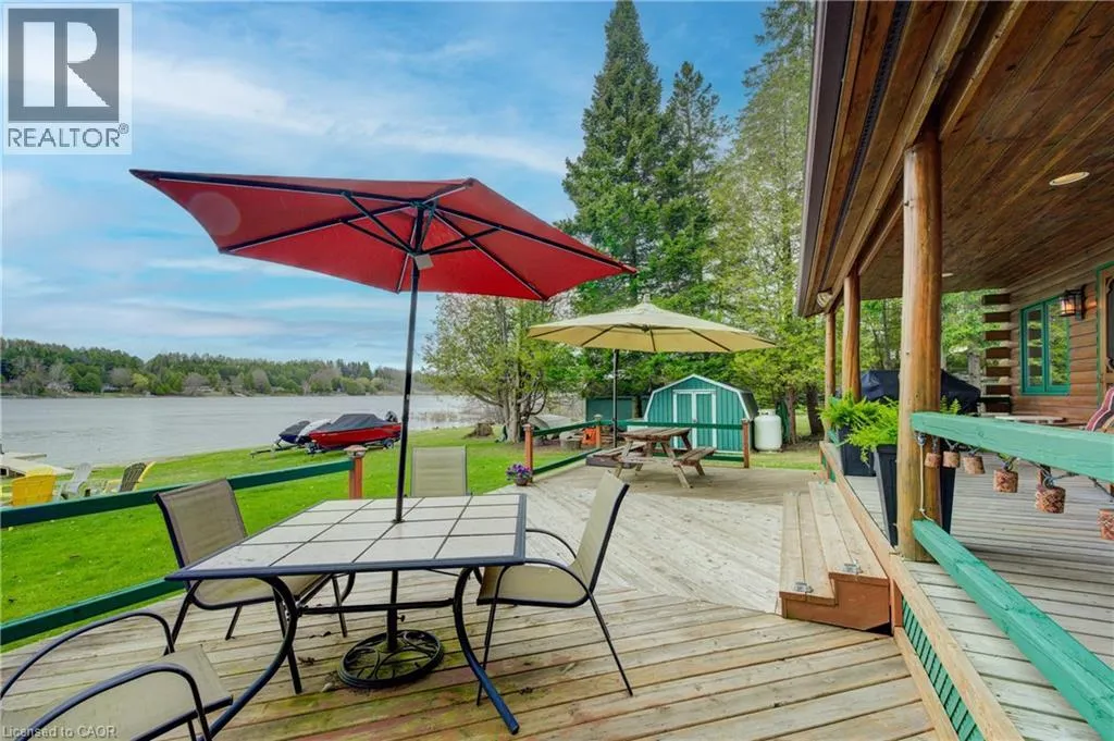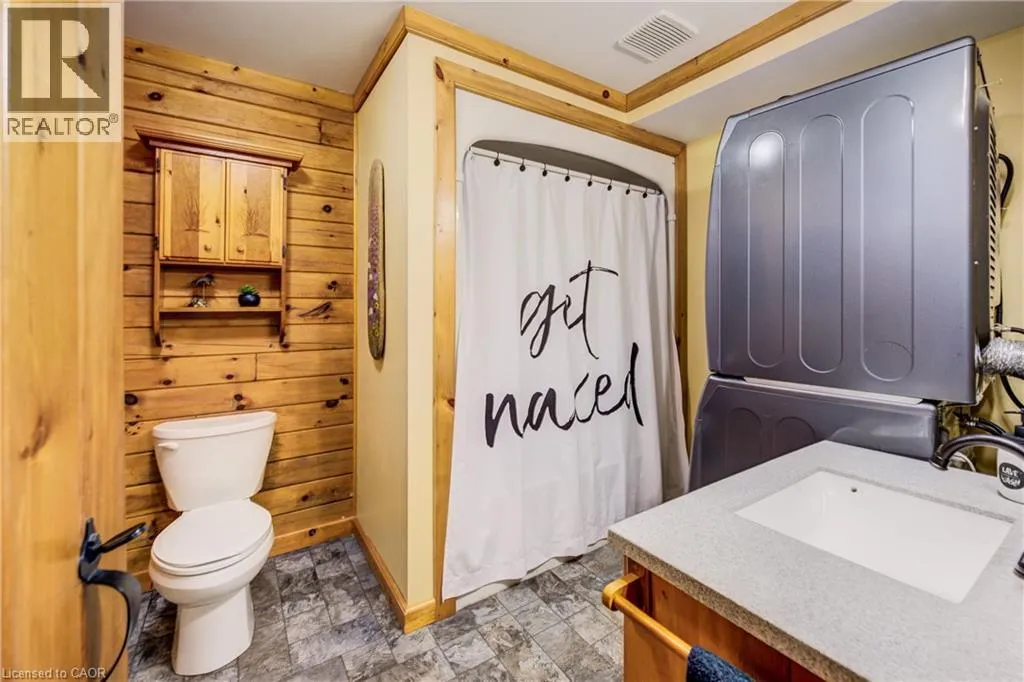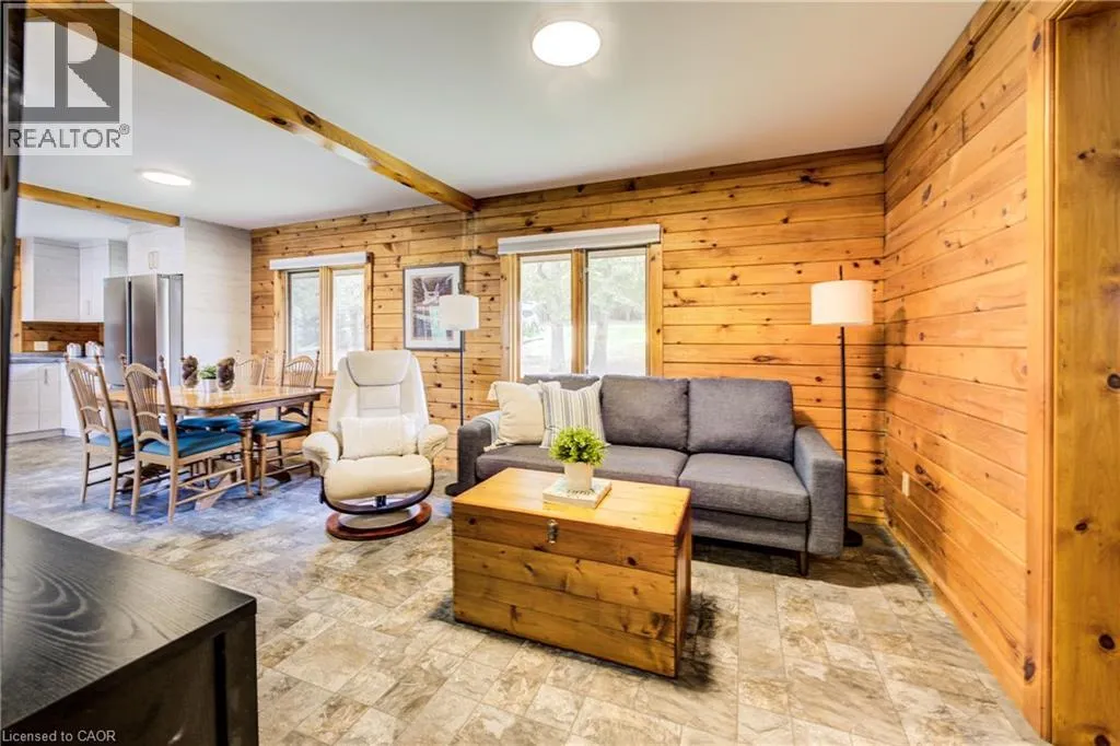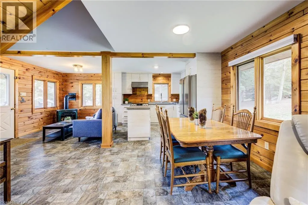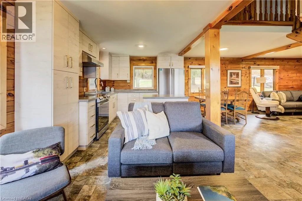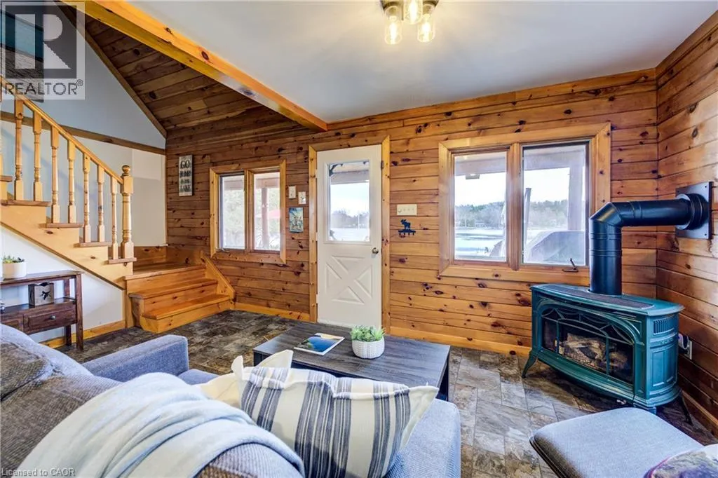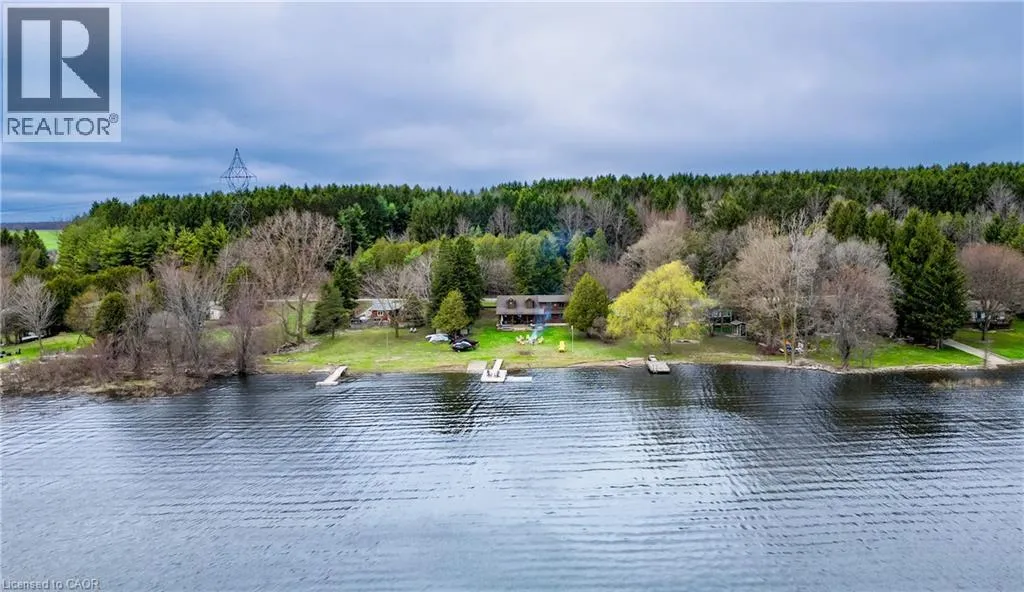Follow ON-85 N and Floradale Rd to 8 Line. Turn left onto 8 Line. Turn right onto Wellington County Rd 11. Continue on Concession Rd 8. Left onto Side Rd 15. Left onto Concession Rd 6. Turns into Road 4 N. Cottage will be on left Lakefront log cabin, with poured concrete foundation, on a rare flat lot. Over $40,000 invested in the kitchen and stainless steel-framed dock. Features two full baths, main floor laundry, EV plug-in, and propane generator. Covered porch with lake views. Effortless lakefront living at Conestogo Lake with this 1,466 sq ft log cabin cottage, where rustic charm meets modern convenience. Fully updated and thoughtfully designed, this cottage offers a rare attached garage with direct access inside providing a convenient entrance. Take in the scenery from the covered porch that stretches the full length of the cottage, or gather on the spacious deck, the perfect setting for meals and entertaining with unobstructed views. The brand-new $18,000 aluminum frame dock provides a launchpad for swimming, boating, and all things summer. Inside, find a fully updated kitchen offers an ideal space for cooking meals. Outfitted with modern appliances, including a range hood oven, French door fridge, and a central island, itâs designed for both functionality and style. Share family meals in the adjoining dining area, cozy up by the wood-burning stove with direct lake views, or catch a movie in the second living space just off the dining room. Upstairs, 3 inviting bedrooms and a spacious 4pc bathroom features a built-in electric fireplace and dual sinks. The primary bedroom boasts stunning views of the water beyond. Practical perks include in-cottage laundry, an electric vehicle plug-in in the attached garage, and a generator to keep life humming along. Outside, gather around the fire pit on starry nights, perfect for roasting marshmallows, sharing stories, and making memories that will last a lifetime. With year round road access, thoughtful upgrades, and direct waterfront bliss, this is more than just a cottage, itâs your next chapter at Conestogo Lake, ready and waiting for new memories to be made. (id:27476)