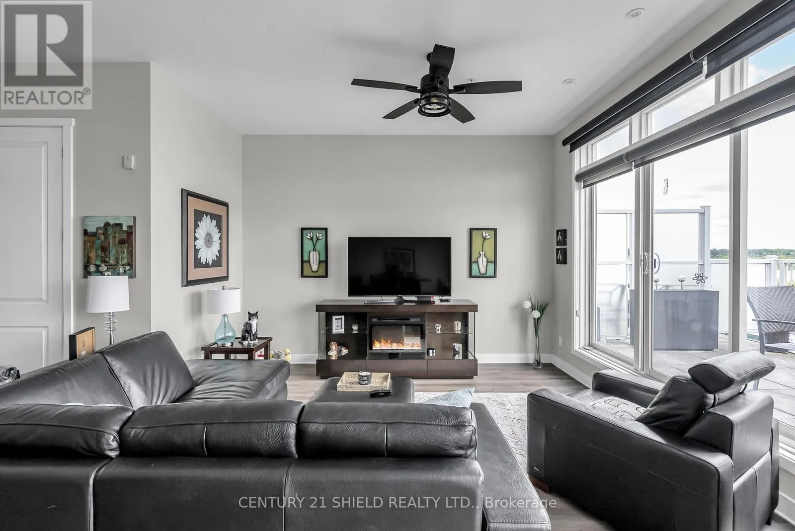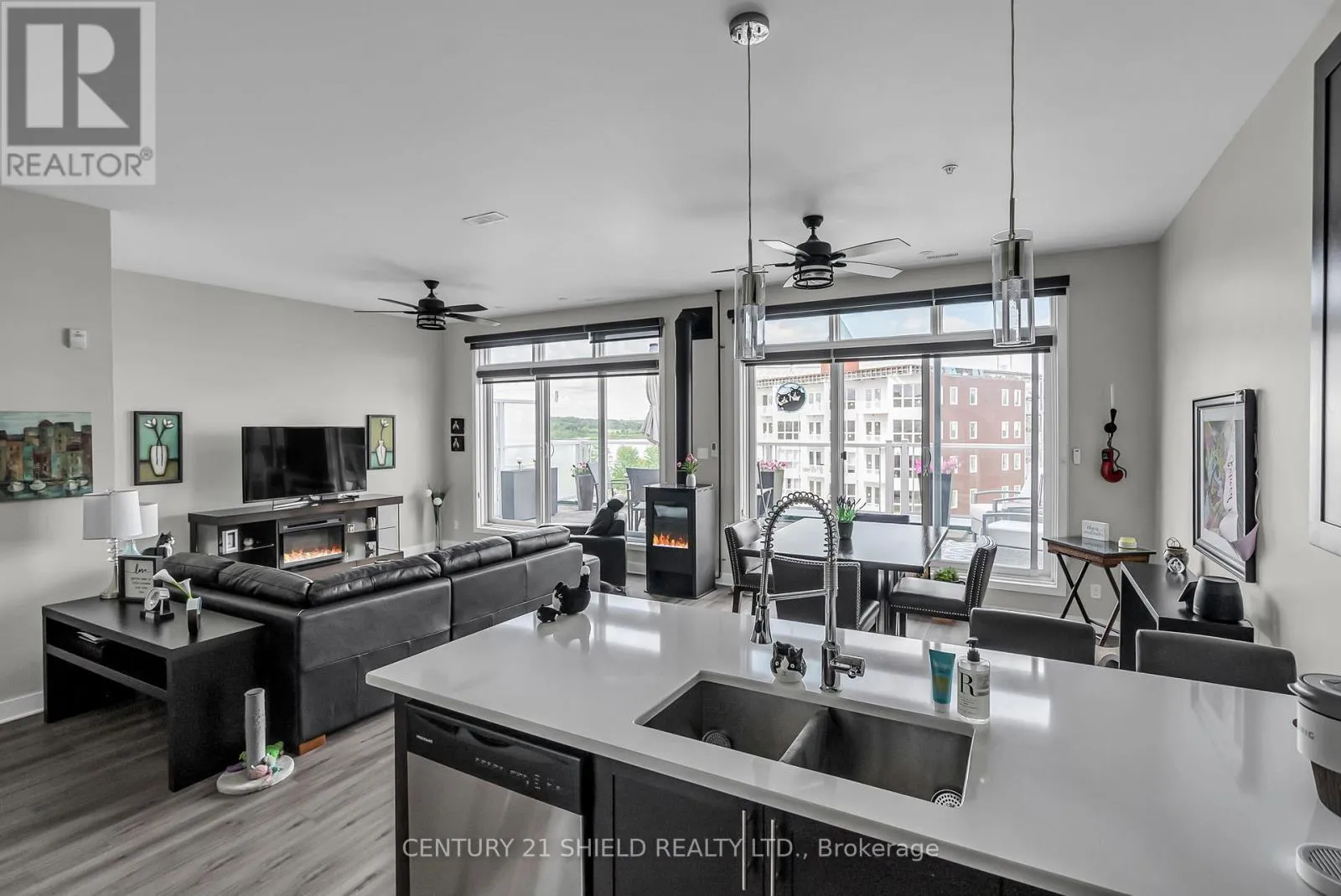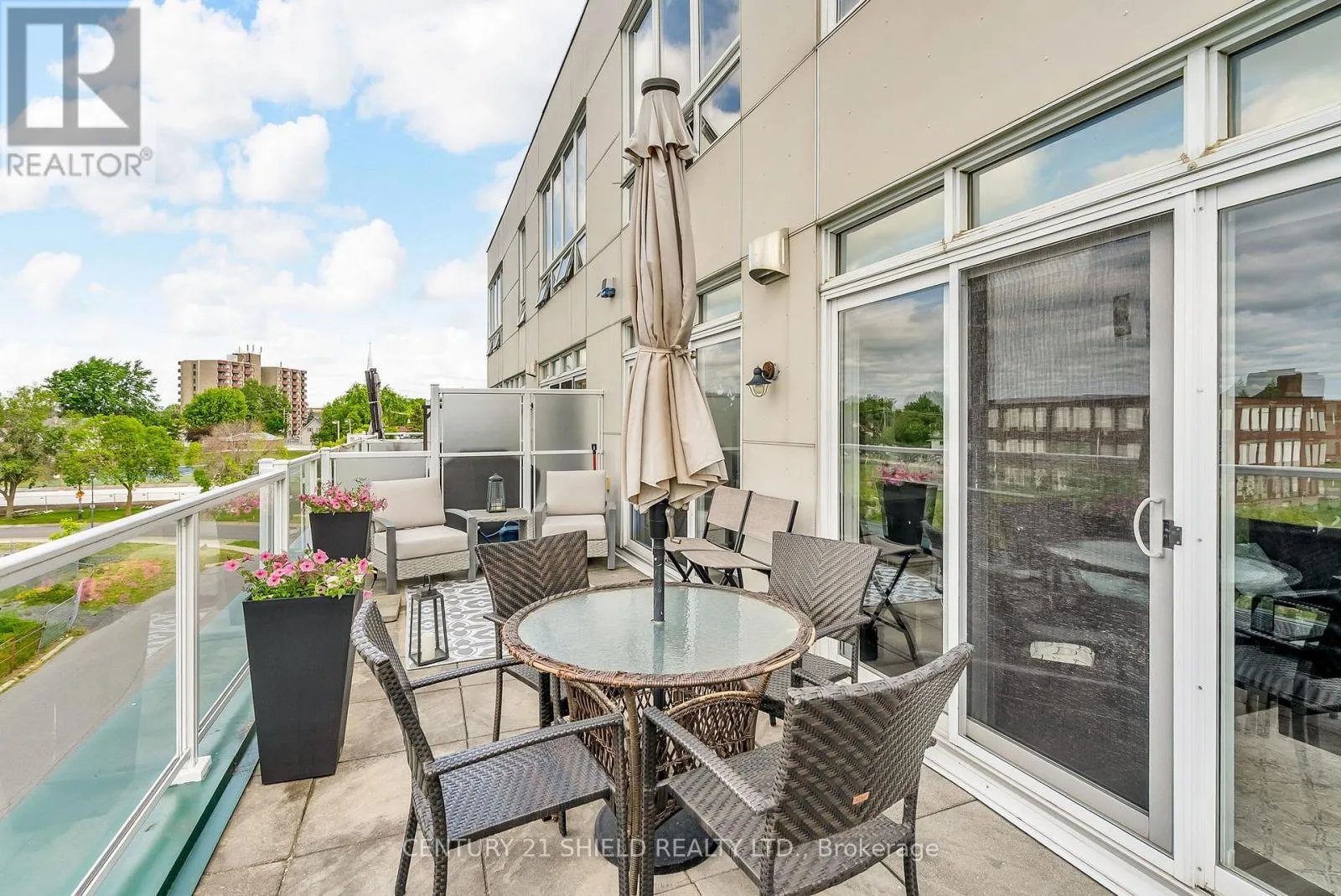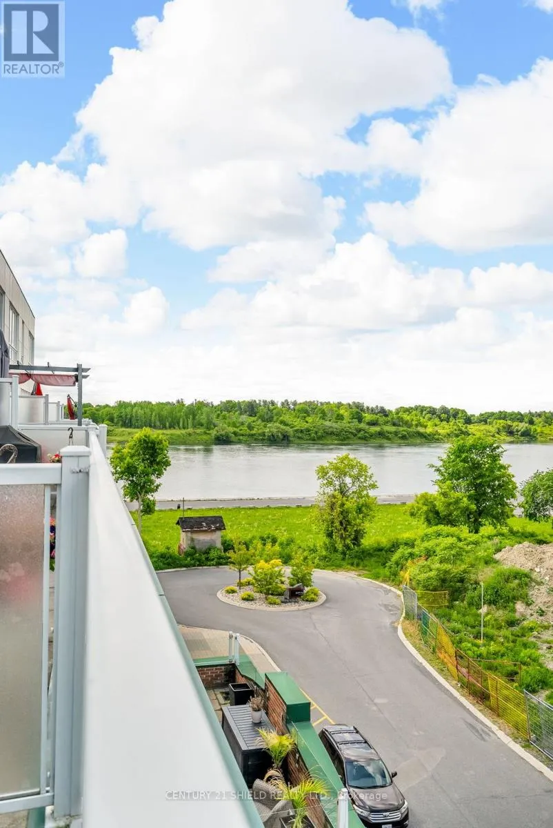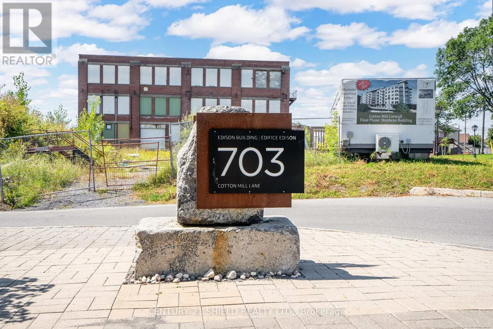 South on McConnell to Cotton Mill Street, head west until stairs and big archway are south of you with parking to the north. Unit is in courtyard on right. Experience elevated living in this two-level, loft-style condo located in the historic Edison Building within Cornwalls sought-after Cotton Mill District. This fully upgraded 2-bed, 3-bath condo offers west-facing floor-to-ceiling windows and a private 27 x 10 terrace overlooking the St. Lawrence River. Showcasing modern finishes throughout, the main floor features wide-plank laminate flooring, porcelain tile in high-traffic areas, and a refreshed kitchen with quartz countertops, stainless steel appliances, and updated lighting. The primary offers a walk-in closet and a luxurious rain shower system. Bonus features include a powder room with a floating quartz vanity, custom shower glass doors in the guest ensuite, and upper-level laundry with high-efficiency appliances and storage. Enjoy the convenience of underground heated parking with additional storage, indoor car wash bay, and secure access with fob entry and surveillance throughout. The condo fee includes snow removal, lawn maintenance, garage and window cleaning, and more. Steps from the waterfront, shops, restaurants, yoga studio, and medical services, this is your opportunity for stylish, maintenance-free living in a vibrant riverfront community. Water $850.88 Gas $291.82 Electric $708.97 Sq.FT 1324. (id:27476)