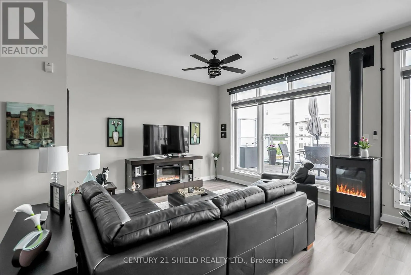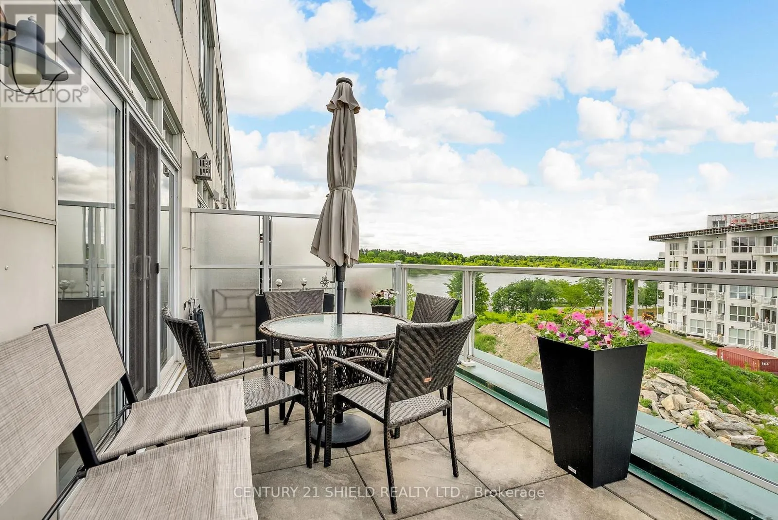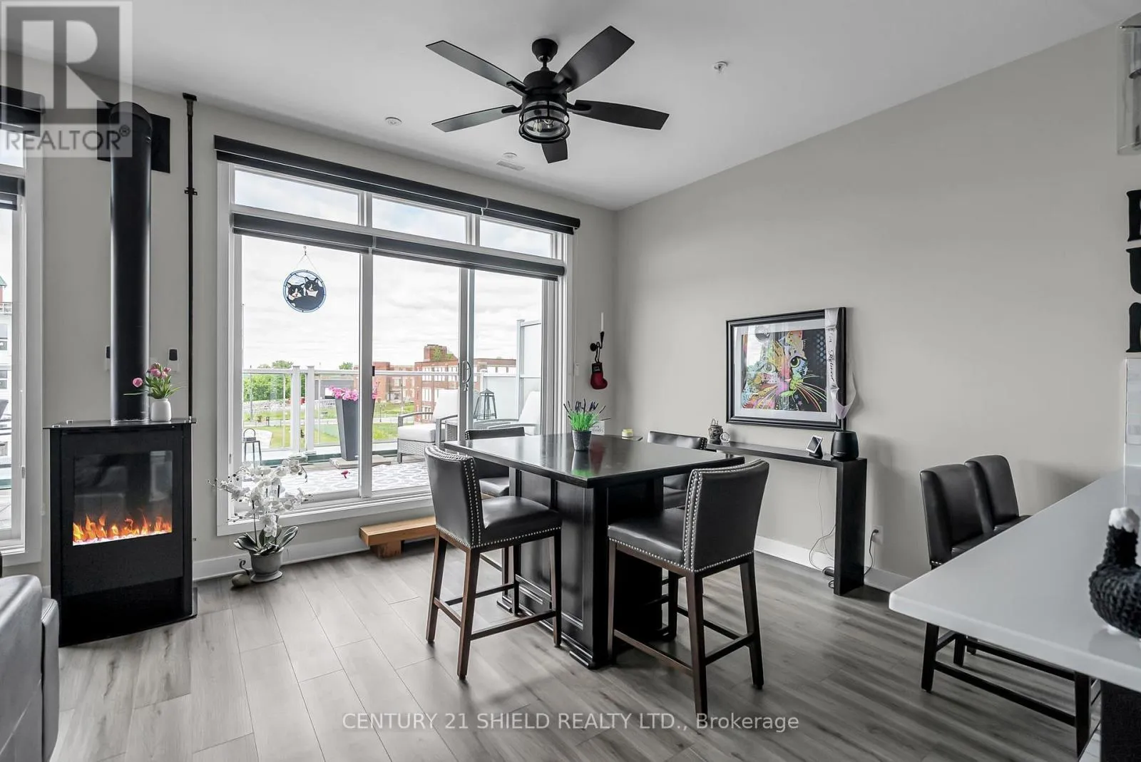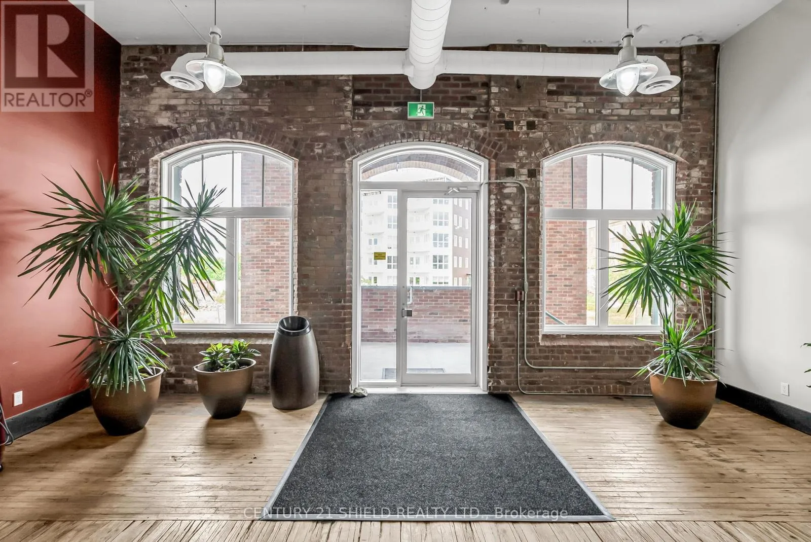 South on McConnell to Cotton Mill Street, head west until stairs and big archway are south of you with parking to the north. Unit is in courtyard on right. Experience elevated living in this two-level, loft-style condo located in the historic Edison Building within Cornwalls sought-after Cotton Mill District. This fully upgraded 2-bed, 3-bath condo offers west-facing floor-to-ceiling windows and a private 27 x 10 terrace overlooking the St. Lawrence River. Showcasing modern finishes throughout, the main floor features wide-plank laminate flooring, porcelain tile in high-traffic areas, and a refreshed kitchen with quartz countertops, stainless steel appliances, and updated lighting. The primary offers a walk-in closet and a luxurious rain shower system. Bonus features include a powder room with a floating quartz vanity, custom shower glass doors in the guest ensuite, and upper-level laundry with high-efficiency appliances and storage. Enjoy the convenience of underground heated parking with additional storage, indoor car wash bay, and secure access with fob entry and surveillance throughout. The condo fee includes snow removal, lawn maintenance, garage and window cleaning, and more. Steps from the waterfront, shops, restaurants, yoga studio, and medical services, this is your opportunity for stylish, maintenance-free living in a vibrant riverfront community. Water $850.88 Gas $291.82 Electric $708.97 Sq.FT 1324. (id:27476)