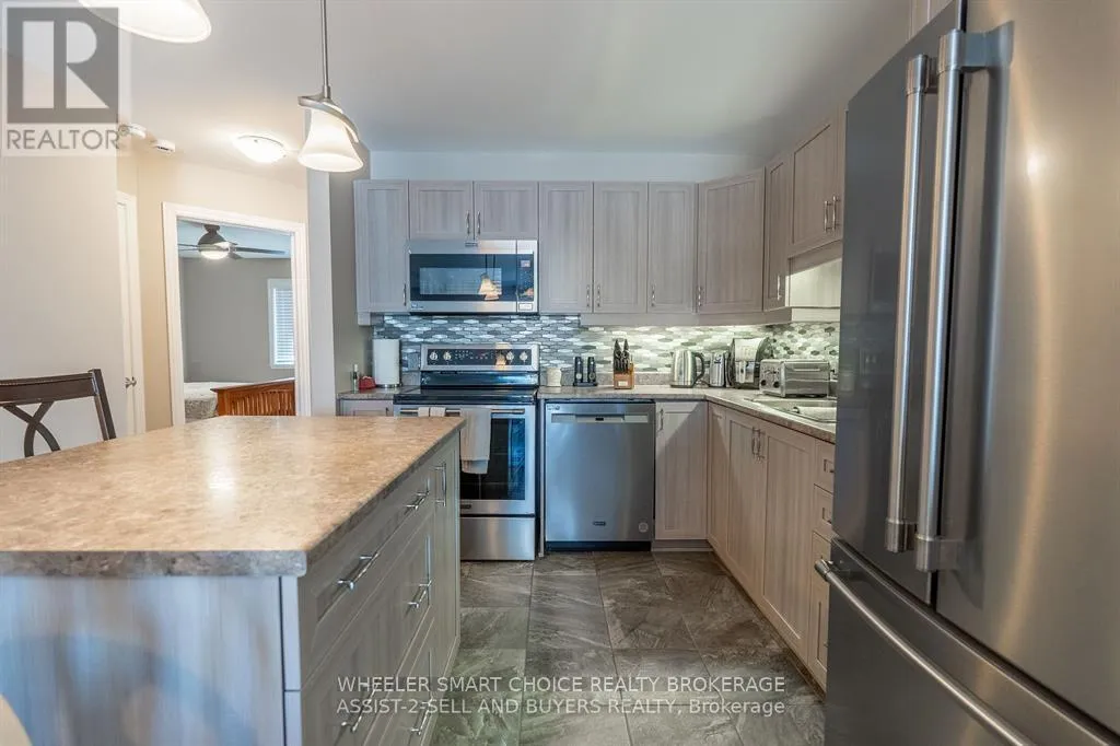 Cross Streets: Amelia. ** Directions: First St. E. Beautiful turn key condo on second level with balcony. Open concept with cathedral ceilings, kitchen with island, 2 bedrooms, in unit laundry and balcony to sit out and relax. Primarily seniors in adjoining condos for a quiet place to call home. Perfect for senior or professional. Option to have utilities included for an additional fee. One parking spot with this unit. Must comply with condo rules. (id:27476)