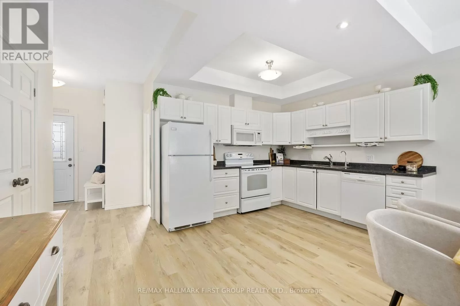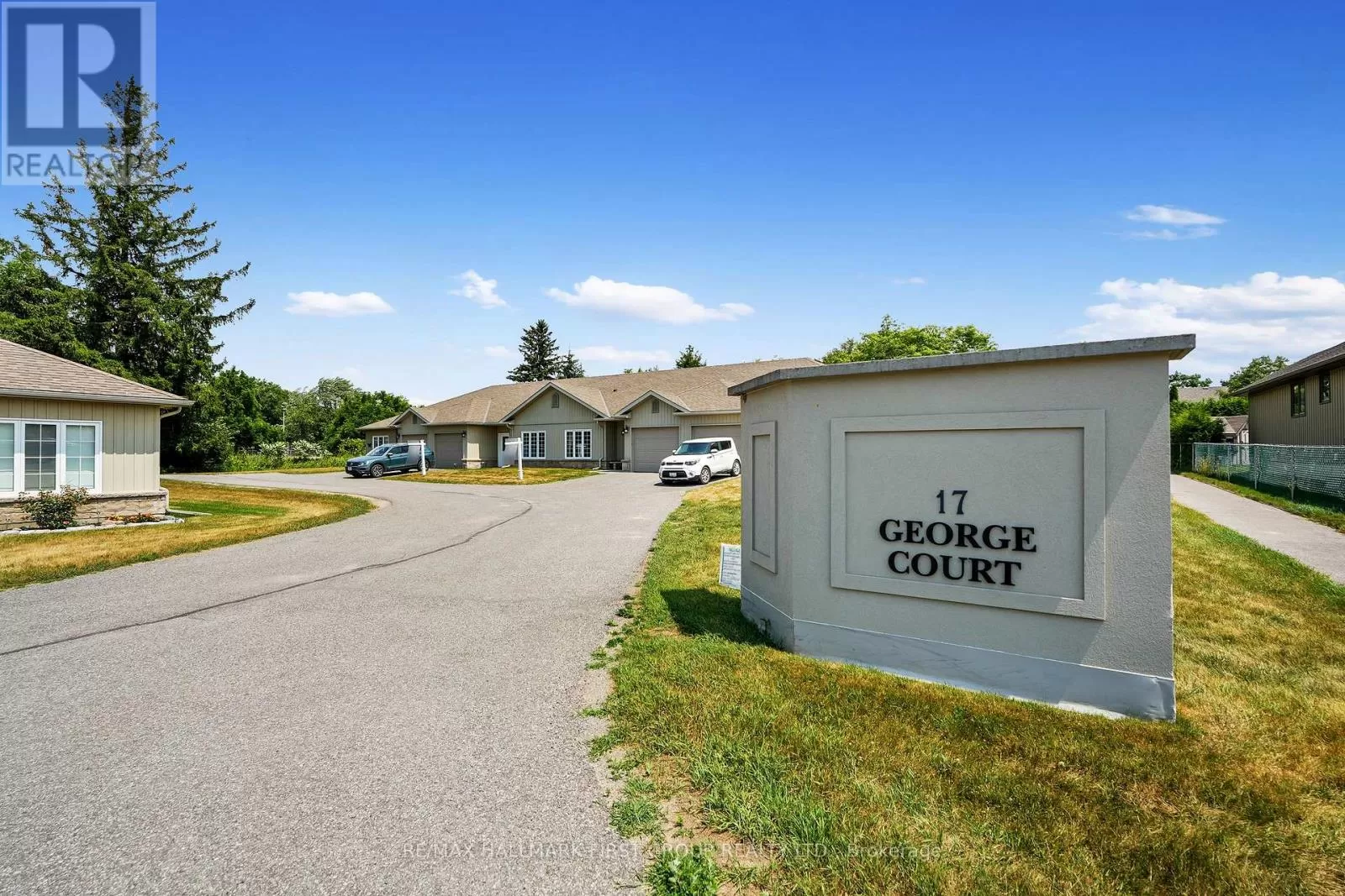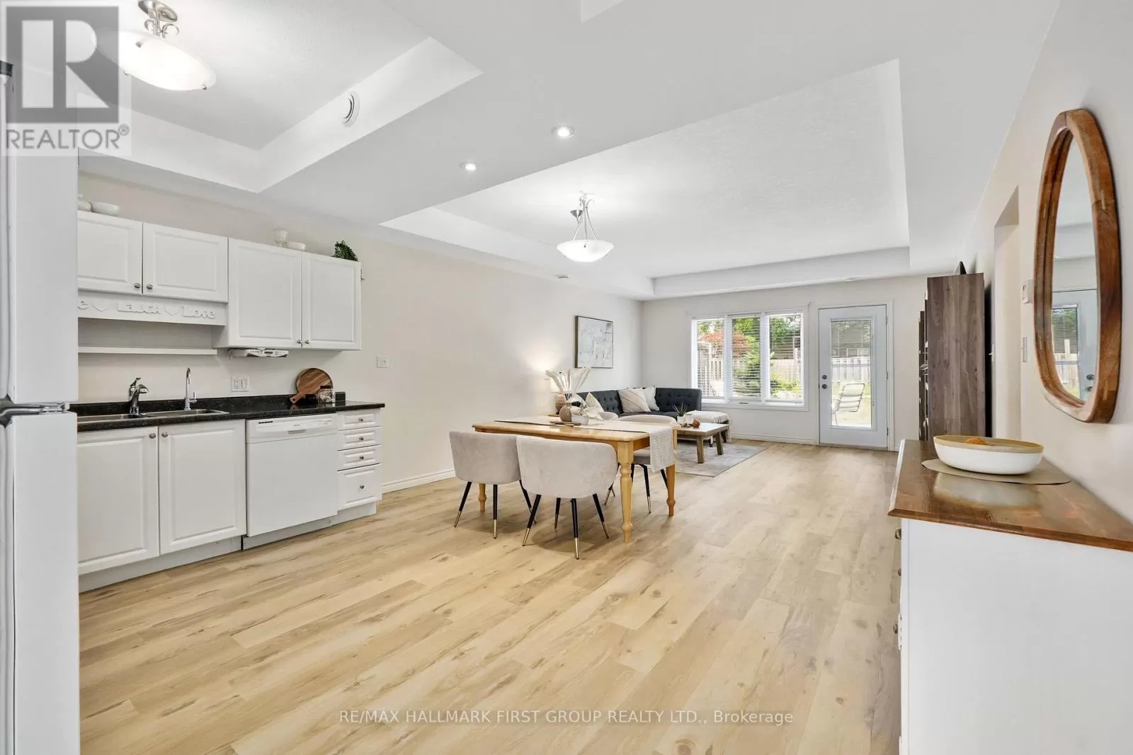 Cross Streets: George Court & Victoria St. ** Directions: CR2 heading East, Right onto Victoria St, Left onto George Crt. This low-maintenance, one-level townhouse features an efficient layout with carpet-free flooring in the main living areas, prioritizing comfort and ease. The front foyer provides direct access to the attached garage, making unloading simple, regardless of the weather. The open-concept principal space includes a bright and sunny living area with a walkout to the backyard, a central dining space accented by pendant lighting, and a well-equipped kitchen featuring matching appliances and recessed lighting. The spacious primary bedroom includes a walk-in closet and a full bathroom. A sun-filled guest bedroom and convenient in-suite laundry complete the layout. Step outside to enjoy a private deck and garden area that overlooks mature trees, providing a peaceful and secluded setting. Just minutes from town amenities and with quick access to the 401, this home is ideal for those looking to downsize and enjoy low-maintenance living. (id:27476)