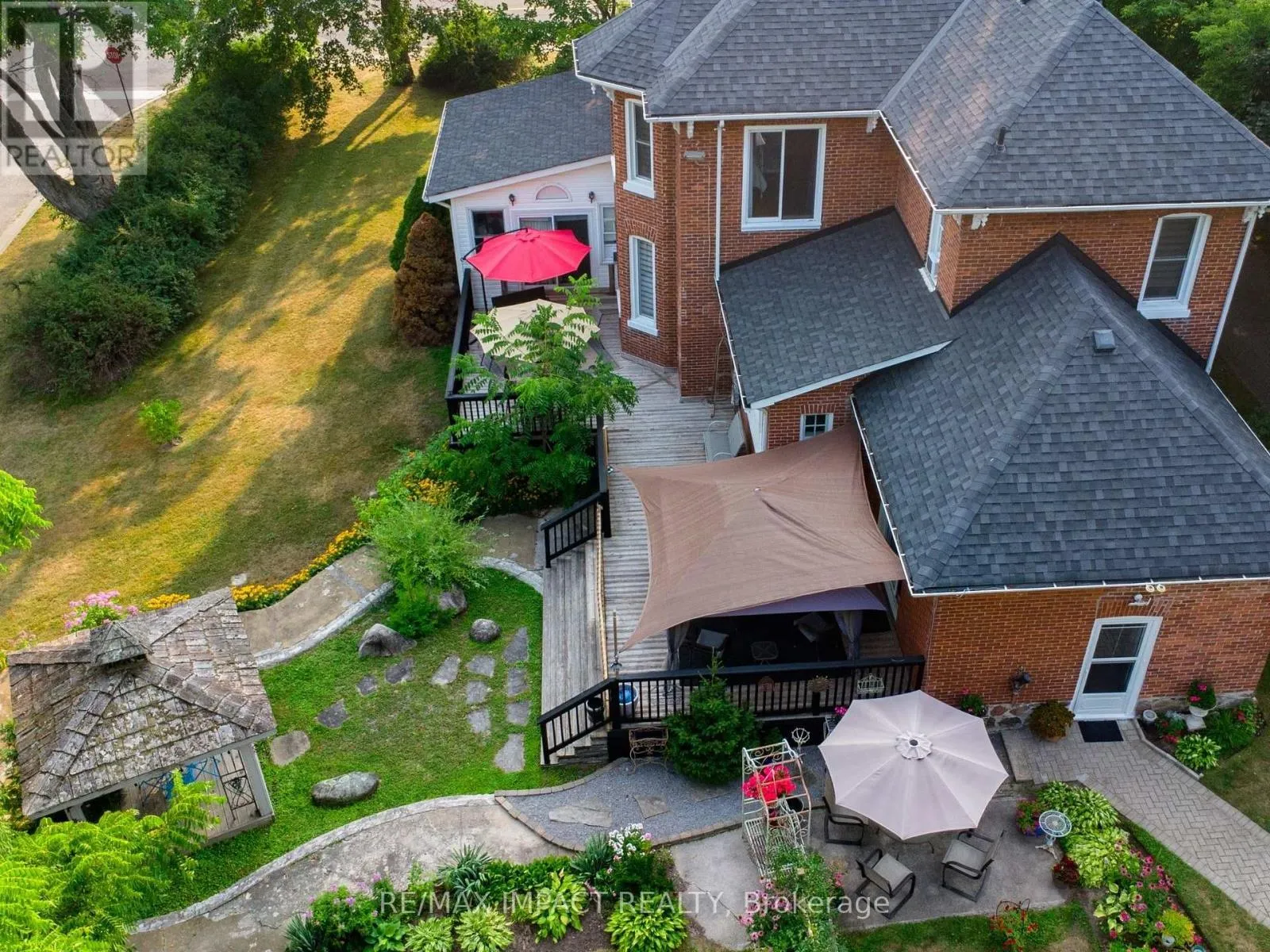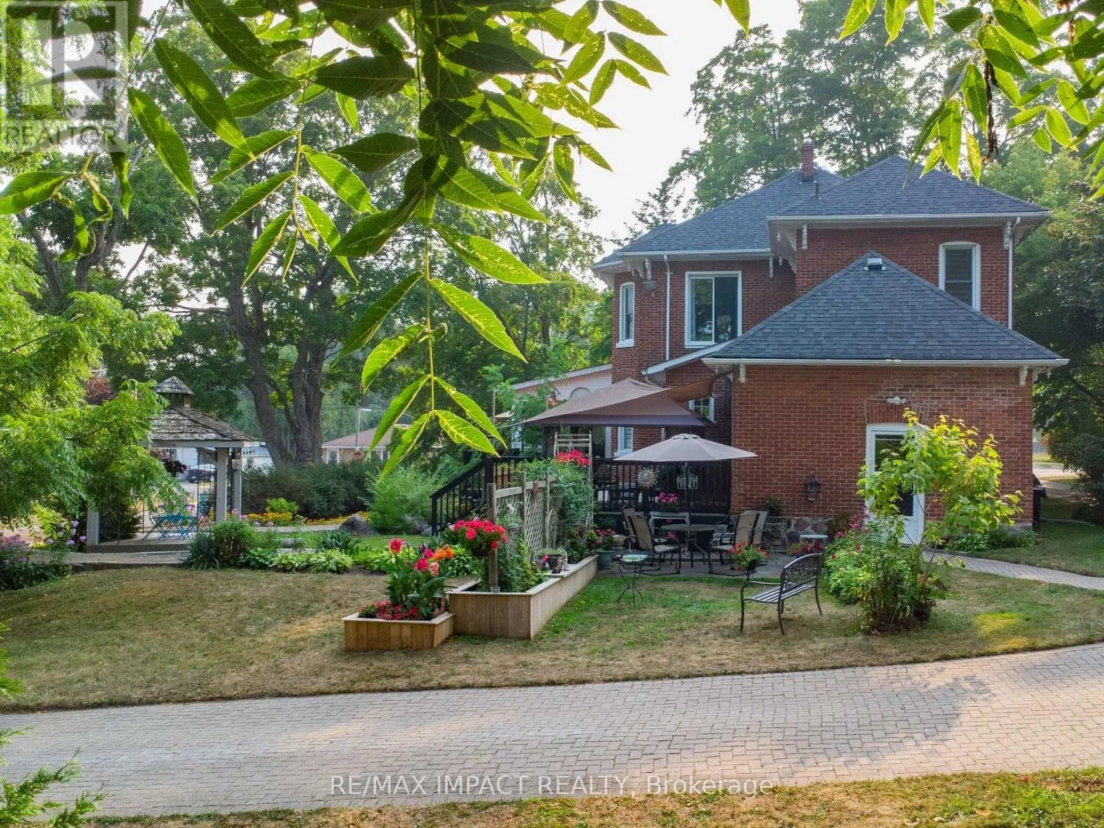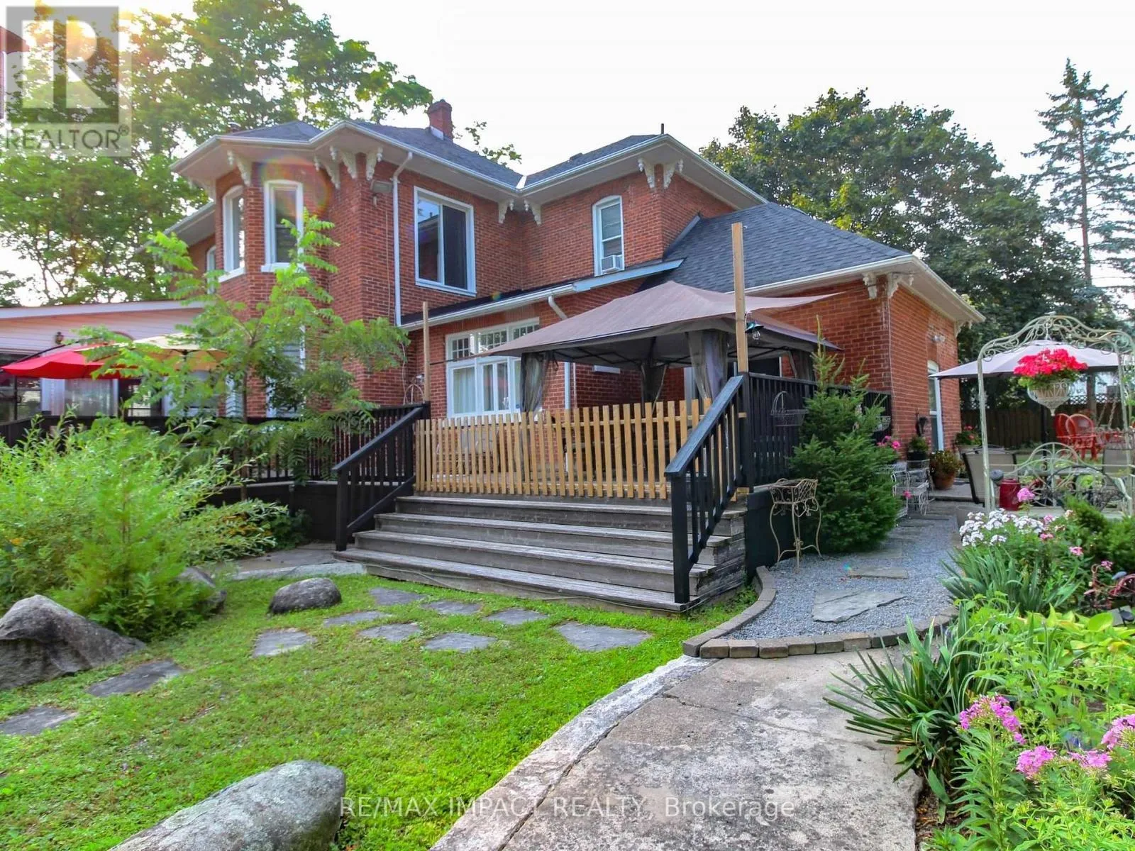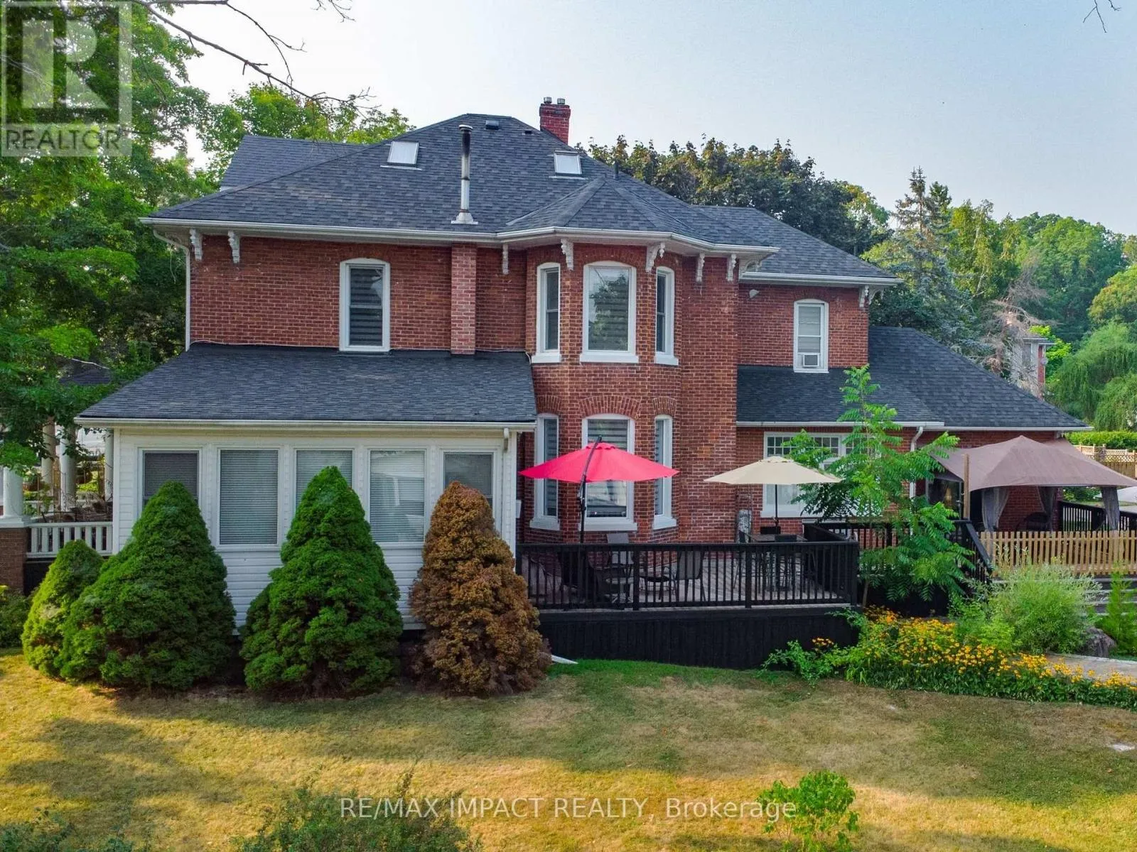 Cross Streets: Division St and King St (Hwy 2). ** Directions: 401 east to the \"Big Apple\" and go south on Division St and south of King St (Hwy 2). Welcome to this magnificent 2-1/2 storey brick CIRCA 1870's Century home, located in the downtown section of the Village of Colborne. This corner 0.63 acre lot with interlocking brick driveway running through the property provides access/egress to both Division and Creek Streets. The home's grandeur is one of the largest in the village, accentuated by a huge front veranda with white doric columns and ornate brackets under the wide eaves. Designed as an Italianate vernacular style, this Victorian home boasts an array of architectural details, including some window stained glass inserts, huge baseboards, extensive wood trim and hardwood flooring, glass door knobs, almost 10' main floor ceilings, plus a welcoming front foyer featuring a lit bannister and convenient powder room. The updated family kitchen showcases large porcelain tiles, a stylish white backsplash, s/s appliances and white cabinetry with quartz counters. The island includes a breakfast bar and the waffle white ceiling extends through to the windowed eating area. Off the kitchen, there is a convenient den, plus an expansive combined formal living/dining room with gas fireplace, hardwood floors and bay window area. Relax in the sunroom, complete with a cozy gas fireplace, abundant windows, stained wood ceiling, or step outside to the south deck with gazebo. The rear mudroom also features a gas fireplace with board-and-batten finished walls, plus access to full basement with concrete floor. Venture upstairs to the 2nd level with 3 well-appointed bedrooms, including a primary suite with a bay window and double mirrored closet doors. The upper level also features a large combination bathroom/ldry area with porcelain floor tiles, large walk-in shower, standalone soaker tub plus laundry facilities with front-load appliances. A spiral oak staircase leads to the 3rd level with a 4th bedroom, gas linear fireplace, round Palladian window dormer, skylights, plus 3-pc ensuite, mirrored closet and generous storage. (id:27476)