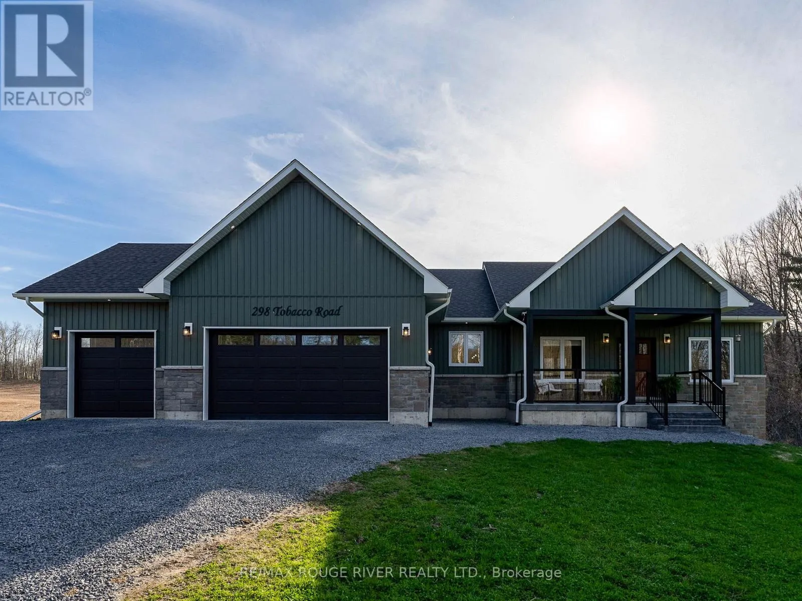 Pinewood School Rd & Tobacco Rd Welcome to 298 Tobacco Road, a stunning rural home nestled on a picturesque 1-acre lot in Cramahe Township. This exceptional custom-built home, spanning just over 1,700 square feet, features three spacious bedrooms, three modern bathrooms, and an impressive three-car garage. The heart of the home is the custom kitchen, designed for both function and style. With generous cupboard space, exquisite quartz countertops, and a large island that encourages culinary creativity, you'll love spending time in this space. A convenient pantry/larder adds even more storage and countertop space. From the living room, step out onto an expansive enclosed deck, where you can relax and soak in the scenic views of the surrounding open farmland, including breathtaking sunrises and sunsets. Retreat to the luxurious primary bedroom with a generous walk-in closet. The inviting ensuite features a deep soaker tub, a separate shower, and a double sink. Enjoy the added convenience of main-floor laundry, and find a beautifully designed main bathroom with a custom walk-in shower. The additional two bedrooms come equipped with ample closet space, perfect for family or guests. Imagine the endless possibilities in the sprawling, unfinished basement with its soaring 9-foot ceilings and a walk-out that overlooks the serene natural landscape. This home is a testament to superior craftsmanship, nurtured by trusted local tradespeople. The attached garage offers seamless access from the home, providing ample storage for vehicles and recreational toys. Located in prime area close to elementary and secondary schools, this home is just 10 minutes away from Brighton, Colborne, and the 401. Don't miss the opportunity to make this dream home yours! (id:27476)