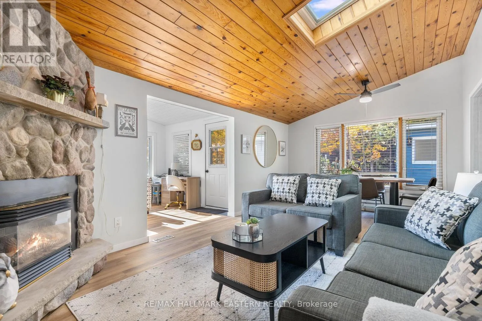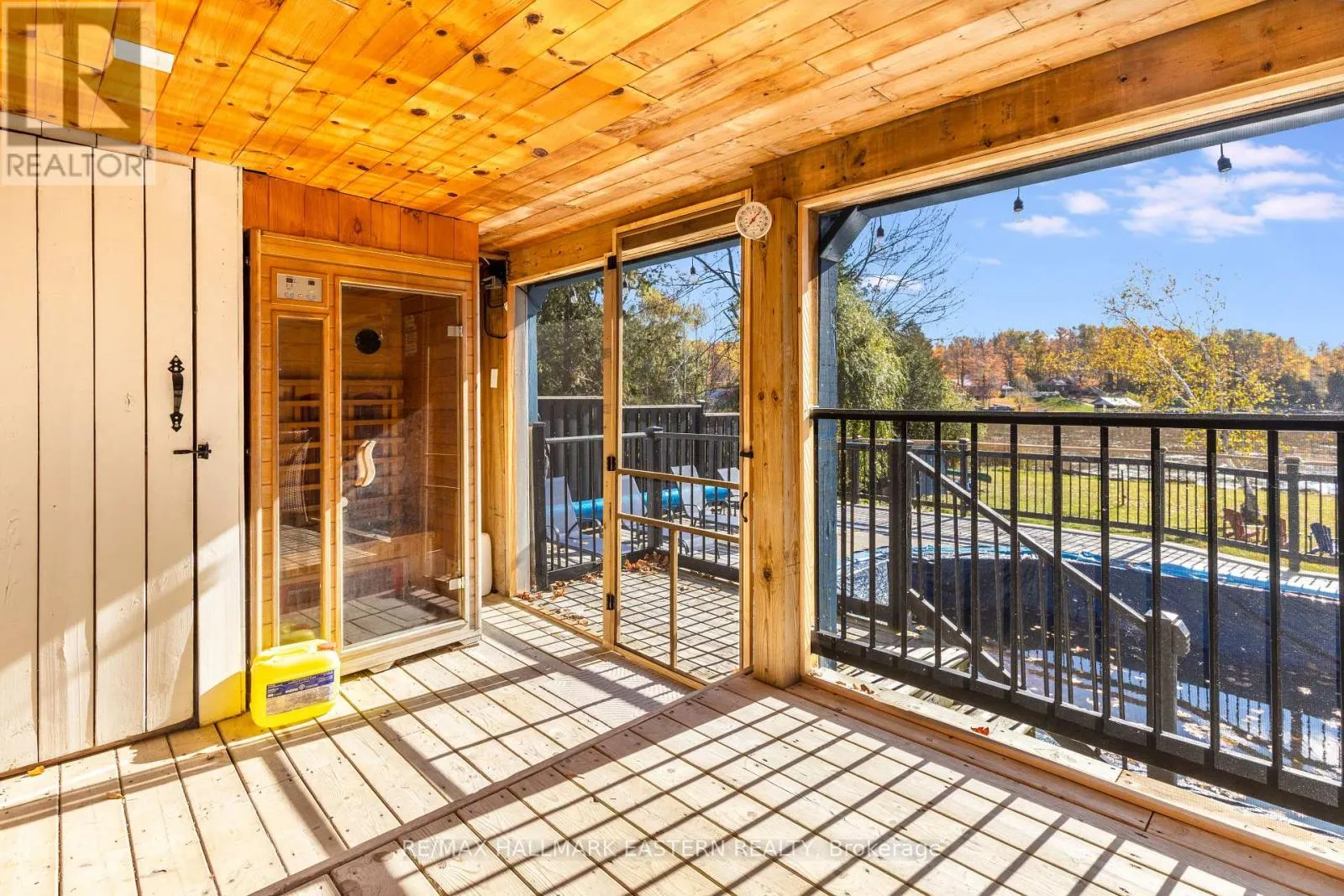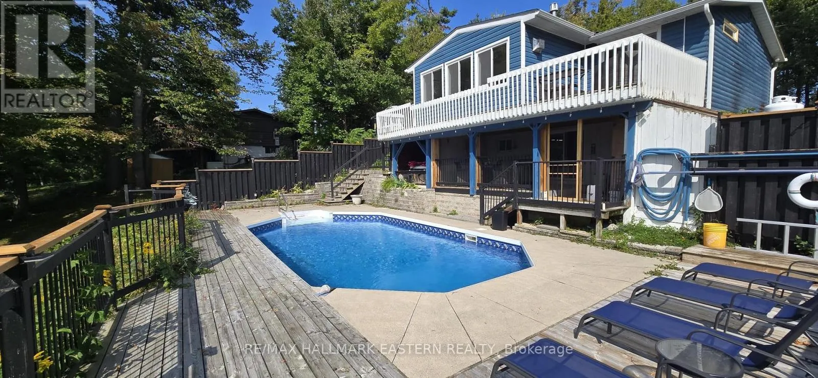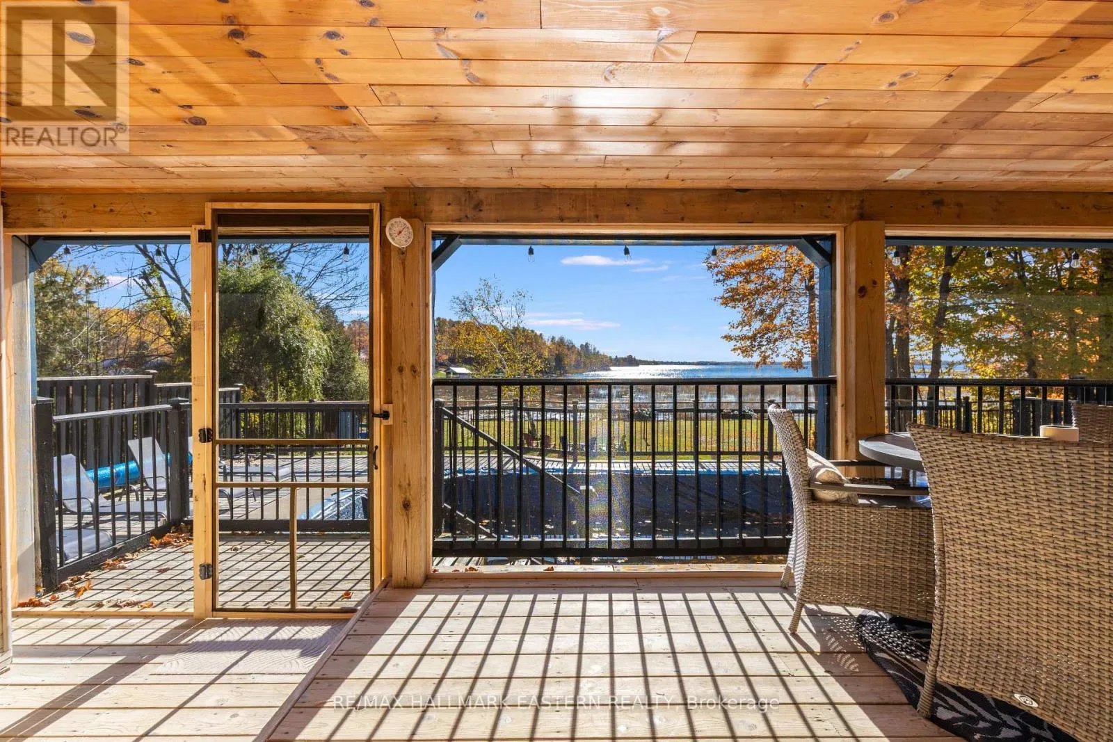 Cross Streets: Albert's Lane and Franklin Street. ** Directions: Curve Lake Road to Albert's Lane left on Franklin Street. This charming bungalow is nestled on the shores of Buckhorn Lake in the serene waterfront community of Beausoleil. It has 100 feet of waterfront with a fabulous south facing open lake view. This quaint two plus bedroom, one and half bath home features outstanding lake views and walk out to a balcony from the primary bedroom. The living room/dining room has a propane fireplace and a commanding lake view. The beautiful sunroom has a stunning lake view and is where you will spend hours watching the changing seasons on the lake. There is a door from the sunroom leading to the deck extending your living out of doors. The lower level offers a rec room, third bedroom, and a new 2 pc bath. There is a walkout to a covered and screened in patio that has a hot tub and sauna overlooking the lake for hours of enjoyment! Imagine relaxing in your hot tub while enjoying the view of the lake. There is a wonderful inground pool that overlooks the lake and is heated to extend your hours of enjoyment later in the season! The pool has had a new liner installed in 2025. There is a charming 2 bedroom bunkie which also has stunning lake views and has a door to the lakeside. It has been redone including all new insulation. This wonderful space is where your guests will want to stay. Two sheds and a large T-shaped dock complete this fabulous property! This wonderful property has had extensive renovations completed in 2025 including new forced air propane furnace and duct work, new central air conditioning, a new water system, new flooring throughout the upper level, bunkie completely redone, new pool liner and the home has been completely freshly painted. This property is located on leased land from the Government of Canada. The land lease is $3,080.00 + $1,675.00 for police and fire service, garbage disposal and road maintenance. There is a one time $500.00 owner transfer fee. There are NO LAND TAXES. New 35 year land lease available. (id:27476)