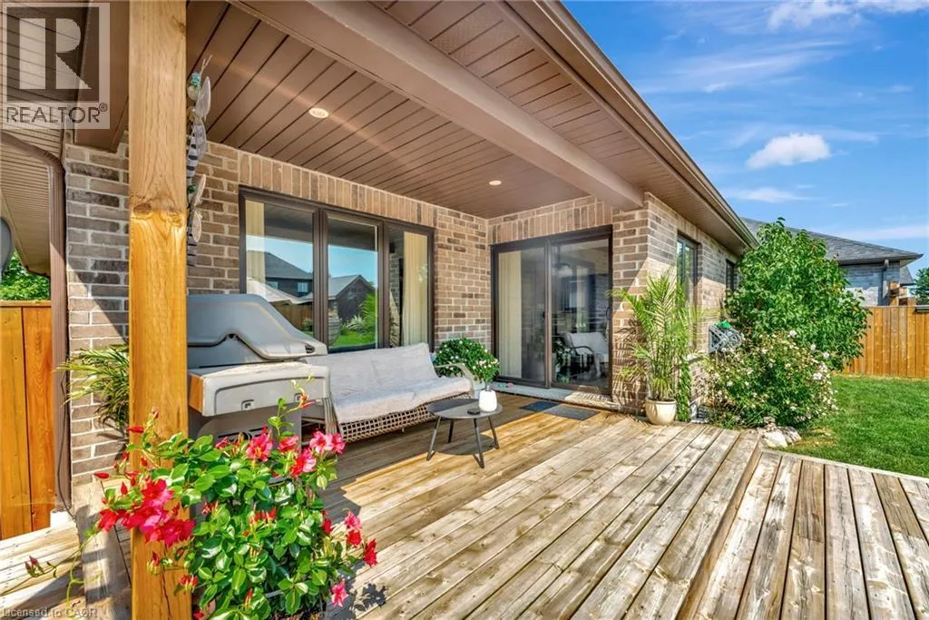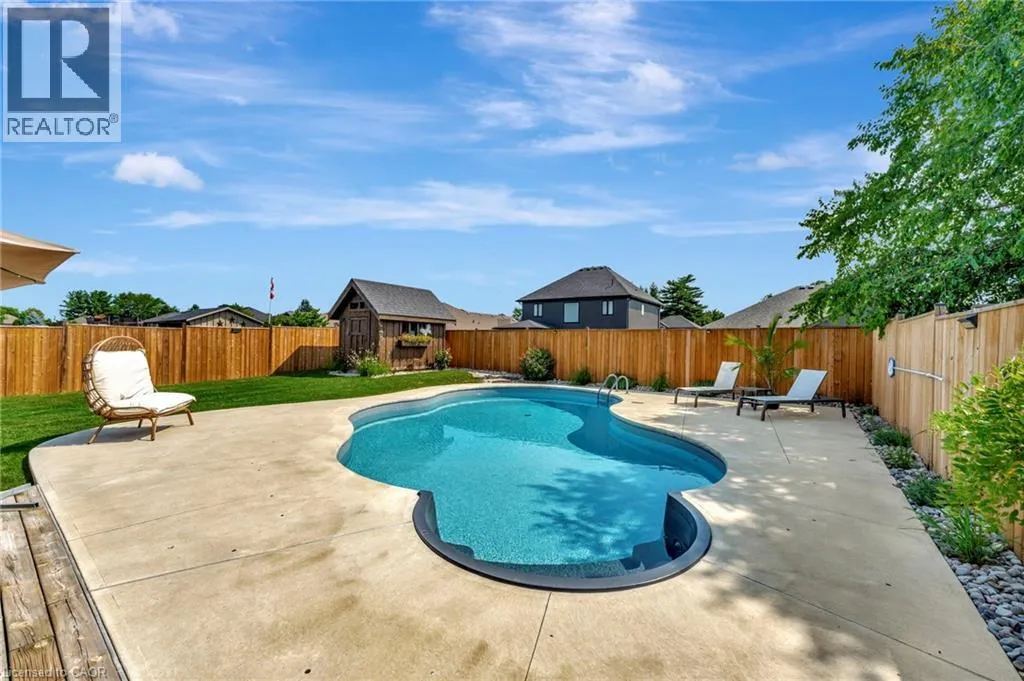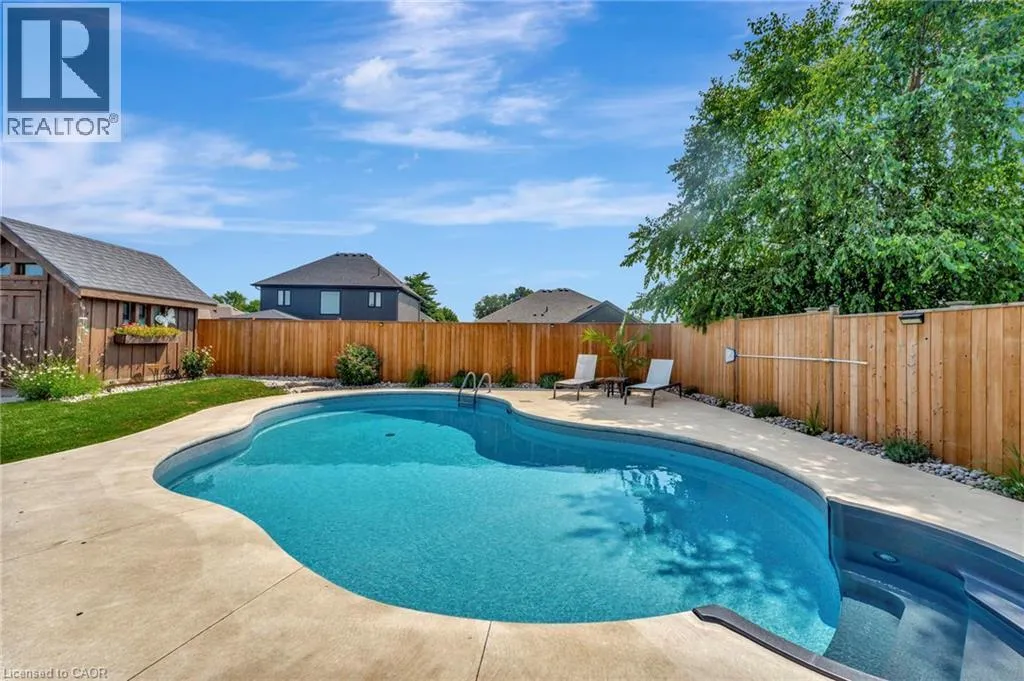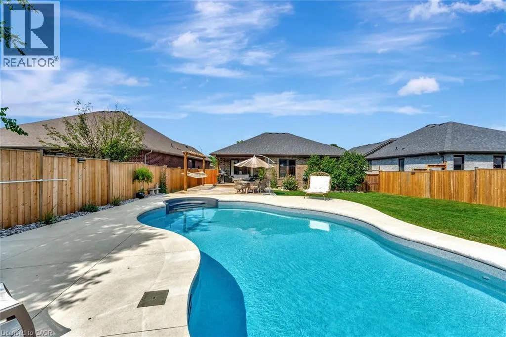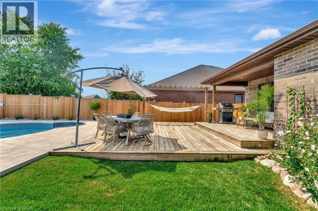 Church St E- Greening Drive-Courtland St Welcome to this beautifully maintained 2+1 bedroom, 2 bathroom brick bungalow in Delhi, Ontario â offering stylish finishes, functional living space, and your own backyard oasis. Step inside to a welcoming foyer that leads to a bright front bedroom and convenient 4-piece bathroom â perfect for guests or a home office. The open-concept living room is warm and inviting, anchored by a stunning stone fireplace that creates the perfect focal point for relaxing or entertaining. The gorgeous quartz kitchen features rich dark wood cabinetry, a breakfast bar with pendant lighting, and a dedicated dining area with sliding doors leading to your outdoor patio. Just off the kitchen, the spacious primary bedroom retreat offers a luxurious 5-piece ensuite. Main floor laundry adds everyday convenience. Downstairs, the partially finished basement provides a large recreation room and an additional bedroom â ideal for guests, teens, or extended familyâ plus a bathroom rough-in offering the opportunity to easily add a third full bathroom. Step outside and experience your own private paradise. The expansive wood deck with a built-in hammock extends your living space, while the exposed concrete with stamped edging adds a polished touch. Enjoy summers by the beautiful heated 16x32 South Coast inground pool, all maintained effortlessly with a 4-zone Rain Bird irrigation system. This home blends comfort, style, and outdoor luxury â a true standout in Delhi. (id:27476)