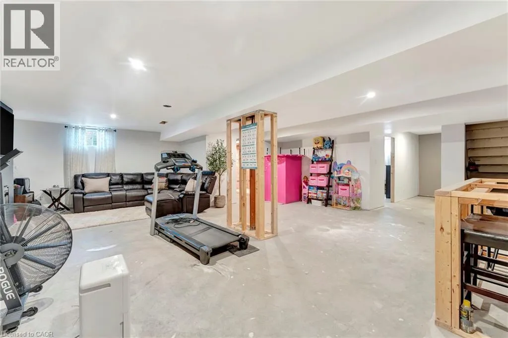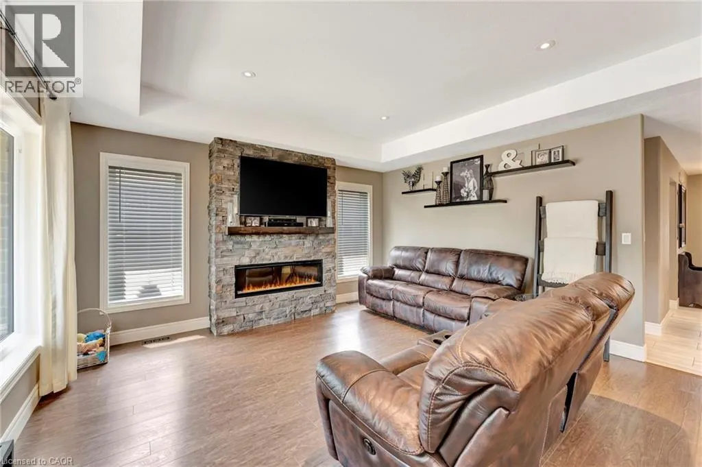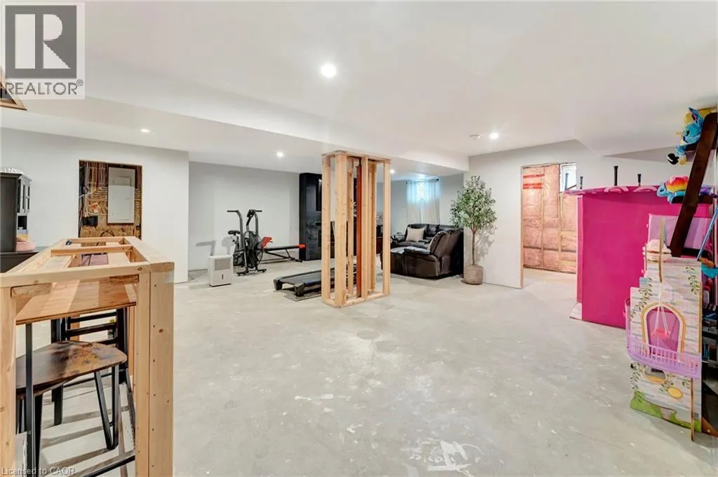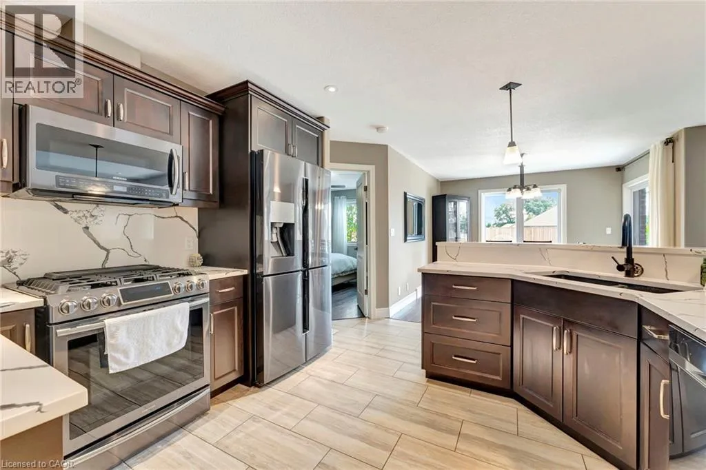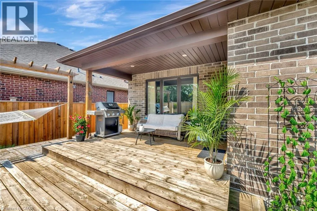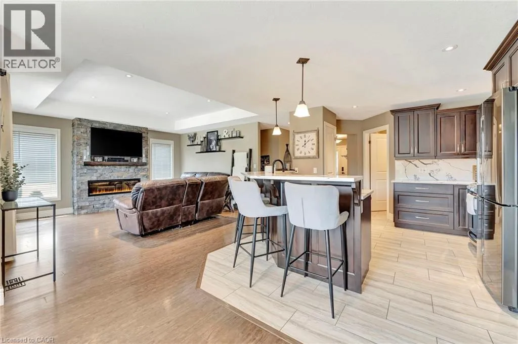 Church St E- Greening Drive-Courtland St Welcome to this beautifully maintained 2+1 bedroom, 2 bathroom brick bungalow in Delhi, Ontario â offering stylish finishes, functional living space, and your own backyard oasis. Step inside to a welcoming foyer that leads to a bright front bedroom and convenient 4-piece bathroom â perfect for guests or a home office. The open-concept living room is warm and inviting, anchored by a stunning stone fireplace that creates the perfect focal point for relaxing or entertaining. The gorgeous quartz kitchen features rich dark wood cabinetry, a breakfast bar with pendant lighting, and a dedicated dining area with sliding doors leading to your outdoor patio. Just off the kitchen, the spacious primary bedroom retreat offers a luxurious 5-piece ensuite. Main floor laundry adds everyday convenience. Downstairs, the partially finished basement provides a large recreation room and an additional bedroom â ideal for guests, teens, or extended familyâ plus a bathroom rough-in offering the opportunity to easily add a third full bathroom. Step outside and experience your own private paradise. The expansive wood deck with a built-in hammock extends your living space, while the exposed concrete with stamped edging adds a polished touch. Enjoy summers by the beautiful heated 16x32 South Coast inground pool, all maintained effortlessly with a 4-zone Rain Bird irrigation system. This home blends comfort, style, and outdoor luxury â a true standout in Delhi. (id:27476)