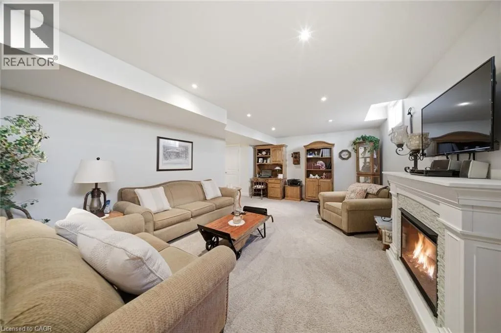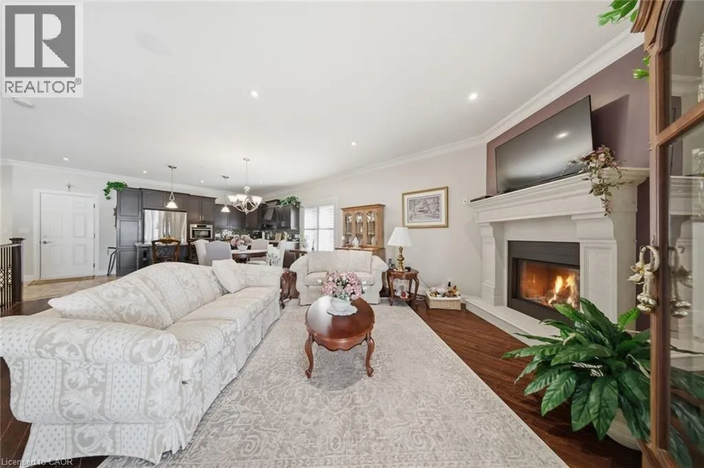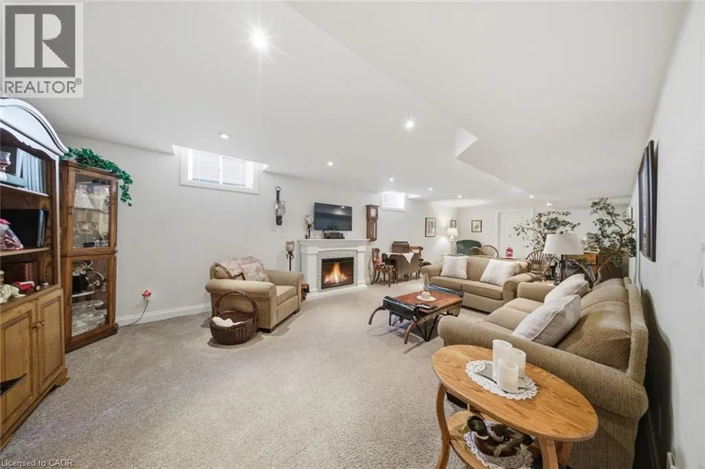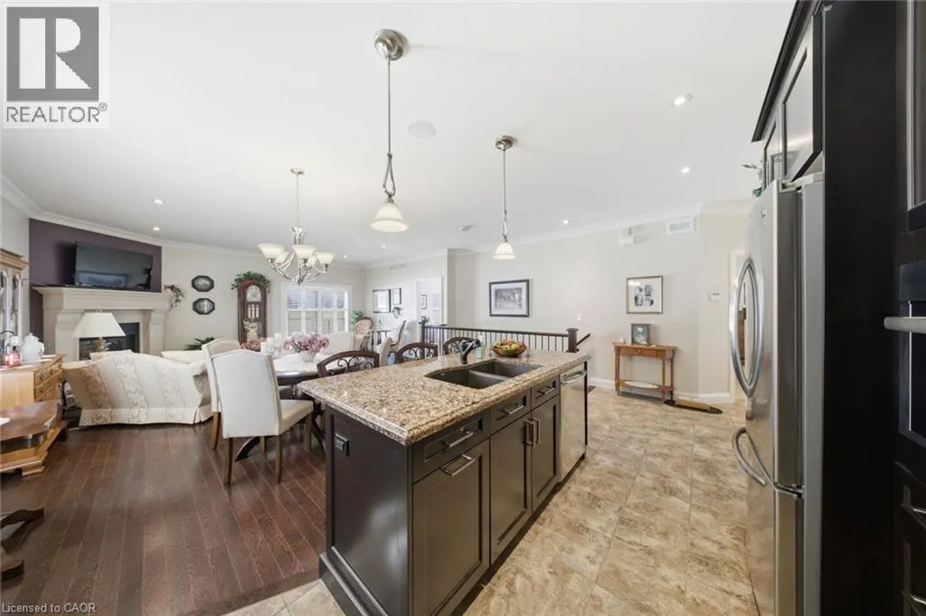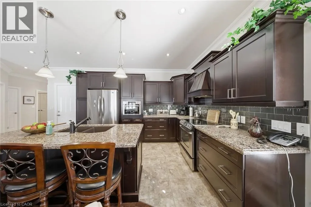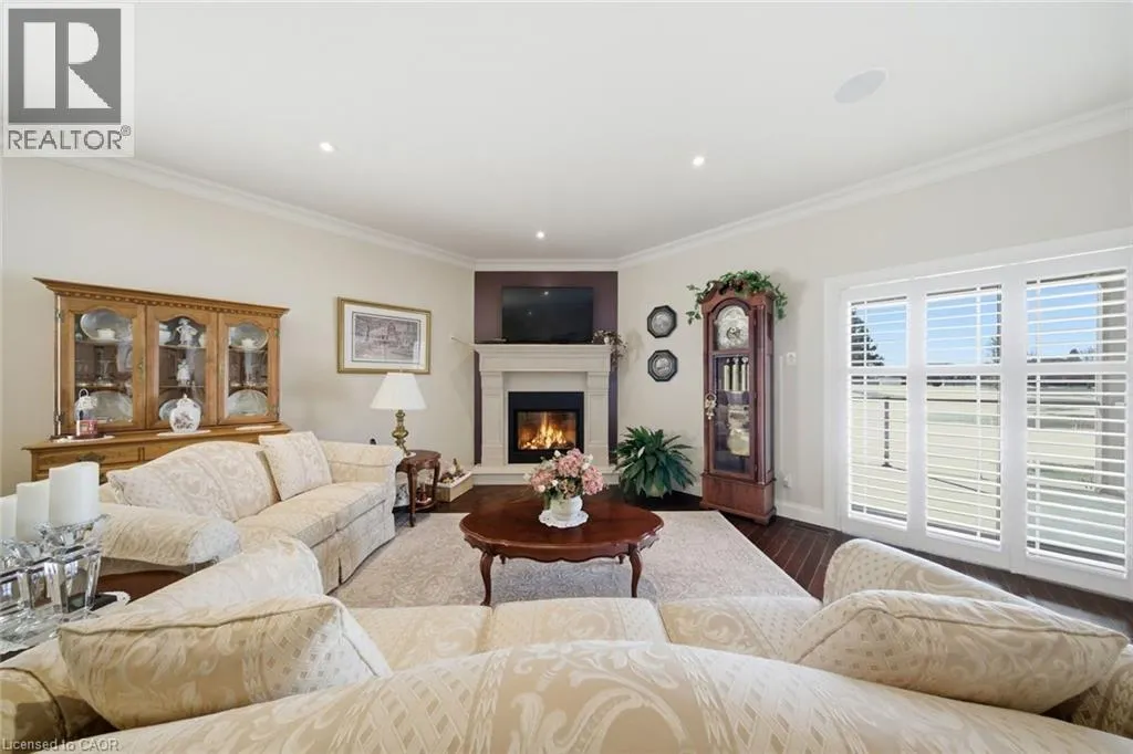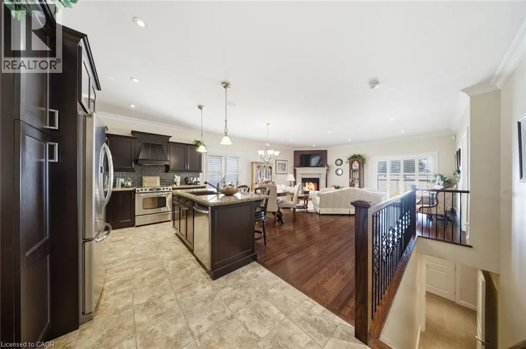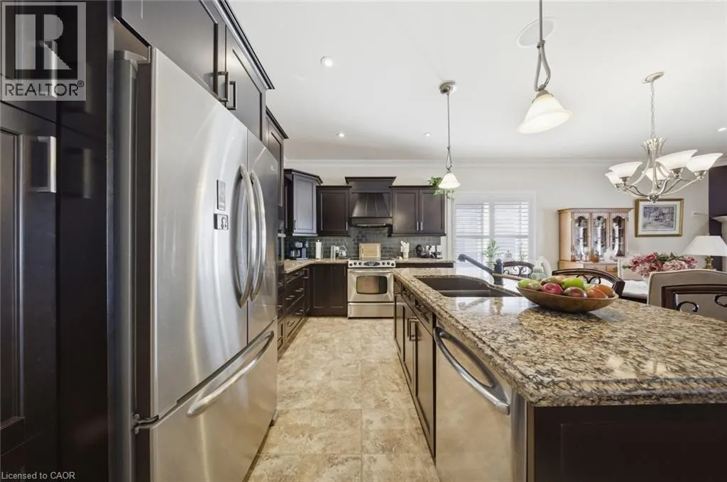 JAMES STREET TO WILSON AVE TO ST. MICHAELS STREET Welcome to this exquisite 4-bedroom, 3-bathroom residence in Delhi, where exceptional craftsmanship meets refined, modern living. From the moment you arrive, this home captivates with its timeless brick and stone exterior, concrete driveway, attached double garage, and impressive curb appeal. Thoughtful upgrades such as gutter guards surrounding the entire home add lasting value and low-maintenance convenience. The covered back porch is a true retreat, complete with sleek glass railings and remote-controlled sunshade blinds, perfect for relaxing or entertaining in comfort and style. Step inside to discover over 2,400 sq. ft. of beautifully designed open-concept living space. The gourmet kitchen is a chefâs dream, featuring elegant cabinetry, luxurious granite countertops, subway tile backsplash, a spacious island, and premium stainless steel appliances. The formal dining area and inviting living room showcase rich hardwood flooring, sophisticated crown molding, and a cozy gas fireplace with a custom hearth, creating a warm and welcoming atmosphere. The main floor offers two generously sized bedrooms, including a stunning primary suite with a walk-in closet and a stylish 3-piece ensuite highlighted by tiled flooring and a modern glass shower. A convenient 2-piece bath and dedicated laundry area complete this level. The fully finished basement expands your living space with a large recreation room ideal for gatherings, featuring a second fireplace, this one electric adding ambiance and comfort. Two additional bedrooms, a well-appointed 4-piece bathroom, and ample storage ensure space for family and guests alike. With contemporary décor, high-end fixtures, a built-in speaker system, two fireplaces (gas and electric), and thoughtful upgrades throughout, this home offers the perfect blend of luxury, comfort, and functionality. (id:27476)