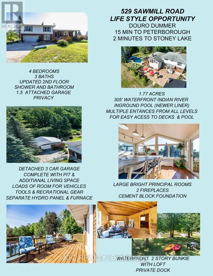 Cross Streets: COUNTY RD 4 & 3RD LINE. ** Directions: DUMMER 3RD LINE TO SAWMILL RD. Welcome to 529 Sawmill Road! If you envision creating a private family compound or are seeking a savvy investment with multiple income-generating possibilities, this 1.7 acres waterfront property offers remarkable flexibility, privacy, and potential. Set on the bank of the Indian River with breathtaking views and direct water access, this property is a true haven for nature lovers and outdoor enthusiasts. The main residence is a spacious four-level home thoughtfully designed to blend comfort, functionality, and waterfront living. Inside, you'll find a warm and inviting interior, perfect for both everyday living and entertaining. Gather with family and friends by the fireplace, or enjoy the bright, well-appointed kitchen and expansive, multi-level living areas that showcase panoramic river and nature views. Outdoor living is equally impressive. Spend summer days by your private in-ground pool, or unwind in the charming waterfront bunkie-perfect for guests, a home office, or a quiet retreat. Car enthusiasts and hobbyists will appreciate the detached three-car garage, complete with a pit and additional living space, offering ample room for vehicles, tools, and recreational gear. Whether hosting memorable summer gatherings, paddling along the river, or simply enjoying the tranquil surroundings, this property delivers a rare combination of privacy, space, and natural beauty. Two additional buildings on the property feature solid construction and versatile layouts, ready to be transformed into full living spaces. These are ideal for in-law suites, guest houses, short-term rentals, or long-term tenancies. Each building offers its own private access, providing endless configuration possibilities. More than just a home, this is a lifestyle opportunity-just a two-minute drive to the Stoney Lake public launch, 15 minute drive to Peterborough, and easy access to Highway 115. Don't miss your chance to own this extraordinary waterfront retreat. (id:27476)