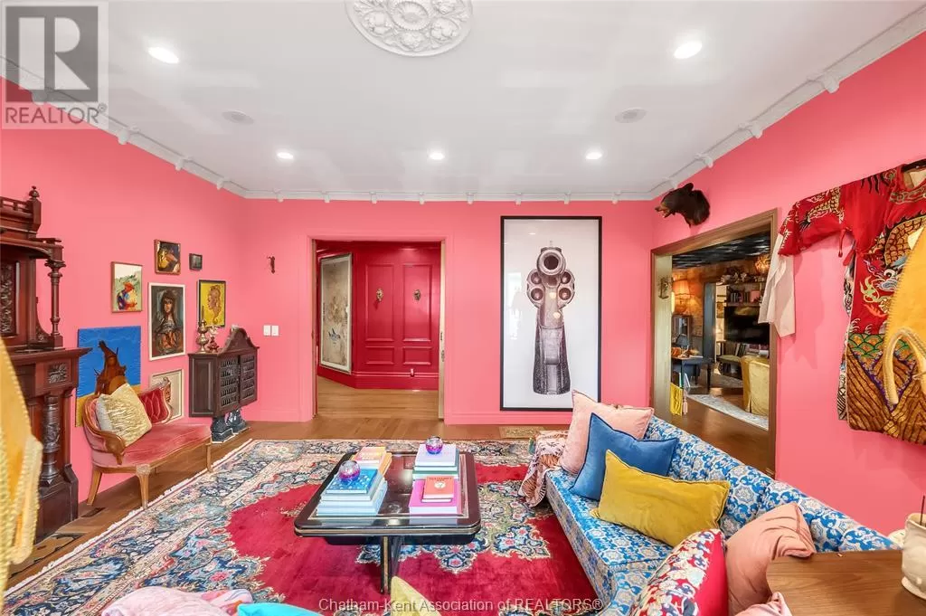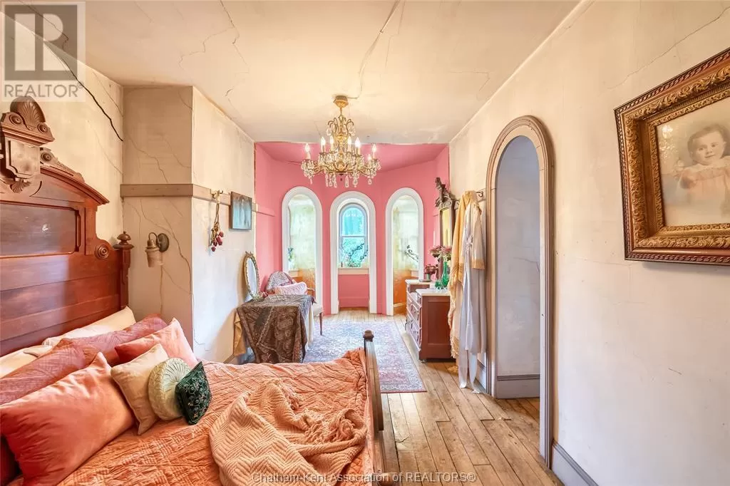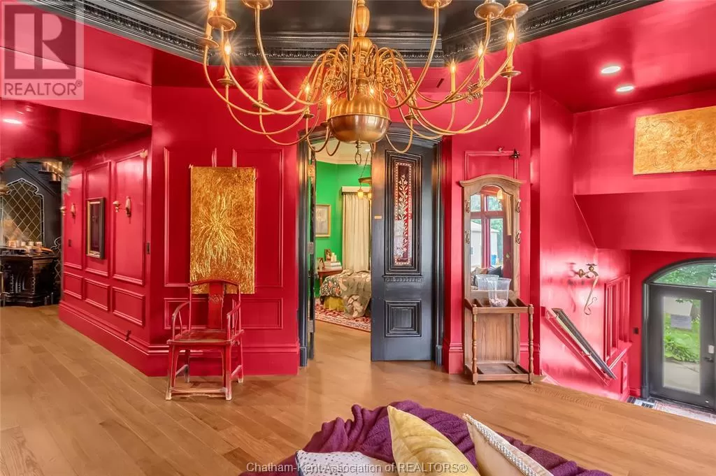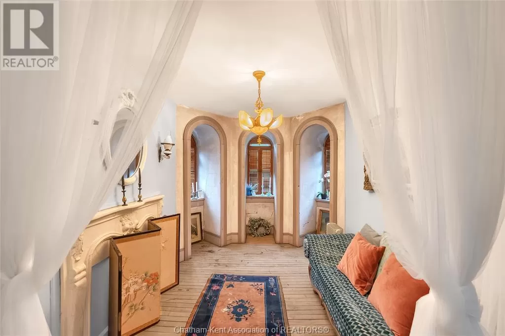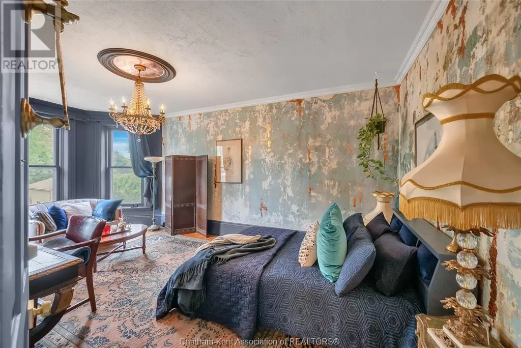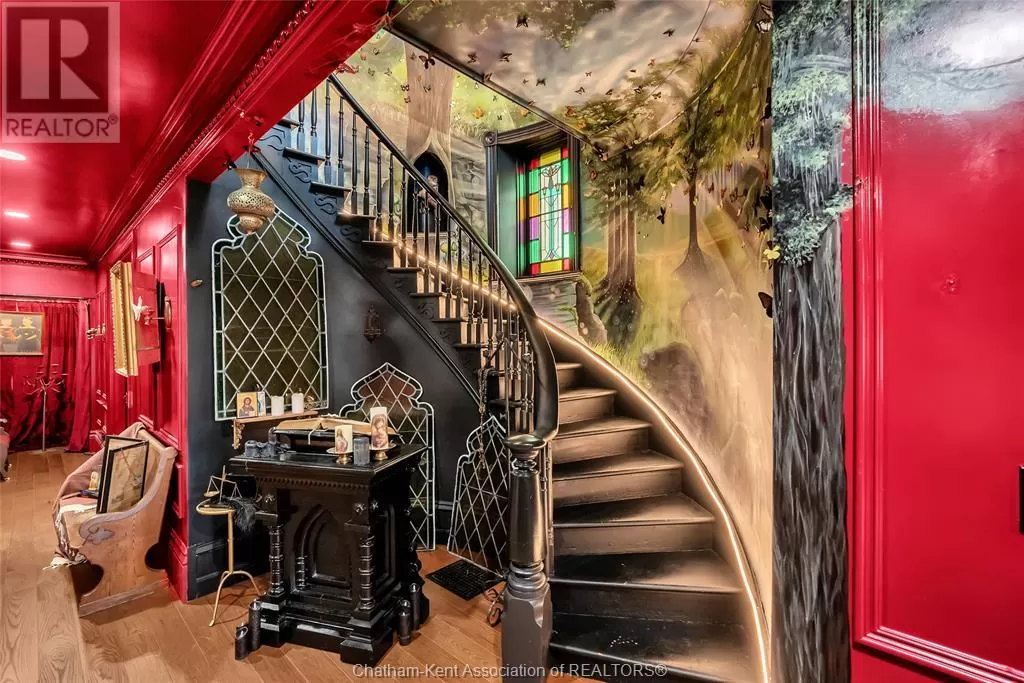 HWY 401 to Kent Bridge Rd to Dresden This 11,500 SF designer decorated home has over 10,000 SF of finished living area on 5 levels. The finishes are like no other and no expense has been spared on detail and materials, each room elicits a different feeling and experience. From secret passages behind bookshelves or a speakeasy and cigar lounge that lies cleverly disguised behind a hall curtain, this house is meant for someone with an equally complex and mysterious personality. Beyond its form, the function of this home is exceptional, multiple HVAC systems service different zones, massive storage rooms and an oversized garage complex that is accessible from multiple hidden stairwells. Located in the charming town of Dresden, known for its street festivals and friendly people. The property is zoned for a hotel use and with 6 bedrooms and 6 bathrooms the potential is there. Private booking income for weddings and corporate retreats is exceptional with steady demand at $3000plus for weekends. Take a full tour of this home through the iGuide 360° virtual tour. (id:27476)