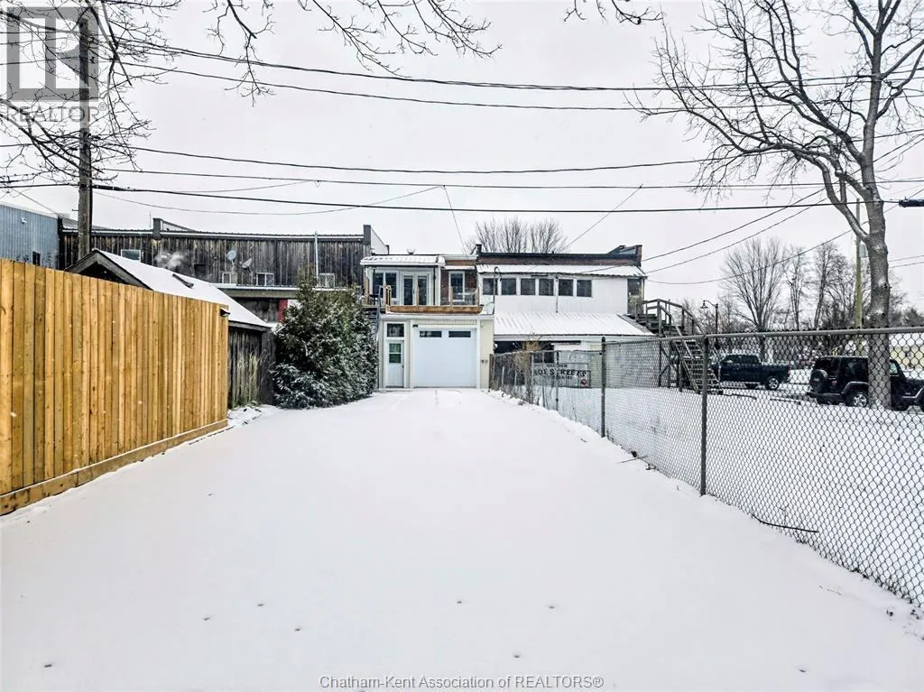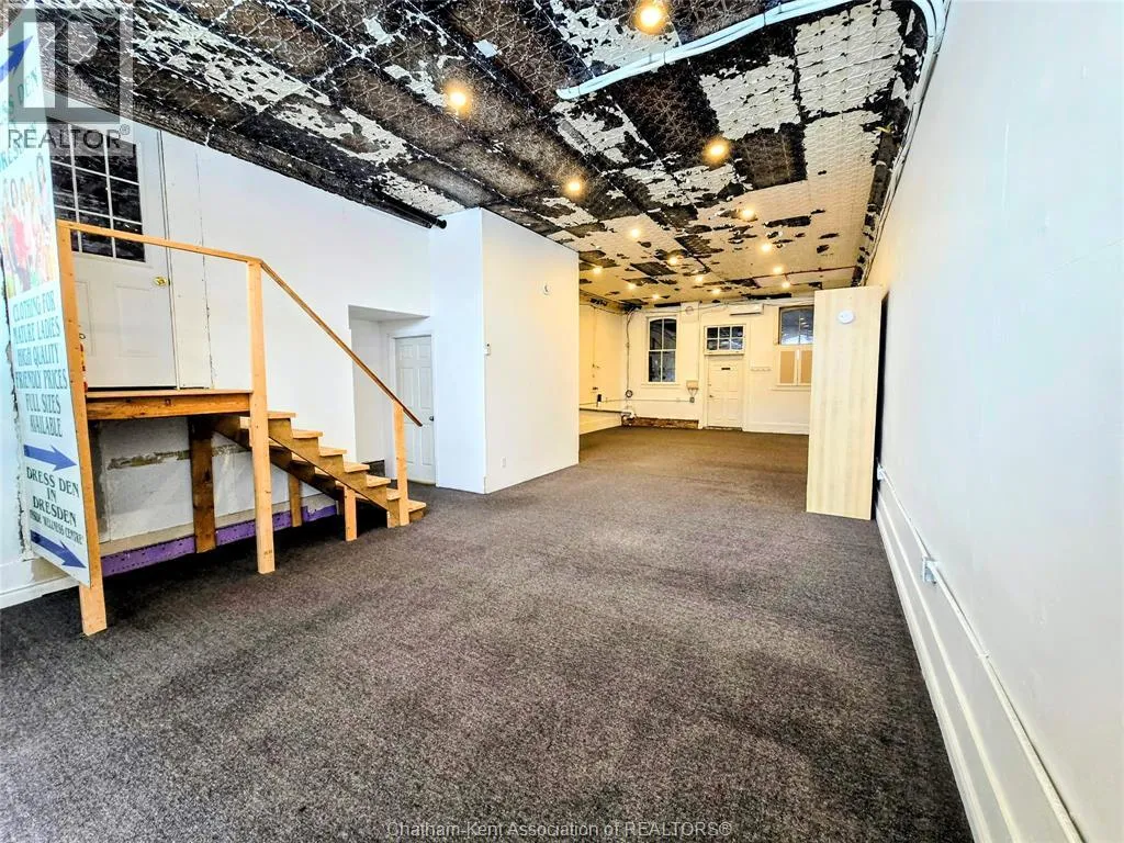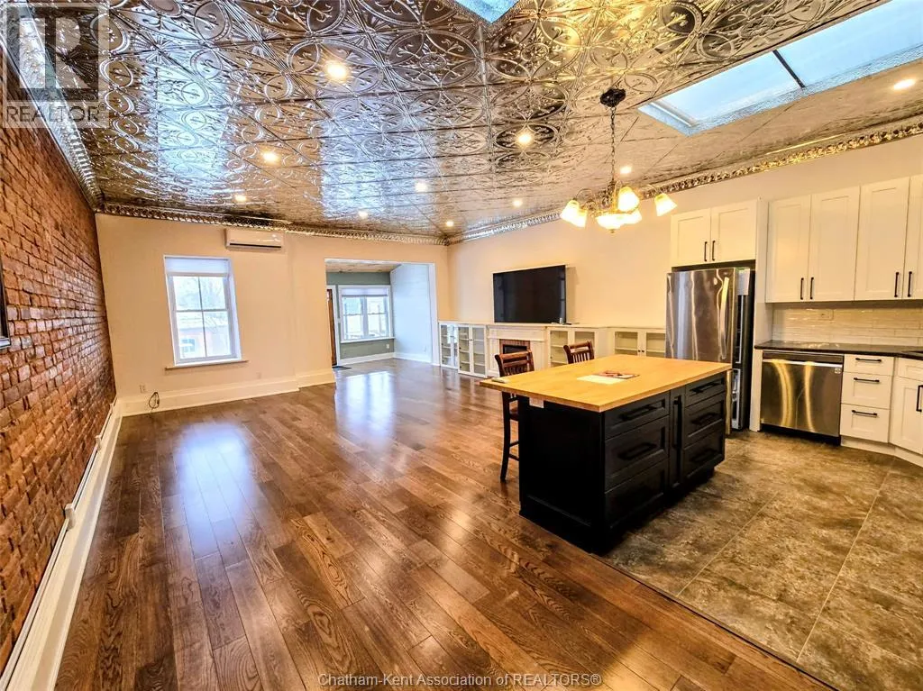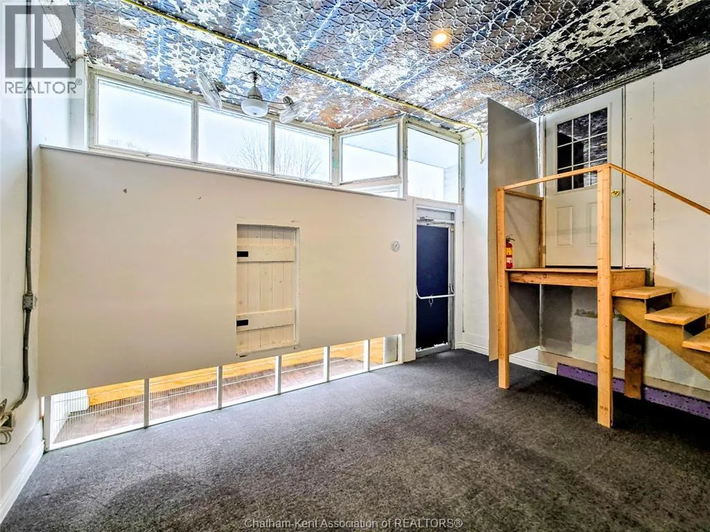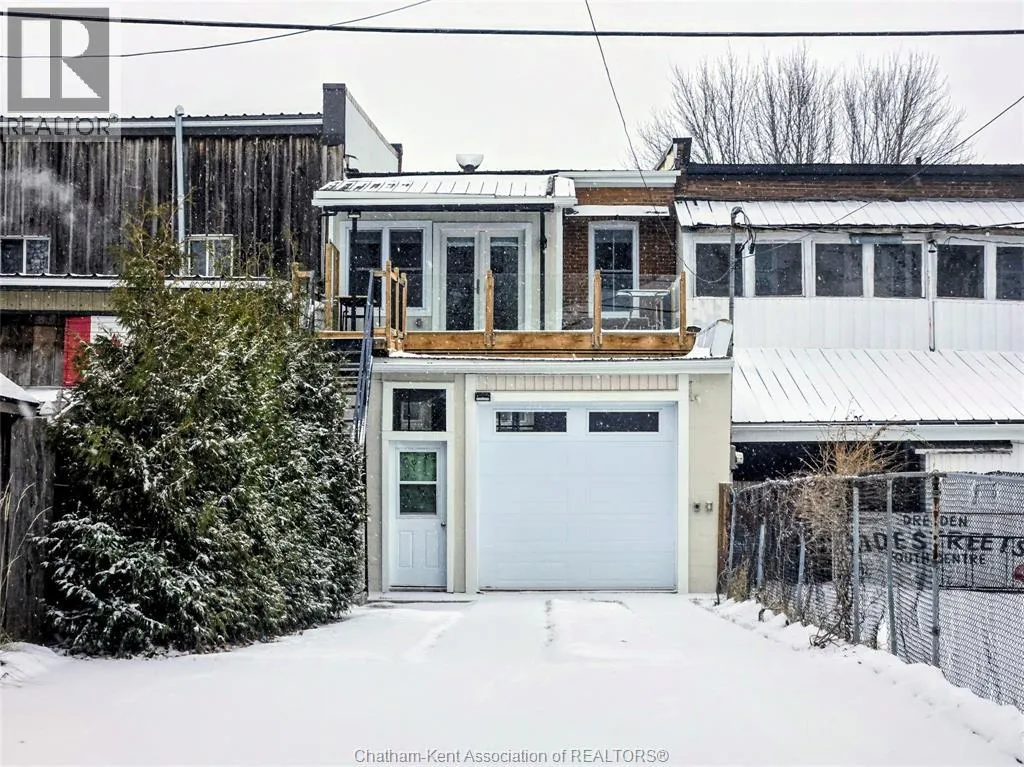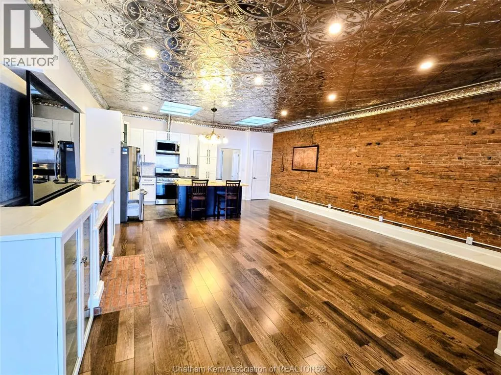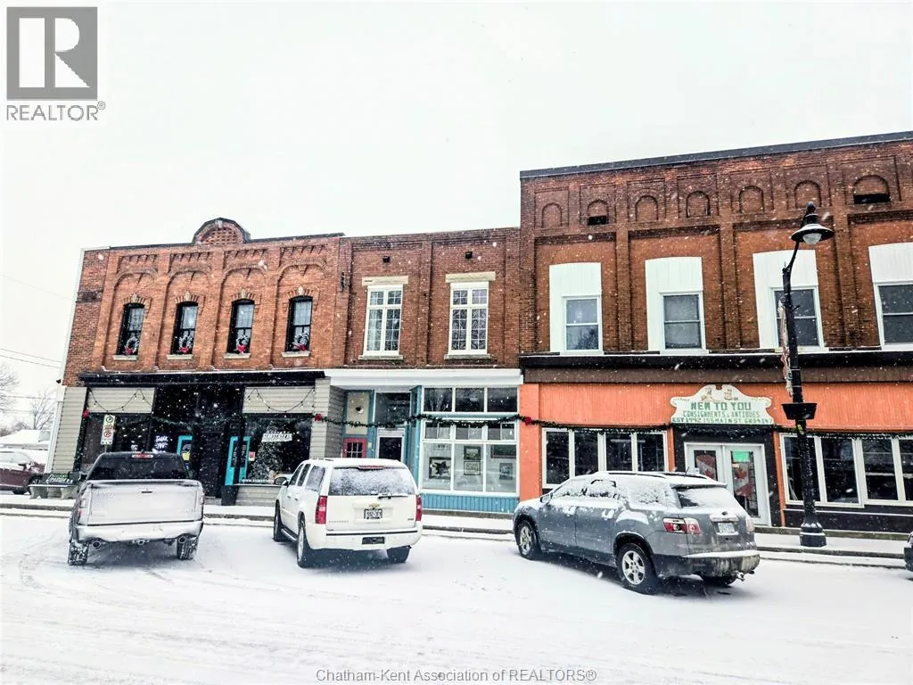 Welcome to 163 Main St in Downtown Dresden- A great investment with multiple opportunities for income potential!! The main floor offers a perfect commercial space (900 sq ft) in the heart of downtown with lots of natural light, charming original embossed tin ceilings and a 3 piece bathroom. A 20 x 21 heated garage (spray foamed walls/ceiling) sectioned off in the back adds an additional entrance plus garage door with plenty of outdoor parking (4+ spots). You could even turn this space into a second residential rental unit or utilize the main floor as a live/work opportunity. Although not currently being utilized a second, separate entrance from the front of the building could lead upstairs to the fully renovated and STUNNING residential unit (910 sq ft). This upper floor unit is absolutely breath taking with exposed brick, modern vintage inspired decorative tin ceiling with two fabulous skylights over the kitchen, and a large and bright living/entertainment space accompanied by a sunroom that leads to a spacious west facing balcony with rear entrance. All appliances in the kitchen/bath/laundry come with the building so you are set for success with separate meter capabilities for each floor. You don't want to miss this opportunity- set up a showing and make an investment towards your future today!! (id:27476)