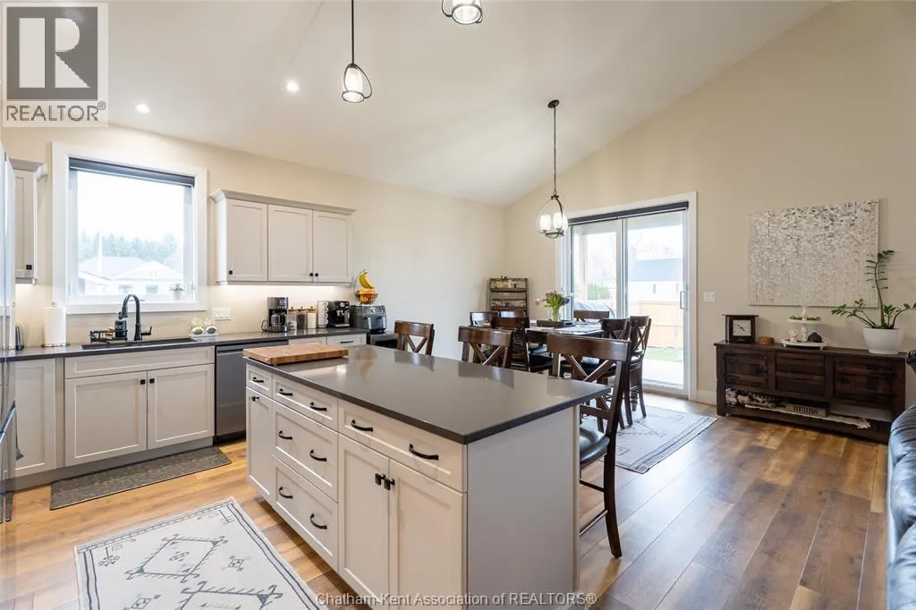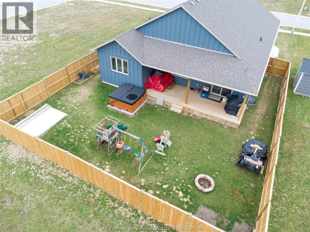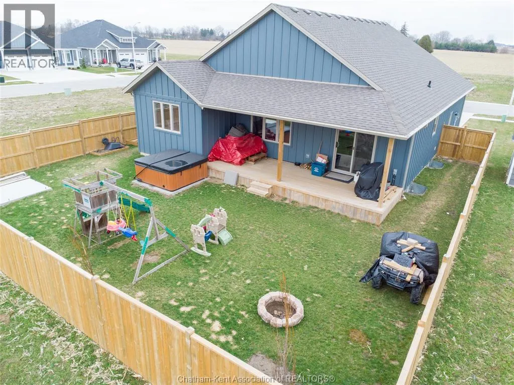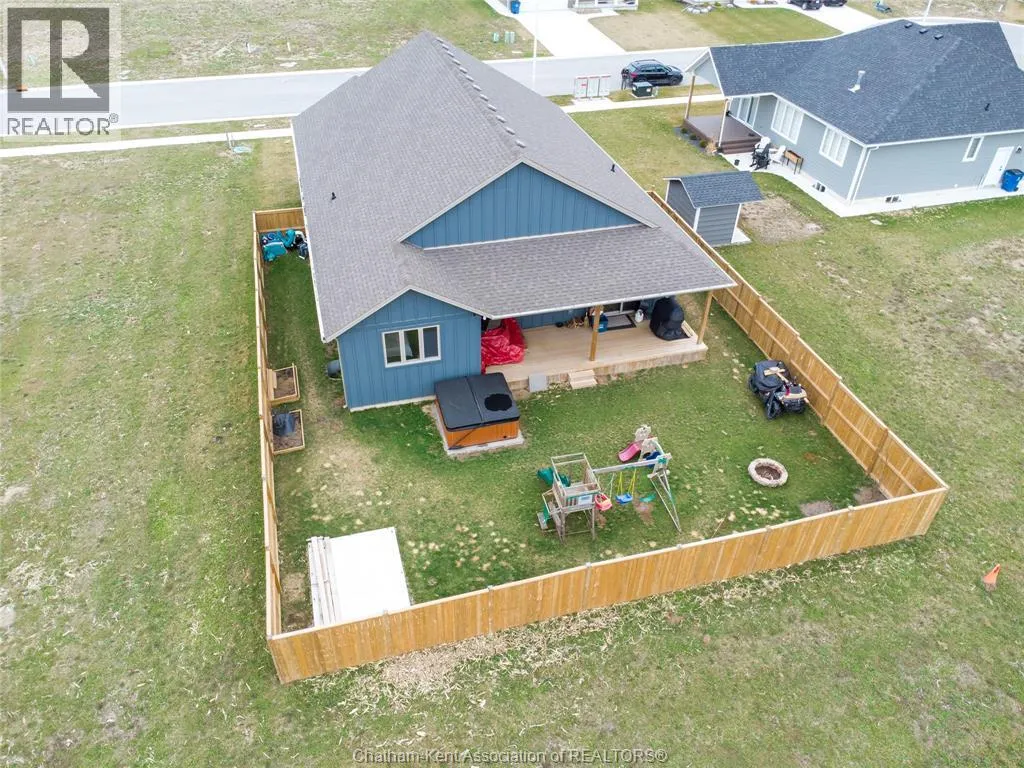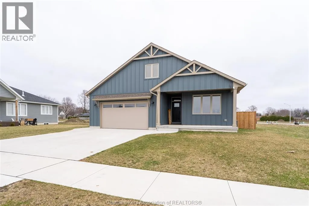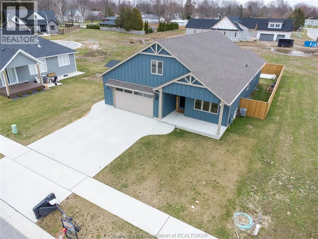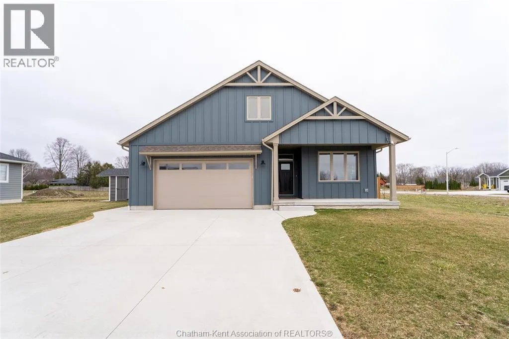 From St. George St, turn onto Camden St and follow the river. Go almost to the end then turn north onto DD St, then left onto DeMall Drive, then right onto Henson St. Sign in yard. This absolutely stunning 2023-built bungalow in the Rolling Acres subdivision in Dresden offers 3+2 bedrooms, 3 bathrooms, and 1,655 sq ft on the main floor with a fully finished basement, all set on a quiet, family-oriented cul-de-sac. Featuring a high-end James Hardie exterior and vaulted ceilings, this home combines quality craftsmanship with modern design. As you walk through the front doors into the great room, youâll immediately notice the high vaulted ceilings that enhance the sense of space and natural light. The open-concept layout flows seamlessly into the kitchen, which is beautifully finished with quartz countertops, ample cabinetry that goes to the ceiling, and a generous dining area. The main floor includes 3 bedrooms, including a primary suite with a private ensuite and walk-in closet, along with an additional full bathroom. The fully finished basement adds 2 more bedrooms, a third full bathroom, a large family room with a cozy fireplace, and plenty of storage throughout, making it ideal for growing families or multi-generational living. Step outside to a fully fenced backyard featuring a poured concrete pad ready for a future shed. The double car garage is heated and cooled, and the double-wide concrete driveway adds convenience and curb appeal. Located in one of Dresdenâs most desirable neighbourhoods, this move-in ready home offers space, comfort, and modern finishes throughout. Transferable Tarion Warranty. Donât miss your opportunity to own a newer home in a prime location book your private showing today. (id:27476)