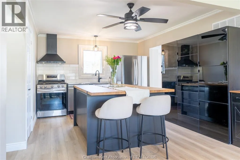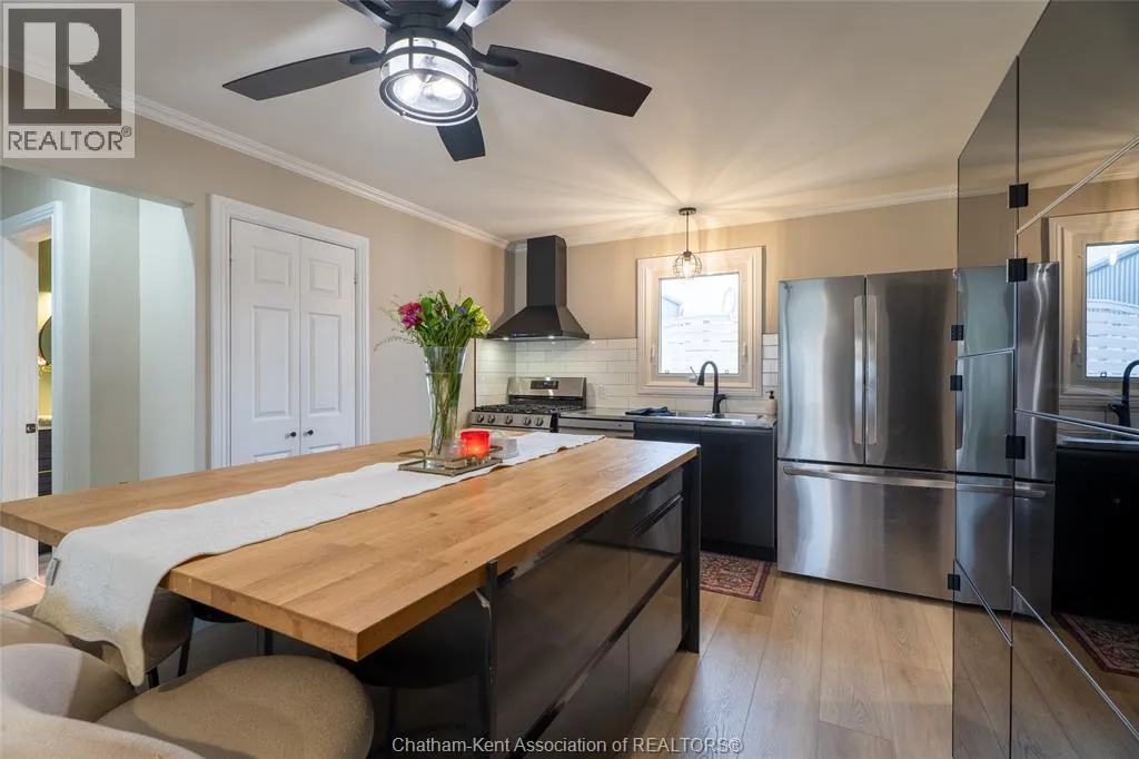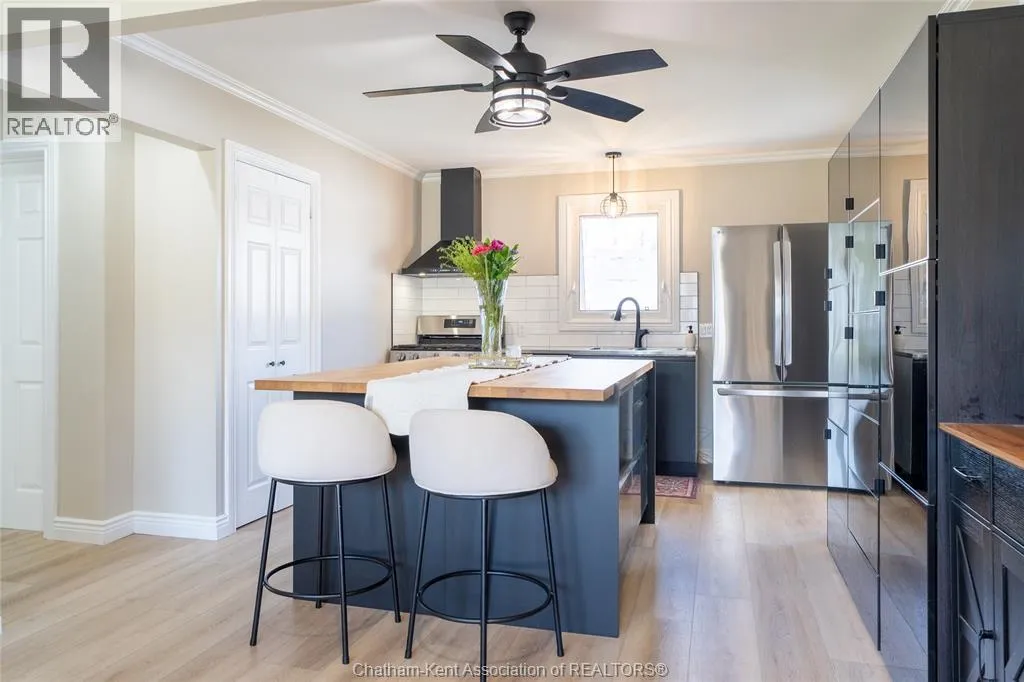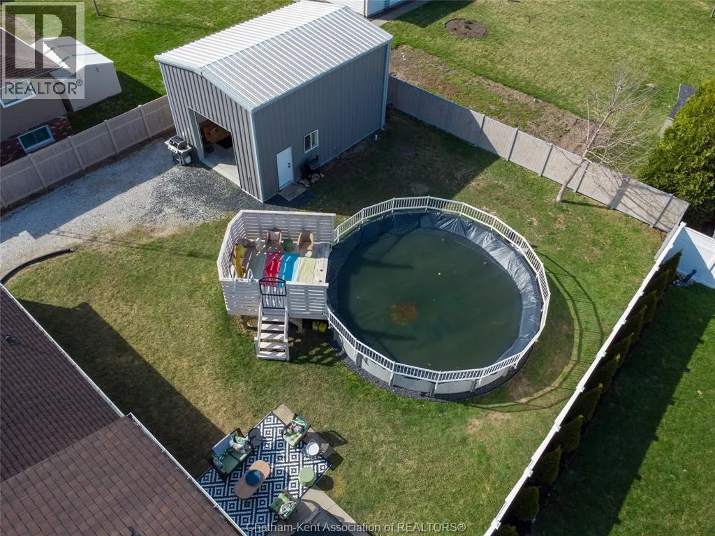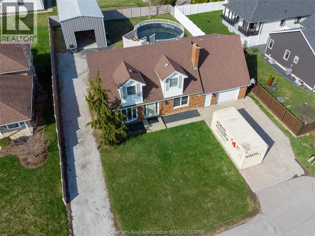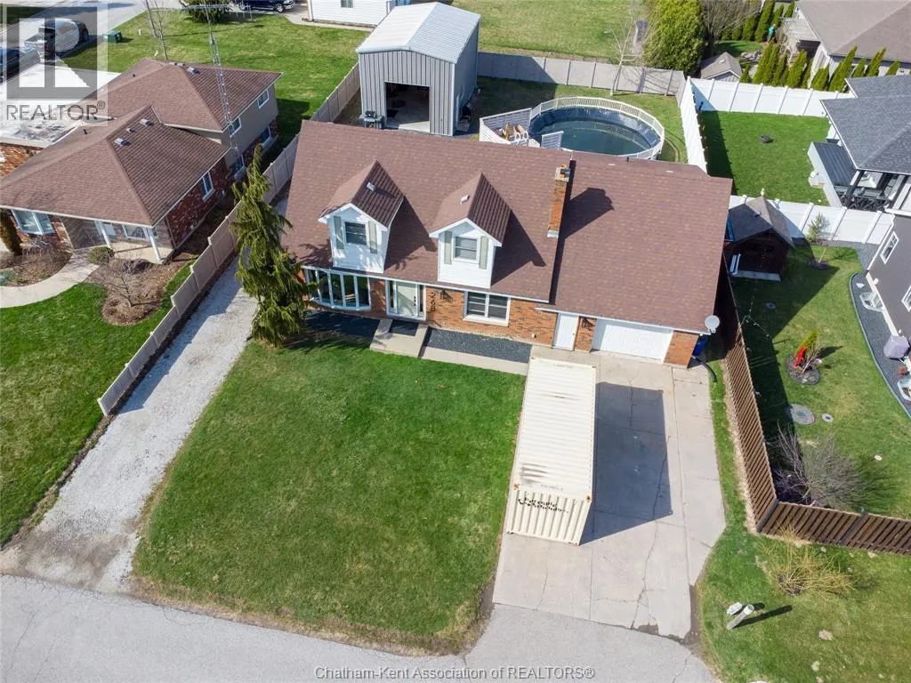 FROM ST. GEORGE ST, TURN EAST ONTO DAVIES ST. E. HOUSE IS UP ON THE LEFT HAND SIDE. SIGN IN YARD. This beautifully renovated, over 2,200 sq ft family home in Dresden offers 4 bedrooms and 3 full bathrooms and sits on an oversized lot in a sought-after neighbourhood near the Stranak Cres/Venture Cres area. Thoughtfully updated throughout, this home offers space, functionality, and modern finishes. Inside, youâll find a bright layout featuring a brand-new kitchen with new appliances, updated cabinetry, tile backsplash, and a large island with a butcher block countertop. The main floor showcases real wood trim and brand-new LVP flooring throughout, along with a fully renovated main floor bathroom. The home has been tastefully updated with new flooring, doors, light fixtures and windows, creating a fresh, move-in ready feel. The main floor offers a spacious living area, main floor laundry, and a bedroom with access to a full bathroom. Upstairs features the primary bedroom with ensuite, two additional bedrooms, and another full bathroom. Two separate living spaces provide flexibility for families. Another standout feature of this property is the brand-new detached workshop measuring 20' x 30' with 16' to the eaves, complete with its own separate driveway. Built on an engineered concrete pad with in-floor heat, it includes fiberglass blanket insulation, tankless system, 60 amp service, and is equipped with water and gas. Recent updates include a newer furnace, central air conditioning, encapsulation in the crawl space with a transferable warranty and spray foam over block foundation. The new fully fenced backyard includes a 54"" on-ground pool and a 10' x 12' deck. An attached double-car garage with inside entry and a concrete driveway adds convenience. Move-in ready and located in a quiet, family-friendly area close to schools and amenities. Book your private showing today. (id:27476)