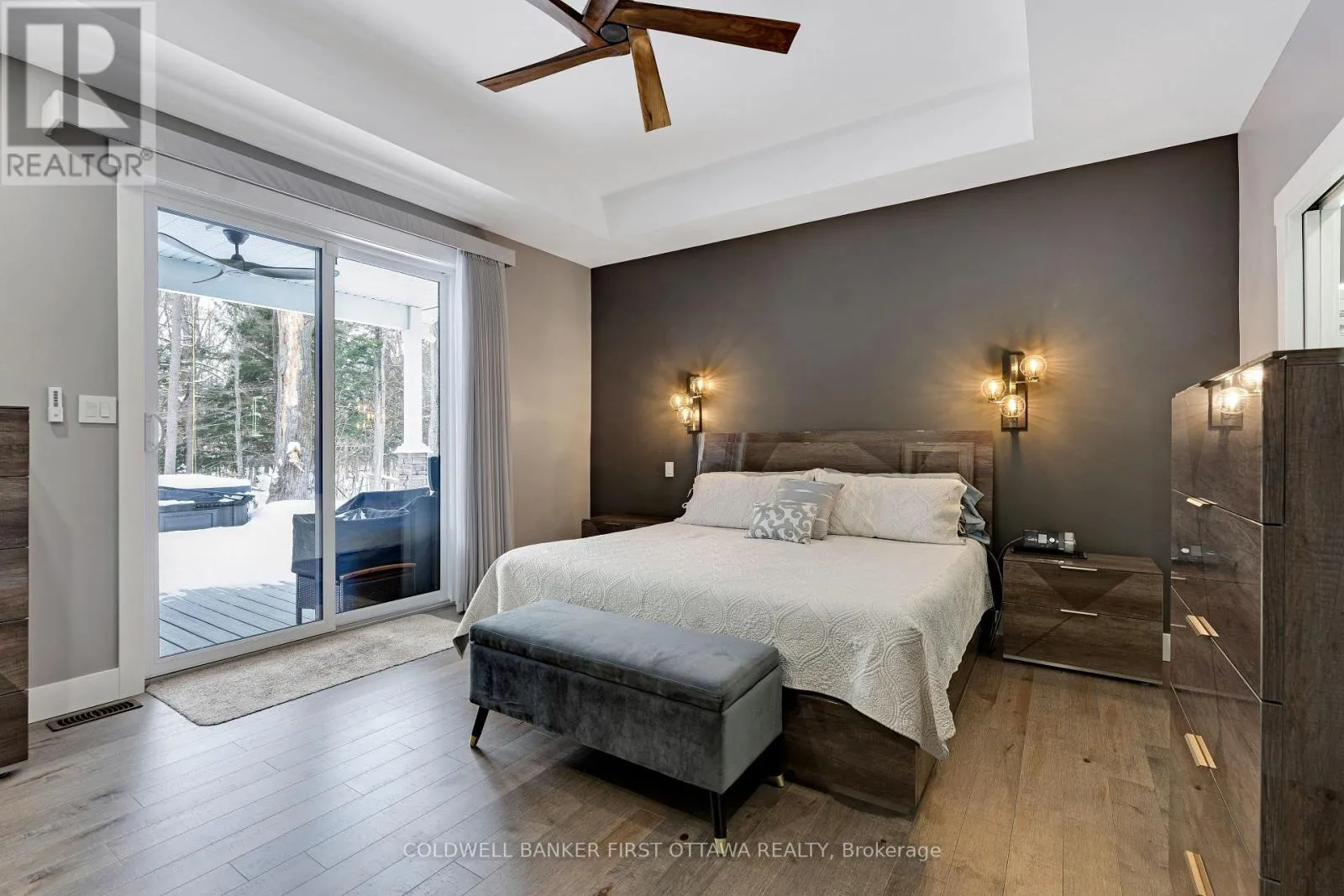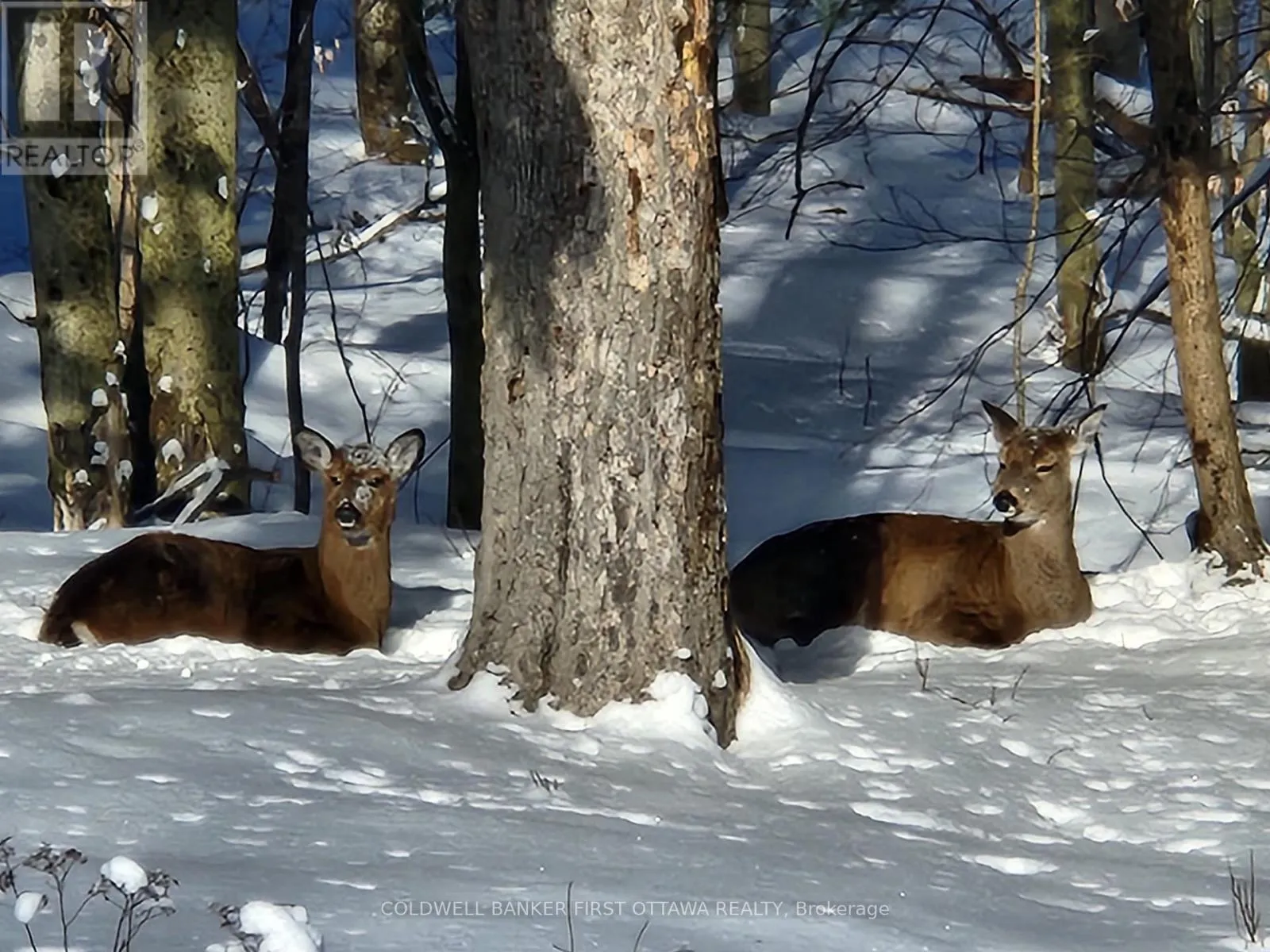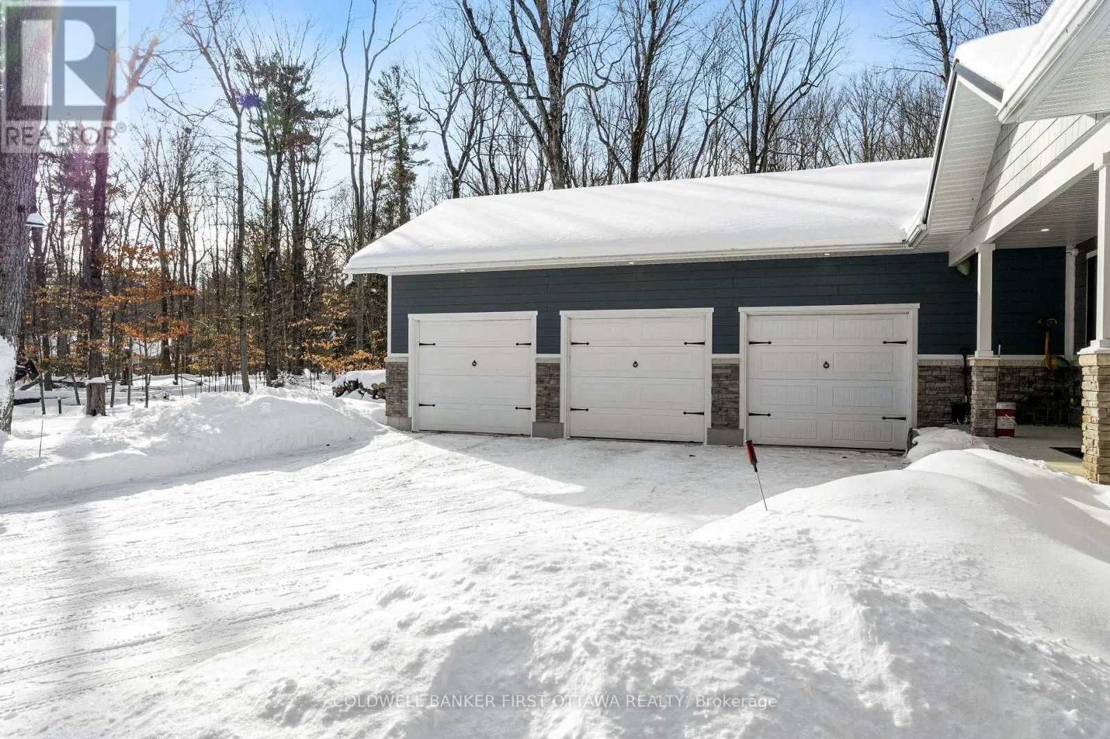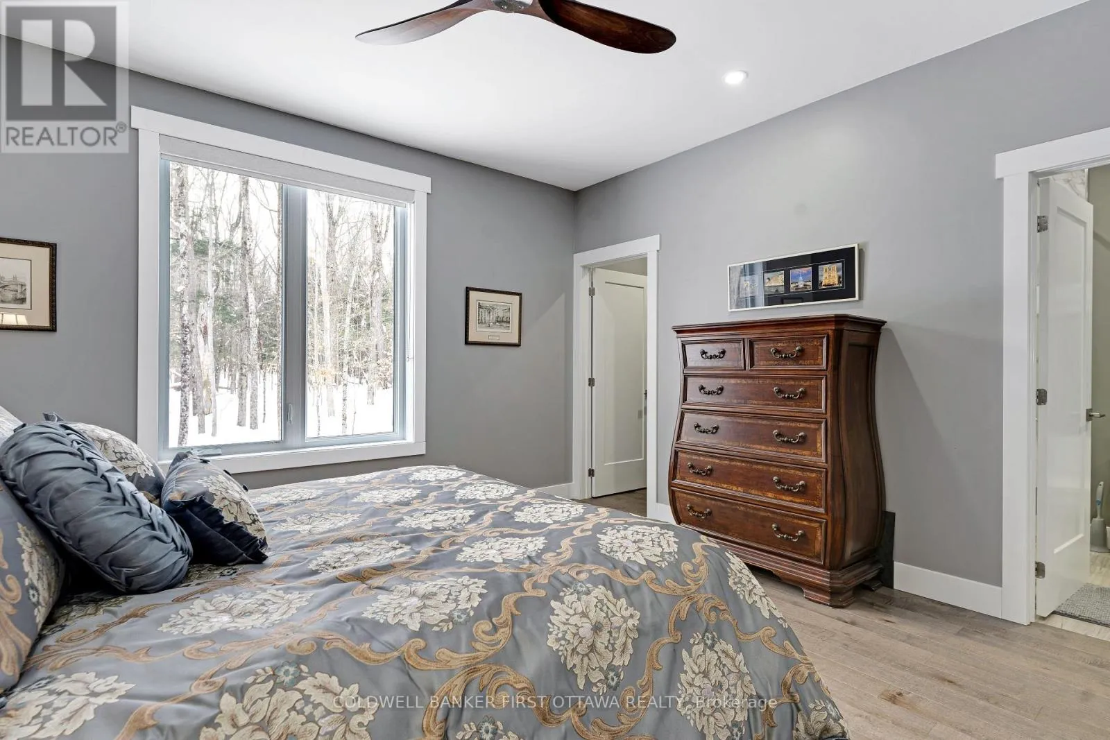 Cross Streets: Elm Grove Road. ** Directions: Hwy 7 to Perth. South thru the Town of Perth. Continue south on Rideau Ferry Rd (County Rd 1). Right on Elm Grove Rd. Right on Lumberjack Trail. Left on Maplebush Trail to #155. Home of the finest quality, in prestigious Otty Woods neighourhood. Tucked into 2 acres at end of non-thru road, exquisite 2020 bungalow offers you a life of tranquility wrapped in nature. You also have deeded access to Otty Lake waterfront and miles of walking trails. The home's gracious front porch welcomes you to sunny foyer with double closet. Wide open floor plan flows with light and hardwood floors. High 10' ceilings and recessed pot lights create bright spaces thru the 2+2 bedroom, 3 full bathroom home. Elegant living room invites you to relax by the propane fireplace while overlooking the lovely outdoors, with deer meandering by. Designed for entertaining, living room includes Butler's pantry with high-end Vicostone quartz countertops, built-in cabinets and wine fridge. Dining room attractive cove ceiling and oversized window onto nature. Ultimate gourmet kitchen offers premium Luxor cabinets, ceramic herringbone backsplash, quartz island-breakfast bar and walk-in pantry. Den, or ideal home office. You'll love the palatial laundry room with large bright windows and quartz cabinets perfect for folding & organizing. Primary suite retreat has walk-in closet and walk-out to deck and landscaped yard; spa ensuite two-sink quartz vanity, touch-light mirrors and rain head glass shower. Second bedroom walk-in closet and its own access to 4-piece bathroom. Lower level family room gas fireplace, wiring for speakers and impressive cove ceiling with mood lighting around its perimeter. Big gym also wired for speakers. Two more bedrooms and 4-pc bathroom. Back yard's Trex deck has two propane BBQ hookups, exterior lighting & wiring for speakers. Superiorly efficient Mitsubishi heat pump air handler for heat & cooling. Attic R70; walls R37. Auto 22kw Generac. Underground hydro line from road. Beyond your backyard, deeded access to 44 acres of trails plus waterfront with dock; swimming and fishing. Located on paved township road; garbage pickup & school bus. 10 mins Perth. (id:27476)
