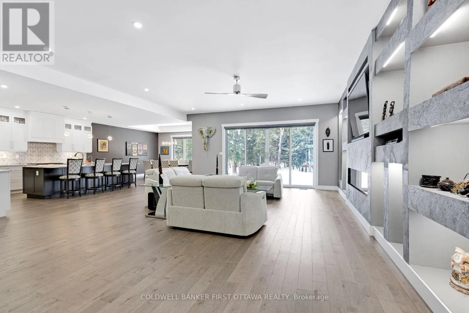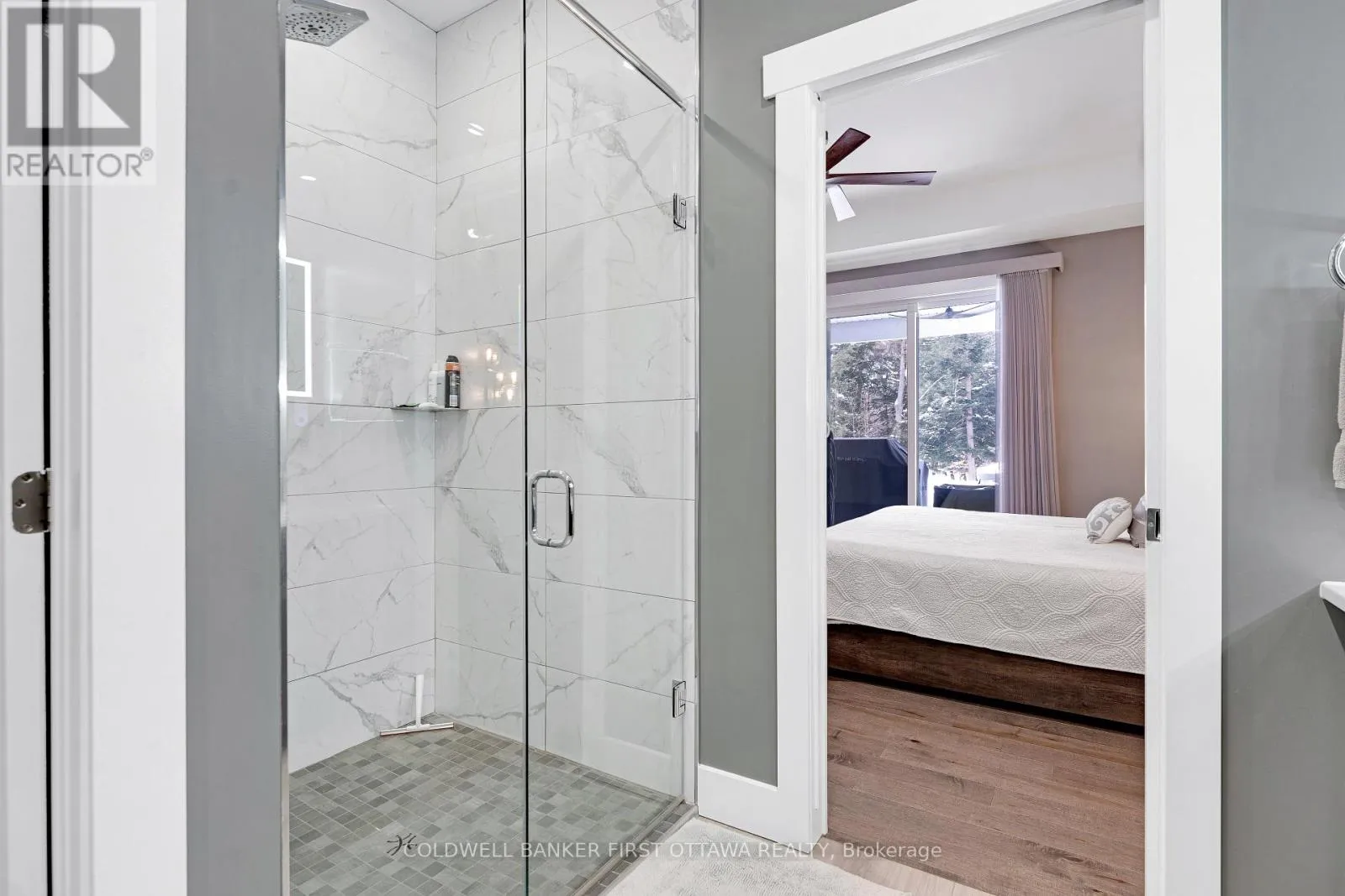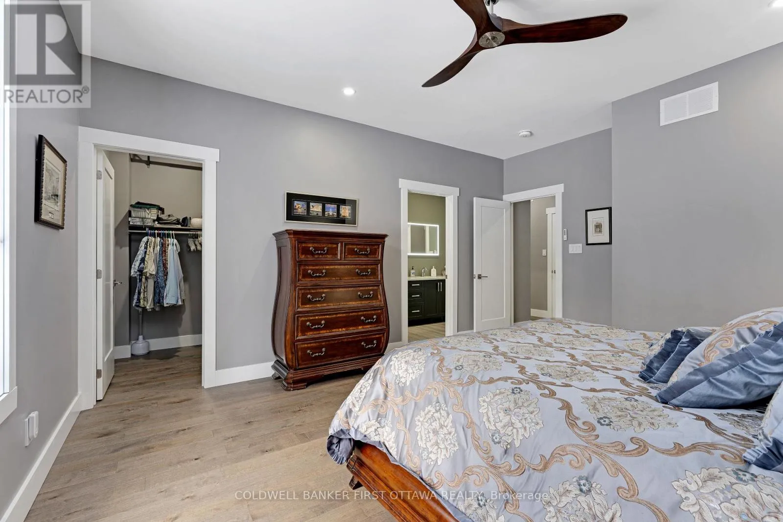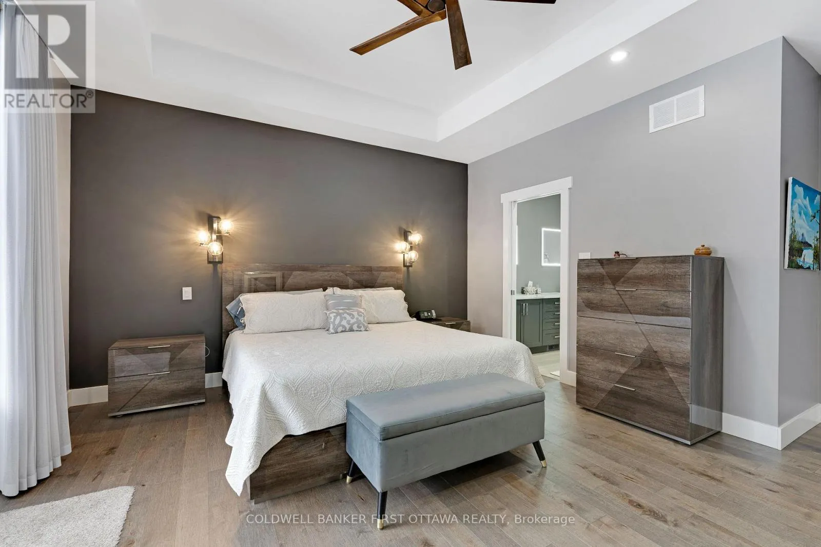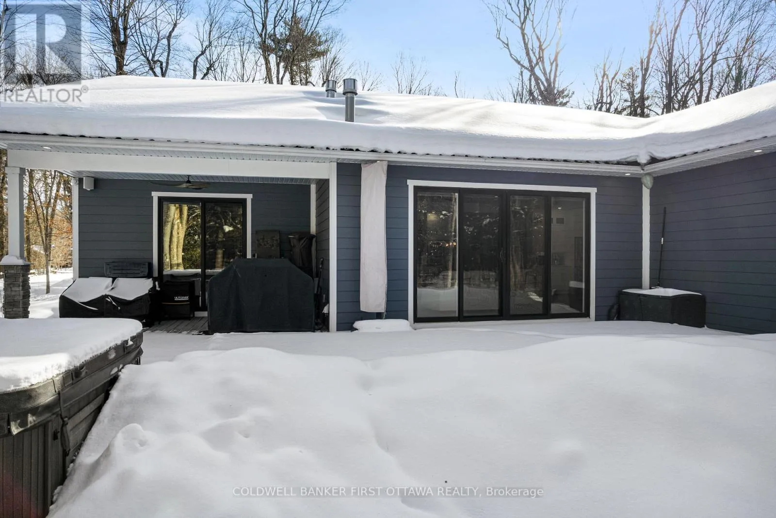 Cross Streets: Elm Grove Road. ** Directions: Hwy 7 to Perth. South thru the Town of Perth. Continue south on Rideau Ferry Rd (County Rd 1). Right on Elm Grove Rd. Right on Lumberjack Trail. Left on Maplebush Trail to #155. Home of the finest quality, in prestigious Otty Woods neighourhood. Tucked into 2 acres at end of non-thru road, exquisite 2020 bungalow offers you a life of tranquility wrapped in nature. You also have deeded access to Otty Lake waterfront and miles of walking trails. The home's gracious front porch welcomes you to sunny foyer with double closet. Wide open floor plan flows with light and hardwood floors. High 10' ceilings and recessed pot lights create bright spaces thru the 2+2 bedroom, 3 full bathroom home. Elegant living room invites you to relax by the propane fireplace while overlooking the lovely outdoors, with deer meandering by. Designed for entertaining, living room includes Butler's pantry with high-end Vicostone quartz countertops, built-in cabinets and wine fridge. Dining room attractive cove ceiling and oversized window onto nature. Ultimate gourmet kitchen offers premium Luxor cabinets, ceramic herringbone backsplash, quartz island-breakfast bar and walk-in pantry. Den, or ideal home office. You'll love the palatial laundry room with large bright windows and quartz cabinets perfect for folding & organizing. Primary suite retreat has walk-in closet and walk-out to deck and landscaped yard; spa ensuite two-sink quartz vanity, touch-light mirrors and rain head glass shower. Second bedroom walk-in closet and its own access to 4-piece bathroom. Lower level family room gas fireplace, wiring for speakers and impressive cove ceiling with mood lighting around its perimeter. Big gym also wired for speakers. Two more bedrooms and 4-pc bathroom. Back yard's Trex deck has two propane BBQ hookups, exterior lighting & wiring for speakers. Superiorly efficient Mitsubishi heat pump air handler for heat & cooling. Attic R70; walls R37. Auto 22kw Generac. Underground hydro line from road. Beyond your backyard, deeded access to 44 acres of trails plus waterfront with dock; swimming and fishing. Located on paved township road; garbage pickup & school bus. 10 mins Perth. (id:27476)
