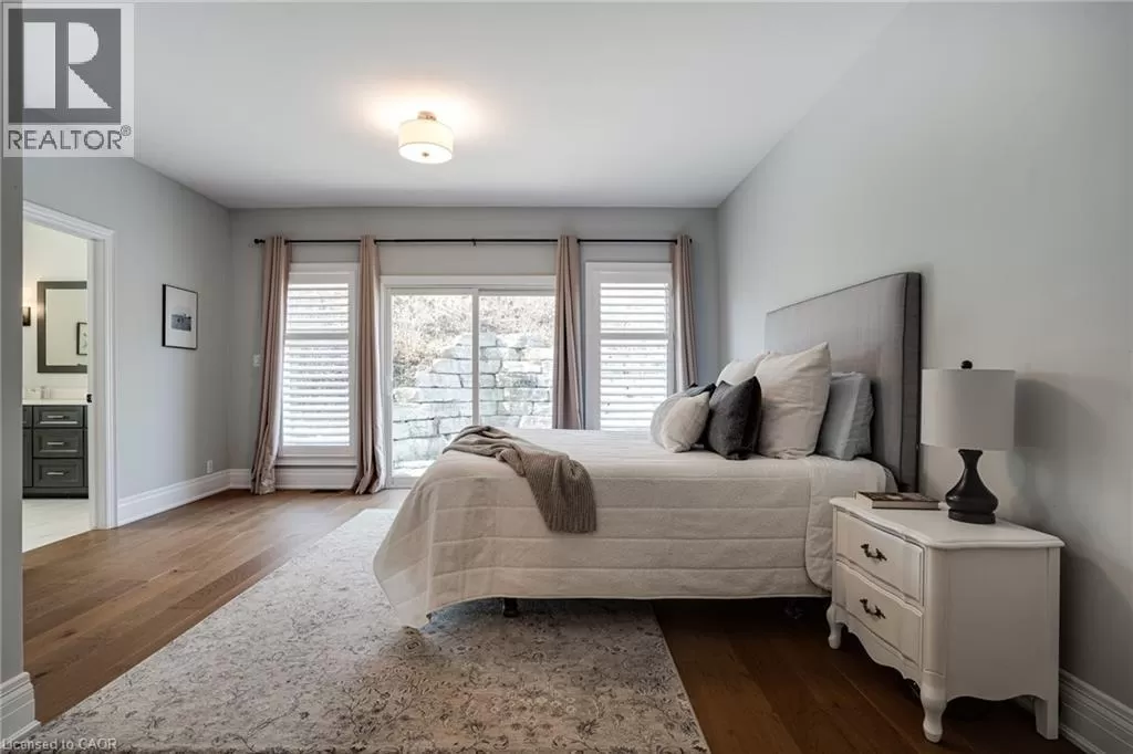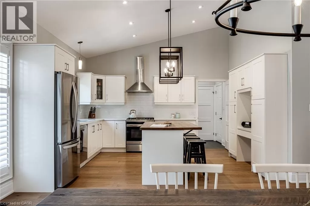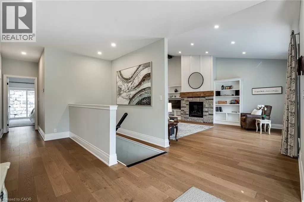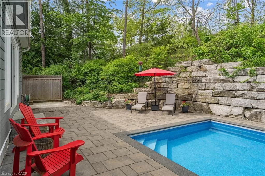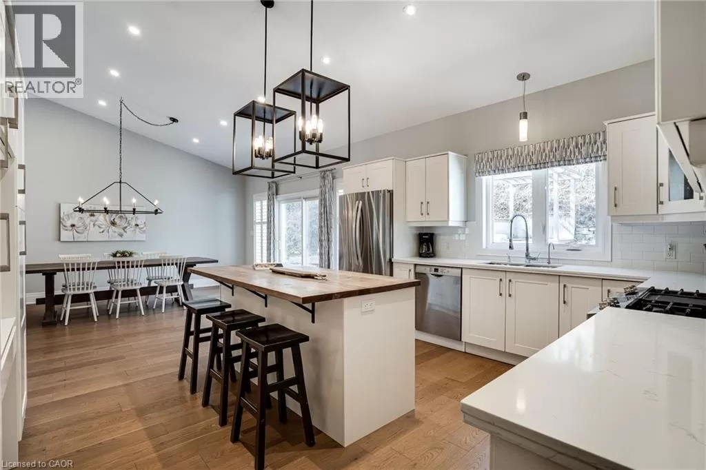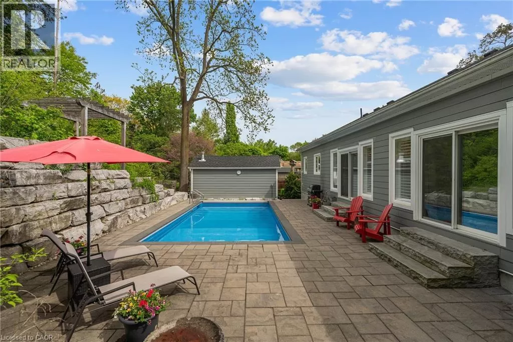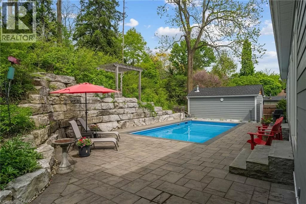 From Governors Rd turn onto Creighton Rd, turn left onto Ann St, left onto Sullivan's Lane This remarkable custom-built bungalow is designed to impress, showcasing almost 3,400 square feet of finished living space with style and ease. Perfectly situated in the heart of Dundas, this home combines privacy with convenienceâjust steps from scenic trails, top-rated schools, the arena, community centre, and charming downtown shops and dining. Inside, soaring vaulted ceilings, engineered hardwood floors and sun-filled open spaces create a welcoming atmosphere. The living room centers around a stunning gas fireplace with brick surround and rustic wood mantle, while the dining area flows seamlessly to the backyardâperfect for entertaining. The gourmet kitchen is a chefâs dream, complete with stainless steel appliances, a gas range, quartz countertops, abundant cabinetry, and a striking island with butcher block breakfast bar. The luxurious primary bedroom suite is your private retreat, featuring a spa-inspired ensuite, walk-in closet, and sliding glass doors leading directly to the backyard. Two additional bedrooms, a 4-piece bathroom, laundry, and inside access to the oversized 2-car garage complete the main level. The fully finished lower level expands your living options with a spacious L-shaped recreation room, a guest bedroom, 3-piece bath, and generous storage. Complete the wow factor when you step outside to your own backyard paradise: a two-tiered retreat with an inground pool, a large workshop/shed, and a wooded backdrop that offers both beauty and privacy. This is more than a houseâitâs a lifestyle. Donât miss the opportunity to call this breathtaking property your forever home! (id:27476)