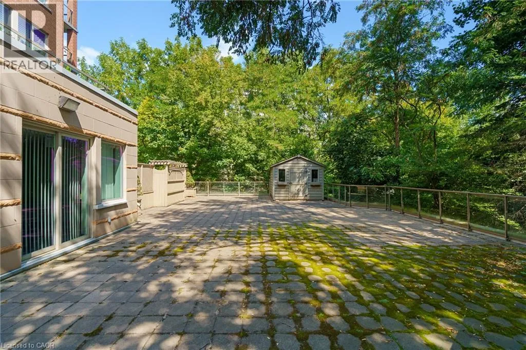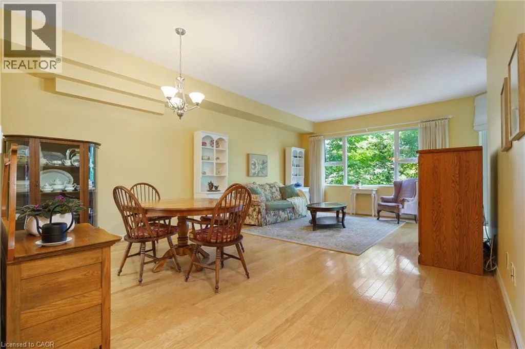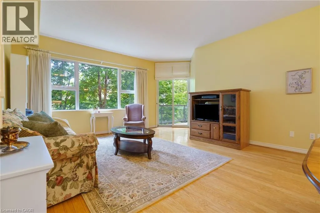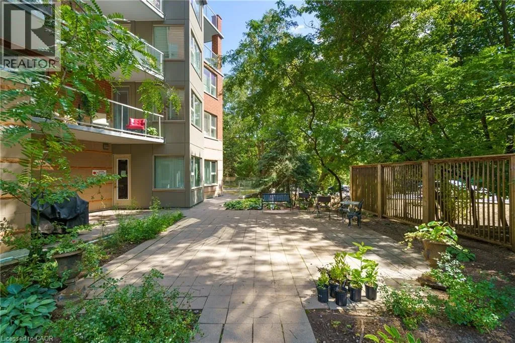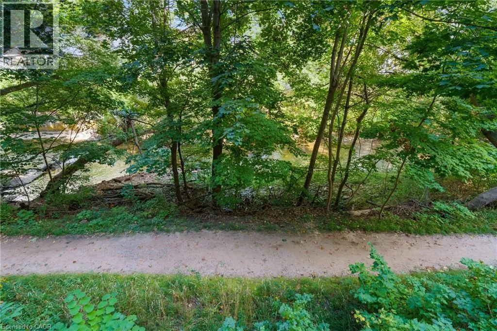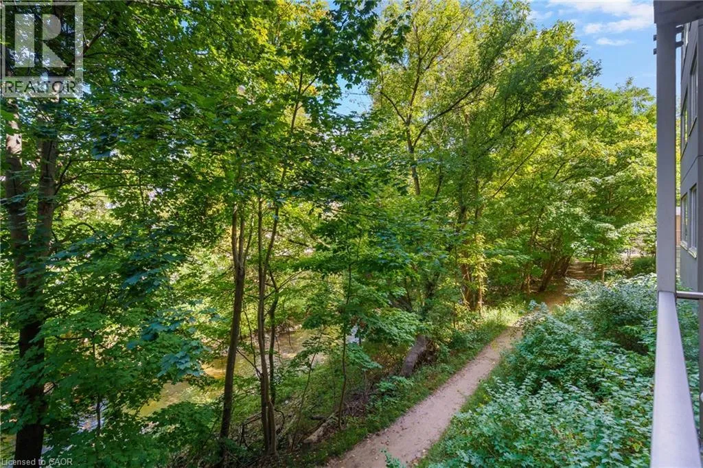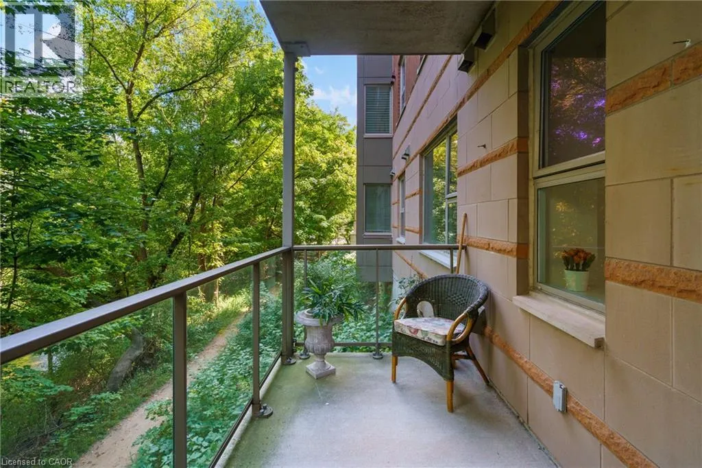 The corner of Governors Rd and Ogilvie Street Discover this magnificent condo apartment perfectly situated along the rushing Spencer Creek, where serene natural surroundings meet the convenience of downtown Dundas just steps away. Located on the coveted main floor, this residence combines ease of access with the elevated privacy of a balcony that overlooks lush, tree-lined greenspaceâoffering the feeling of a retreat while still close to shops, dining, and an abundance of amenities. Inside, the home features lofty 9â ceilings, rich hardwood flooring, and a warm palette. The inviting open-concept living and dining area seamlessly connects to the private balcony, while pocket doors lead to a bright eat-in kitchen equipped with crisp white appliances. The spacious primary bedroom includes a 4-piece ensuite with a soaker tub and separate walk-in shower. A second bedroom, additional 3-piece bathroom, and an ample-sized laundry/utility/storage room add both comfort and functionality. This landmark building is celebrated for its innovative architecture, offering a truly unique condo experience. Residents enjoy an array of amenities, including a well-appointed party room, fitness room, and a convenient guest suite for overnight visitors. Designed for carefree living, this condo offers tranquil views, elegant surroundings, and a worry-free lifestyle in one of Dundasâ most coveted communities. (id:27476)
