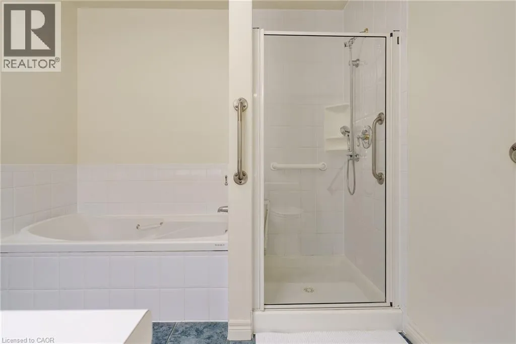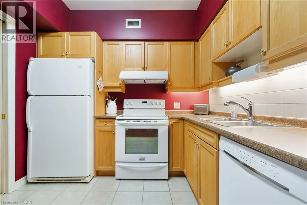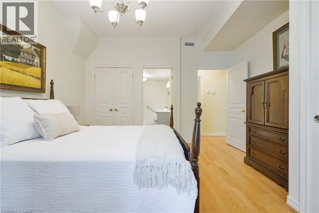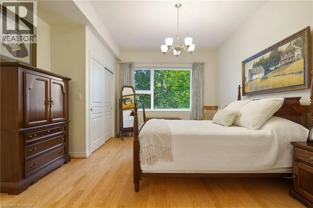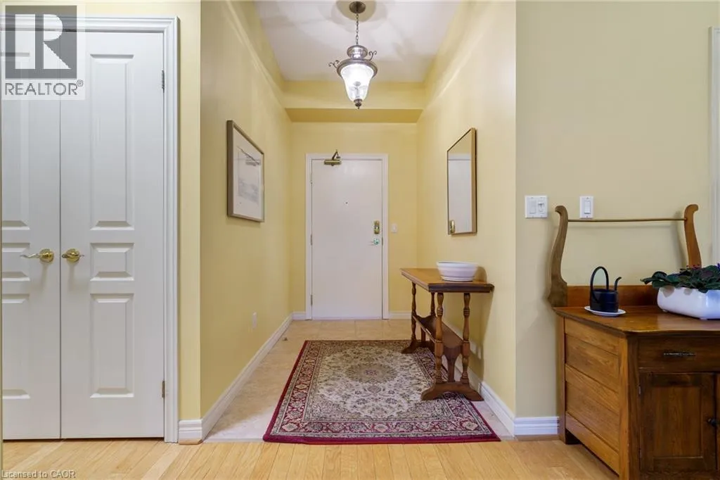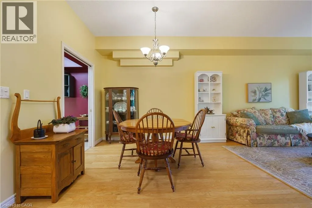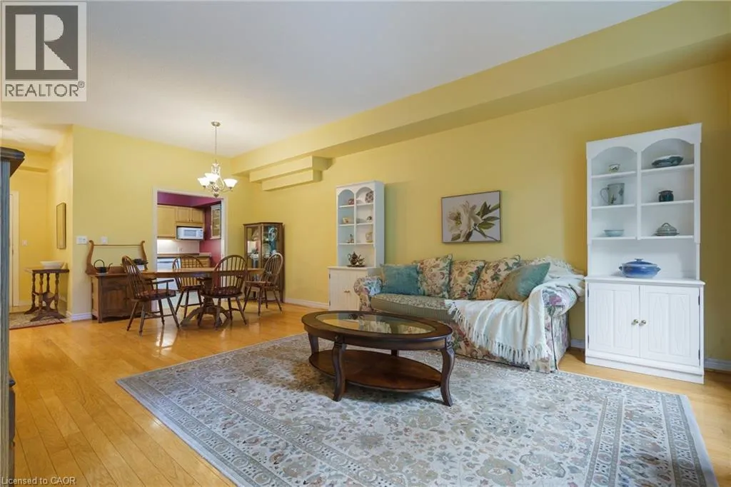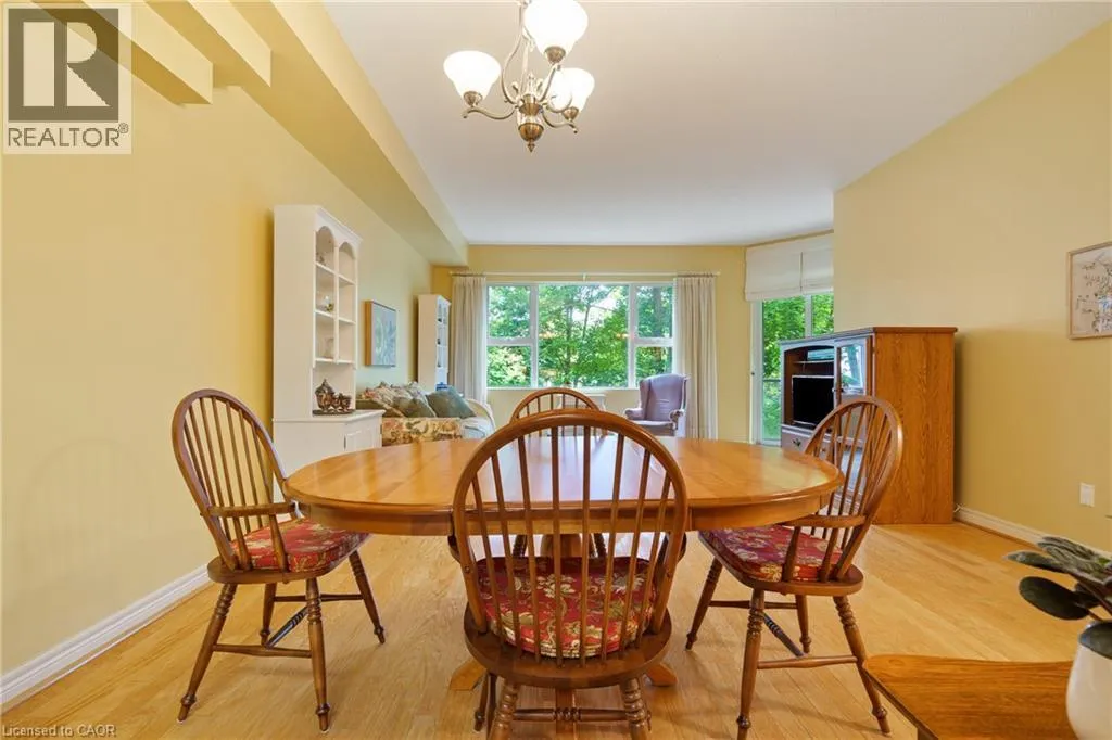 The corner of Governors Rd and Ogilvie Street Discover this magnificent condo apartment perfectly situated along the rushing Spencer Creek, where serene natural surroundings meet the convenience of downtown Dundas just steps away. Located on the coveted main floor, this residence combines ease of access with the elevated privacy of a balcony that overlooks lush, tree-lined greenspaceâoffering the feeling of a retreat while still close to shops, dining, and an abundance of amenities. Inside, the home features lofty 9â ceilings, rich hardwood flooring, and a warm palette. The inviting open-concept living and dining area seamlessly connects to the private balcony, while pocket doors lead to a bright eat-in kitchen equipped with crisp white appliances. The spacious primary bedroom includes a 4-piece ensuite with a soaker tub and separate walk-in shower. A second bedroom, additional 3-piece bathroom, and an ample-sized laundry/utility/storage room add both comfort and functionality. This landmark building is celebrated for its innovative architecture, offering a truly unique condo experience. Residents enjoy an array of amenities, including a well-appointed party room, fitness room, and a convenient guest suite for overnight visitors. Designed for carefree living, this condo offers tranquil views, elegant surroundings, and a worry-free lifestyle in one of Dundasâ most coveted communities. (id:27476)