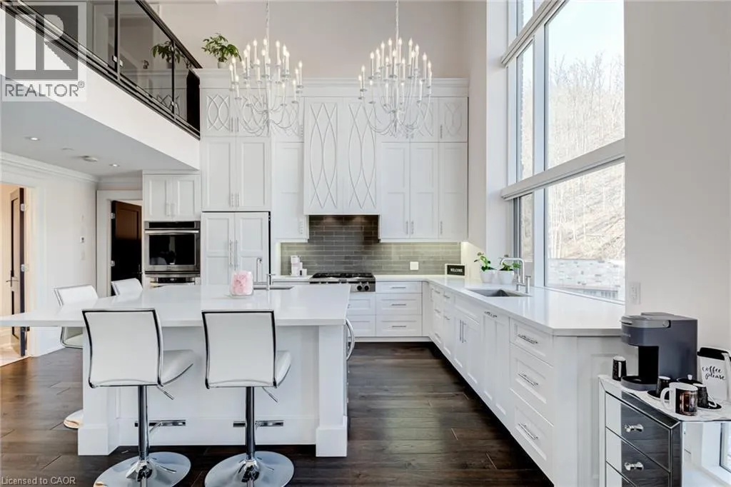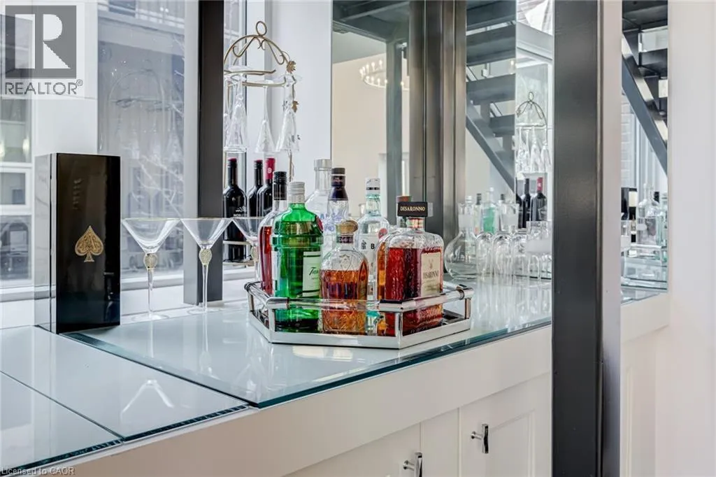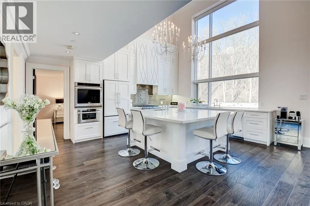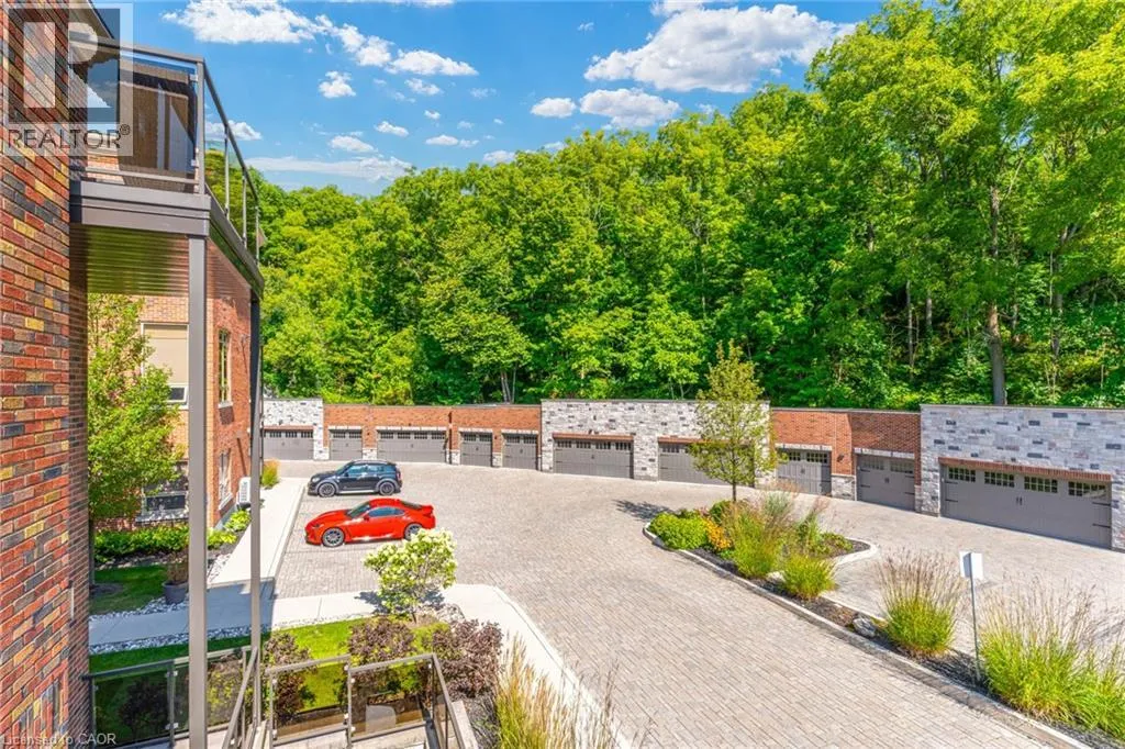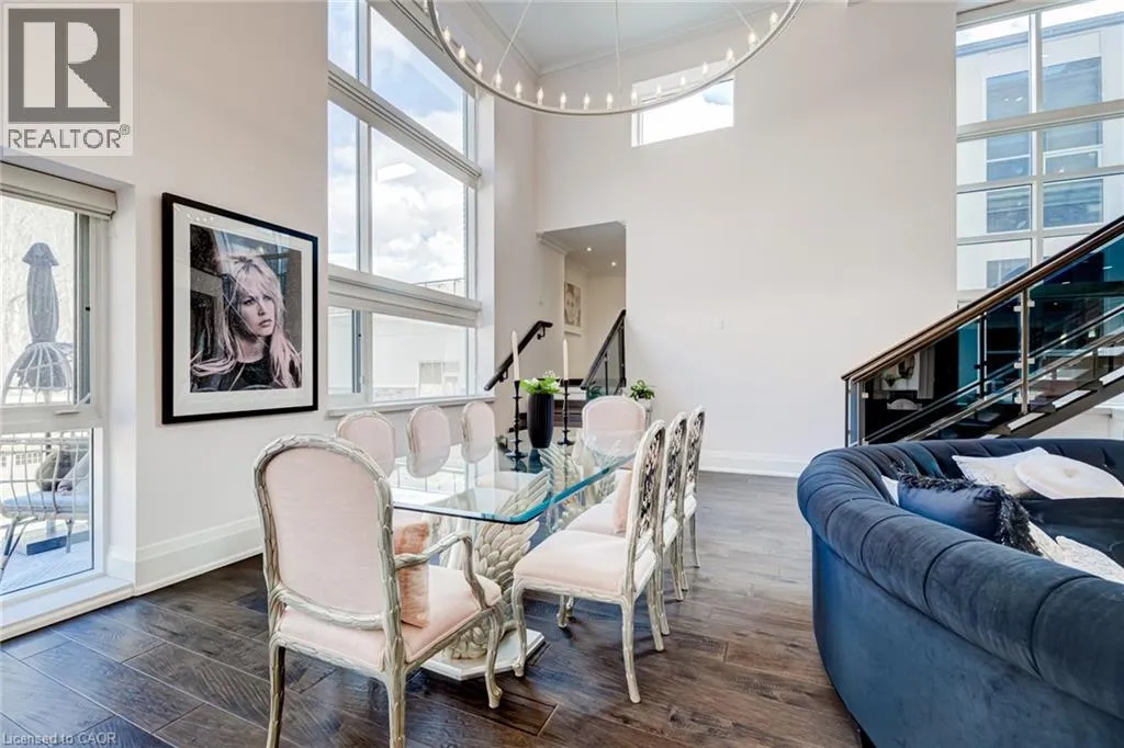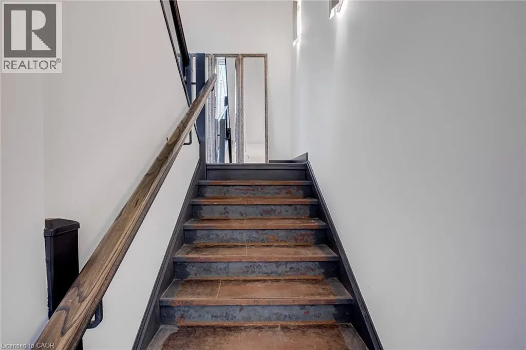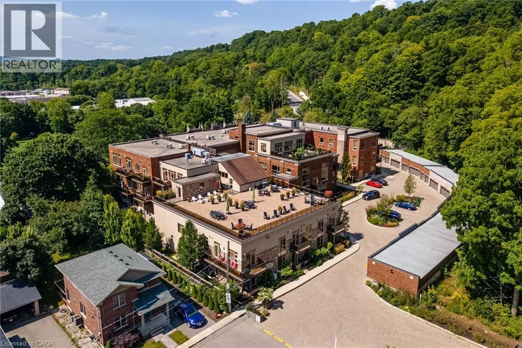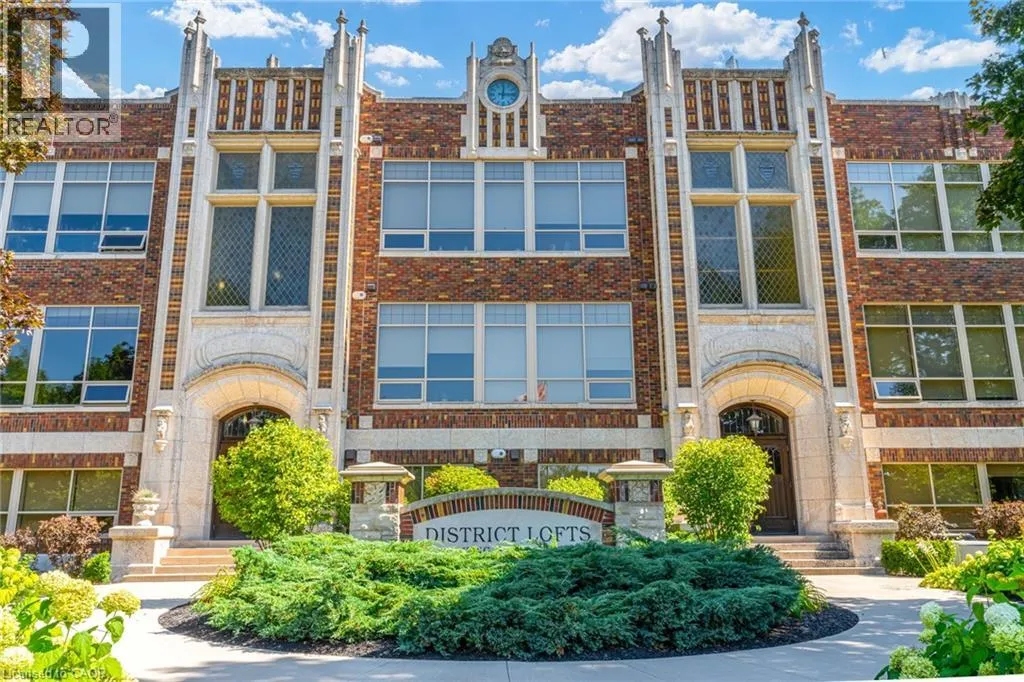 Highway 403 to Main Street West to Cootes Drive - Turns into King Street West. Visitors parking is available off Bond Street West. Stunning luxury at the District Lofts! Circa 1929 this boutique building was completely rebuilt in 2013 offering only 44 unique units. Unit 215 is one of the largest two units offering a rare opportunity for the discerning buyer. An over-sized double-car garage and a private entrance make it feel like living in a home without the exterior maintenance. Enjoy the grandeur of this loft style 2-storey condo. A spectacular open living space filled with natural light offers a 17-ft ceiling highlighted by a dramatic Restoration Hardware chandelier and breathtaking views of the Dundas Peak. The stunning gourmet kitchen has extended height cabinetry, high-end appliances, quartz counters and a large island with seating for six. This unit offers two spacious bedrooms and two spa-like bathrooms with upgraded fixtures. There are two private balconies, full-sized laundry, plenty of custom closet storage and fantastic upgrades: trim & millwork, Swarovski crystal handles and motorized blinds. The building offers state-of-the-art in-floor radiant heating and this unit has a brand-new a/c system. Amenities at the Lofts include a fitness studio, large locker exclusive to the unit, and a roof top patio for entertaining or relaxing (enjoy the views and tranquil sounds of the waterfall). Located at the foot of the Dundas Peak just steps to the Bruce Trail, Websterâs Falls, the Dundas Valley Golf and Curling Club and the historic Dundas downtown core with a vibrant mix of shops and restaurants. (id:27476)