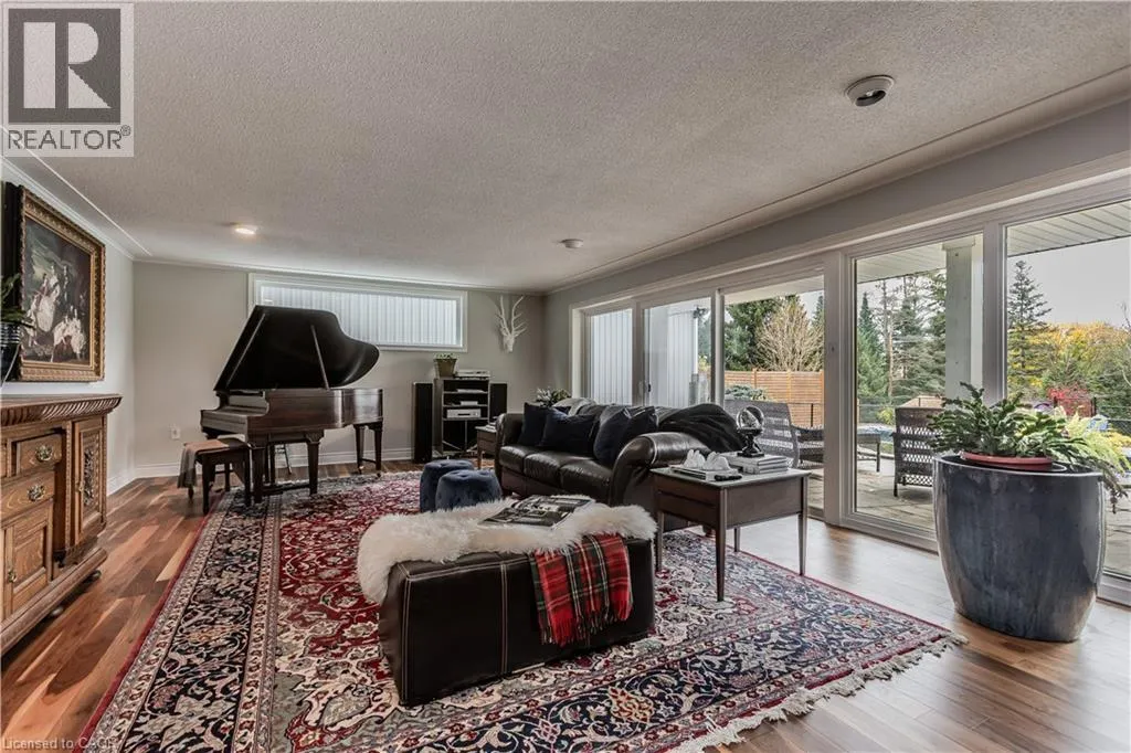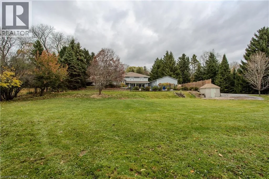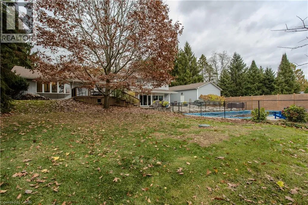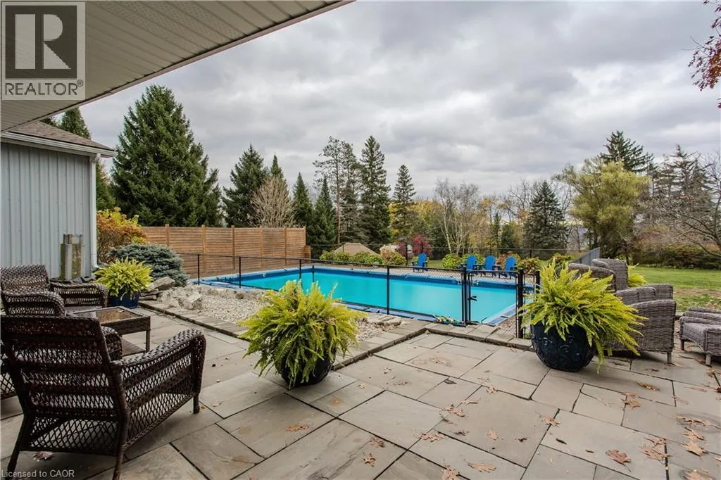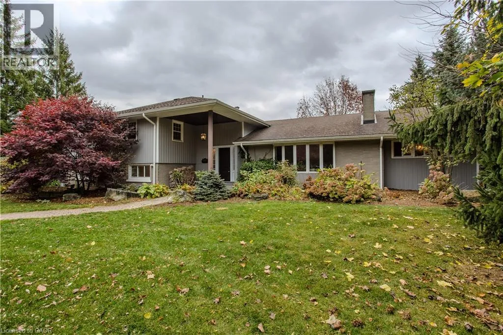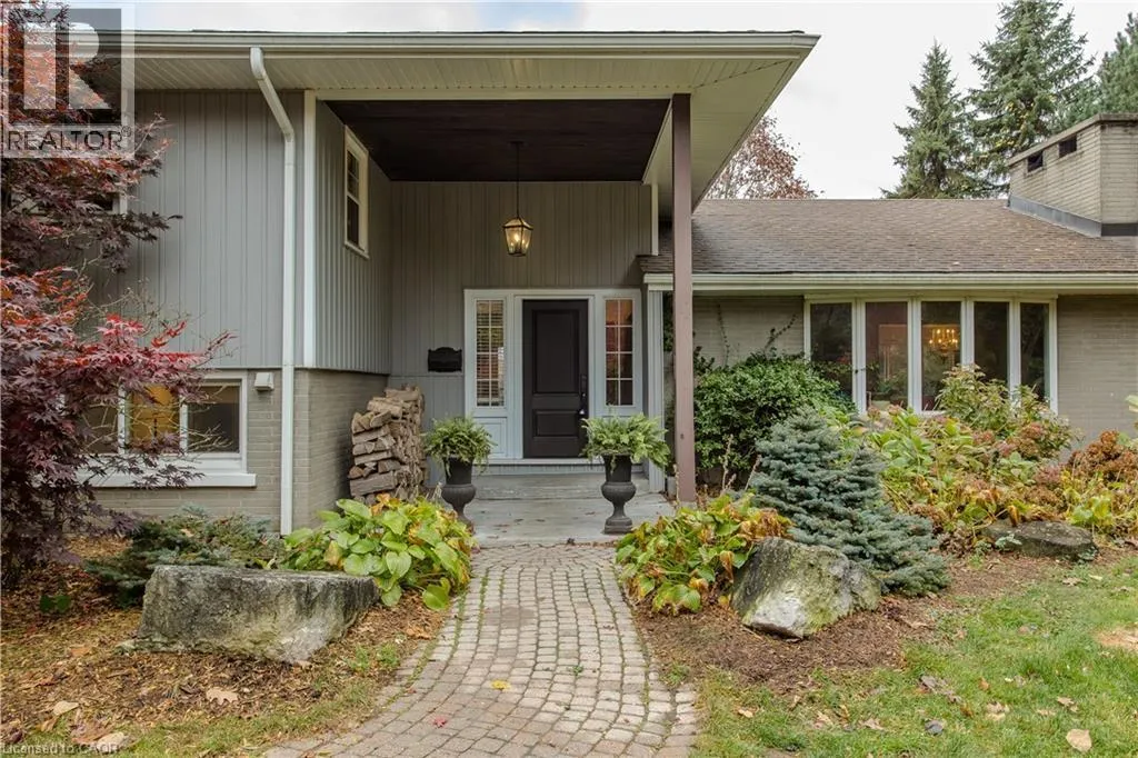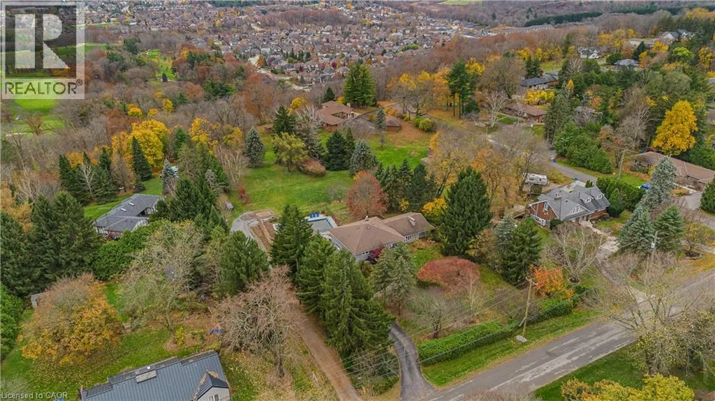 Highway 8 Welcome to this charming 4-level side split, originally crafted for the Grafton family in 1954. Situated on a serene 1.09-acre lot, this property boasts privacy and beauty with mature trees, a long driveway, and ample front yard space accommodating parking for 10+ vehicles, including a 20x40 garage with a lift. Perfectly located, itâs just 3 minutes from Dundas Valley Golf & Curling Club, 5 minutes to quaint downtown Dundas, and close to scenic trails, waterfalls, and major routes. Inside, find a bright, welcoming ambiance with hardwood throughout. The eat-in kitchen leads to a dining room with elegant coffered ceilings. The Great Room on the main level is a showstopper, featuring floor-to-ceiling windows, a wood burning fireplace, one of 5 fireplaces in the home, and an adjoining family room âideal for gatherings. Upstairs, enjoy a private primary sanctuary with views of the escarpment with a 4-piece ensuite, alongside an additional 3-piece bath with a glass shower. The lower level offers a partially finished walkup with a billiard room, which could be used as a fourth bedroom, patio access, storage, utility room, and a rough-in for a washroom. Outdoors, a private backyard oasis awaits, complete with a hot tub, a recently painted (2024) in-ground pool, and expansive views of the escarpment and golf course. New furnace installed in 2022. Don't miss this exceptional Greensville home! (id:27476)