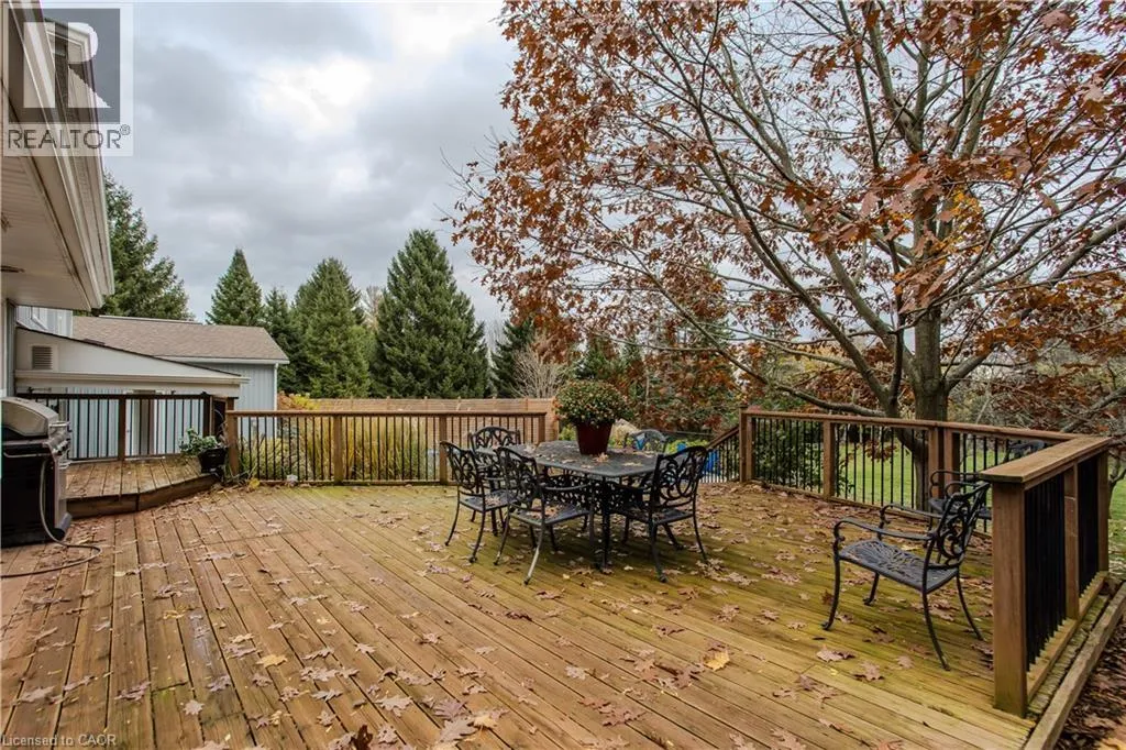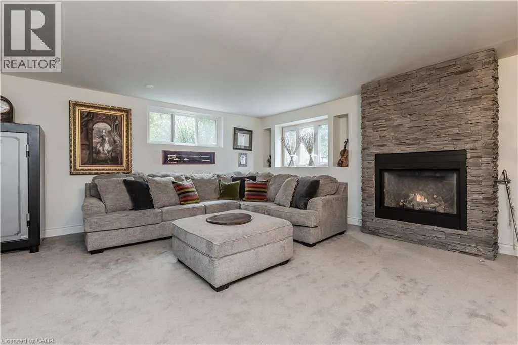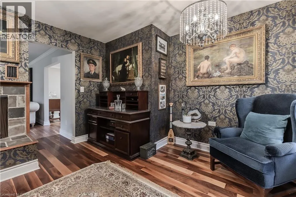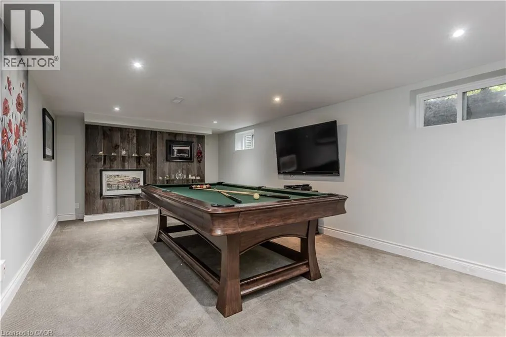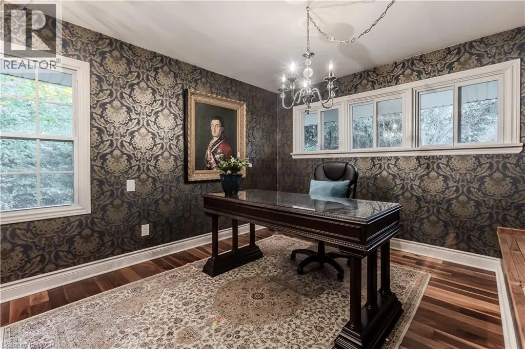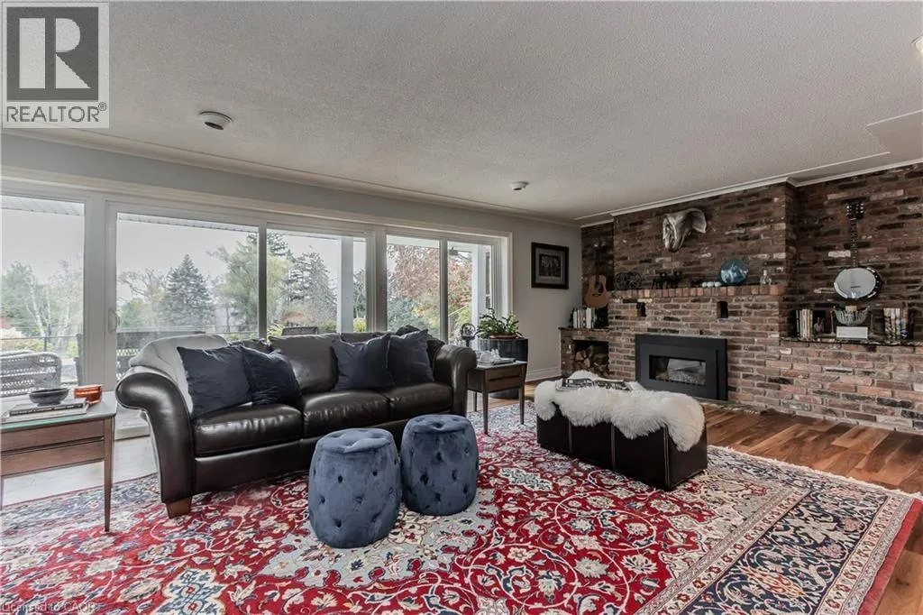 Highway 8 Welcome to this charming 4-level side split, originally crafted for the Grafton family in 1954. Situated on a serene 1.09-acre lot, this property boasts privacy and beauty with mature trees, a long driveway, and ample front yard space accommodating parking for 10+ vehicles, including a 20x40 garage with a lift. Perfectly located, itâs just 3 minutes from Dundas Valley Golf & Curling Club, 5 minutes to quaint downtown Dundas, and close to scenic trails, waterfalls, and major routes. Inside, find a bright, welcoming ambiance with hardwood throughout. The eat-in kitchen leads to a dining room with elegant coffered ceilings. The Great Room on the main level is a showstopper, featuring floor-to-ceiling windows, a wood burning fireplace, one of 5 fireplaces in the home, and an adjoining family room âideal for gatherings. Upstairs, enjoy a private primary sanctuary with views of the escarpment with a 4-piece ensuite, alongside an additional 3-piece bath with a glass shower. The lower level offers a partially finished walkup with a billiard room, which could be used as a fourth bedroom, patio access, storage, utility room, and a rough-in for a washroom. Outdoors, a private backyard oasis awaits, complete with a hot tub, a recently painted (2024) in-ground pool, and expansive views of the escarpment and golf course. New furnace installed in 2022. Don't miss this exceptional Greensville home! (id:27476)