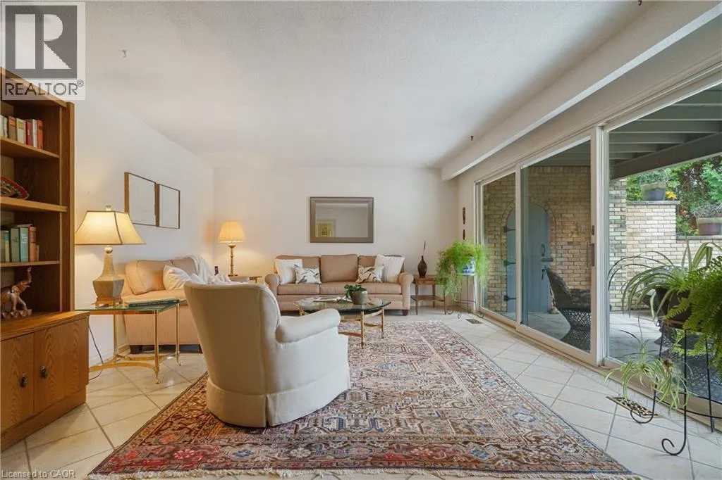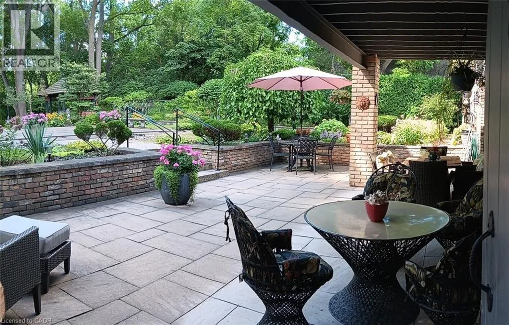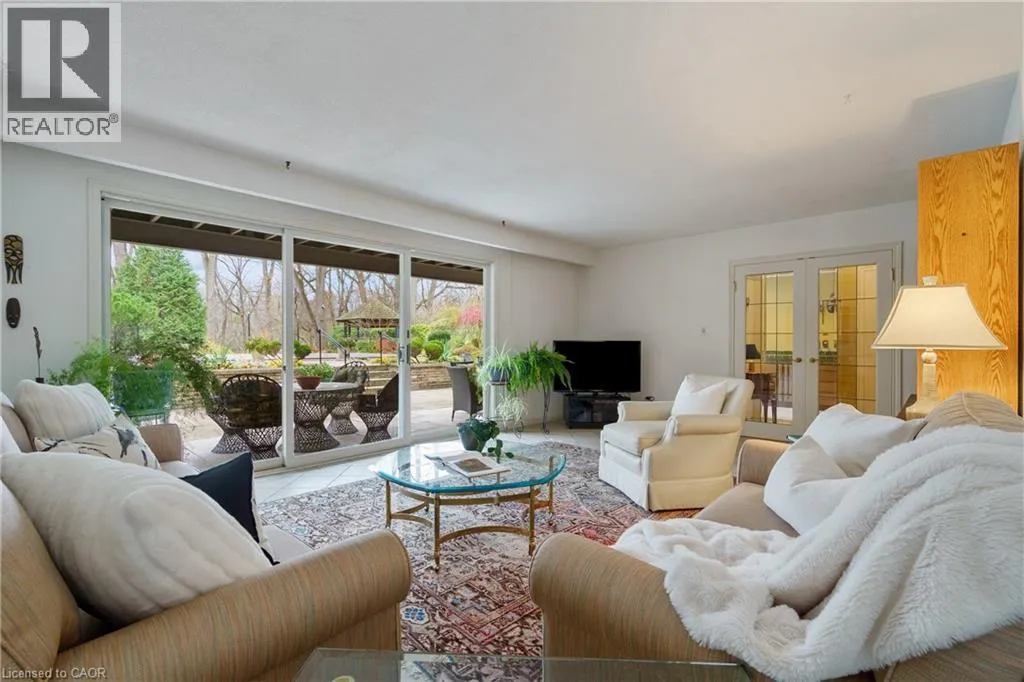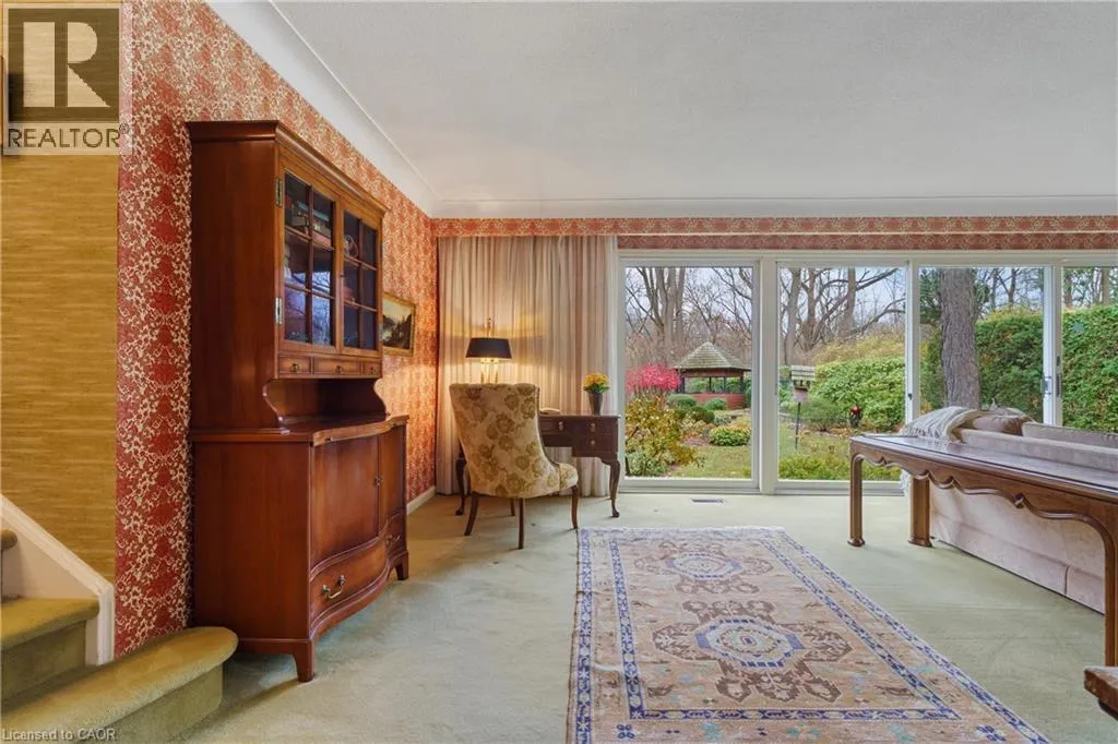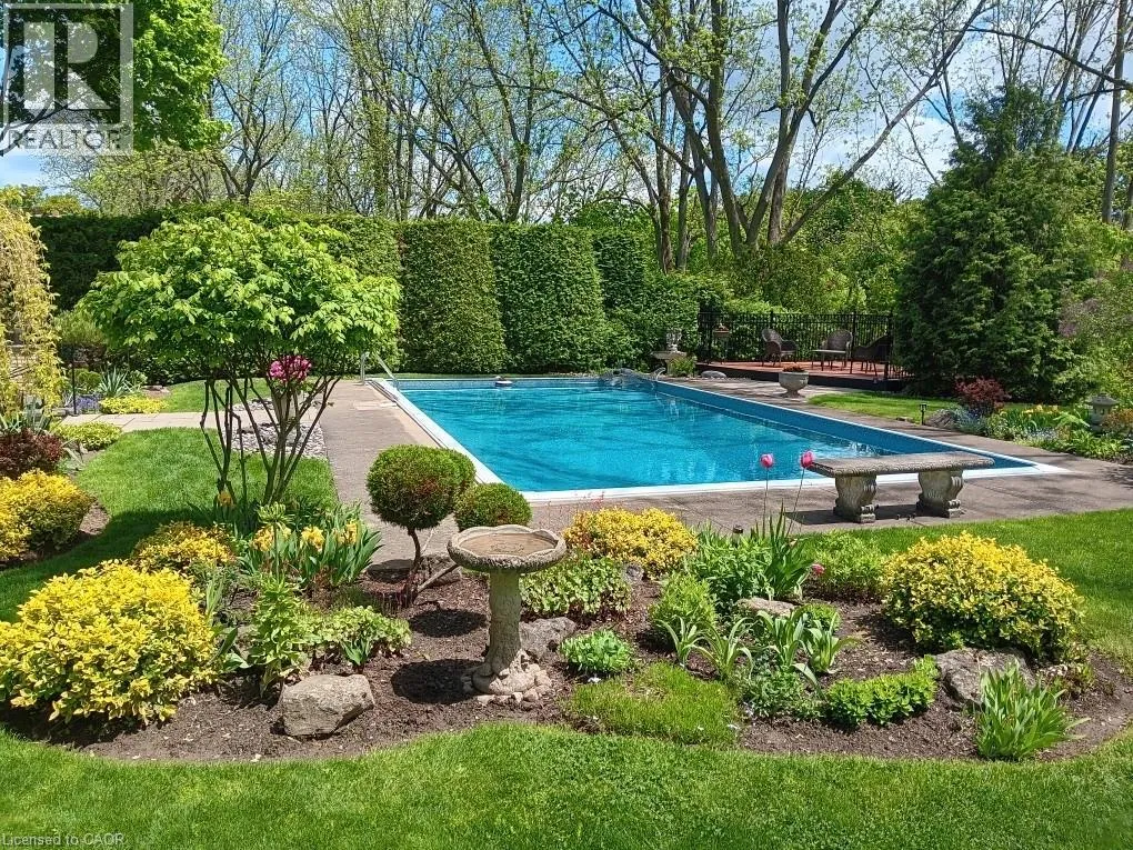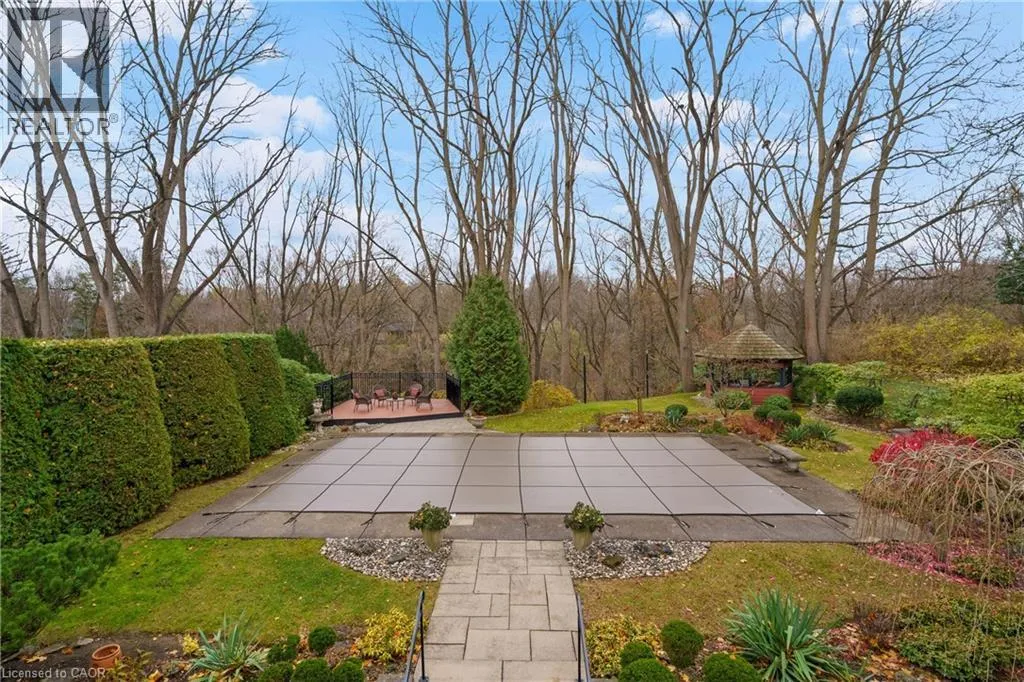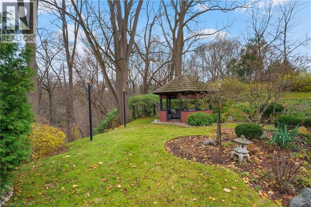 Governors Rd to Overfield St to Walnut Grove Nature Lovers Dream! This one-of-a-kind 4-level side split offers 4 bedrooms and 2.5 bathrooms on an extraordinary 200+ ft deep Dundas Valley ravine lot with unmatched privacy. In prestigious Highland Hills, the property boasts lush perennial gardens and breathtaking Spring Creek views from a custom lookout deck, along with an inground pool and gazebo that create a truly special backyard oasis! Step into the spacious foyer where the main floor features a bright family room with floor-to-ceiling windows, a walk-out to a covered patio overlooking the ravine, a convenient powder room, and a wet bar with rear yard access for exceptional indoor/outdoor living. The second floor offers wool carpeting throughout the sunlit living and dining rooms, where a stunning gas fireplace with a marble mantle adds warmth and elegance, and sliding doors lead directly to the backyard sanctuary. A pocket door opens to the inviting eat-in kitchen, a true delight for any home chef. This space features sleek black appliances including cooktop, built-in wall oven and microwave, with ample cabinetry, and a perfect setting for warm gatherings. The third floor showcases the primary bedroom with a 3 piece ensuite and sliding doors to a private balcony with unparalleled panoramic ravine views. Three additional bedrooms with hardwood floors and the main bathroom with a jetted tub complete this level. The finished basement includes a spacious rec room ideal for entertaining, a pool table area, a laundry room with a shower, a utility room with a workbenchâall with close to 9 ft ceilings!âand abundant crawl-space storage. Additional highlights include a 4-car driveway, 2-car garage with inside entry, and only one neighbouring property, with Conservation land beside the home for added privacy. A truly rare find, close to walking trails and minutes from downtown, act fast to own this piece of paradise in Dundas! (id:27476)
