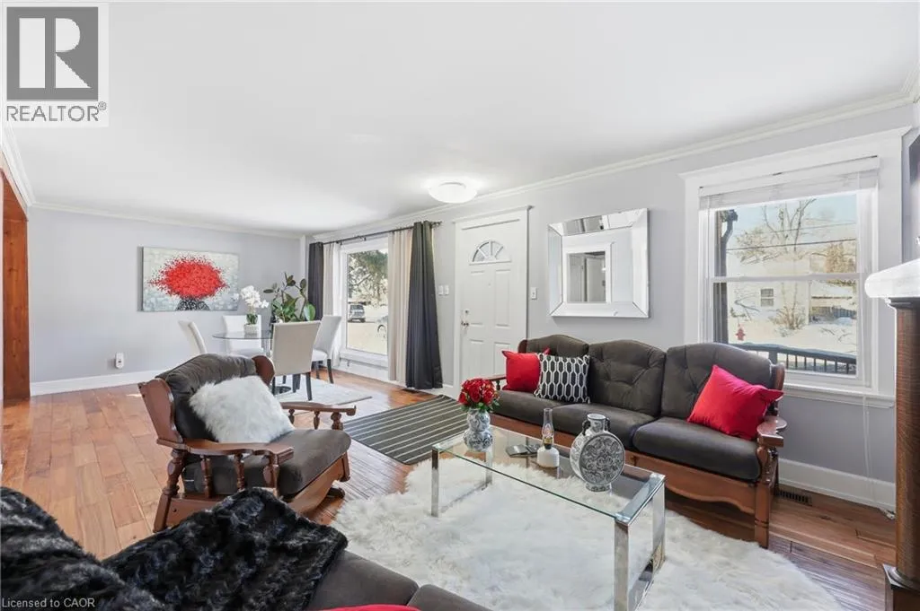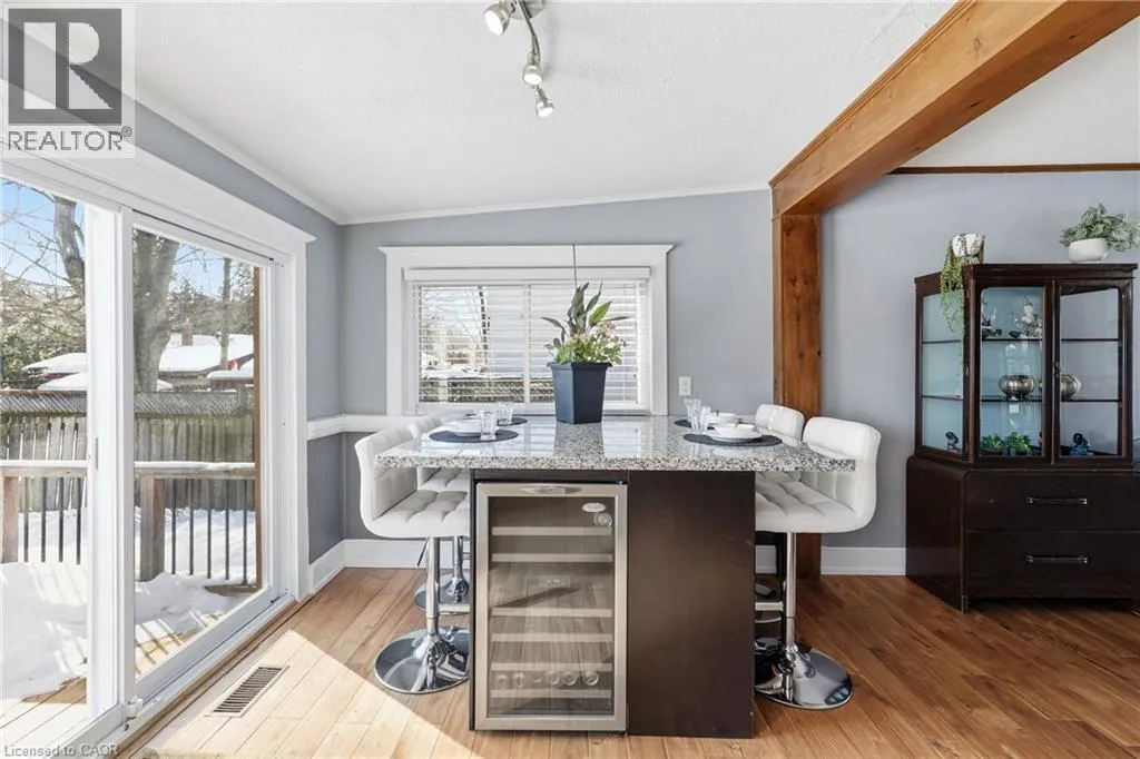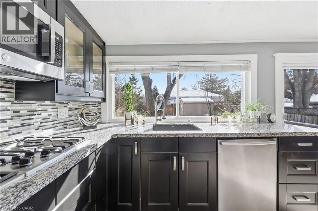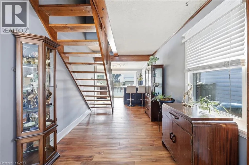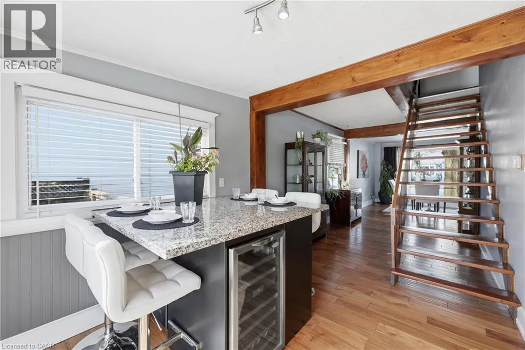 Cootes Dr. to East St. N. to Hunter St. Located on a premium lot in desirable Dundas, this charming home offers three levels of fully finished living space on a quiet street with exceptional walkability, just minutes from McMaster University and downtown Dundas. Ideal for families, downsizers, or investors seeking flexibility in a highly sought-after community. The enclosed foyer welcomes you into a bright open-concept living and dining area, highlighted by a large picture window that fills the space with natural light. The main floor features a comfortable bedroom and an updated 4-piece bath, providing the convenience of one-level living. At the heart of the home, the functional kitchen is designed for gathering, featuring granite countertops, upgraded appliances, and an oversized island with built-in wine fridge, all overlooking the private, fully fenced backyard. The refurbished deck (2025) extends the living space outdoorsâperfect for morning coffee, summer dinners, and entertaining. Hardwood flooring runs throughout the main and upper levels, adding warmth and continuity. Upstairs, youâll find three inviting bedrooms, including a primary suite with a private 2-piece ensuite. The fully finished basement with a separate entrance and new carpeting (2025) adds valuable additional living space, including a recreation room, office area, and a flexible fifth room ideal for guests or in-law potential. Recent updates include furnace (2024), basement waterproofing (2021), water heater (2026) and second level windows (2024). Classic wood siding enhances curb appeal, complemented by a long three-car driveway and a large newer shed (2021). Enjoy proximity to Dundas Driving Park with trails, playgrounds, and green space, as well as easy access to Westdale Village, downtown Hamilton, Highway 403, and Hamilton & Aldershot GO stations. A true turn-key property offering comfort, convenience, and long-term value in one of Dundasâ most desirable neighbourhoods. (id:27476)
