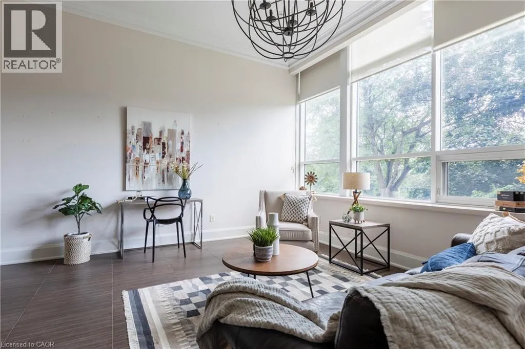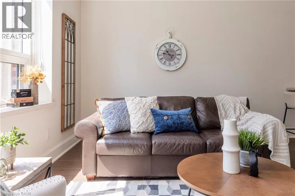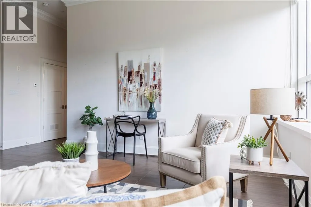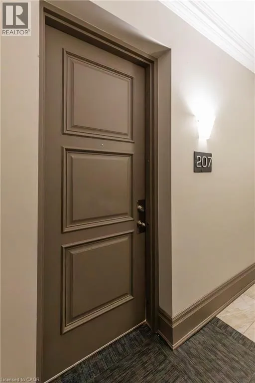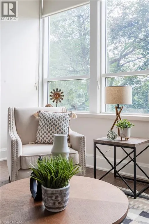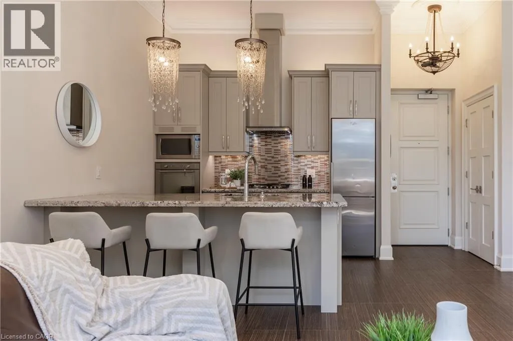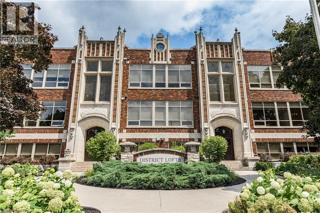 Head West on King St W, towards Bullock's Corners/Hwy 8. On the right hand side after Bond St. N and across from Fisher's Mill Park Situated on the West end of Dundas and nestled at the base of the Peak awaits the lifestyle, serenity, & sophistication you've been craving. Seamlessly blending the historical elements of the building with a contemporary & upscale aesthetic, the District Lofts offer a blend of character, charm, & modern convenience. Located in the original part of the building, Unit 207 boasts soaring 12â ceilings complete with gorgeous crown moulding & upgraded lighting. The south exposure offers exquisite views onto the front gardens & Fisherâs Mill Park, allowing an abundance of natural light through the expansive windows. The open-concept kitchen/living area is at the heart of the unit. The modern fixtures & neutral decor create the perfect canvas to blend your own personal style. With ample cabinetry, granite countertops, stainless steel appliances, contemporary backsplash, & ornate pendant light fixtures, this kitchen is a stunner! The generously sized bedroom with stunning chandelier, a comfortable 4PC bath with soaker tub, & in-suite laundry complete this space. Radiant in-floor heating & two wall-mounted ac units add to the consideration and comfort put into this unit. Also on this level youâll find the well appointed gym. The upper level offers the rooftop patio, accessible all year long. All this conveniently located just a short drive from West Hamilton & McMaster University. Embrace the ease of condo living in this spectacular one-of-a-kind property. Room sizes/sq ft approx. (id:27476)
