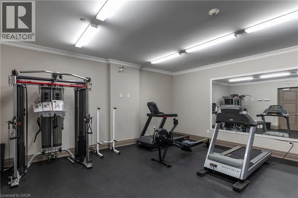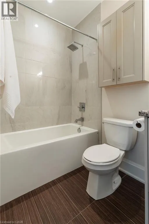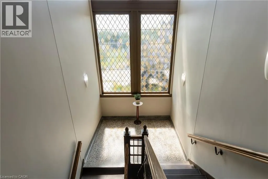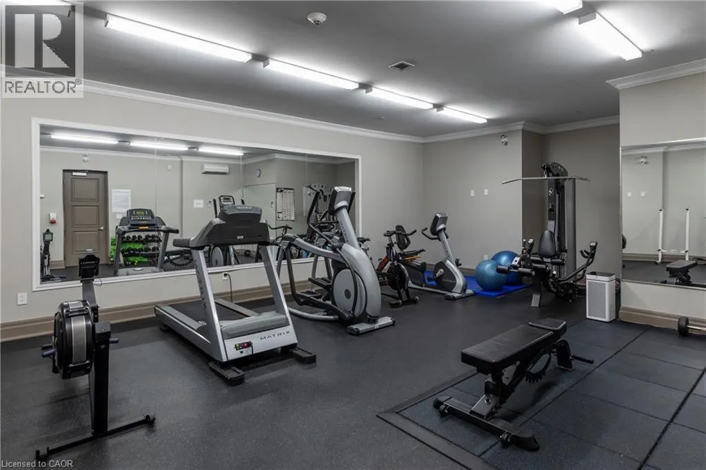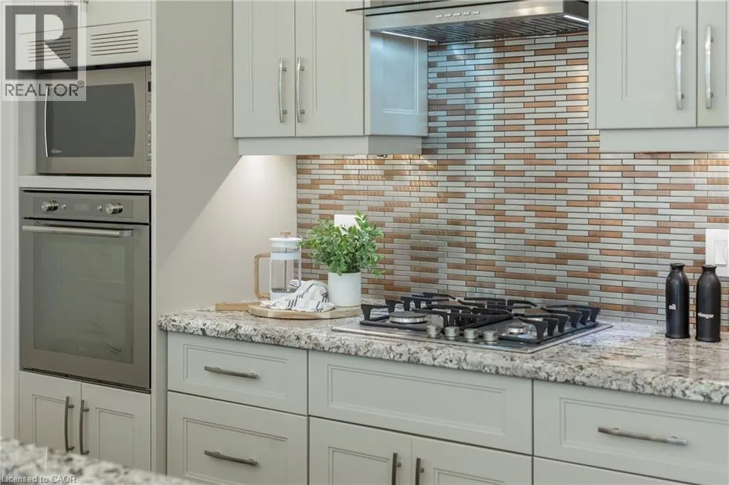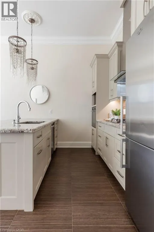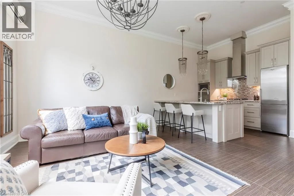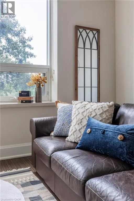 Head West on King St W, towards Bullock's Corners/Hwy 8. On the right hand side after Bond St. N and across from Fisher's Mill Park Situated on the West end of Dundas and nestled at the base of the Peak awaits the lifestyle, serenity, & sophistication you've been craving. Seamlessly blending the historical elements of the building with a contemporary & upscale aesthetic, the District Lofts offer a blend of character, charm, & modern convenience. Located in the original part of the building, Unit 207 boasts soaring 12â ceilings complete with gorgeous crown moulding & upgraded lighting. The south exposure offers exquisite views onto the front gardens & Fisherâs Mill Park, allowing an abundance of natural light through the expansive windows. The open-concept kitchen/living area is at the heart of the unit. The modern fixtures & neutral decor create the perfect canvas to blend your own personal style. With ample cabinetry, granite countertops, stainless steel appliances, contemporary backsplash, & ornate pendant light fixtures, this kitchen is a stunner! The generously sized bedroom with stunning chandelier, a comfortable 4PC bath with soaker tub, & in-suite laundry complete this space. Radiant in-floor heating & two wall-mounted ac units add to the consideration and comfort put into this unit. Also on this level youâll find the well appointed gym. The upper level offers the rooftop patio, accessible all year long. All this conveniently located just a short drive from West Hamilton & McMaster University. Embrace the ease of condo living in this spectacular one-of-a-kind property. Room sizes/sq ft approx. (id:27476)