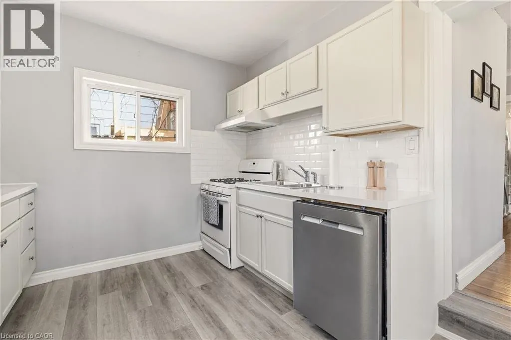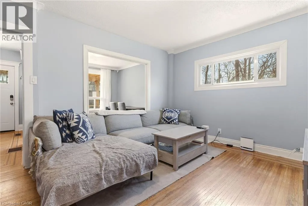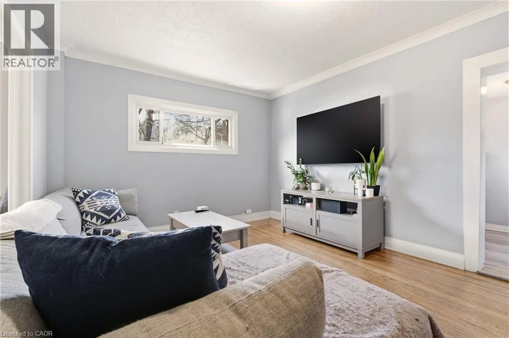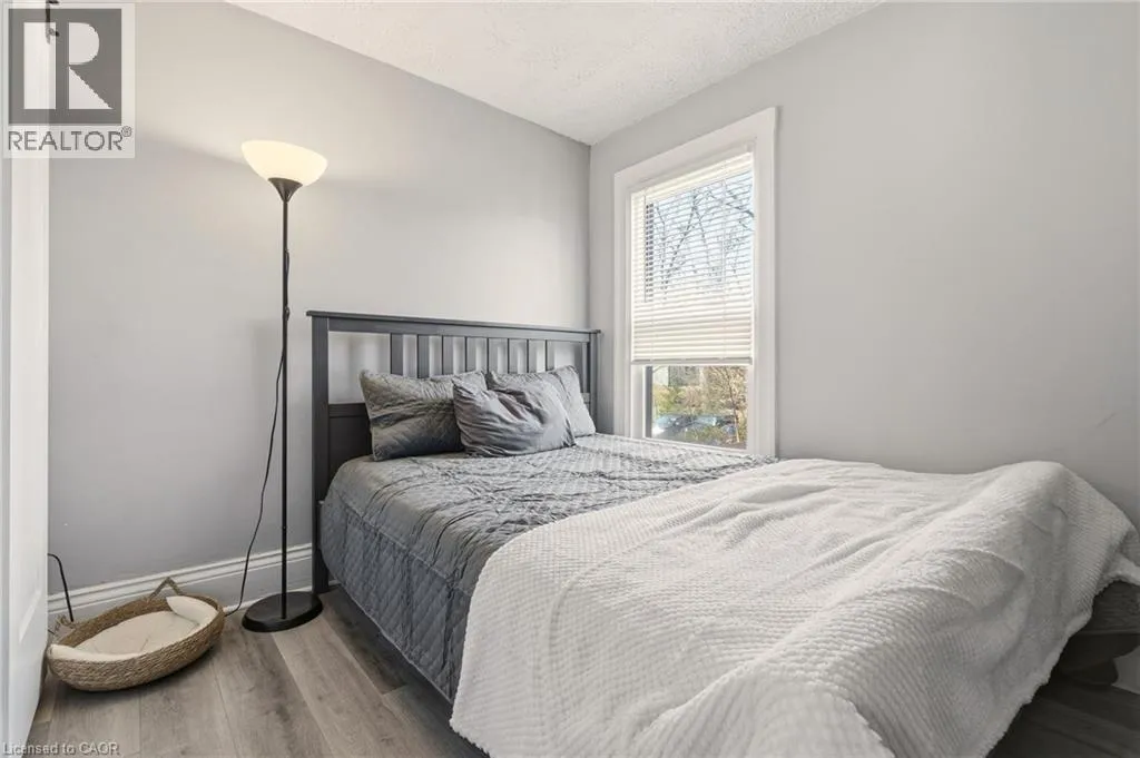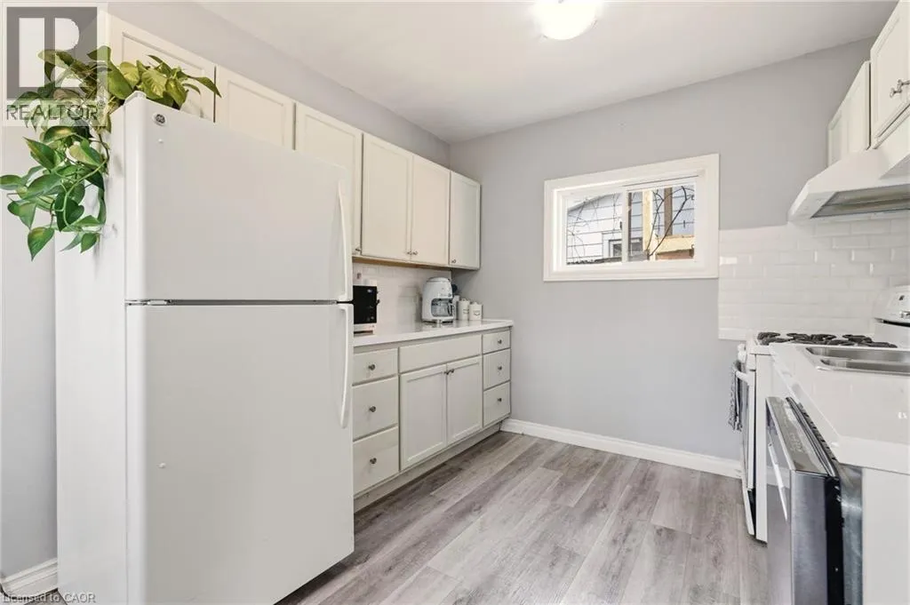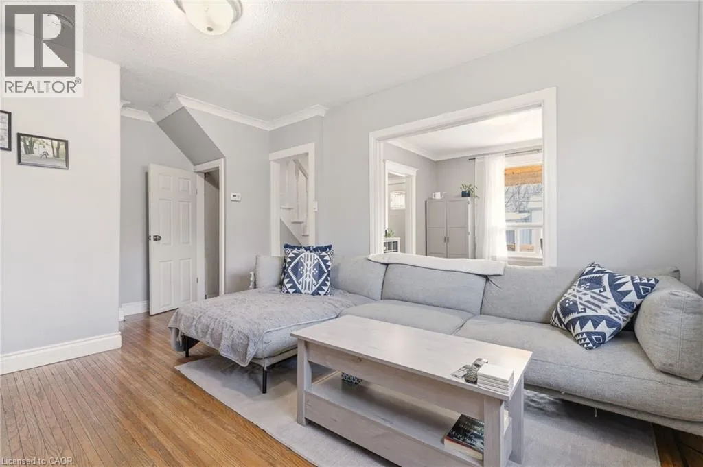 Main St to Dundas St Welcome to this charming fully detached two-story home, perfectly situated on a massive **60 x 106** lot in the vibrant heart of Dundas! As you enter, youâll be greeted by a warm foyer that leads to a formal dining room, featuring a large window, natural hardwood flooring, and crown moulding. The inviting living room, with beautiful hardwood floors and sunny windows, flows seamlessly into the updated large eat-in kitchen. The kitchen comes equipped with white wood cabinets, updated hardware, counter-tops and stylish laminate flooring, a suite of 4 appliances including a gas stove along with ample space for a dining area, along with convenient access to the backyard deck. Venture upstairs to discover the oversized master bedroom, complete with a spacious closet and an abundance of natural light from its large windows. The second bedroom also features a generous window over looking the private backyard and a single closet. The upper level is completed by an updated four-piece bathroom, showcasing a tub-shower combination with a stylish subway tile backsplash and a single vanity. The lower level includes laundry facilities and a blank canvas for your finishing touches, allowing for additional living space or personalized storage. Outside, enjoy the expansive lot featuring ample parking for 6 cars and two sheds, offering endless potential for gardening, play, or future expansion. This home truly presents a wonderful opportunity in a sought-after location, walk to downtown Dundas, Shops, Restaurants, Hiking Trails and easy access to major highways and McMaster University! Donât miss your chance to make it yours! (id:27476)