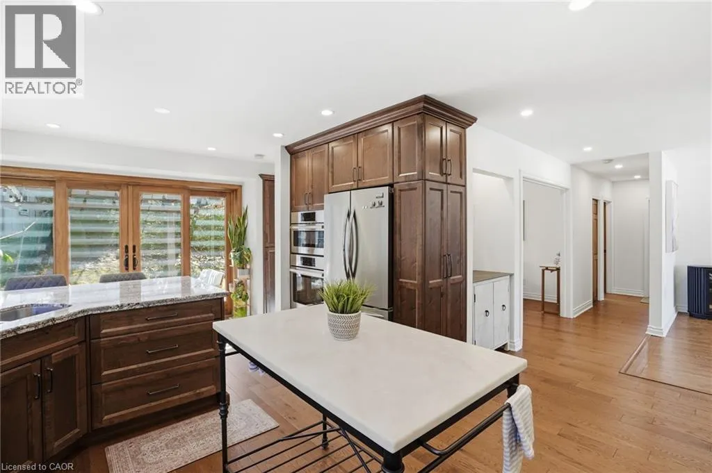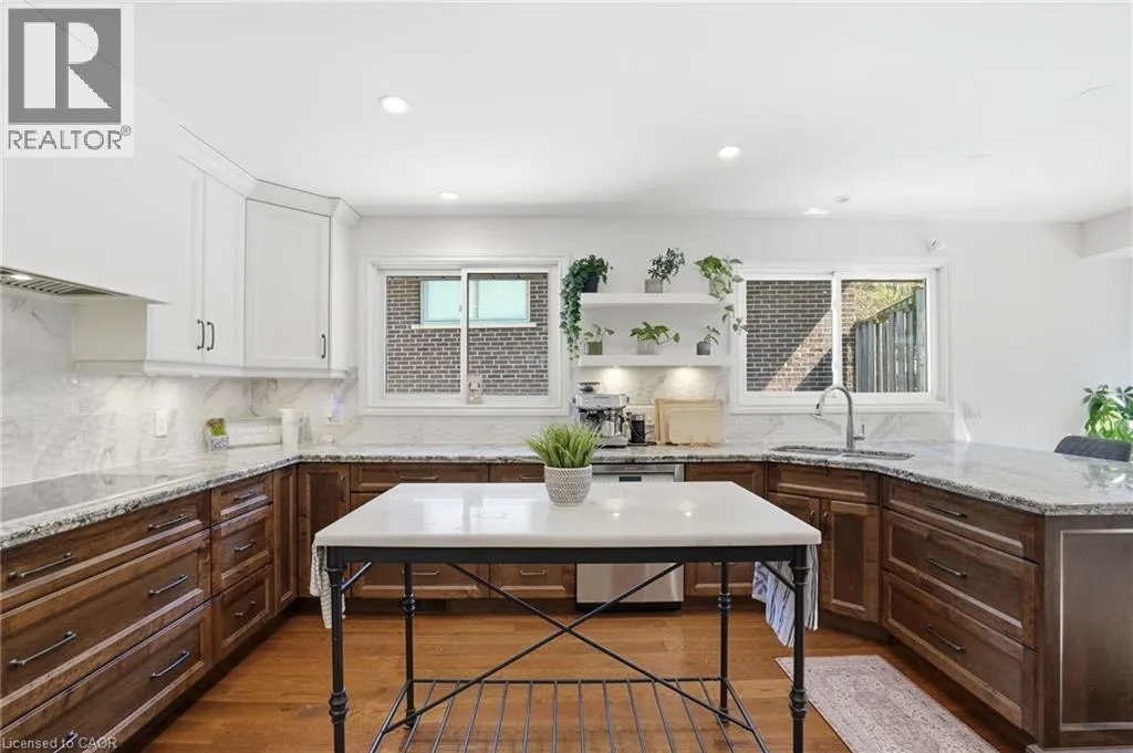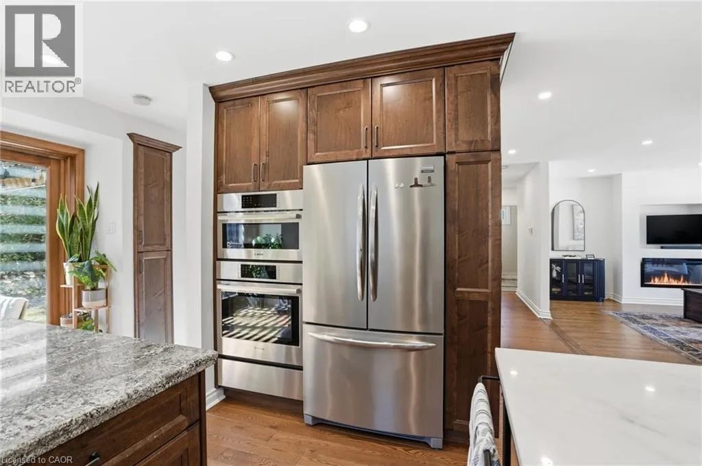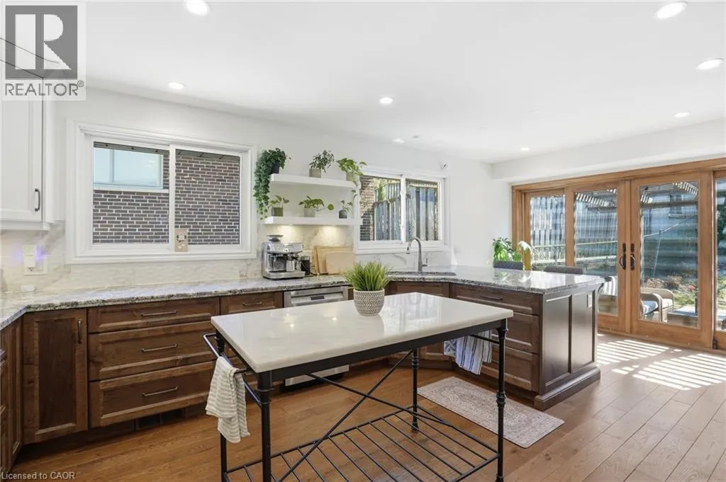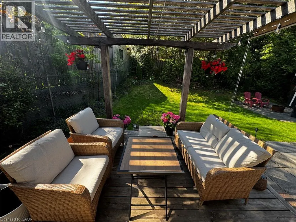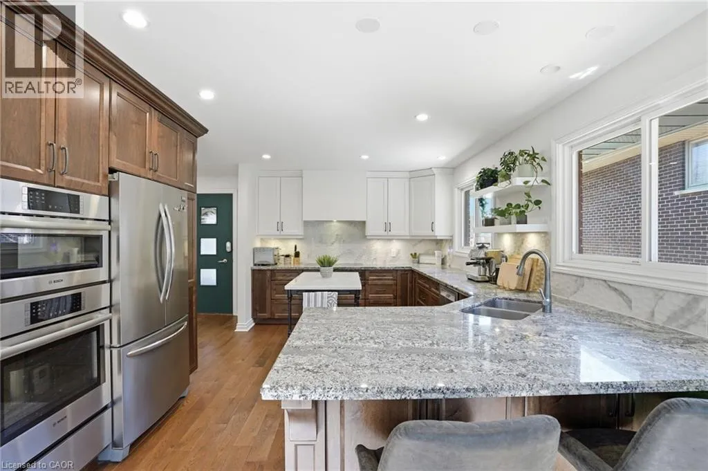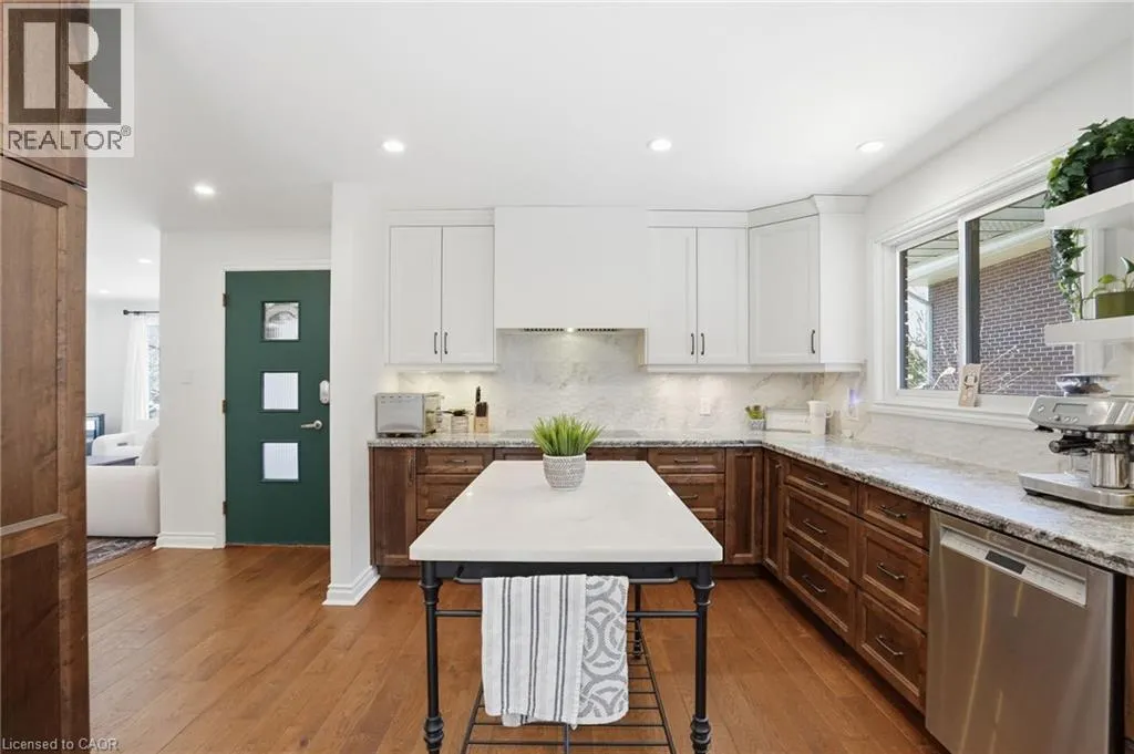 Old Ancaster Rd to Pleasant Ave Welcome to 84 Pleasant Avenue - a beautifully updated and move-in-ready 3-bedroom, two-bathroom home. The open-concept main floor features hardwood floors, custom millwork, and a gorgeous, gourmet kitchen with granite counters, Bosch appliances, peninsula seating, double sinks, and a porcelain backsplash. It includes a walkout to a private, landscaped yard with a pergola, 2 patios, and a gas BBQ hookup. Completing the main floor is a separate dining room (could be converted back to a bedroom - custom doors in garage), naturally bright and spacious living room with a built in electric fireplace, an updated, designer inspired main bathroom plus two bedrooms. Downstairs you'll find the fully finished basement (taken down to the studs in 2022). It features a huge rec room with bar area + gas fireplace, third bedroom, laundry with additional storage area / gym area, recently updated bathroom, separate room for office / craft room, plus a separate entranceâideal for an in-law set up or teen retreat. Additional updates include pot lights throughout, beautifully finished hardwood , updated fixtures, landscaping and so much more. Parking for 4 cars plus a garage. Minutes to trails and close to everything Dundas has to offer. (id:27476)