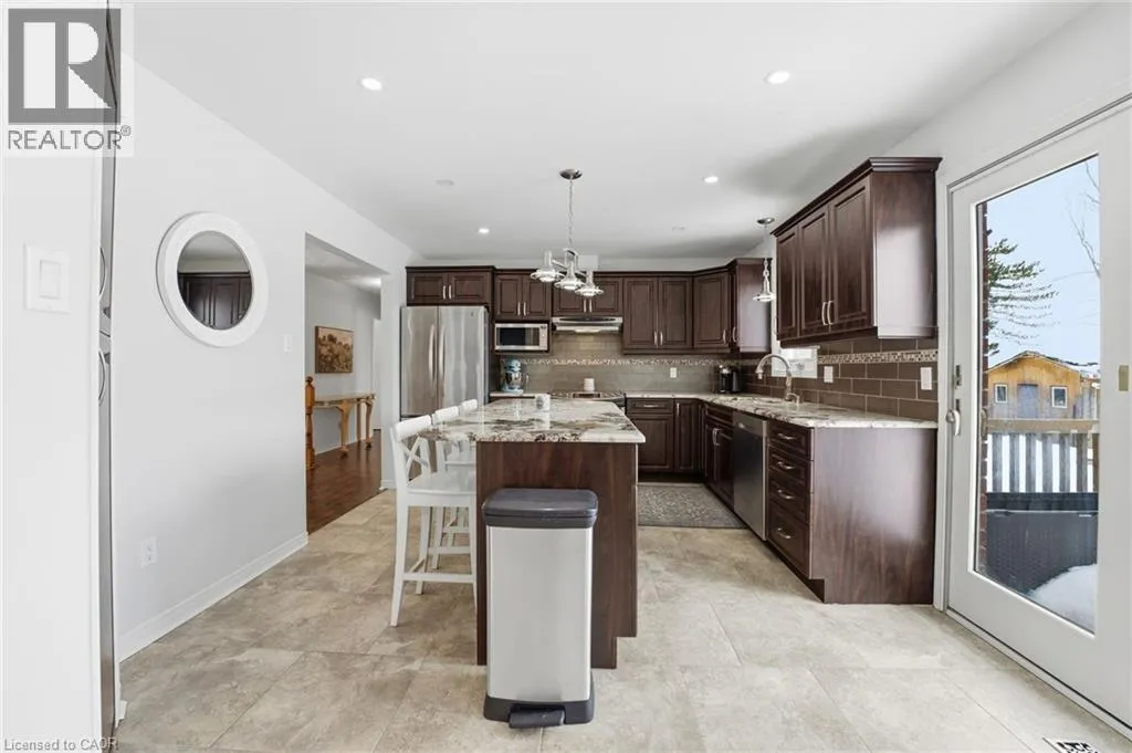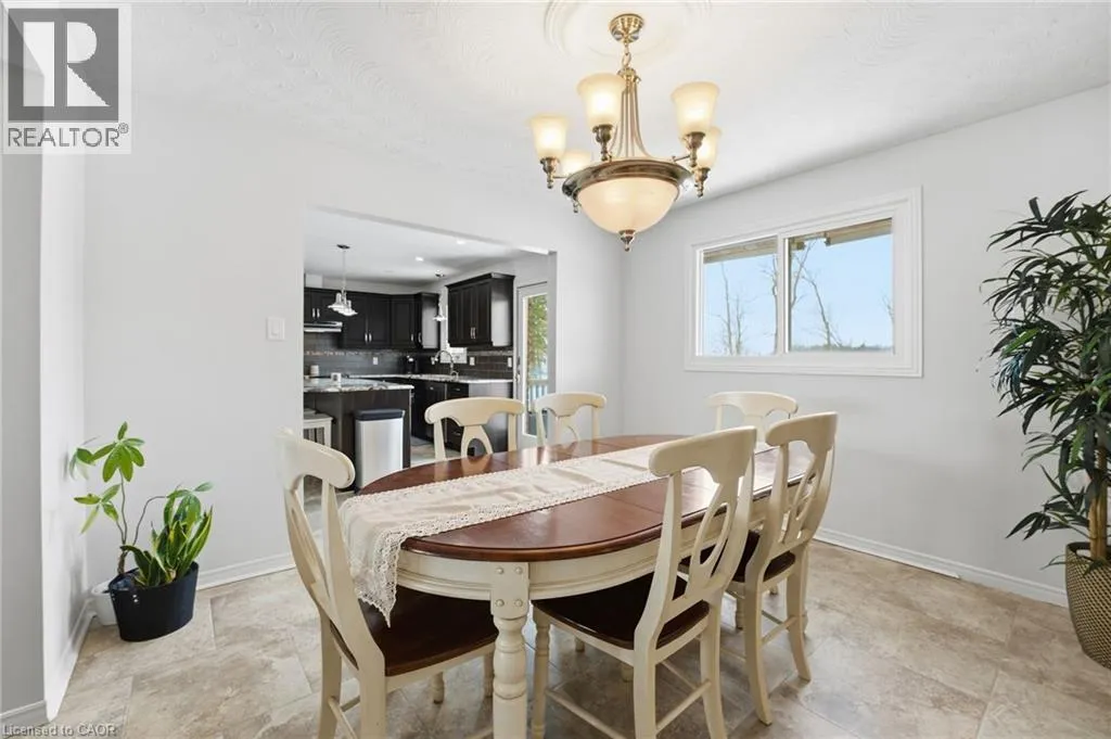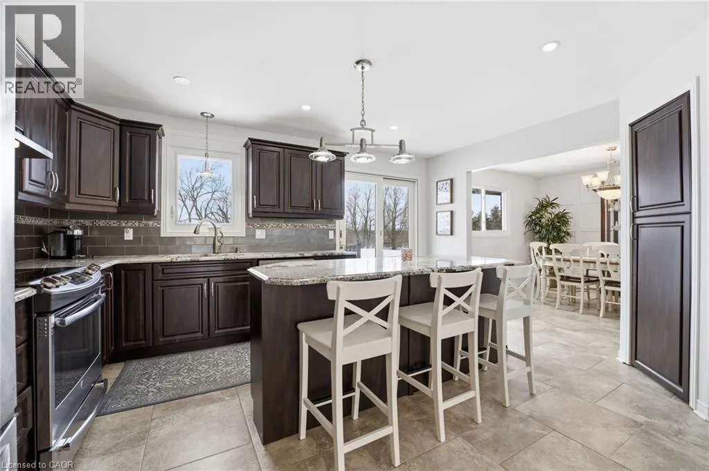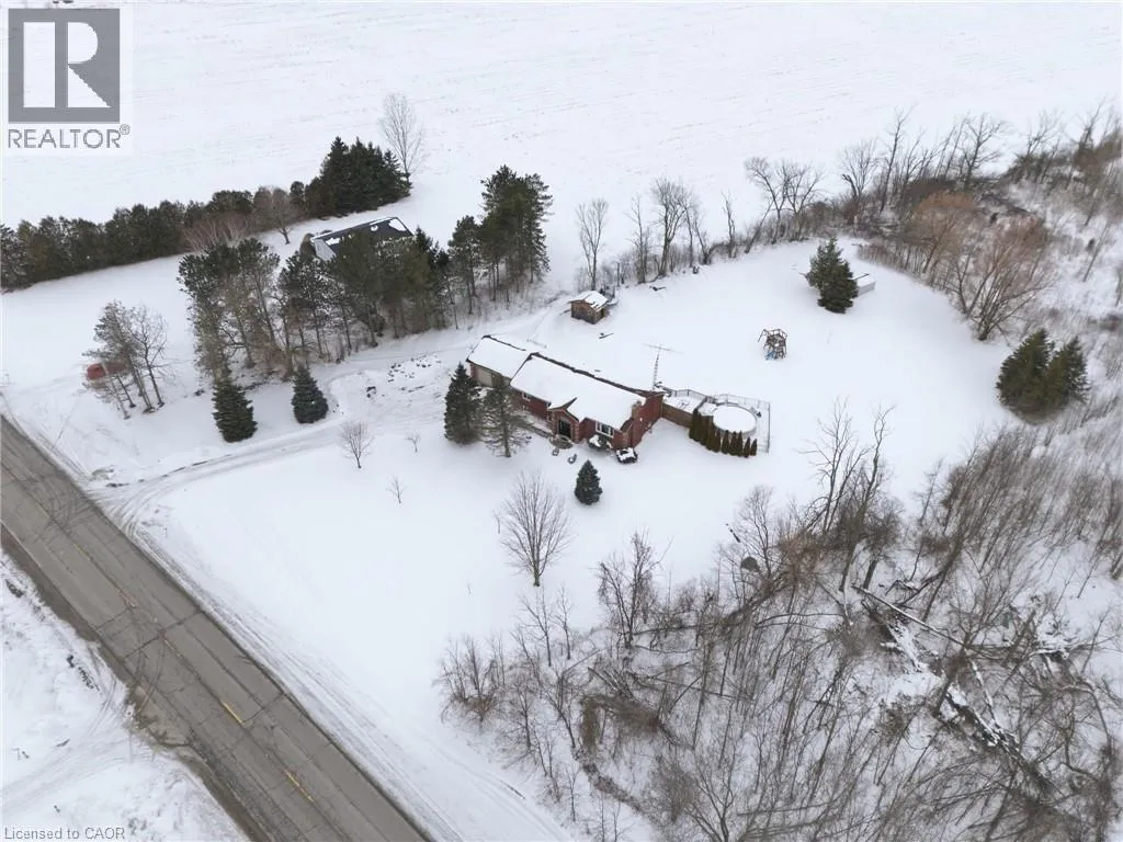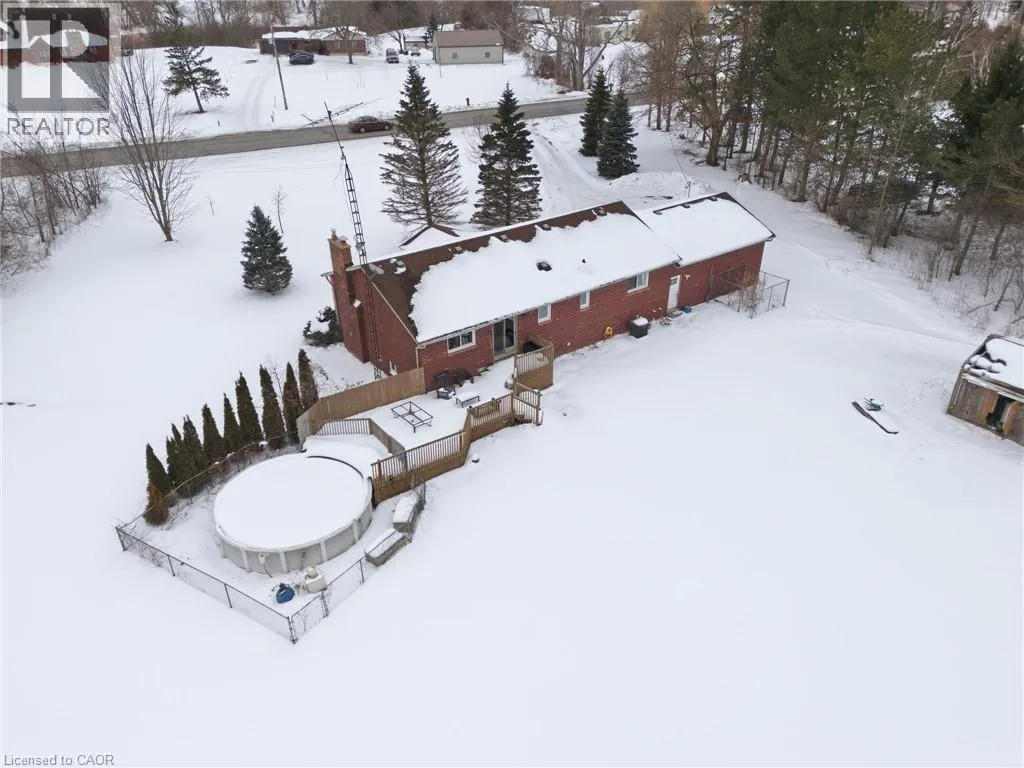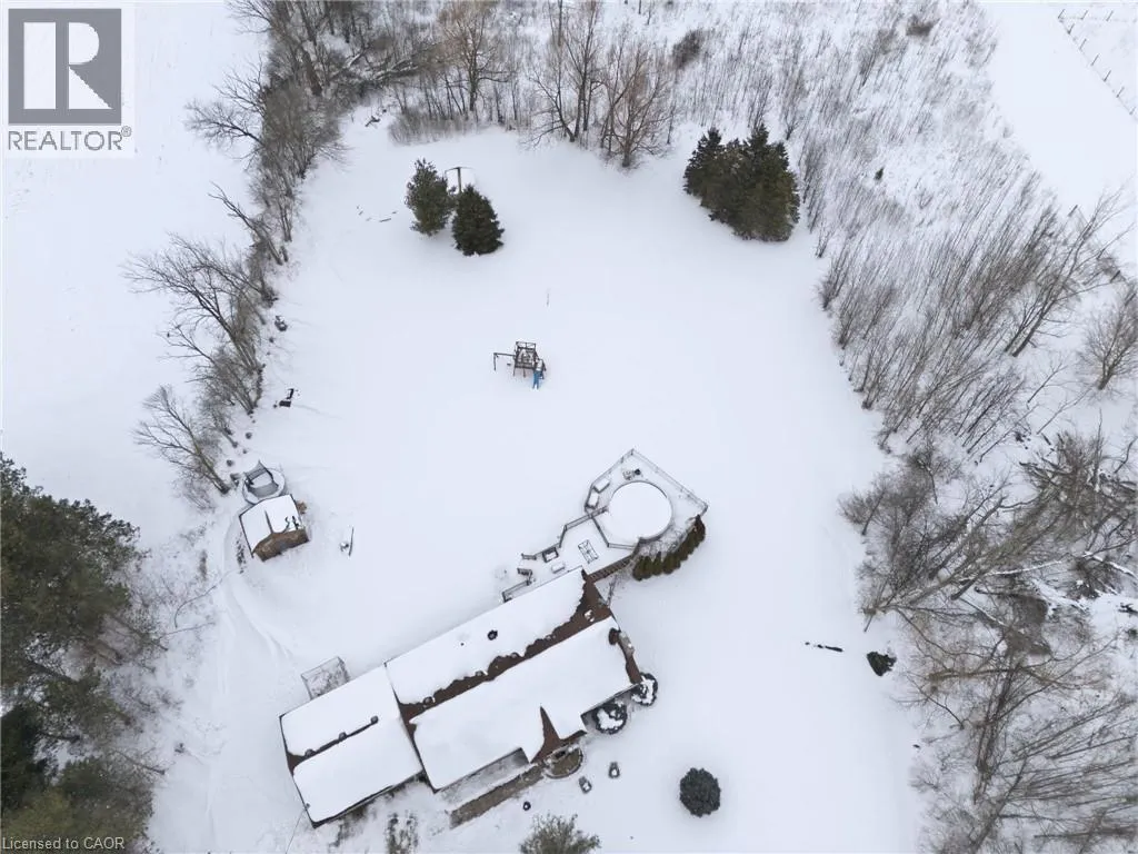 Discover peaceful country living in this all-brick, raised bungalow set on a private 1.24 acre lot surrounded by mature trees. Positioned well back from the road, the expansive driveway offers parking for 10+ vehicles - perfect for guests, trailers, or all your toys. Built with durable core slab construction, providing solid floors for the main-level, and open-concept living in the basement. Step inside through the spacious, welcoming foyer featuring dual closets and a beautiful open staircase that allows natural light to flow throughout both levels. The upper level showcases an updated kitchen with an oversized island, granite countertops, and seamless transition to the dining room with an eye-catching accent wall. The bright, spacious living room features custom built-ins framing an all-brick fireplace (not in use) and a large bay window. Three bedrooms and a 4-piece bathroom complete the upper level, with dual closets in the primary bedroom . The fully finished lower level is designed for entertaining with a built-in bar, gas fireplace, 3-piece bathroom, and flexible recreation space ideal for a playroom, home office, or future bedroom with convenient walk-up garage access and includes a utility/storage room with brand new furnace (Jan 2026). The 500+ sq ft garage comfortably fits two vehicles and includes a gas line already roughed in for a heater. Step outside into the spacious yard to an oversized back deck overlooking the above-ground pool (AS-IS) - perfect for relaxing or entertaining. Enjoy the peace and privacy of rural living while being just minutes from the downtown core of Dunnville. (id:27476)