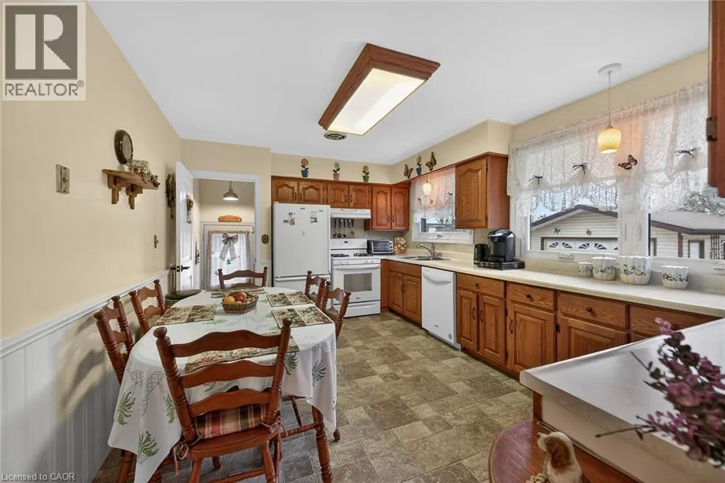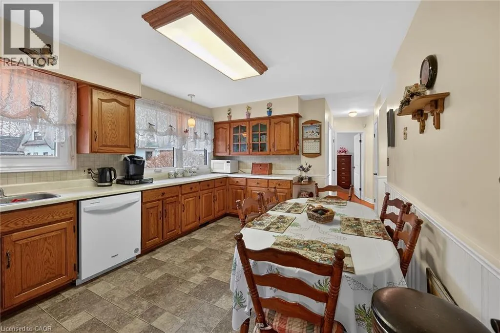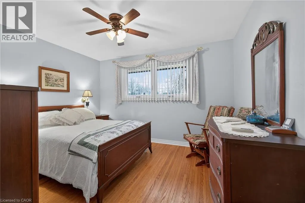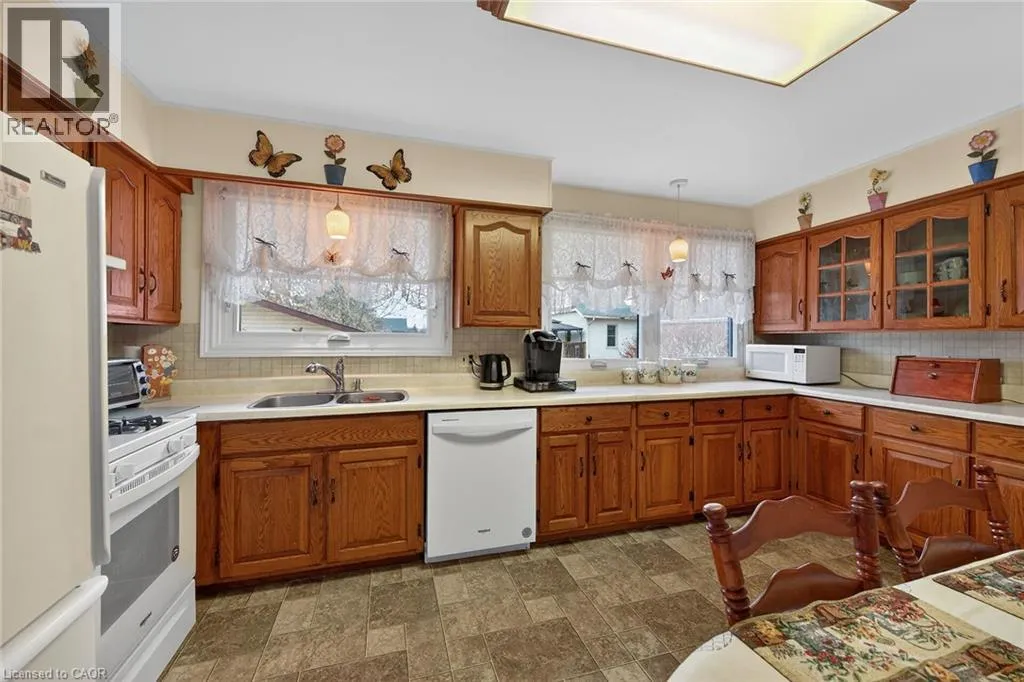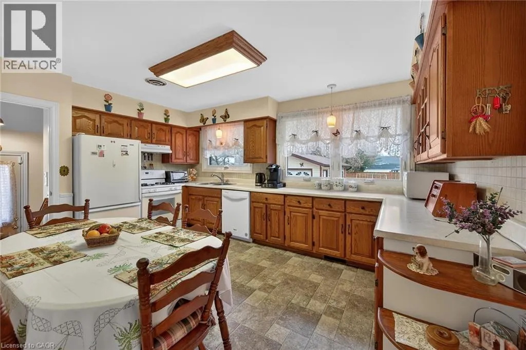 Follow Main Street into Dunnville, Take Cedar street to the property Lovingly maintained all brick 1965 built bungalow with finished basement and detached garage (blt in 2017) on mature treed 56x124ft lot in quiet area of Dunnville. This solid super clean home offers 3 bedrooms, 2 full bathrooms, large country sized eat in kitchen with oak cabinetry, gleaming original hardwood floors, and good sized lower level family room with gas fireplace. Lots of important updates including all new vinyl windows in 2000, asphalt roof shingles 2018, natural gas high efficiency furnace with central air â replaced in 2009, owned hot water tank 2012, and water purification/softener system â still under warranty. The house has 100 amp electrical and is wired ready for a generator. The upper level bathroom has a walk in bathtub for ease of use if needed, and the  lower level tub is a relaxing jacuzzi. Outside features a quaint covered front porch, parking for 3 to 4 cars, and lots of gardens to enjoy! Detached single car garage with concrete floor, power, and two windows - would make a great man cave. No worries here â come live quiet small town life in Dunnville! (id:27476)