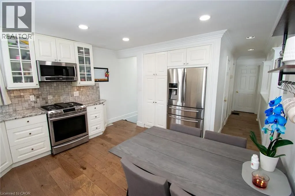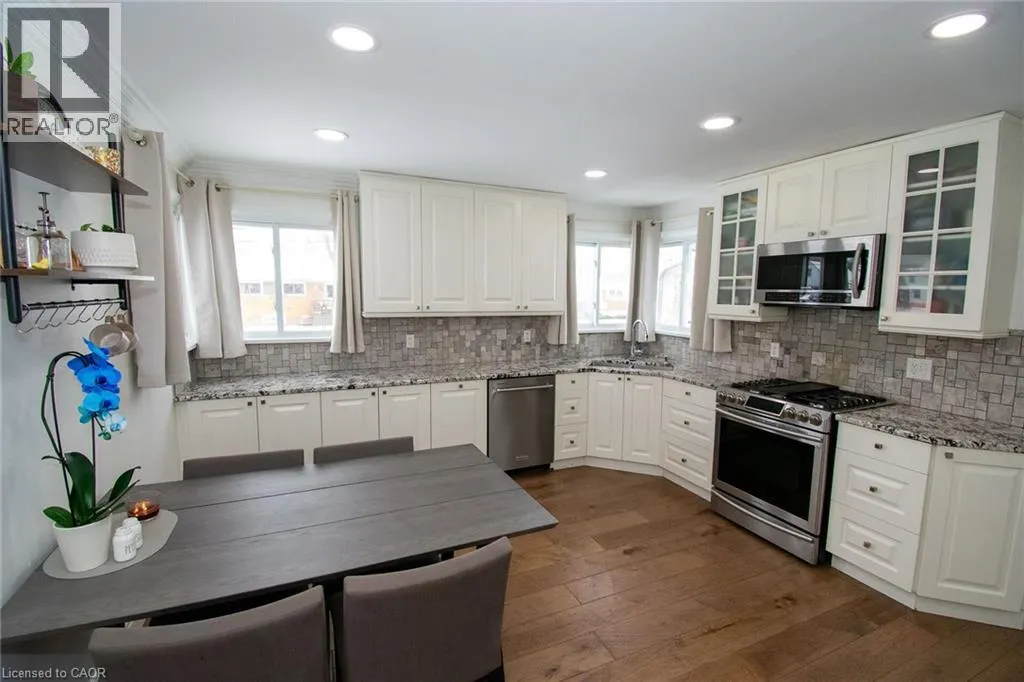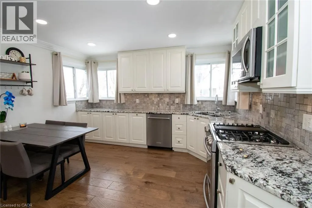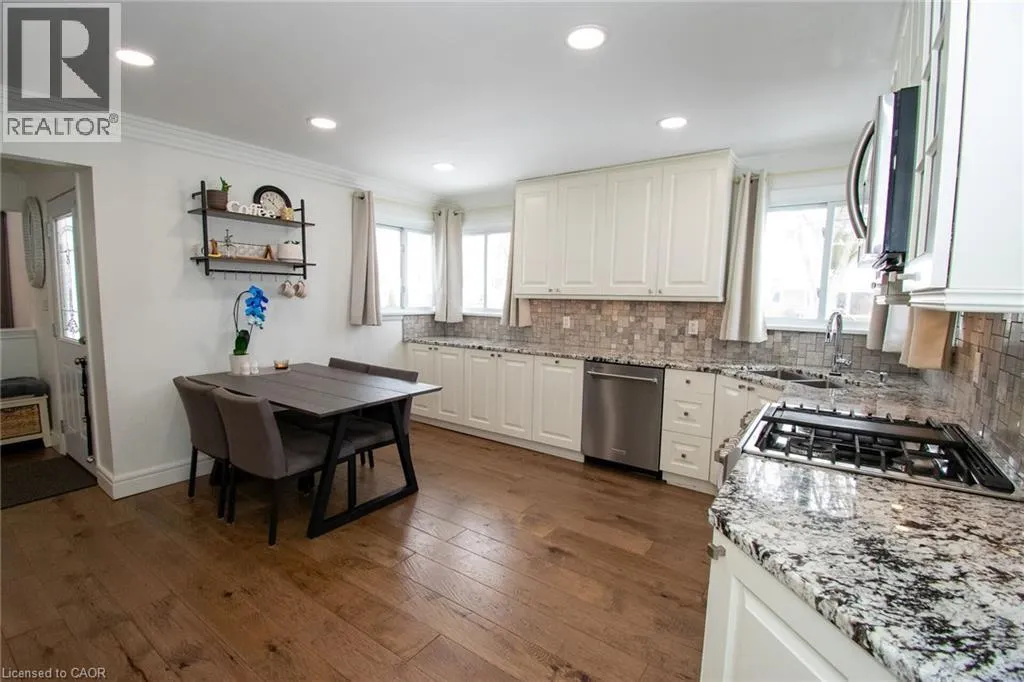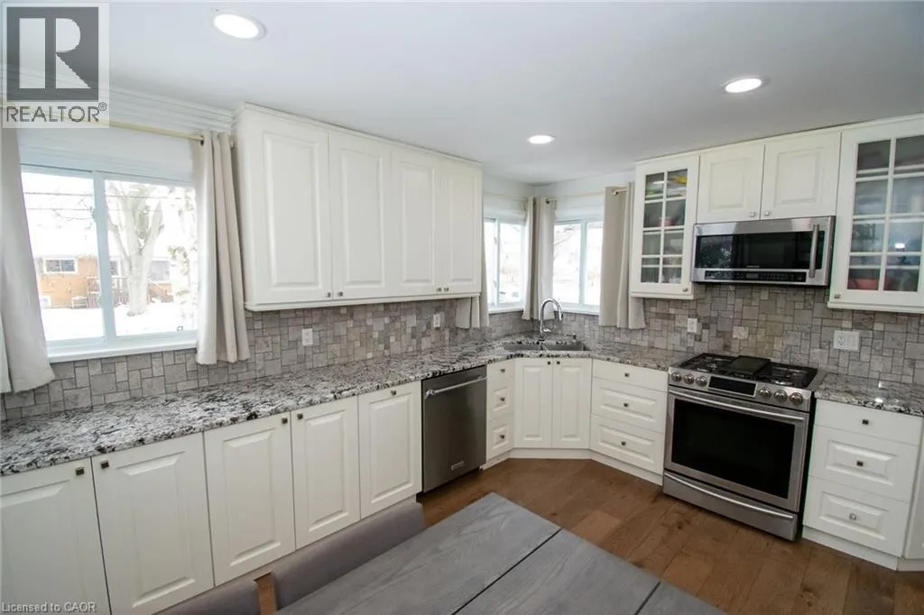 Step inside this spacious 3+2 bedroom home tucked away in a quiet, family-friendly neighbourhood. The main floor welcomes you with beautiful hickory engineered hardwood flooring, an updated maple kitchen with granite countertops and appliances, and a bright living room featuring a cathedral ceiling and cozy wood-burning fireplaceâperfect for relaxing or entertaining. The updated 4-piece bathroom adds modern comfort, while the lower level offers incredible flexibility with 2 additional bedrooms, a 2-piece bath, a large rec-room, laundry area, and plenty of storageâideal for guests, a home office, or growing families. Step outside to enjoy the fully fenced yard with a detached garage, offering privacy and space for kids, pets, or summer gatherings. A wonderful opportunity to own a home that combines comfort, space, and a peaceful location. (id:27476)