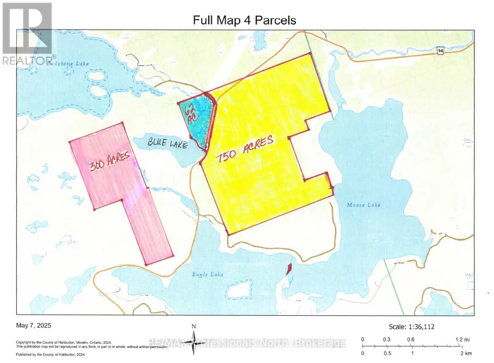 Cross Streets: HWY 118 to Haliburton Lake Road. ** Directions: HWY 118 to Haliburton Lake Road follow to sign. An extraordinary opportunity to own four lots offered together as one expansive parcel totaling approximately 1,132 acres of stunning Haliburton County landscape. Located just 15 minutes from the Village of Haliburton, you'll enjoy easy access to shopping, restaurants, schools, and healthcare while experiencing the seclusion and natural beauty this vast property offers. Property 1 features 60 acres with substantial frontage on both Blue Lake and a scenic creek, along with an original hunt camp and severance potential a rare blend of waterfront and development opportunity. Property 2 spans 750 acres with elevated views over Moose Lake and Eagle Lake, along with frontage on Moose Lake. This parcel also presents severance potential, making it ideal for a private estate or future investment. Property 3 is a unique sandbar between Moose Lake and Eagle Lake, offering rare access and connection between the two lakes. While not buildable, it contributes to the overall character and water access of the land. Property 4 encompasses 300 acres of highland terrain with panoramic views overlooking Eagle Lake, perfect for exploring, recreation, or long-term visioning. With endless possibilities for development, conservation, or recreational use, this offering is ideal for investors, outdoor enthusiasts, or those seeking to create a truly private retreat in cottage country. Opportunities of this scale and setting are incredibly rare don't miss your chance to explore the potential of this one-of-a-kind land package. (id:27476)