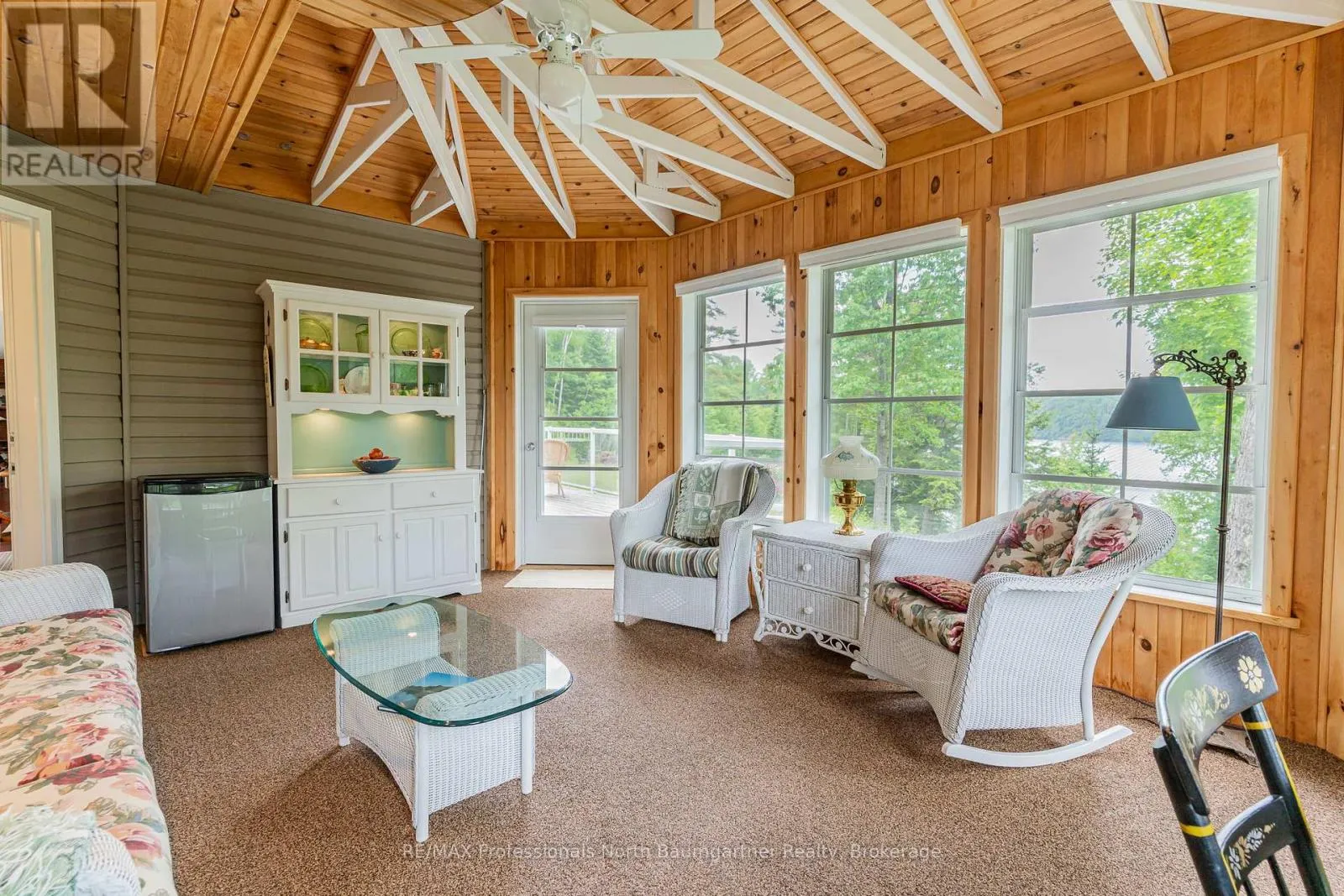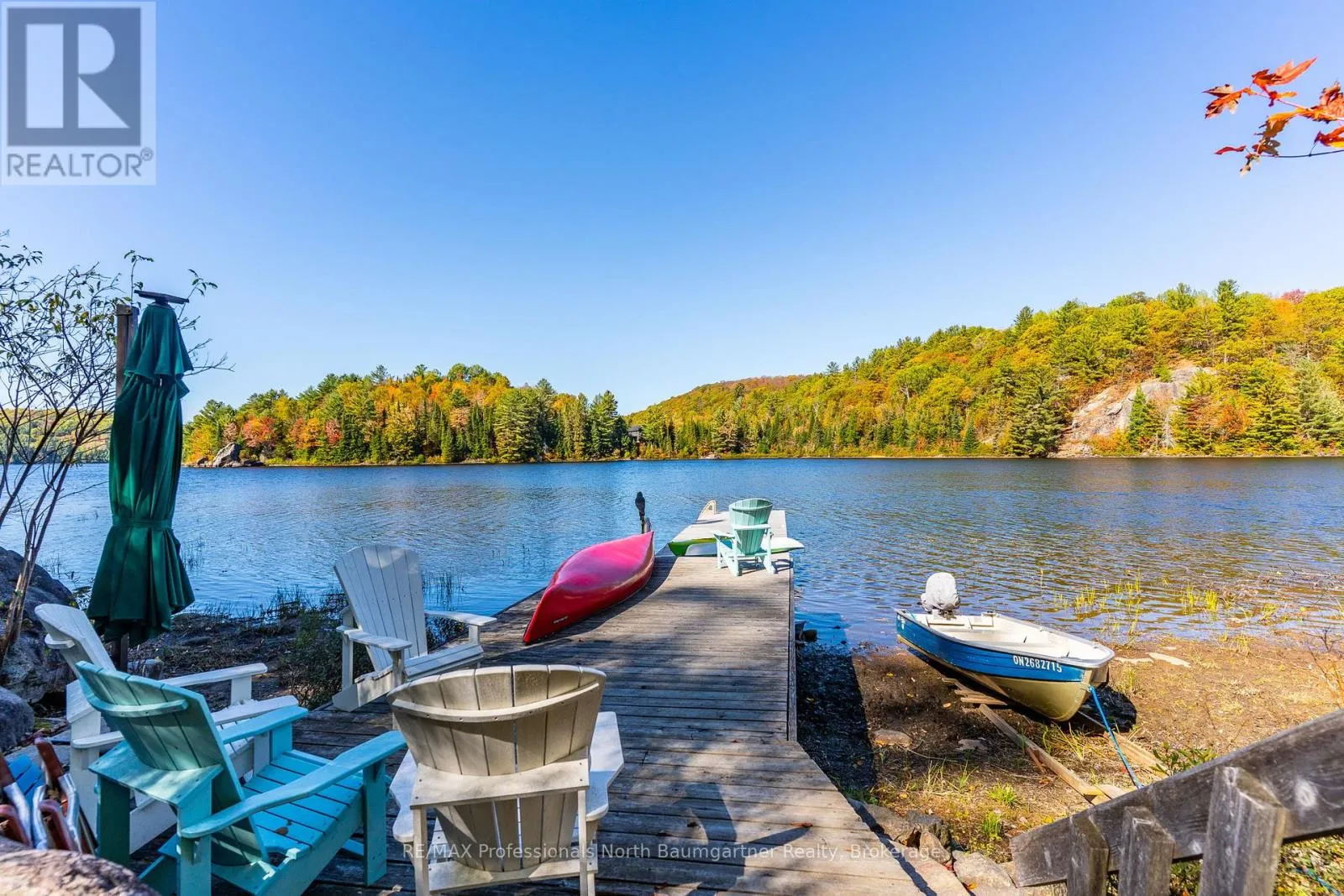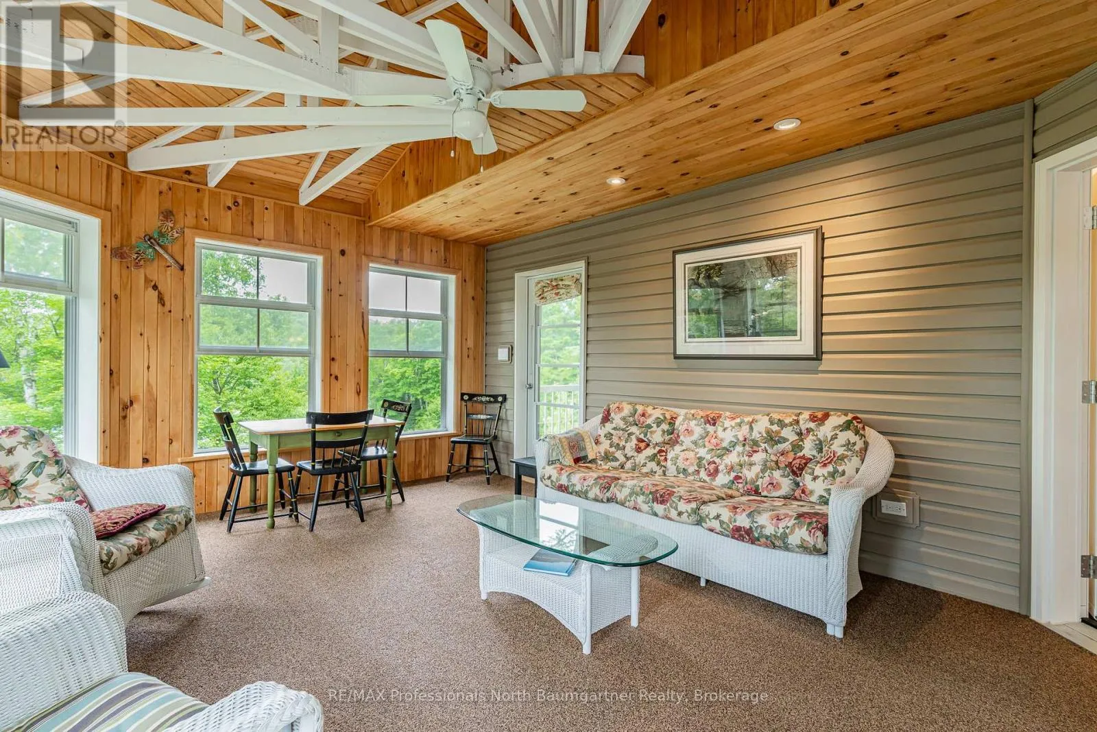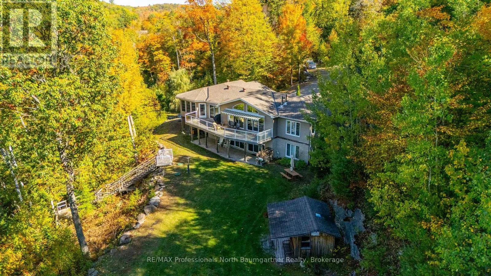 Cross Streets: Kennisis Lake Road and Growler Lake Road. ** Directions: Kennisis Lake Road + Growler Lake Road. Imagine owning 3500 sq ft of living space on 45.53 acres of Haliburton Forest and 520 ft of water frontage. Wake each morning to the whisper of wind through towering trees and Growler Lakes mirror surface reflecting the morning light. This isn't just a cottage; it's your gateway to life at nature's pace, where every sunset paints the sky. Wildlife roams freely and mature trees stand guard. Autumn brings crimson and gold, winter creates a snow-covered wonderland, spring awakens with birdsong, and summer invites lake adventures. Currently under a Managed Forest Plan, this land can be your legacy. The lake is ideal for morning swims, afternoon paddle boarding, and evening kayaking. The substantial 40-foot dock is perfect for diving, fishing, or simply enjoying coffee while loons call across the water. The thoughtful layout of this 5-bedroom, 4-bathroom home balances comfort with connection. A great room anchors each level. The open-concept kitchen features quartz countertops and backsplash, with breakfast bar seating. A window-walled 3 season porch captures views of natural surroundings and serves as alternative dining space. Each bedroom is generously sized, offering personal retreats. Two 44-foot lake-facing decks create multiple outdoor living areas. The upper deck features glass paneling and an electric awning and the lower one stays naturally shaded, perfect for escaping summer heat. An Opel low-emission fireplace and Napoleon wood stove provide warmth and ambiance. The west-facing orientation delivers spectacular sunsets every day so you can watch the sky transform from blue to pink to orange to purple, painting the lake in changing colors for your own private daily show. This isn't just a cottage; it's the setting for the life you want to live. Host memorable gatherings, create family traditions, and discover the peace that comes with owning a piece of paradise. Your escape is waiting. Welcome home to Growler Lake. (id:27476)