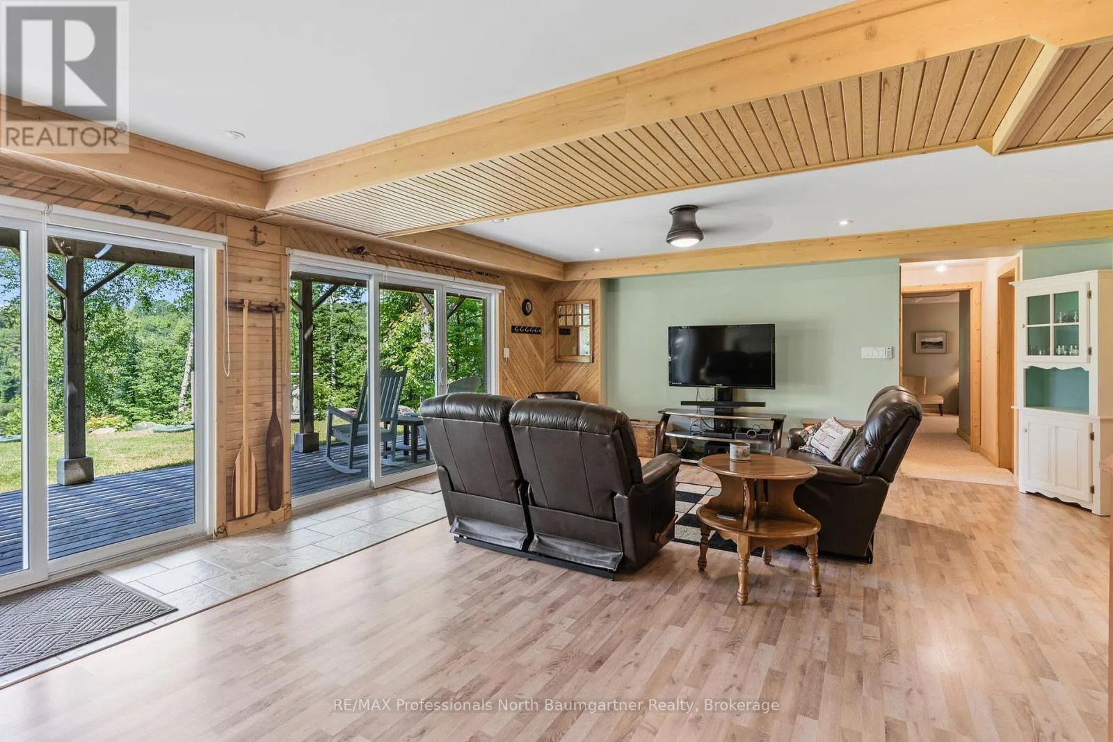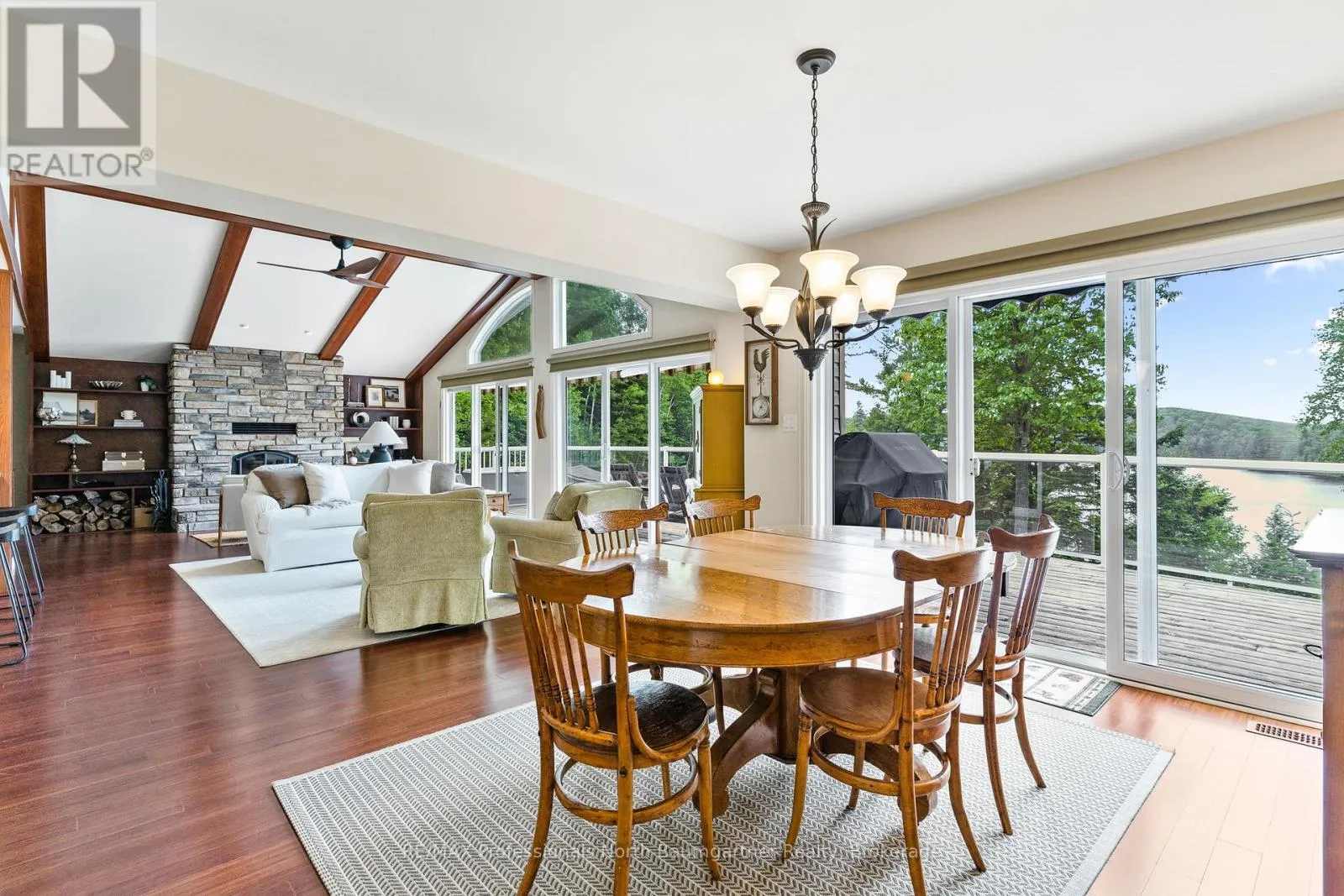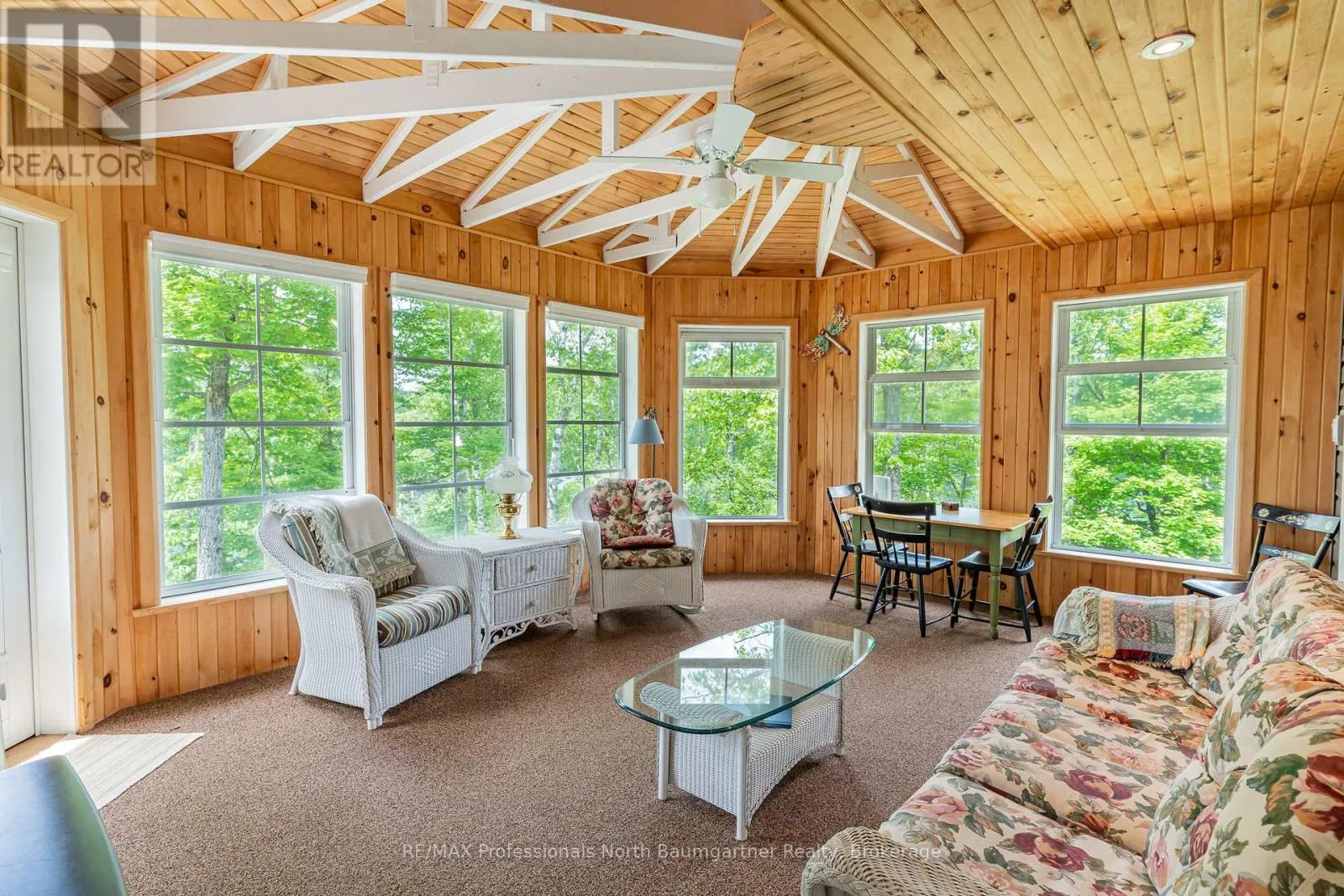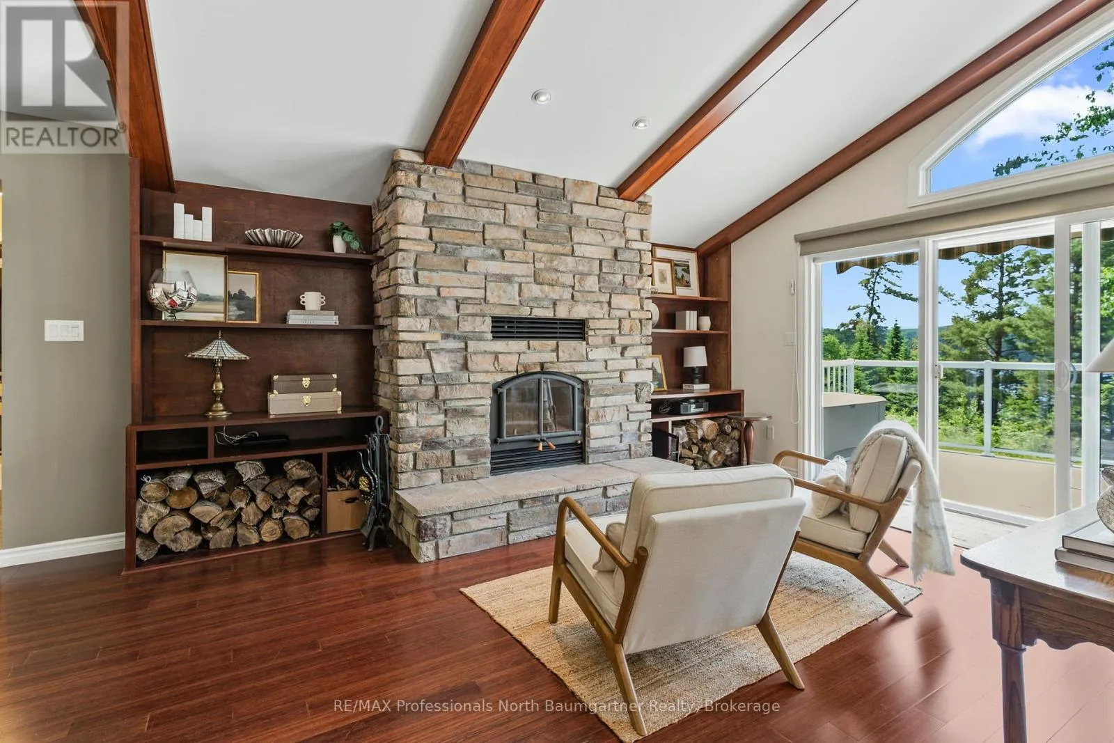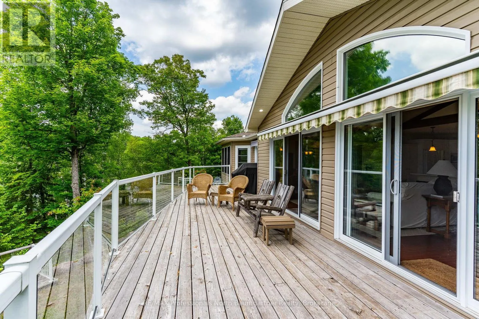 Cross Streets: Kennisis Lake Road and Growler Lake Road. ** Directions: Kennisis Lake Road + Growler Lake Road. Imagine owning 3500 sq ft of living space on 45.53 acres of Haliburton Forest and 520 ft of water frontage. Wake each morning to the whisper of wind through towering trees and Growler Lakes mirror surface reflecting the morning light. This isn't just a cottage; it's your gateway to life at nature's pace, where every sunset paints the sky. Wildlife roams freely and mature trees stand guard. Autumn brings crimson and gold, winter creates a snow-covered wonderland, spring awakens with birdsong, and summer invites lake adventures. Currently under a Managed Forest Plan, this land can be your legacy. The lake is ideal for morning swims, afternoon paddle boarding, and evening kayaking. The substantial 40-foot dock is perfect for diving, fishing, or simply enjoying coffee while loons call across the water. The thoughtful layout of this 5-bedroom, 4-bathroom home balances comfort with connection. A great room anchors each level. The open-concept kitchen features quartz countertops and backsplash, with breakfast bar seating. A window-walled 3 season porch captures views of natural surroundings and serves as alternative dining space. Each bedroom is generously sized, offering personal retreats. Two 44-foot lake-facing decks create multiple outdoor living areas. The upper deck features glass paneling and an electric awning and the lower one stays naturally shaded, perfect for escaping summer heat. An Opel low-emission fireplace and Napoleon wood stove provide warmth and ambiance. The west-facing orientation delivers spectacular sunsets every day so you can watch the sky transform from blue to pink to orange to purple, painting the lake in changing colors for your own private daily show. This isn't just a cottage; it's the setting for the life you want to live. Host memorable gatherings, create family traditions, and discover the peace that comes with owning a piece of paradise. Your escape is waiting. Welcome home to Growler Lake. (id:27476)