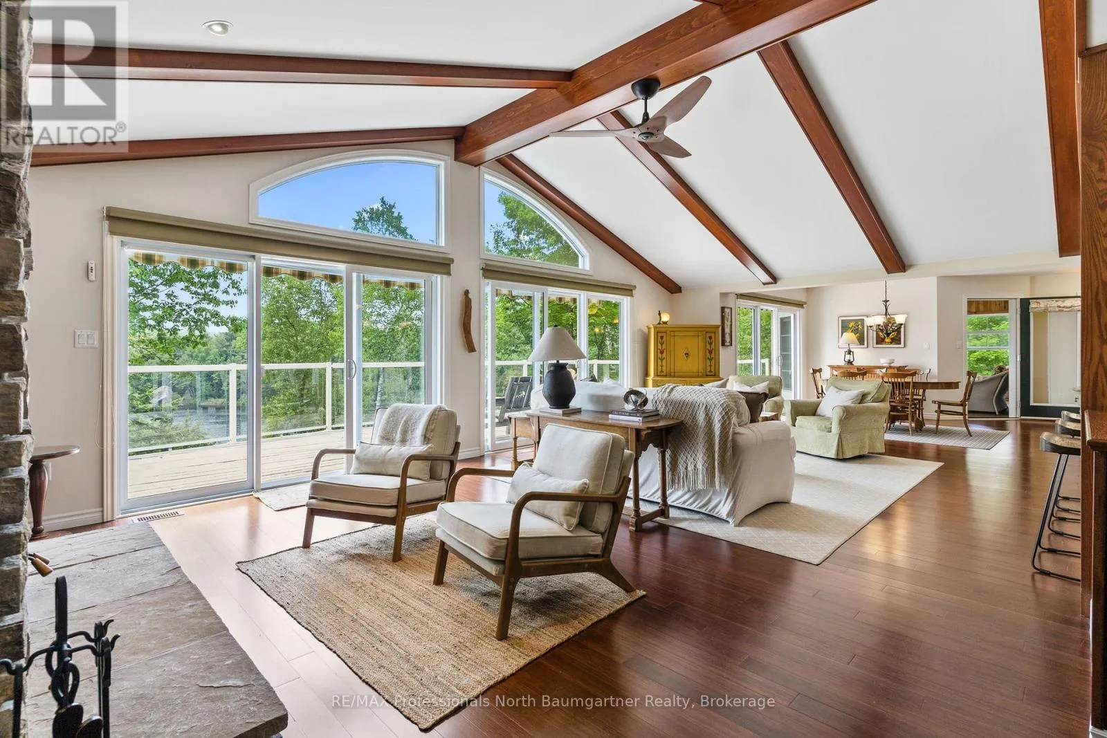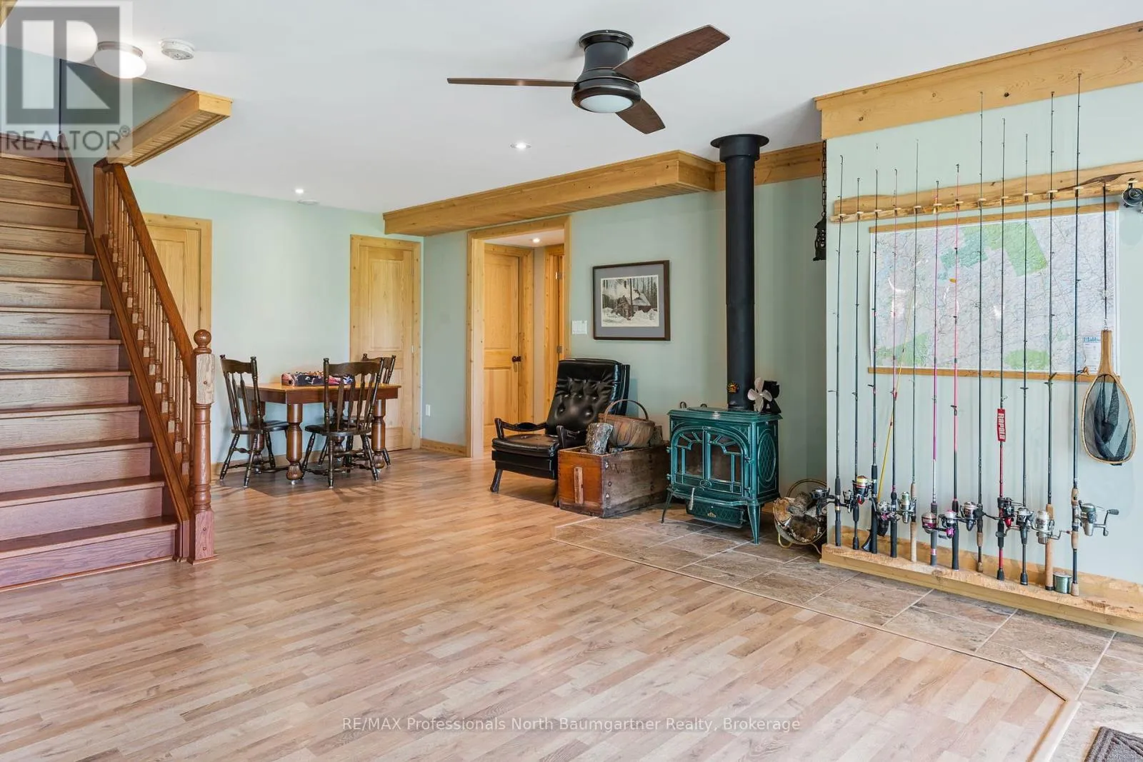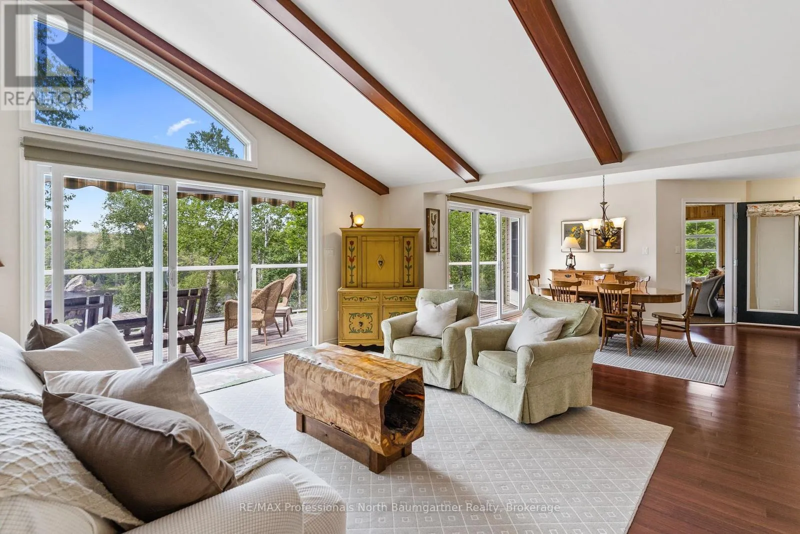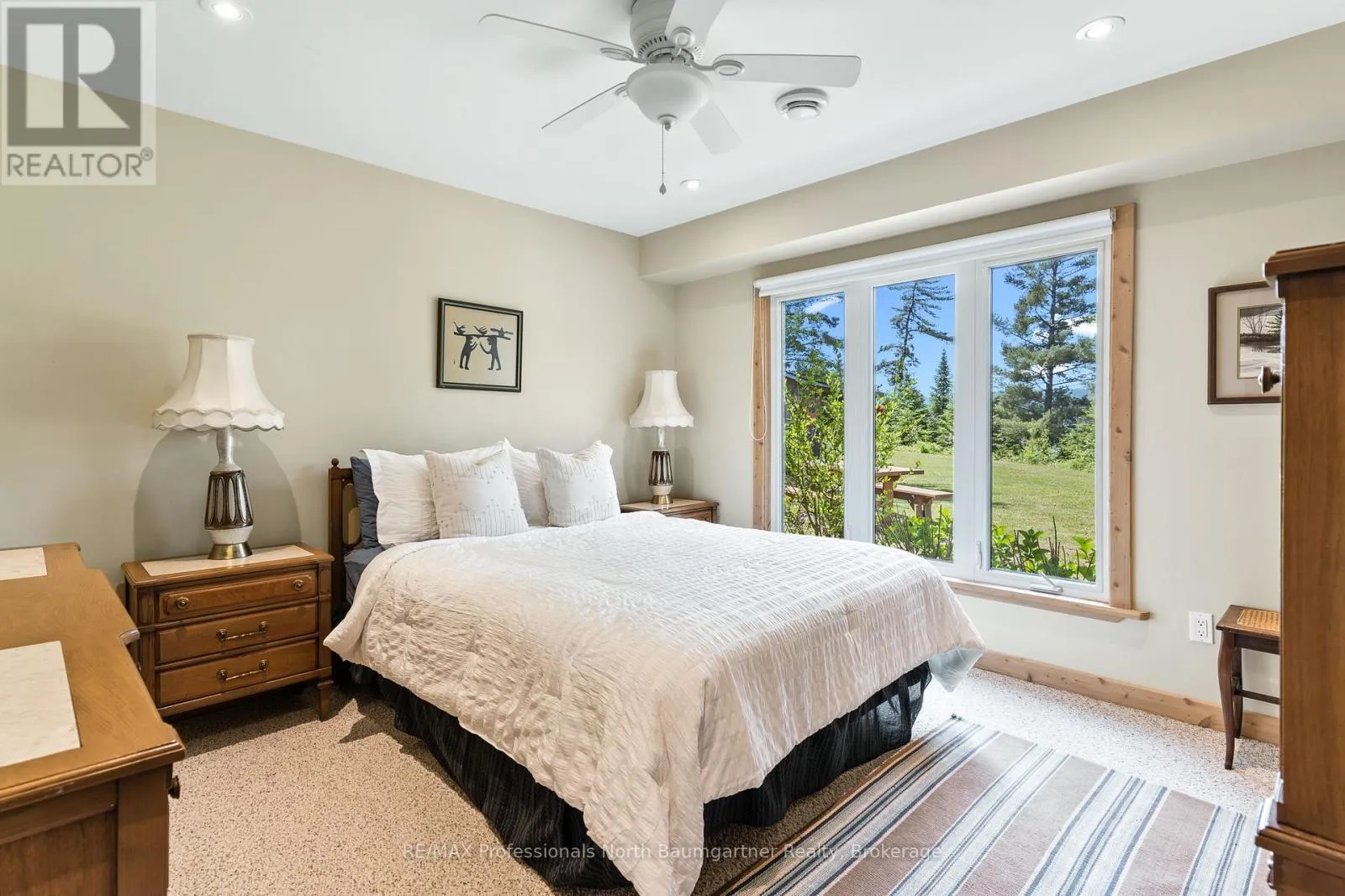 Cross Streets: Kennisis Lake Road and Growler Lake Road. ** Directions: Kennisis Lake Road + Growler Lake Road. Imagine owning 3500 sq ft of living space on 45.53 acres of Haliburton Forest and 520 ft of water frontage. Wake each morning to the whisper of wind through towering trees and Growler Lakes mirror surface reflecting the morning light. This isn't just a cottage; it's your gateway to life at nature's pace, where every sunset paints the sky. Wildlife roams freely and mature trees stand guard. Autumn brings crimson and gold, winter creates a snow-covered wonderland, spring awakens with birdsong, and summer invites lake adventures. Currently under a Managed Forest Plan, this land can be your legacy. The lake is ideal for morning swims, afternoon paddle boarding, and evening kayaking. The substantial 40-foot dock is perfect for diving, fishing, or simply enjoying coffee while loons call across the water. The thoughtful layout of this 5-bedroom, 4-bathroom home balances comfort with connection. A great room anchors each level. The open-concept kitchen features quartz countertops and backsplash, with breakfast bar seating. A window-walled 3 season porch captures views of natural surroundings and serves as alternative dining space. Each bedroom is generously sized, offering personal retreats. Two 44-foot lake-facing decks create multiple outdoor living areas. The upper deck features glass paneling and an electric awning and the lower one stays naturally shaded, perfect for escaping summer heat. An Opel low-emission fireplace and Napoleon wood stove provide warmth and ambiance. The west-facing orientation delivers spectacular sunsets every day so you can watch the sky transform from blue to pink to orange to purple, painting the lake in changing colors for your own private daily show. This isn't just a cottage; it's the setting for the life you want to live. Host memorable gatherings, create family traditions, and discover the peace that comes with owning a piece of paradise. Your escape is waiting. Welcome home to Growler Lake. (id:27476)