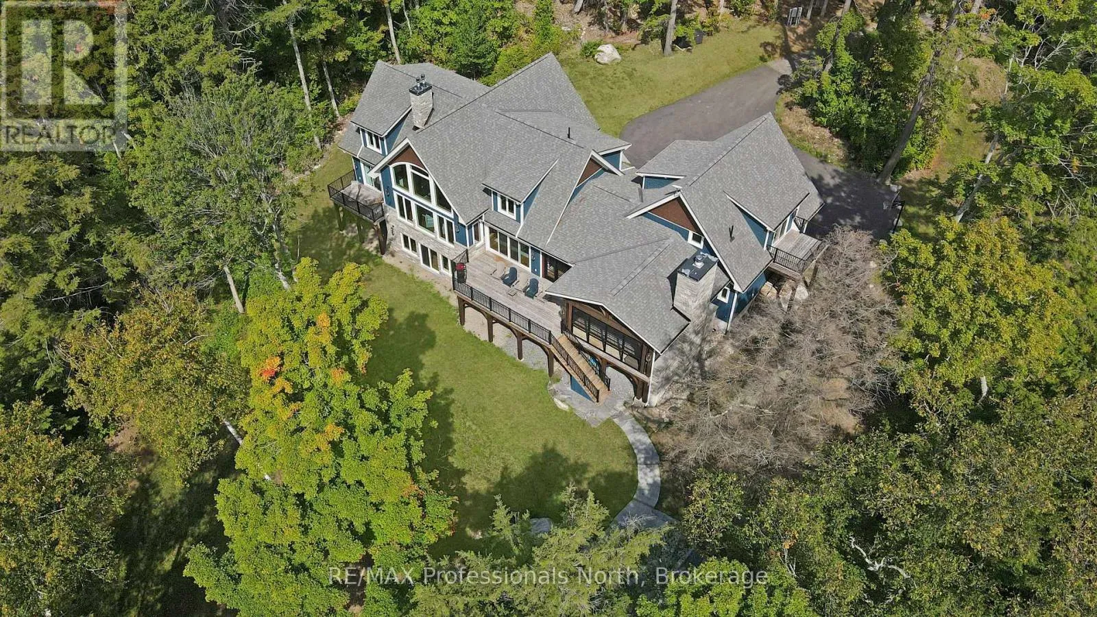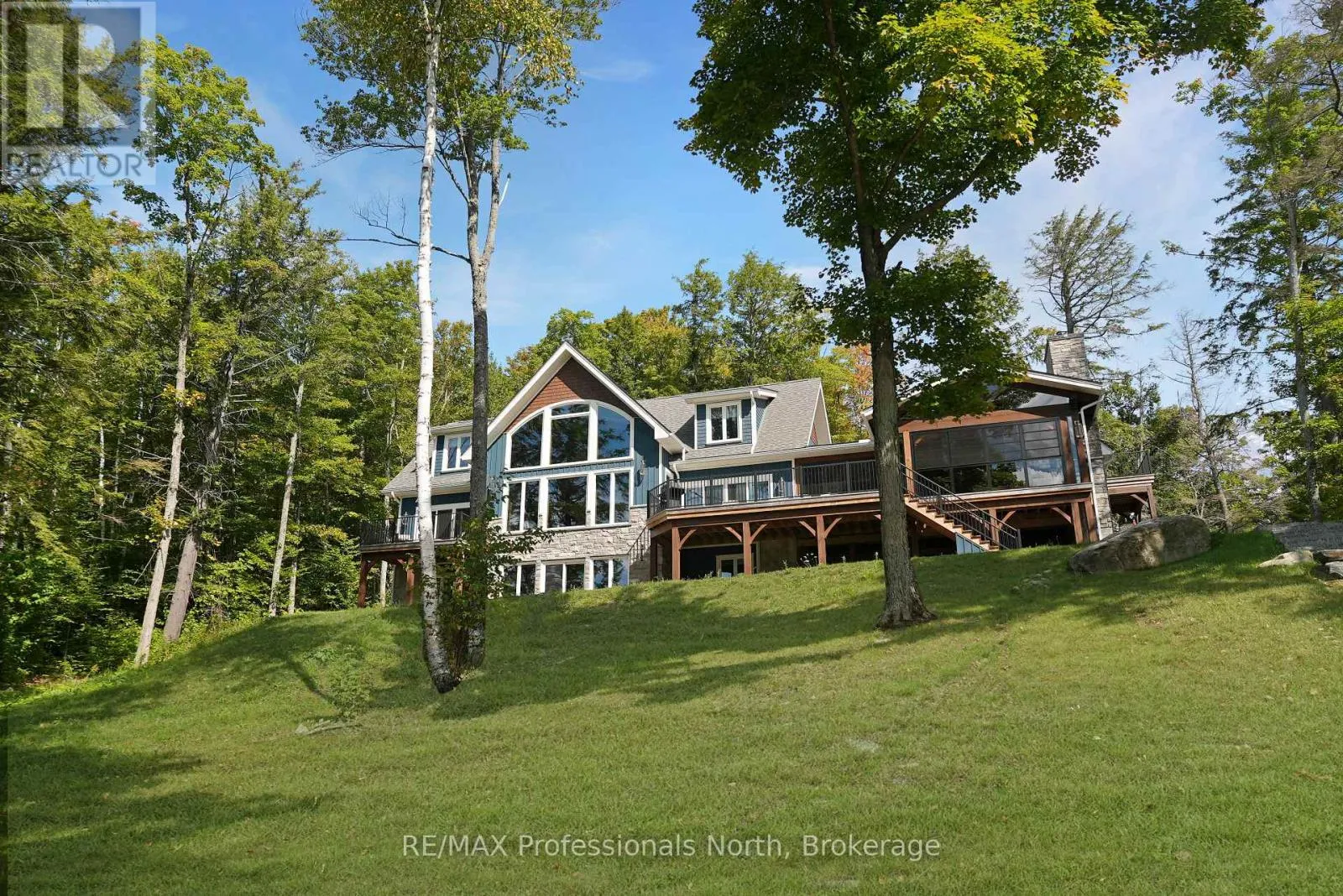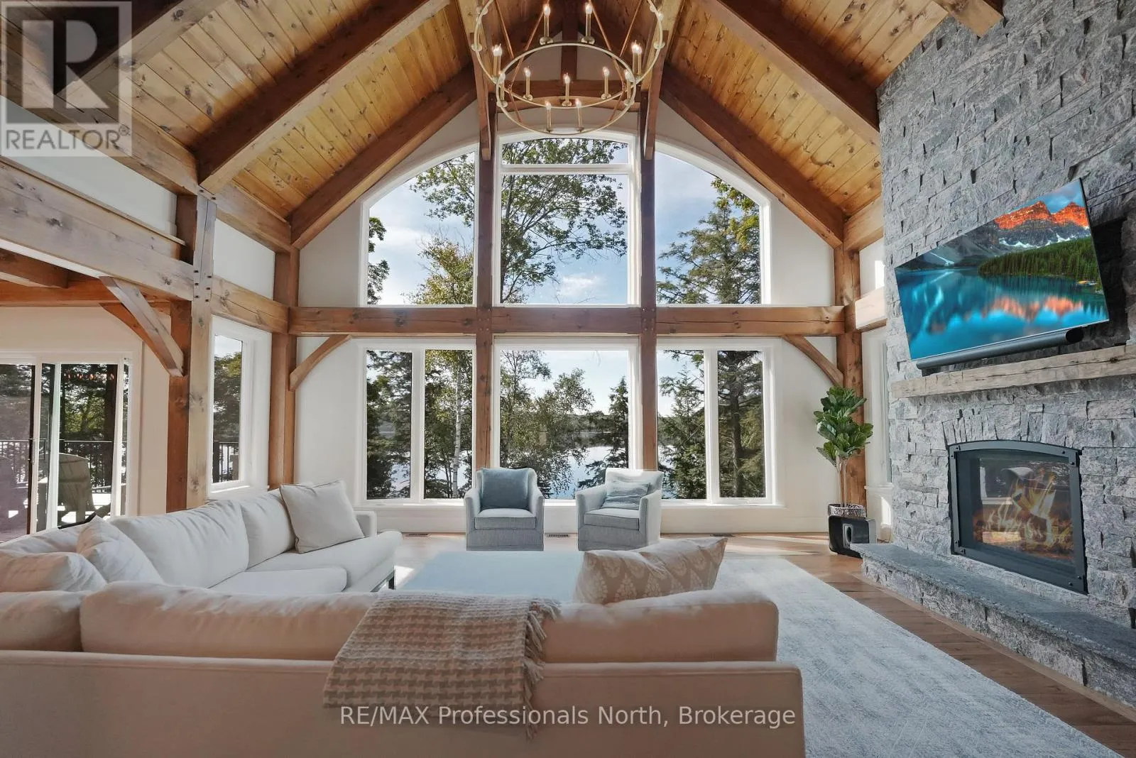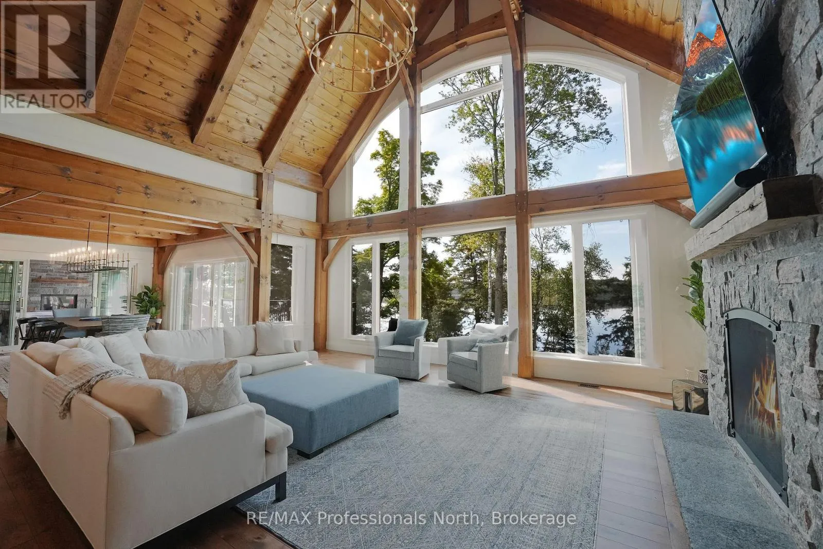 Cross Streets: Alpine Ridge/Flatwater Cove Trail. ** Directions: Hodgson Road to Burlywood Trail to Bryson Trail to Alpine Ridge Drive to Flatwater Cove Tr to SOP. Escape to a world of privacy and professional design with this one-of-a-kind estate on Percy Lake. Set on more than 4 acres of private grounds and boasting just under 600 feet of pristine, southern-exposed waterfront, this Haliburton sanctuary offers an experience in luxury rarely found. The tranquility of Percy Lake will be the escape you need, while providing a big lake view facing an entire shoreline of protected land.Step inside this grand timberframe home, where thoughtful design and premium craftsmanship define every space. The sprawling open-concept living area, anchored by a stunning floor-to-ceiling stone fireplace, flows effortlessly into a gourmet kitchen and spacious dining room. Each of the 7 bedrooms and 7 bathrooms is a private haven, with high-end fixtures and finishes. From light fixtures to tile patterns to drapery, each finishing has been expertly chosen. The main floor primary suite will exceed even the highest of standards. Embrace the seamless integration of indoor and outdoor living with a post and beam screened-in room, complete with its own wood-burning fireplace, providing an enchanting space to dine. The property's unparalleled amenities extend to a private waterfront sauna, offering a spa-like retreat with lake views. Guests will feel right at home in the versatile, finished loft above the garage, which features a kitchenette, balcony, bedroom, and bathrooma perfect, self-contained suite for family, staff or friends. With radiant in-floor heating and abundant natural light throughout the day, every detail has been curated for comfort and tranquility. This newly developed community also provides shared ownership in 1200 acres of land for endless exploring. This is more than just a cottage; it's a legacy property designed for those who seek the ultimate in lakeside living. (id:27476)