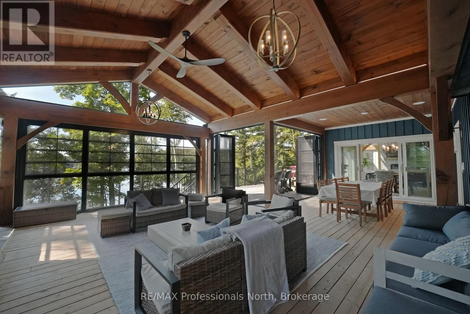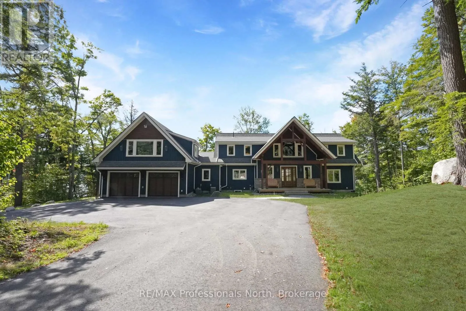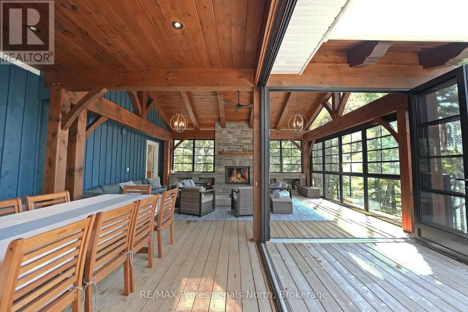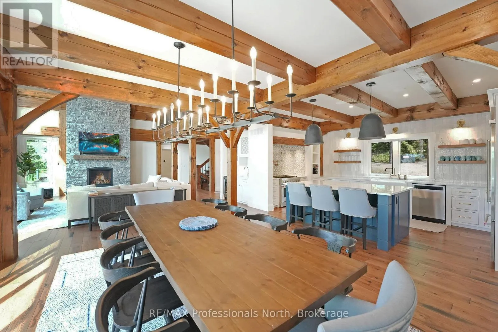 Cross Streets: Alpine Ridge/Flatwater Cove Trail. ** Directions: Hodgson Road to Burlywood Trail to Bryson Trail to Alpine Ridge Drive to Flatwater Cove Tr to SOP. Escape to a world of privacy and professional design with this one-of-a-kind estate on Percy Lake. Set on more than 4 acres of private grounds and boasting just under 600 feet of pristine, southern-exposed waterfront, this Haliburton sanctuary offers an experience in luxury rarely found. The tranquility of Percy Lake will be the escape you need, while providing a big lake view facing an entire shoreline of protected land.Step inside this grand timberframe home, where thoughtful design and premium craftsmanship define every space. The sprawling open-concept living area, anchored by a stunning floor-to-ceiling stone fireplace, flows effortlessly into a gourmet kitchen and spacious dining room. Each of the 7 bedrooms and 7 bathrooms is a private haven, with high-end fixtures and finishes. From light fixtures to tile patterns to drapery, each finishing has been expertly chosen. The main floor primary suite will exceed even the highest of standards. Embrace the seamless integration of indoor and outdoor living with a post and beam screened-in room, complete with its own wood-burning fireplace, providing an enchanting space to dine. The property's unparalleled amenities extend to a private waterfront sauna, offering a spa-like retreat with lake views. Guests will feel right at home in the versatile, finished loft above the garage, which features a kitchenette, balcony, bedroom, and bathrooma perfect, self-contained suite for family, staff or friends. With radiant in-floor heating and abundant natural light throughout the day, every detail has been curated for comfort and tranquility. This newly developed community also provides shared ownership in 1200 acres of land for endless exploring. This is more than just a cottage; it's a legacy property designed for those who seek the ultimate in lakeside living. (id:27476)