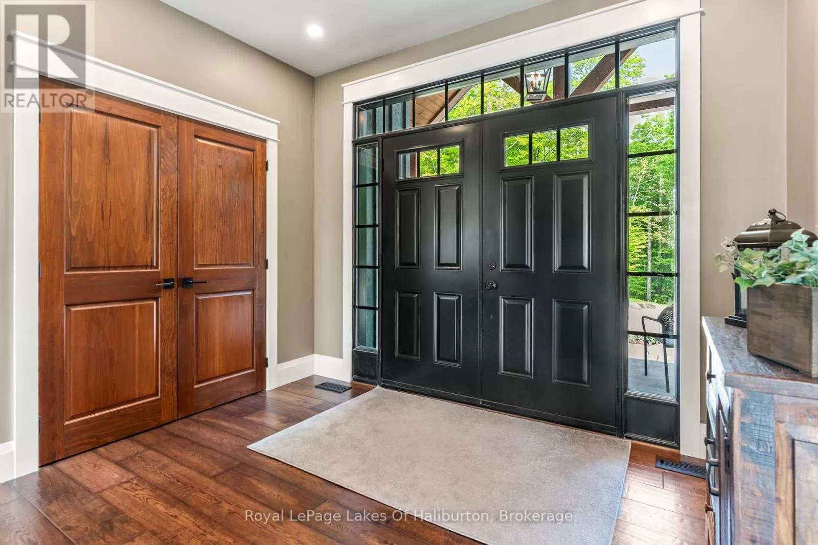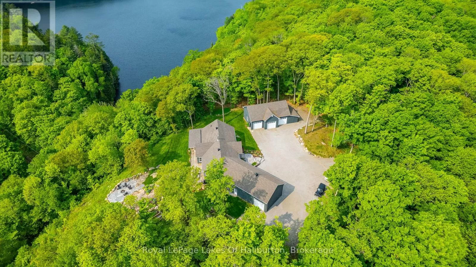 Cross Streets: Highway 118/Gregory Road. ** Directions: Highway 118 to Gregory Road to Trillium Trail. Experience refined lakeside living on the private shores of Loon Lake, where 800 feet of deep waterfront & over 5,000 sq ft of thoughtfully designed living space come together in perfect harmony. This year-round meticulously maintained 3+2 bedroom residence is the epitome of peace and luxury, offering breathtaking panoramic views and unmatched privacy. At the heart of the outdoor experience is a stunning natural granite and stone firepit area with lake vistas. Enter through a timber-frame porch into the grand Great Room, where a floor-to-ceiling dry stack stone fireplace, engineered hardwood flooring and lots of windows invite the outdoors in. Enjoy the 850+ sq ft deck with glass-panel railings, where sunrises & the tranquil lake horizon set the tone for each day. The kitchen is equipped with stainless steel appliances, soft-close cabinetry & a corner sink with captivating views. The main-floor primary suite is a private sanctuary, complete with a ensuite with heated floors, a walk-in closet & direct access to a screened-in Haliburton Room. The lower level extends the homes versatility with two more bedrooms, games room, heated floors, a second kitchen, 3-piece bath, and a cozy living area that opens to the hot tub room, stone flooring & stacking windows blend indoor comfort with natures beauty. Designed for accessibility and functionality, the home features, wide hallways, California shutters, & a spacious laundry room with heated floors & sink, generator & 200 amp. The heated triple garage includes a drive-through bay, electric openers,100-amp panel & 9ft doors. A separate 1,800 sq ft heated garage/workshop with 9-ft doors, 100 amp & a wood lean-to offers ample space for hobbies & storage, landscaped with dry stack stone walls, perennial gardens, & a generator backup system. On this 54 acre parcel you can hunt in your own backyard and close to snowmobile trails. An easy 4 min. walk or short ATV/UTV path to lakeside decking area with deep water off docks end. (id:27476)