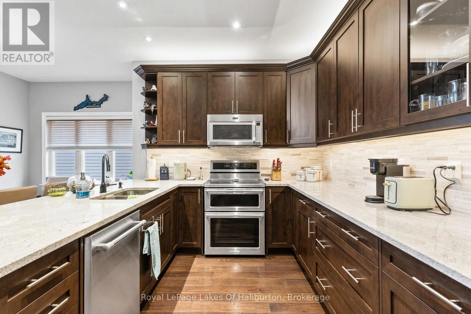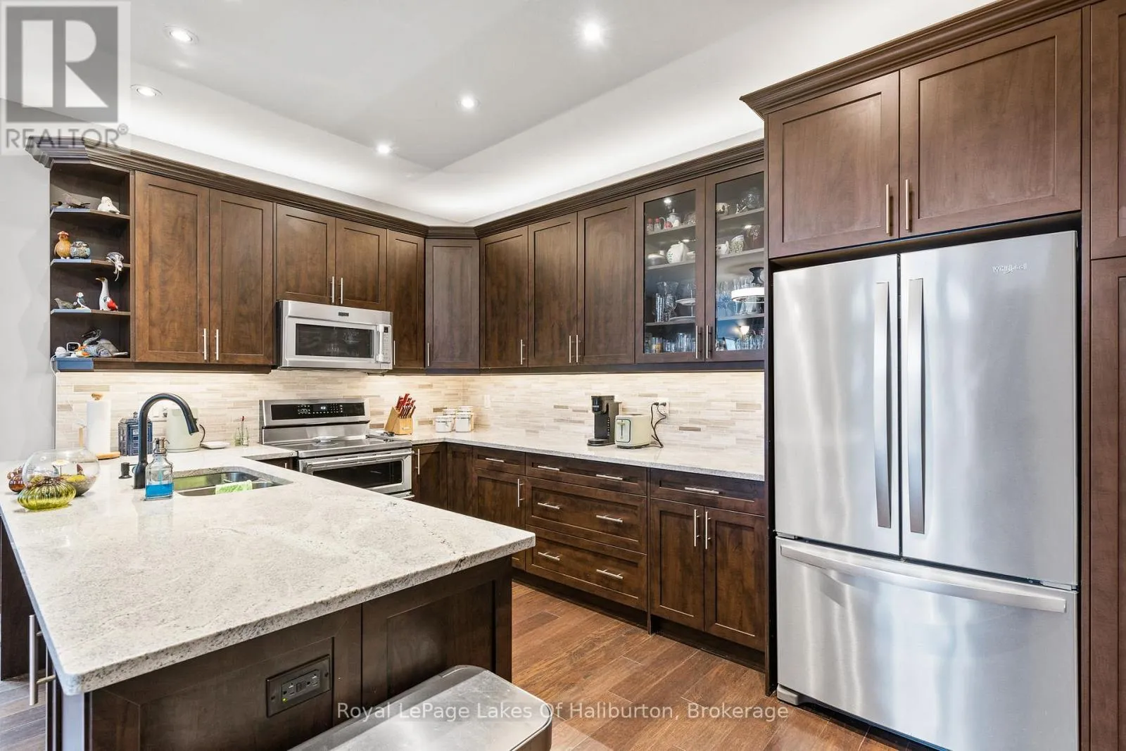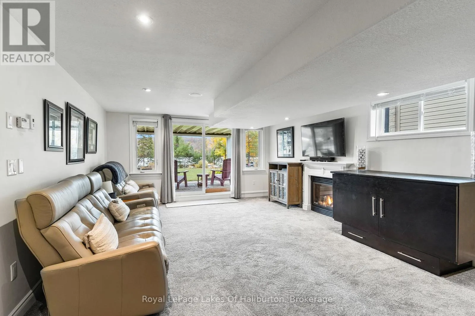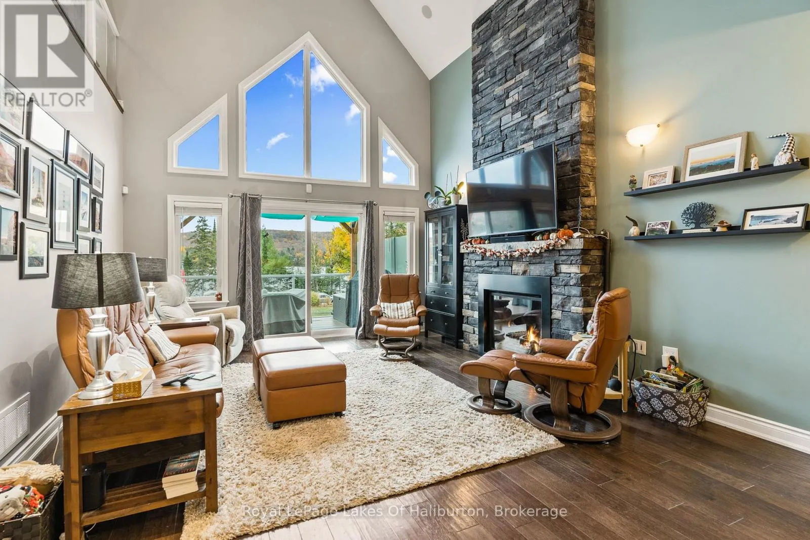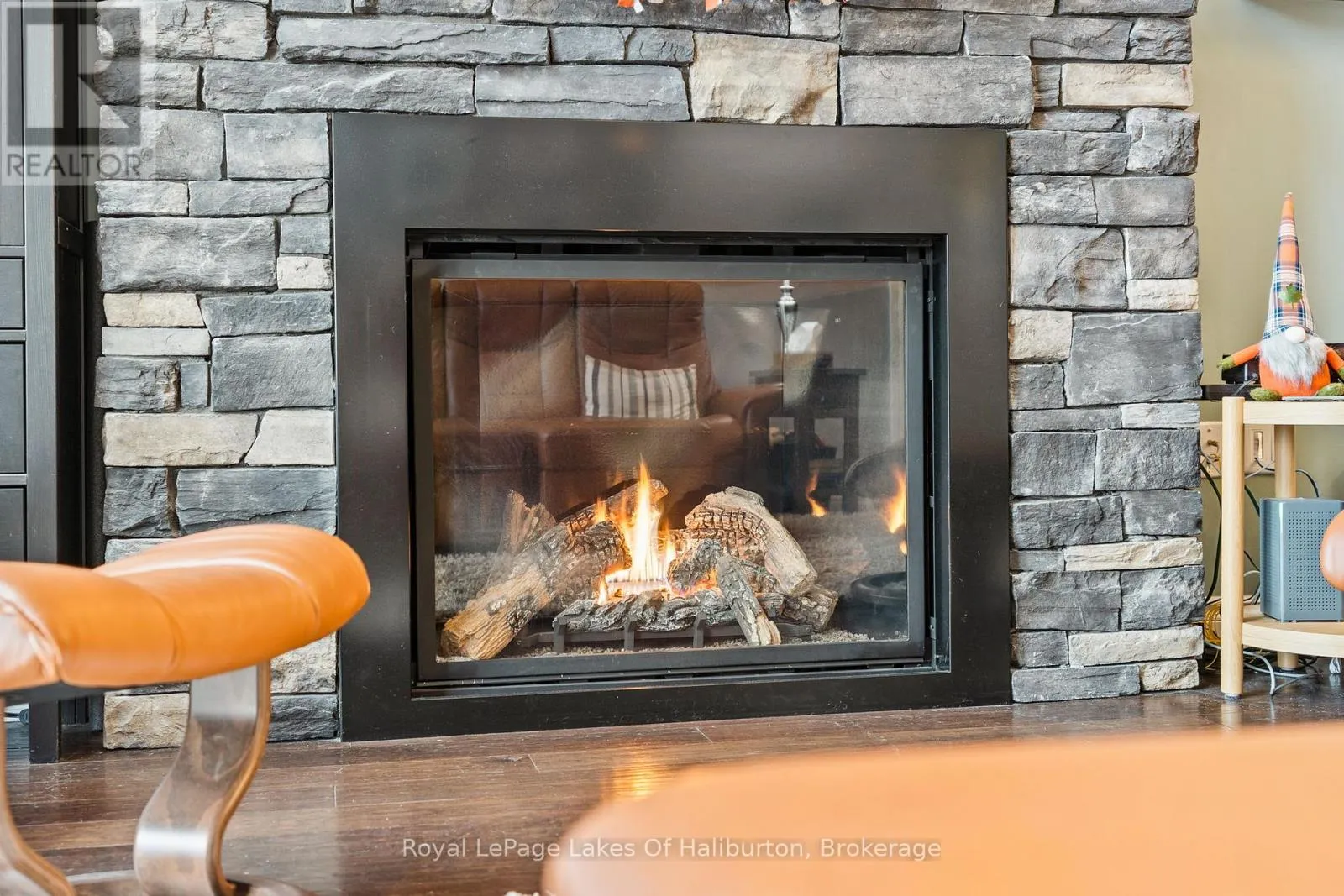 Cross Streets: County Road 21/Wigamog Road. ** Directions: County Rd 21 to Wigamog Road to Margarets Trail To Webb Circle. Welcome to this 4-bedroom, 4-bathroom executive home in the prestigious Silver Beach waterfront community on Kashagawigamog Lake, part of the sought-after 5-lake chain. With 2,955 sq. ft. of refined living space, this home combines quality craftsmanship, luxury finishes, and spectacular lake views.The foyer offers keyless entry, retractable screen, and tile floors leading to a gourmet kitchen with upgraded cabinetry, granite counters, under-cabinet lighting, sit-up area, stainless steel appliances, and elegant fixtures. The great room impresses with cathedral ceilings, a stunning floor-to-ceiling stone propane fireplace, hardwood floors, soaring windows, and walkout to a lakeside composite deck featuring a cedar timber-frame pergola and BBQ area and endless lakeviews.The primary suite provides a peaceful retreat with walkout to the deck and awning, ceiling fan, ensuite with heated floors and glass shower. The upper level offers a bright family room with glass panels overlooking the great room, high ceilings, hardwood flooring, 2 bedrooms, carpeted, ceiling fans, and custom blinds, while a walk-in closet area adds generous storage and 4pc bath with soaker tub.The lower level features a spacious rec room with propane fireplace, pot lights, and walkout to an interlocking lakeside patio. A guest suite offers a walkout to waterside patio, walk-in closet, and 4-pc ensuite. Additional highlights include, all bathrooms with heated floors, a multi-zone HVAC system, new hot water on demand (2025), 18W Generac generator, NFTC fibre optics, and a heated, insulated garage with storage and retractable screen. Exterior upgrades include programmable soffit lighting, glass railings, firepit area, and under-deck shielding.Enjoy exclusive access to the Silver Beach Clubhouse featuring a grand hall, kitchen, fitness center, games room, guest suite, two beaches & trails, close to Haliburton for all your amenities. Dock slip available to purchase ($25K). See full list of features. (id:27476)