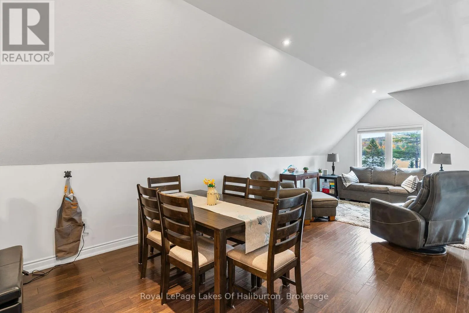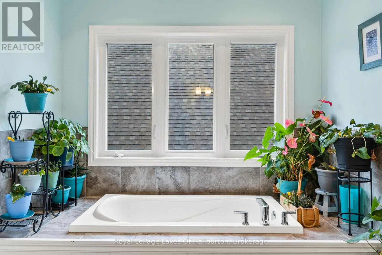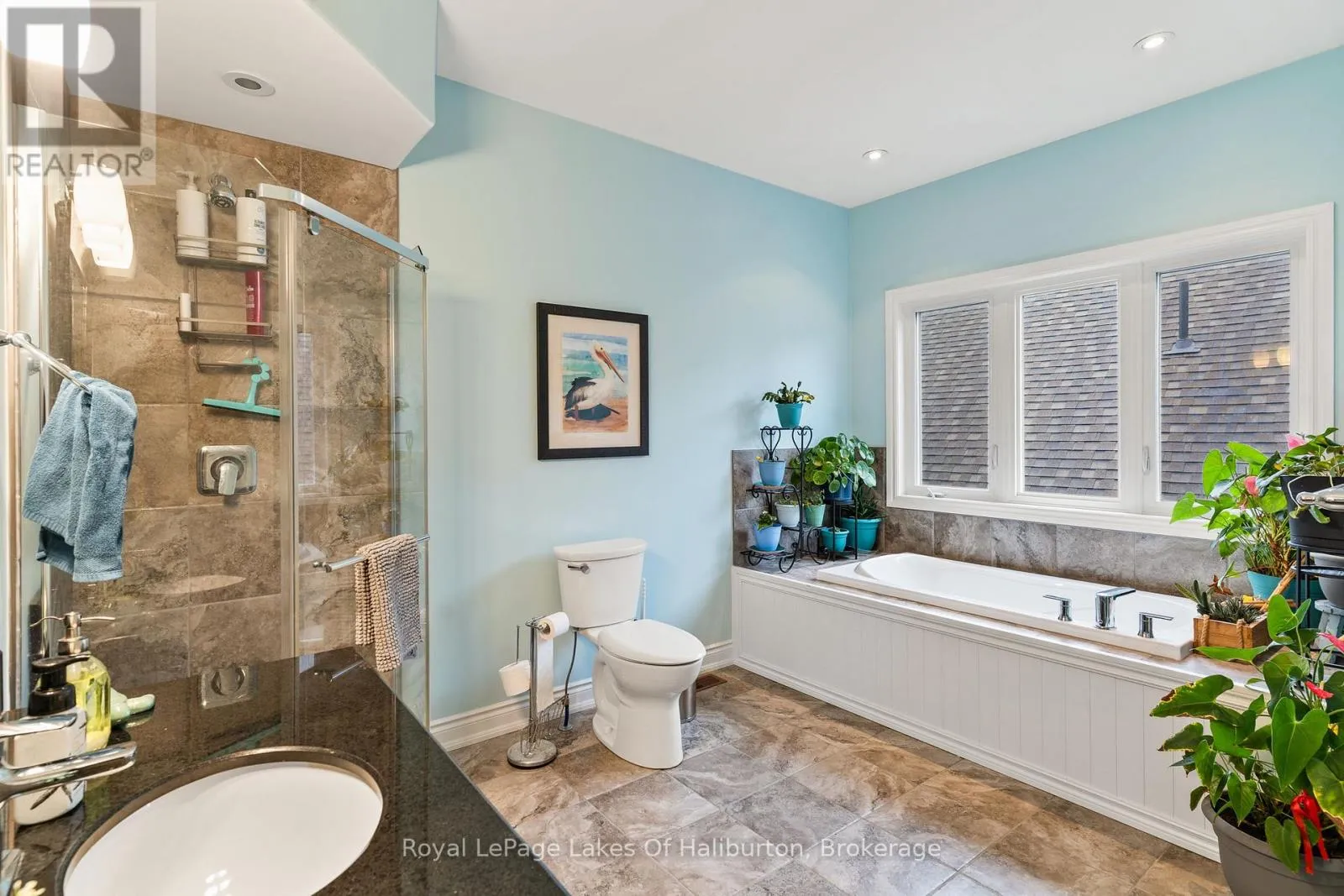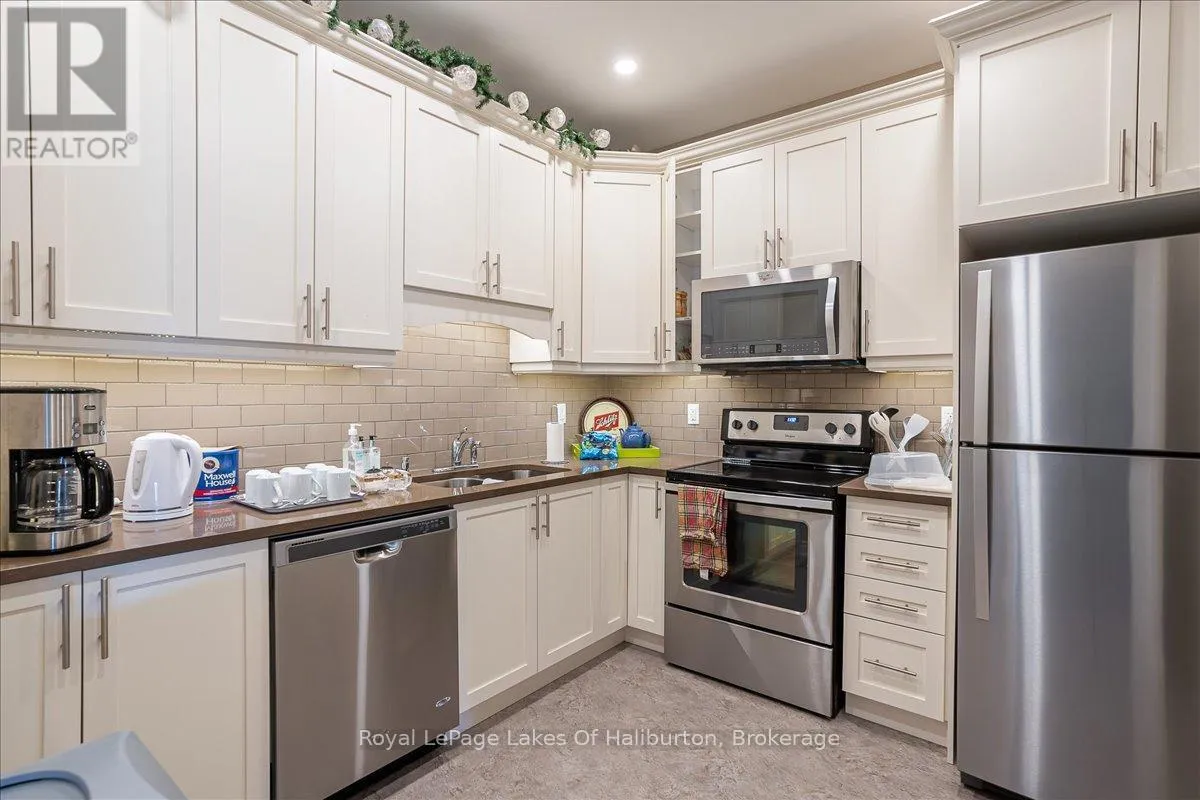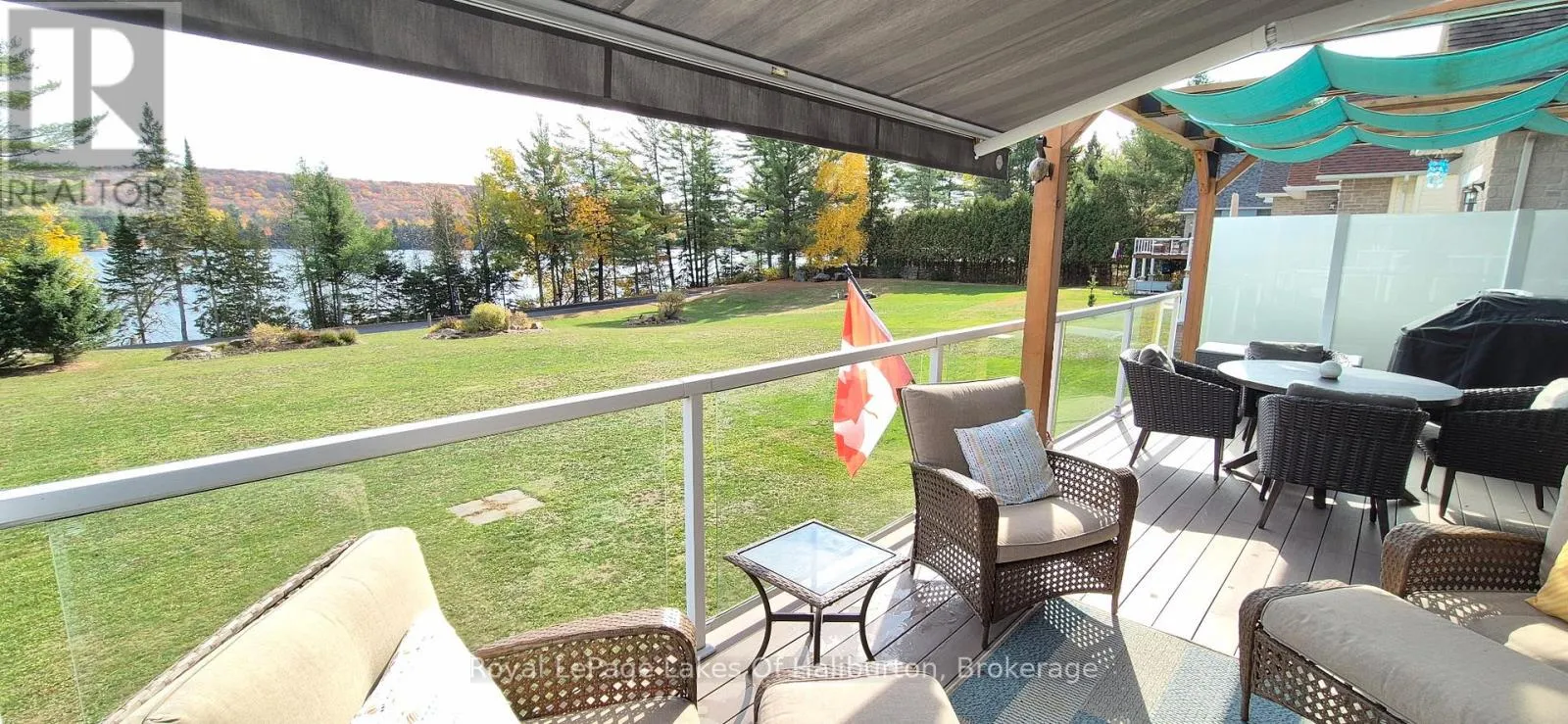 Cross Streets: County Road 21/Wigamog Road. ** Directions: County Rd 21 to Wigamog Road to Margarets Trail To Webb Circle. Welcome to this 4-bedroom, 4-bathroom executive home in the prestigious Silver Beach waterfront community on Kashagawigamog Lake, part of the sought-after 5-lake chain. With 2,955 sq. ft. of refined living space, this home combines quality craftsmanship, luxury finishes, and spectacular lake views.The foyer offers keyless entry, retractable screen, and tile floors leading to a gourmet kitchen with upgraded cabinetry, granite counters, under-cabinet lighting, sit-up area, stainless steel appliances, and elegant fixtures. The great room impresses with cathedral ceilings, a stunning floor-to-ceiling stone propane fireplace, hardwood floors, soaring windows, and walkout to a lakeside composite deck featuring a cedar timber-frame pergola and BBQ area and endless lakeviews.The primary suite provides a peaceful retreat with walkout to the deck and awning, ceiling fan, ensuite with heated floors and glass shower. The upper level offers a bright family room with glass panels overlooking the great room, high ceilings, hardwood flooring, 2 bedrooms, carpeted, ceiling fans, and custom blinds, while a walk-in closet area adds generous storage and 4pc bath with soaker tub.The lower level features a spacious rec room with propane fireplace, pot lights, and walkout to an interlocking lakeside patio. A guest suite offers a walkout to waterside patio, walk-in closet, and 4-pc ensuite. Additional highlights include, all bathrooms with heated floors, a multi-zone HVAC system, new hot water on demand (2025), 18W Generac generator, NFTC fibre optics, and a heated, insulated garage with storage and retractable screen. Exterior upgrades include programmable soffit lighting, glass railings, firepit area, and under-deck shielding.Enjoy exclusive access to the Silver Beach Clubhouse featuring a grand hall, kitchen, fitness center, games room, guest suite, two beaches & trails, close to Haliburton for all your amenities. Dock slip available to purchase ($25K). See full list of features. (id:27476)