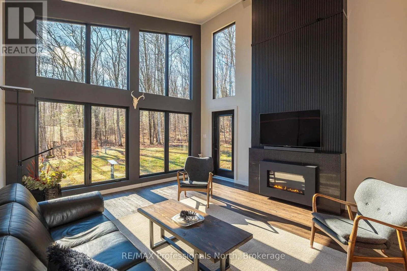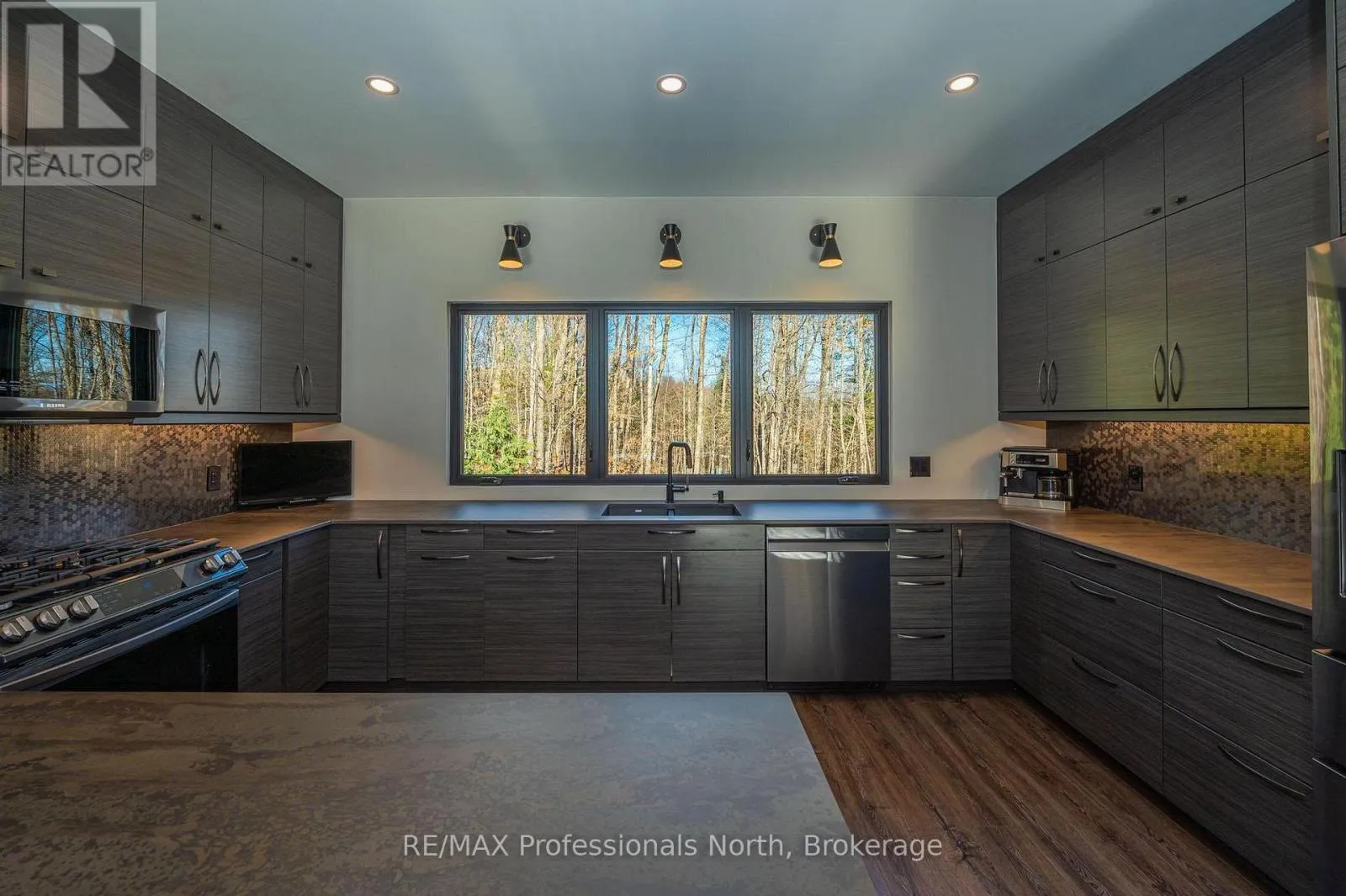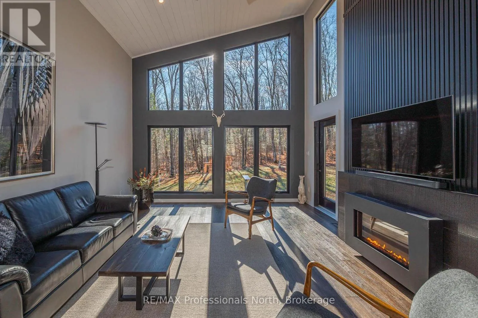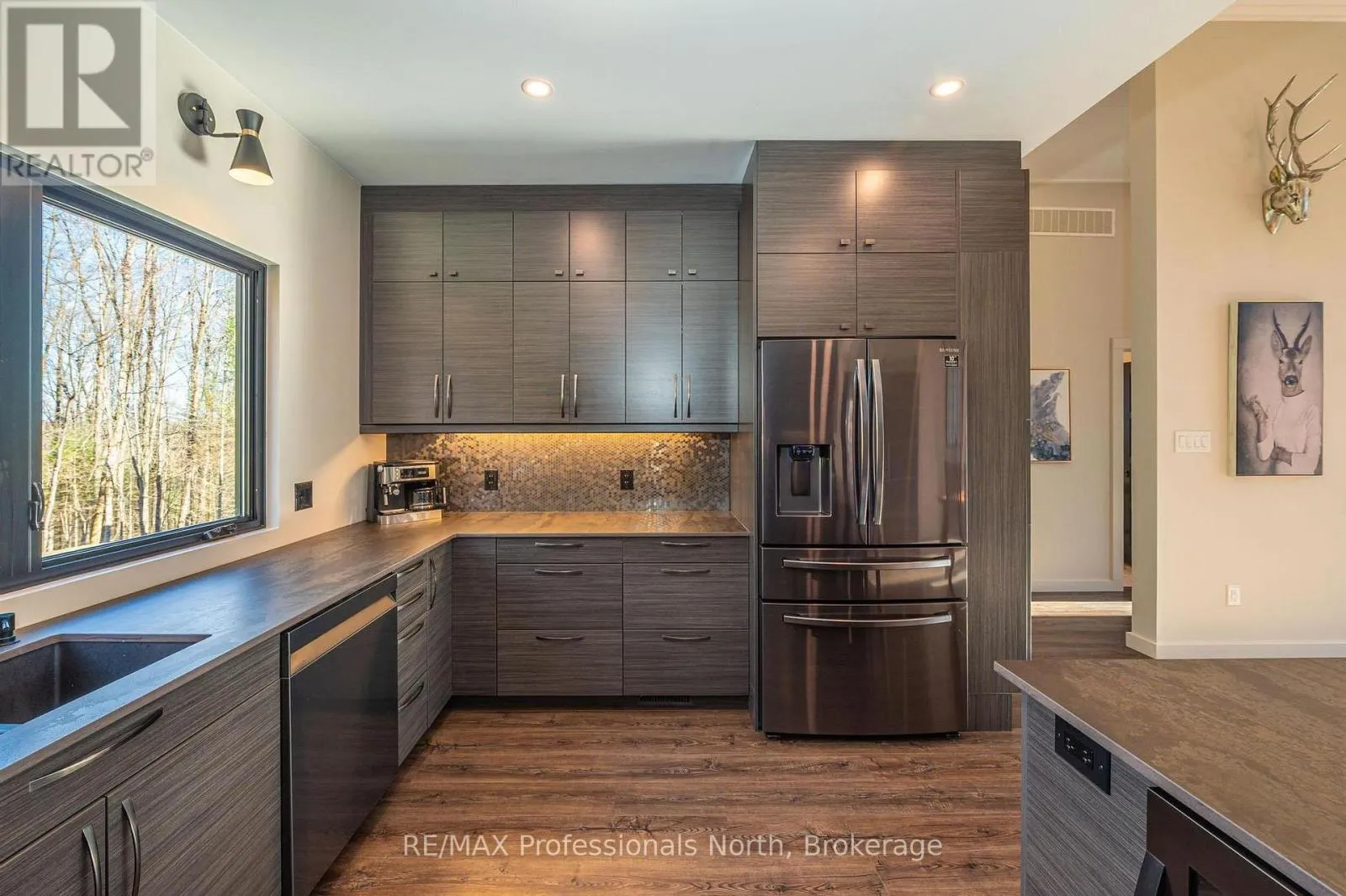 Cross Streets: Highway 118 and Glamorgan Road. ** Directions: Highway 118 to Glamorgan Road to #3777. Custom built in 2020, this beautiful 2 bedroom, 2 bathroom home offers quality craftsmanship and modern design throughout. The open-concept living area features vaulted ceilings, a floor-to-ceiling fireplace, and large windows that capture stunning views of the surrounding landscape. The high-end kitchen is a chef's dream designed for both style and function, with premium finishes, including Dekton counters, stylish cabinetry and plenty of space for entertaining. The primary bedroom is large and spacious and includes a bright walk in closet. The ensuite is bright with a spa-like atmosphere. The combination of smooth quartz surfaces and the soft gleam of polished nickel adds both sophistication and warmth. The main level flows seamlessly to the outdoor living areas, providing excellent privacy on 5.95 acres of land. The full basement is partially finished, offering potential for additional living space, a home gym or recreation areas. A 24' x 30' detached garage provides ample room for vehicles, storage, or a workshop. A propane heater for the garage is included. It is not hooked up and will be the responsibility of the new owner. Located just minutes from Haliburton Village, this property combines privacy and convenience with easy access to town amenities. A perfect retreat offering comfort, space, and modern rural living at its best. (id:27476)