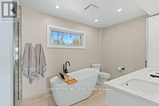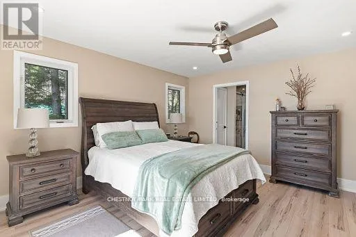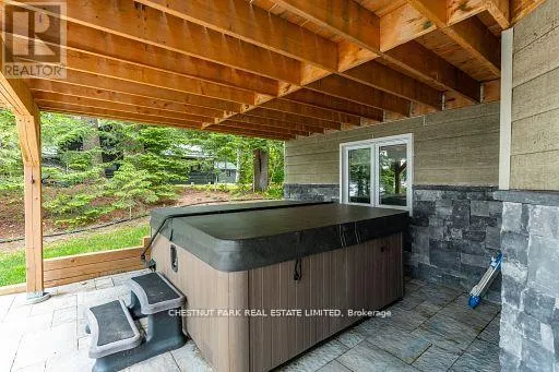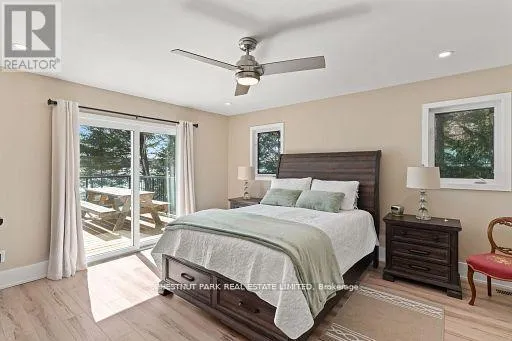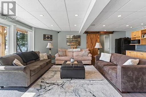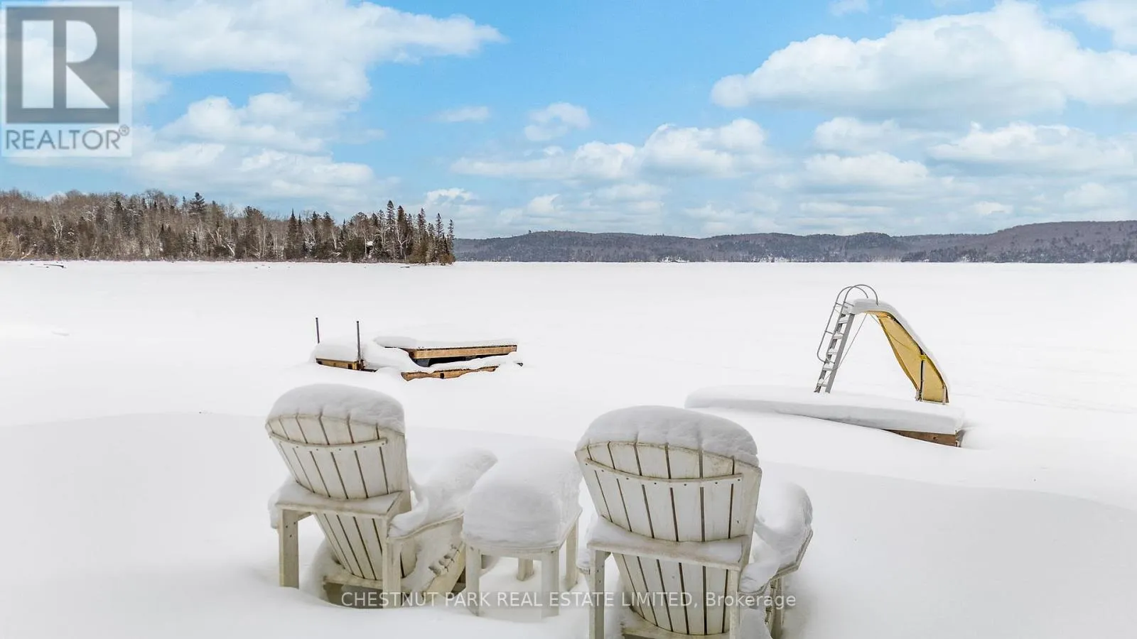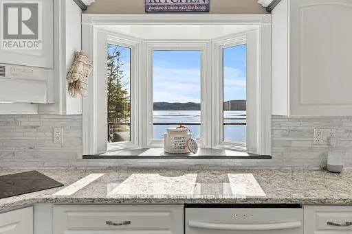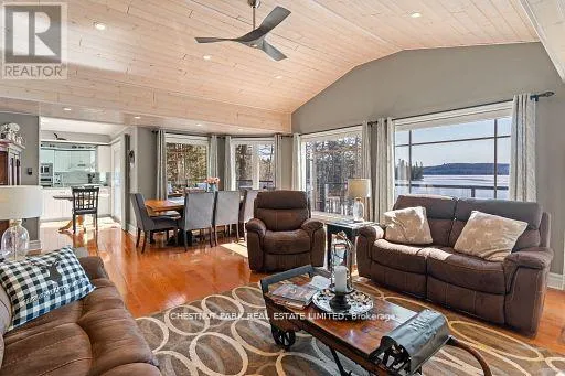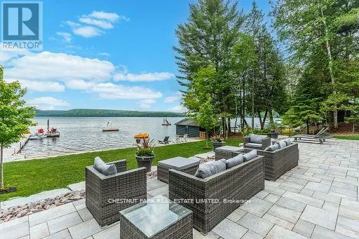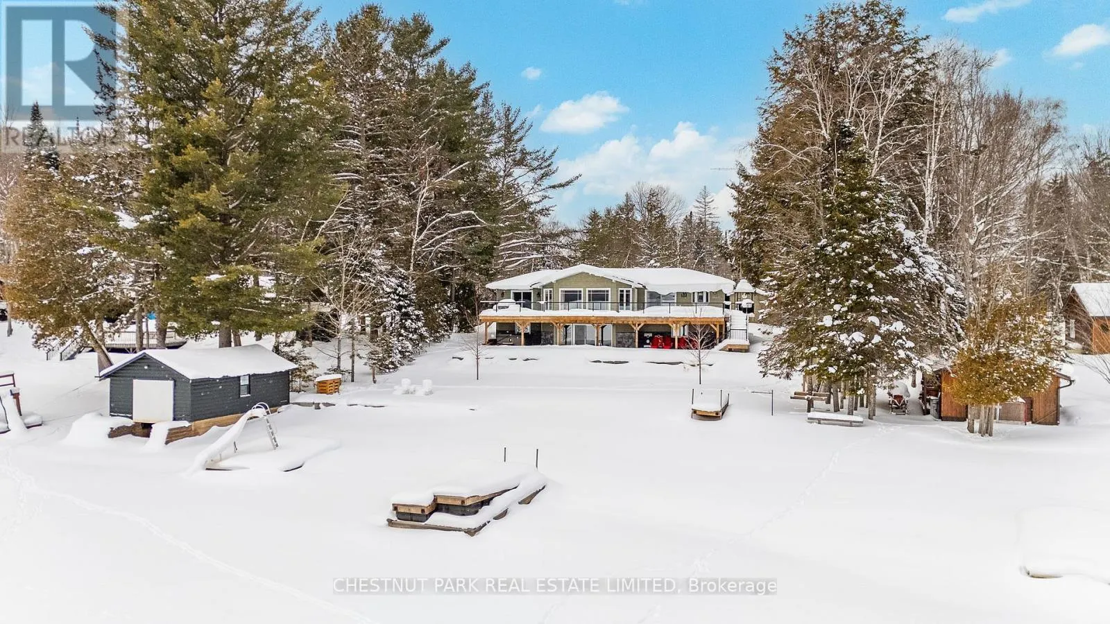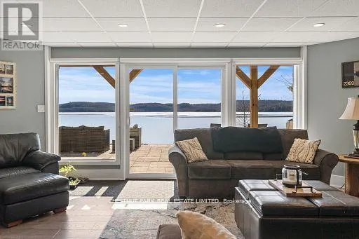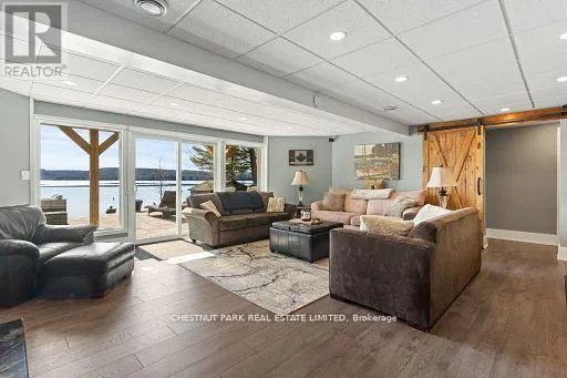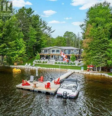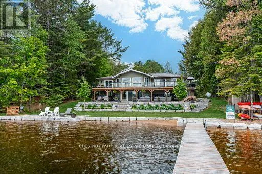 Cross Streets: Haliburton lake road & Curry Drive. ** Directions: Haliburton Lake Road to Curry Rd to SOP. This refined Haliburton Lake waterfront residence offers a rare combination of luxury, privacy, and four-season recreation on one of the area's most prestigious lakes. Ideal for year-round living or an elevated cottage retreat, the home features 2,850 sq. ft. of well-designed living space on a level, treed 1.1-acre lot with 100 feet of prime sandy shoreline and clear, deep water. The shoreline offers both shallow entry and deep water off the dock-perfect for swimming, boating, and fishing-while wide lake views and southeast-facing exposure provide excellent natural light and tranquil sunrise vistas. Multiple walkouts connect to a 60-foot lakeside patio, creating seamless indoor-outdoor living ideal for entertaining. Inside, the 4+1 bedroom, 3 bathroom layout is defined by cathedral ceilings, hardwood floors, two propane fireplaces, and an open-concept kitchen and living area designed for both everyday comfort and hosting. The property has extensive landscaping with exceptional perennial gardens, enhancing privacy and curb appeal while complementing the natural setting. Additional features include a fitness/games room and a 3-car garage, with one insulated and heated bay ideal for vehicles and recreational equipment. Well suited for winter use, the home offers easy year-round access and proximity to extensive four-season activities including snowmobiling, ice fishing, skating, cross-country skiing, and downhill skiing at Sir Sam's Ski / Ride, just 20 minutes away. Modern comforts include central air, central vacuum, a high-efficiency propane furnace, and a full backup generator. A distinguished offering in Haliburton real estate, this waterfront property delivers understated luxury and year-round enjoyment in a premier lakefront setting. (id:27476)
