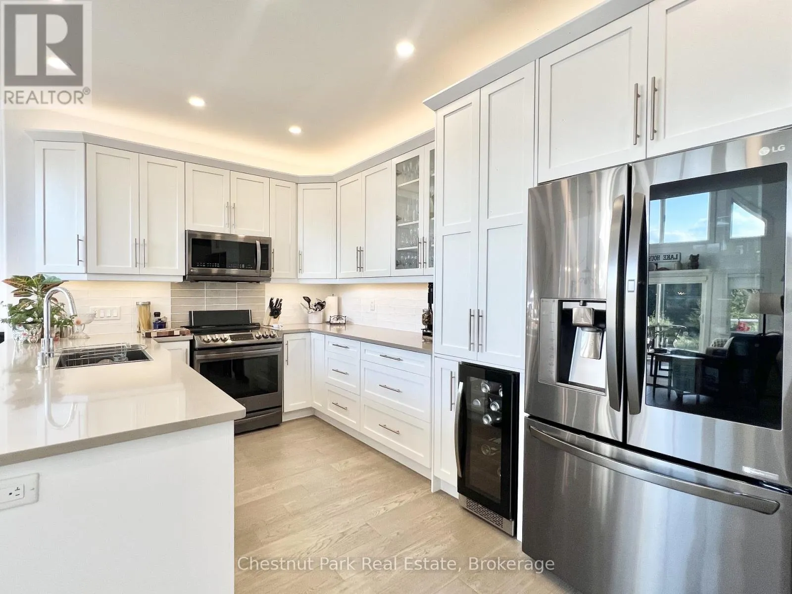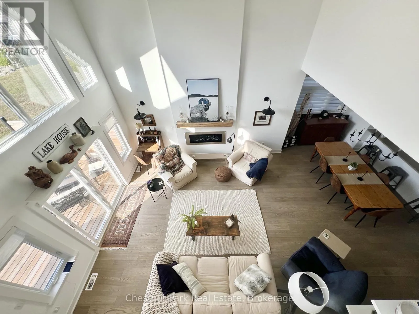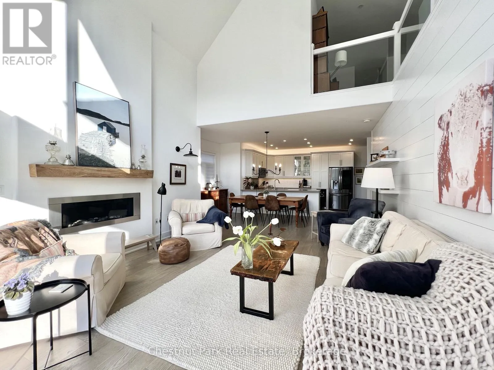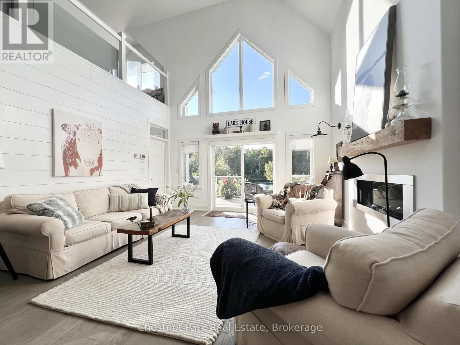 Cross Streets: Margaret's Trail and William James Court. ** Directions: Hwy 21 to Wigamog Road to Margaret's Trail (Silver Beach Entrance) to William James to #8. Welcome to Silver Beach, Haliburton's Premier Lakeside Community! Discover refined cottage country living on Haliburton's renowned 5-lake chain. Built in 2018, this exquisite home is comprised of 3,165 sq. ft. of finished living space, one of the largest in the development, & offers the perfect blend of modern luxury, low-maintenance living, & a true 4-season lifestyle. Step inside to an open-concept main level where cathedral ceilings, a propane fireplace, & a dramatic wall of windows frame serene pond, forest & sunset views. The chef's kitchen is equipped with quartz counters, a breakfast bar, & s/s appliances.. A spacious dining area flows seamlessly to the great room & out to the large deck. The main floor also features a foyer, a powder room, & the primary suite with laundry, walk-in closet, ensuite bath, & walkout to the deck. Upstairs, a striking glass-railed loft overlooks the main living space. There are 2 bdrms, one very generously sized & one with direct access to the luxurious, upper level, spa like bath with soaker tub & walk-in shower. The finished lower level extends the living space with a large family room, large guest bdrm, full bath, & ample storage. An attached 2 car garage adds convenience. Premium amenities at Silver Beach include a clubhouse with Grand Hall for organized activities/events, a fitness centre, a games room, & a guest suite for visitors, forested trails that adjoin Pinestone Golf Course, 2 sand beaches within a few min walk, & docking facilities where you can dive right in, or purchase a slip (avail for $19,000) allowing you to boat across sparkling waters & enjoy endless water based activities. Dock maintenance, snow removal, grass cutting, town sewers, community water treatment, & a level 2 EV charger all add to convenience. Located just minutes from golf, dining, health care (10 min away), & the town of Haliburton, this property offers comfort, community, & convenience in one of cottage country's most desirable settings! (id:27476)