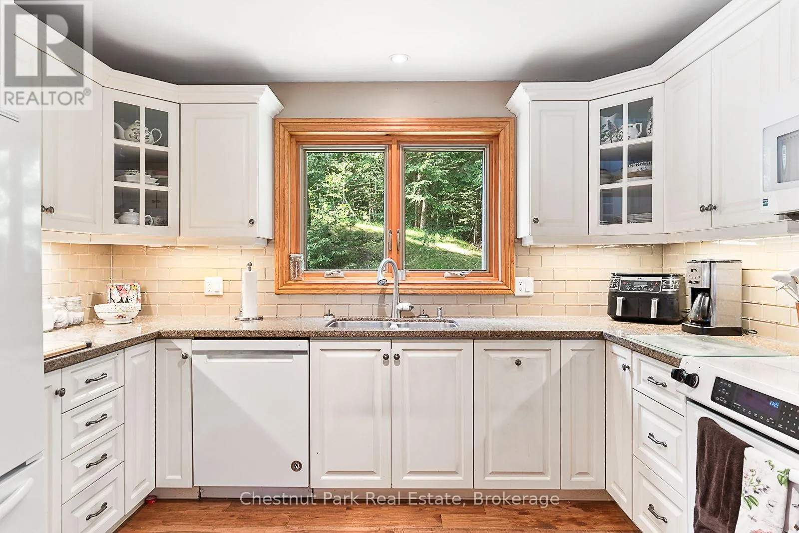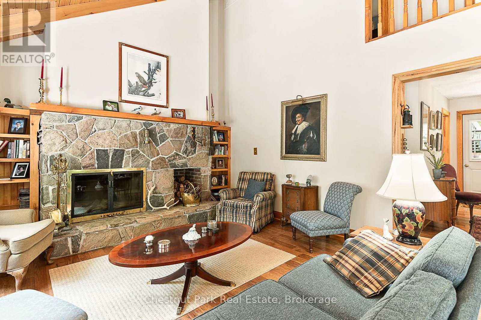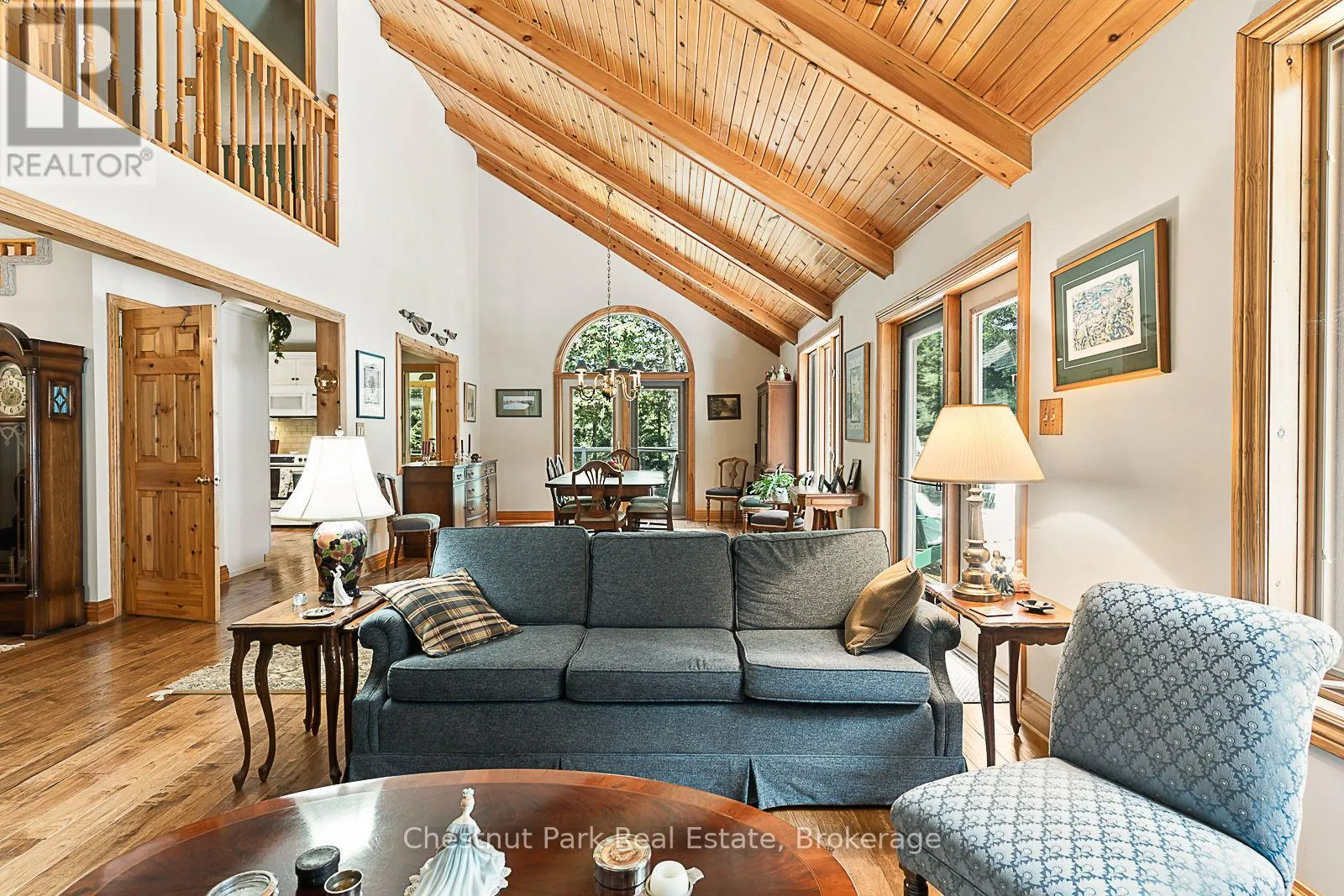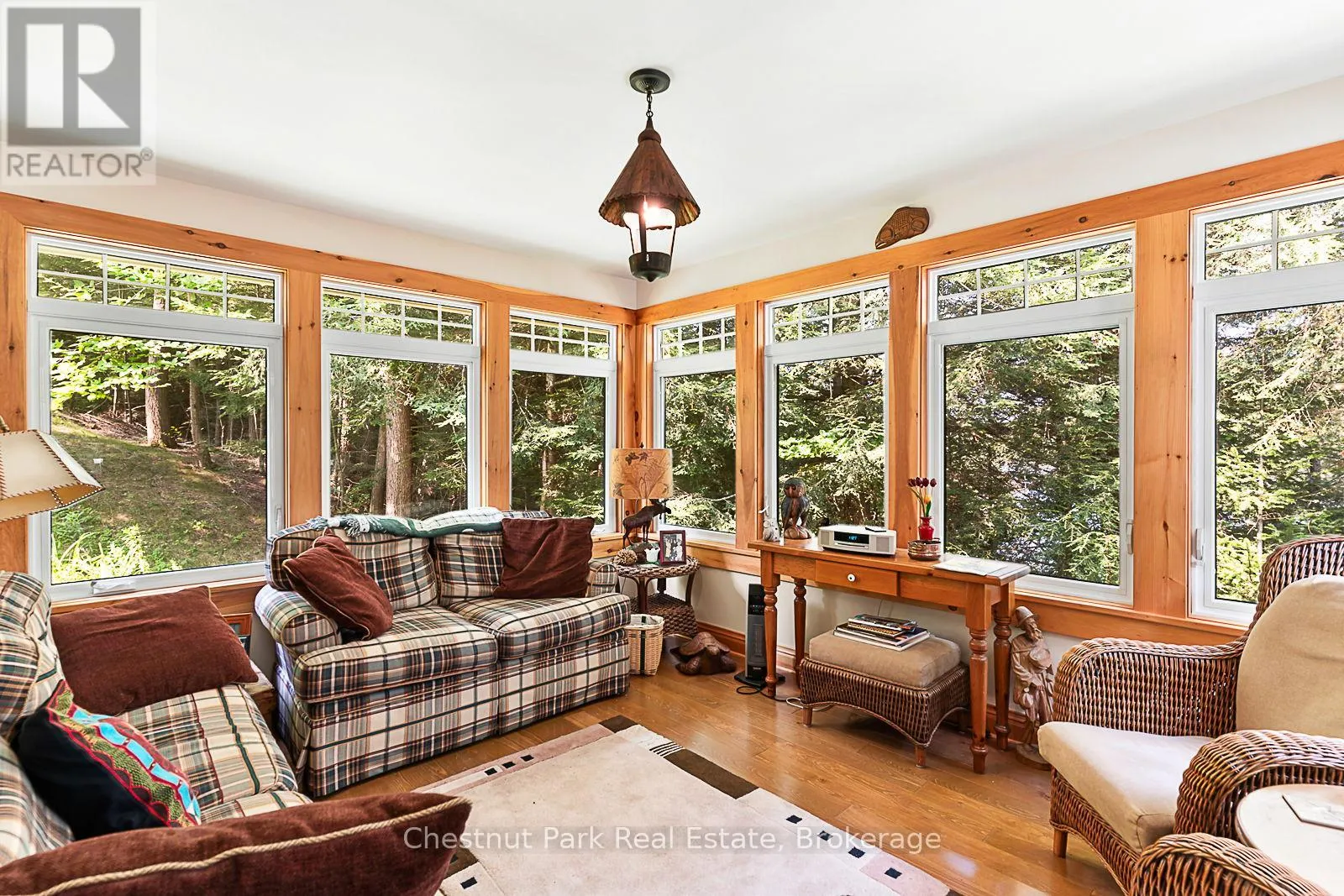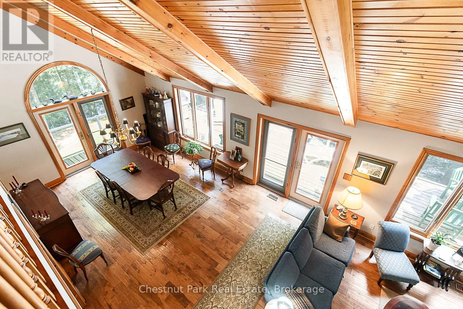 Cross Streets: Kennisis Lk Rd & Bitter Lk Rd. ** Directions: Hwy 118 to Kennisis Lk Rd (CR 7) to Bitter Lk Rd to Picadilly Bay Ln to Arnott Ln. Discover the ultimate private lakeside retreat on prestigious Redstone Lake. Boasting 440 feet of stunning lake frontage on a point lot promises unparalleled privacy and breathtaking views with west, north and east exposures. Discover the perfect blend of comfort and serenity with this exquisite 4-bedroom, 3-bath home or cottage. Step into this 4-season, almost 2980 total sq ft retreat and immediately be drawn to it's thoughtful lay-out and large windows to bring the outdoors in. The spacious entryway is complete with a mud and laundry room combo and opens to the spacious principle rooms with plenty of room for entertaining family and friends. The open concept living and dining areas feature cathedral ceilings, hardwood flooring, lots of windows, 2 walk-outs to a large deck and a stone wood-burning fireplace perfect for those chilly evenings. The large kitchen features plenty of cupboards and granite countertops with direct access to the 4-season sunporch - ideal for enjoying the beauty of every season - and summer sunsets. Completing the main floor is a 3-pce bathroom and the primary bedroom with a walk-in closet and walk-out to a deck overlooking the lake. Head upstairs to 2 more spacious bedrooms and a 4-pce bathroom. The walk-out lower level features the 4th bedroom, a 3-pce bathroom, a large rec room with a propane fireplace, a cozy tv area, and the utility room. Includes a drilled well, back-up generator, and central vac system. An over-sized double garage is perfect for storing the toys while the loft above with a composting toilet provides endless possibilities. Spend your days enjoying your private terrain with some grassy play areas and the shoreline with clean, deep water off the dock. The property has a level driveway and is conveniently located on a private year-round road, ensuring easy access no matter the season. Embrace the tranquility of cottage country with this exceptional home. Your private retreat awaits! (id:27476)
